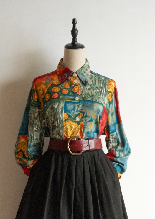 80~90’s Euro Black × White Painting Art Pattern Bow-tie Blouse