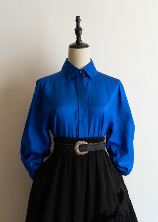 80~90’s Euro Front Frill Design Glossy Black Blouse