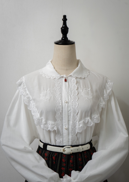 Upcycle Bird × Flower Embroidery Lace Collar White Blouse
