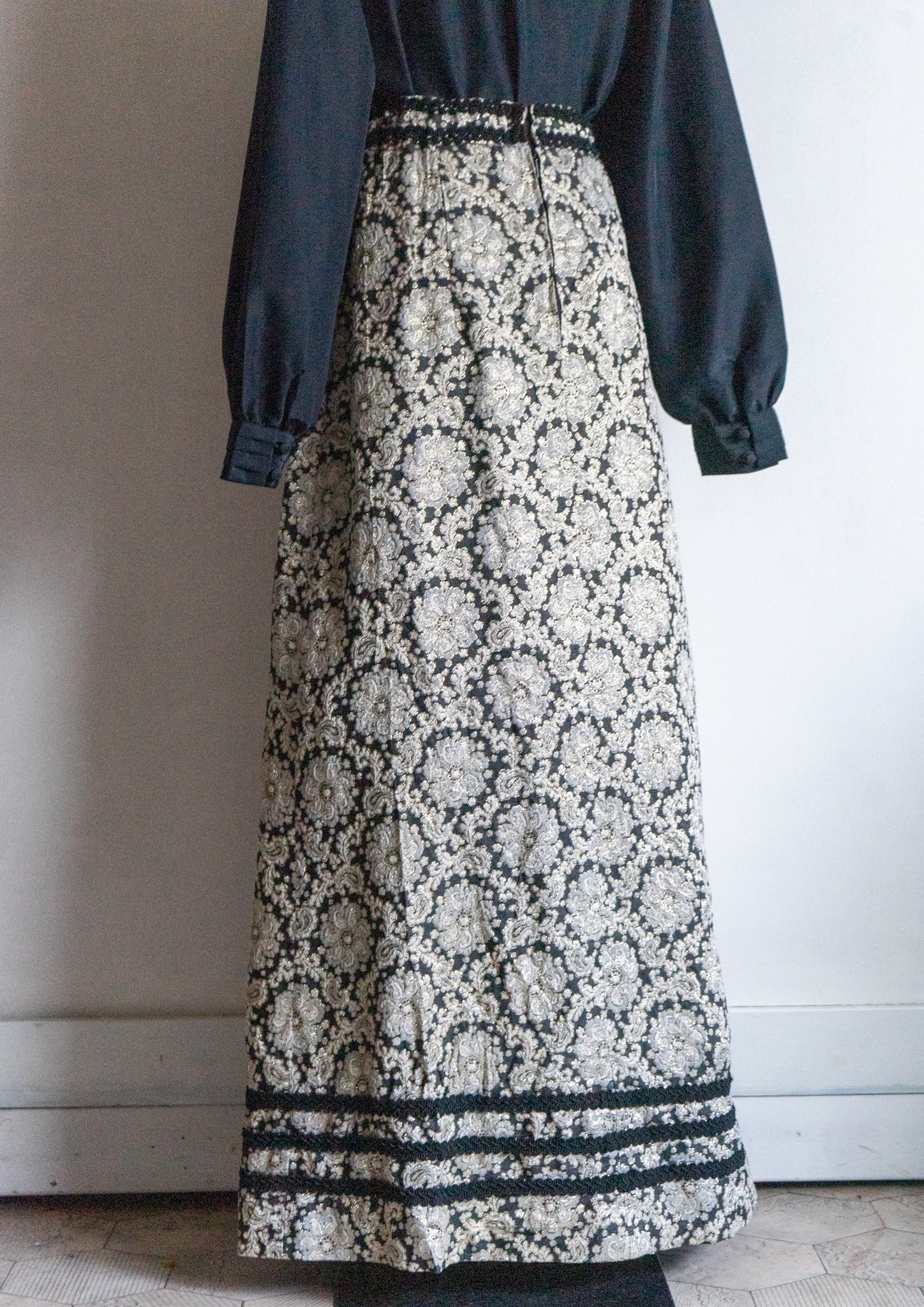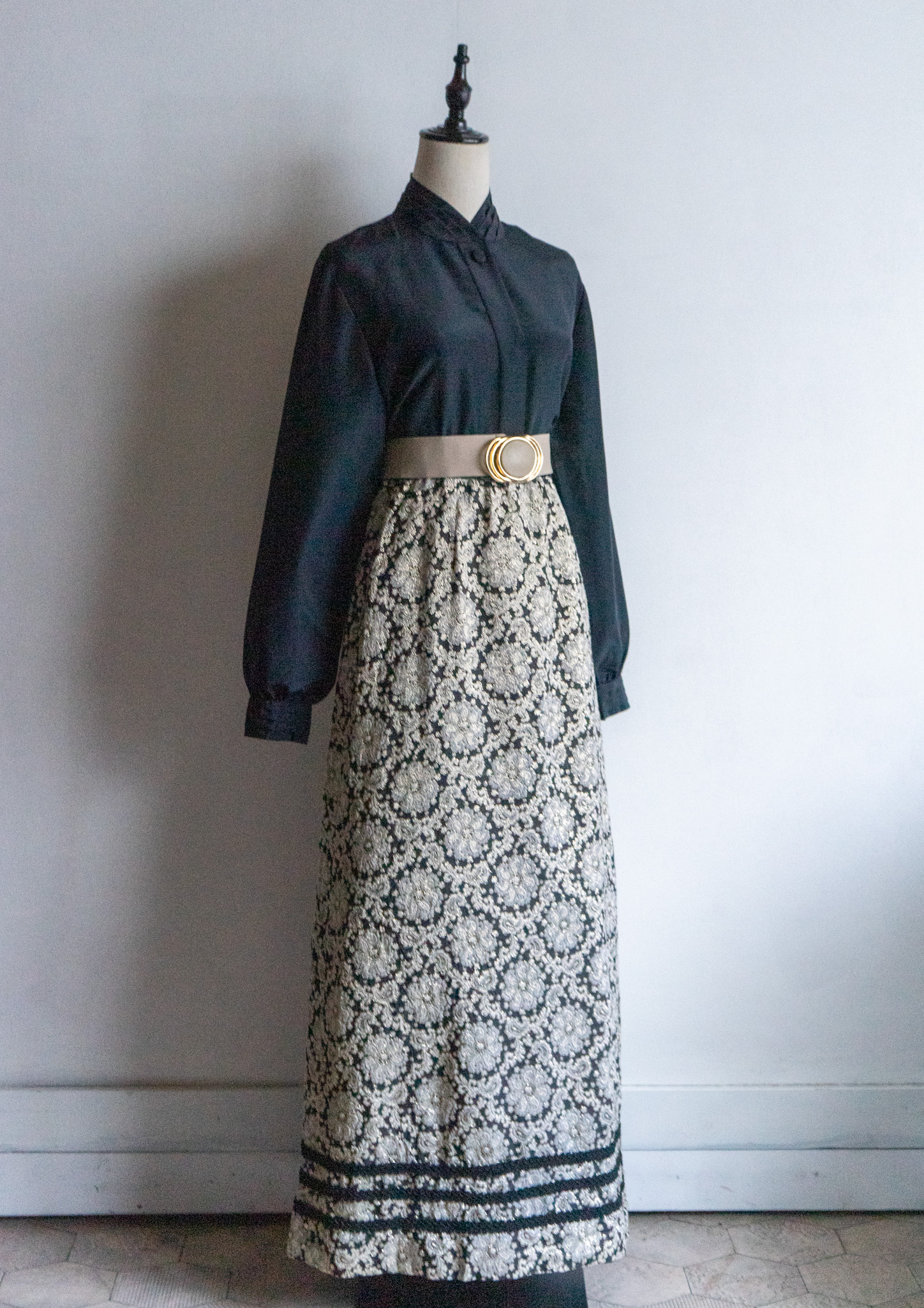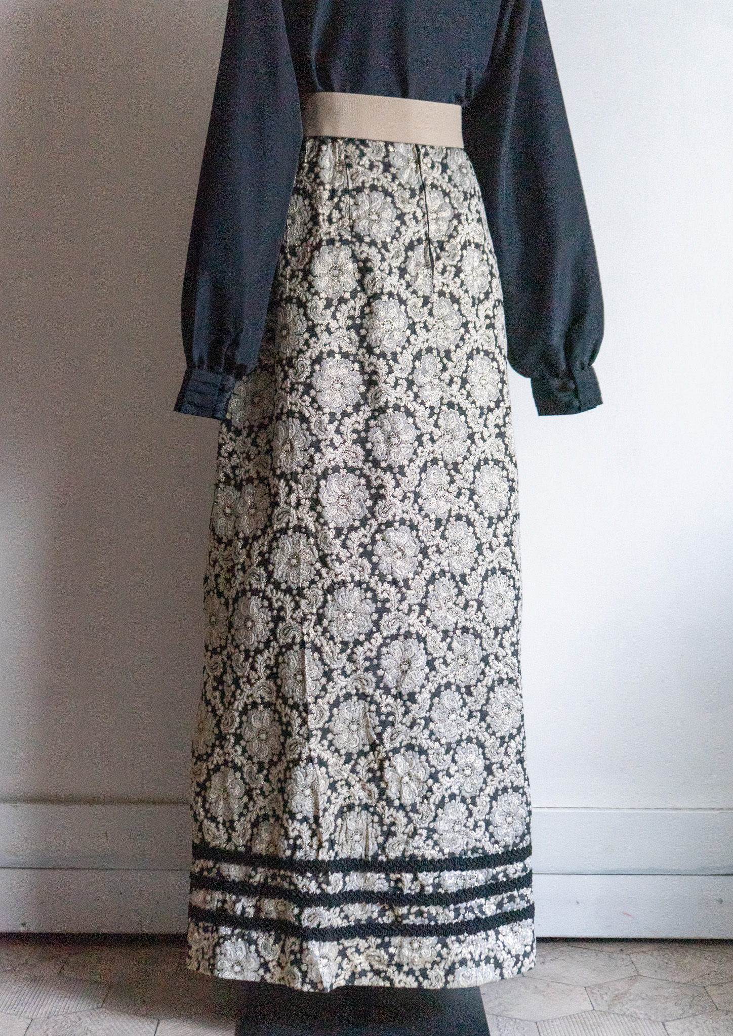 70's Gold × Black Flower Motif Paisley Pattern Jacquard Maxi Skirt
