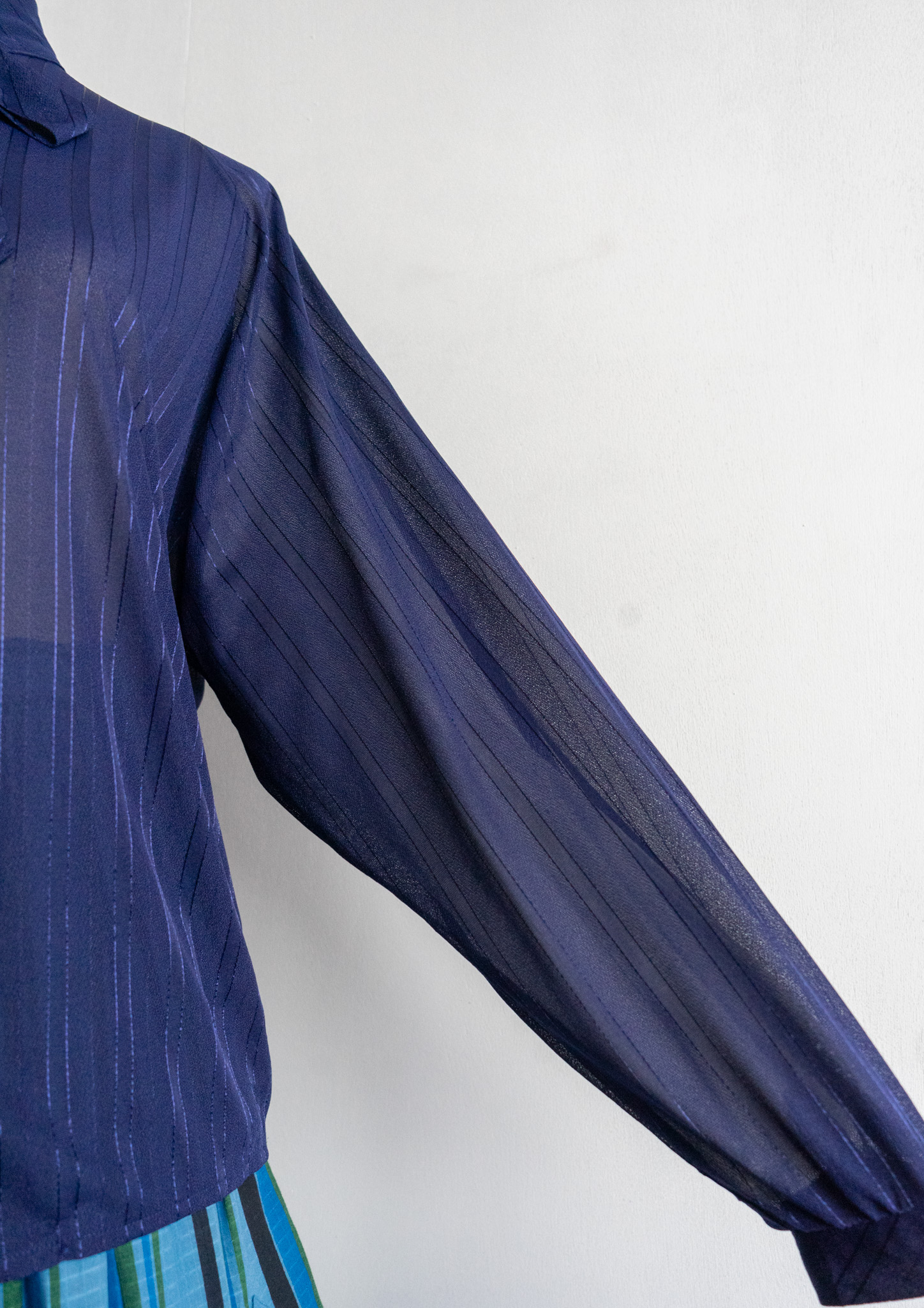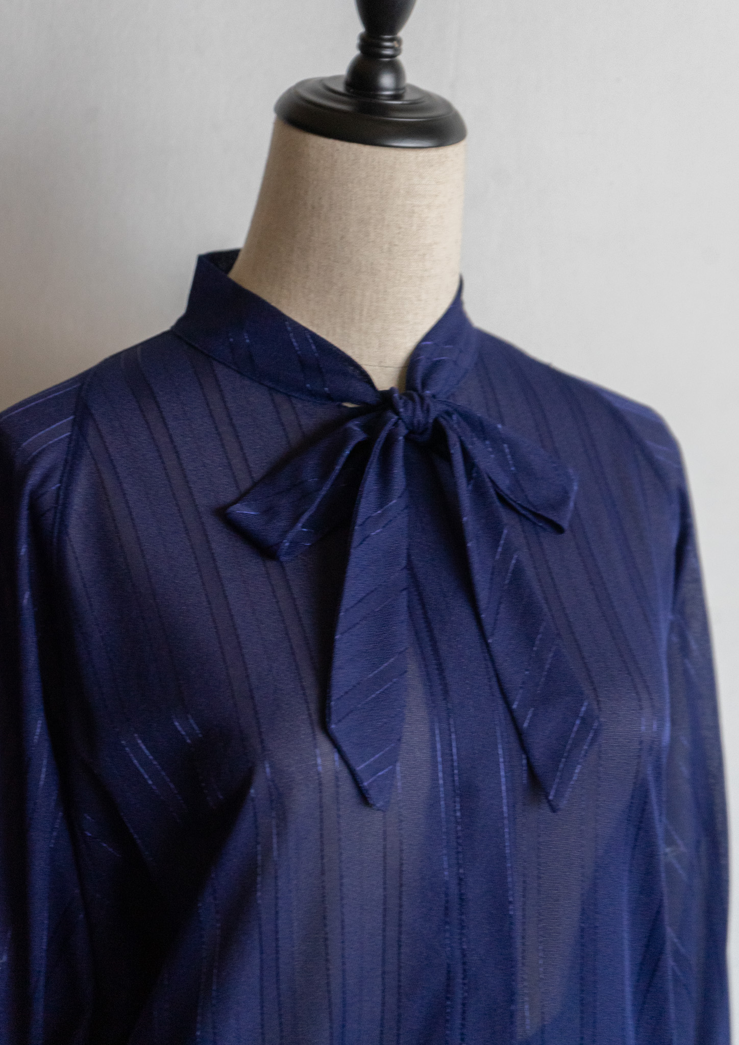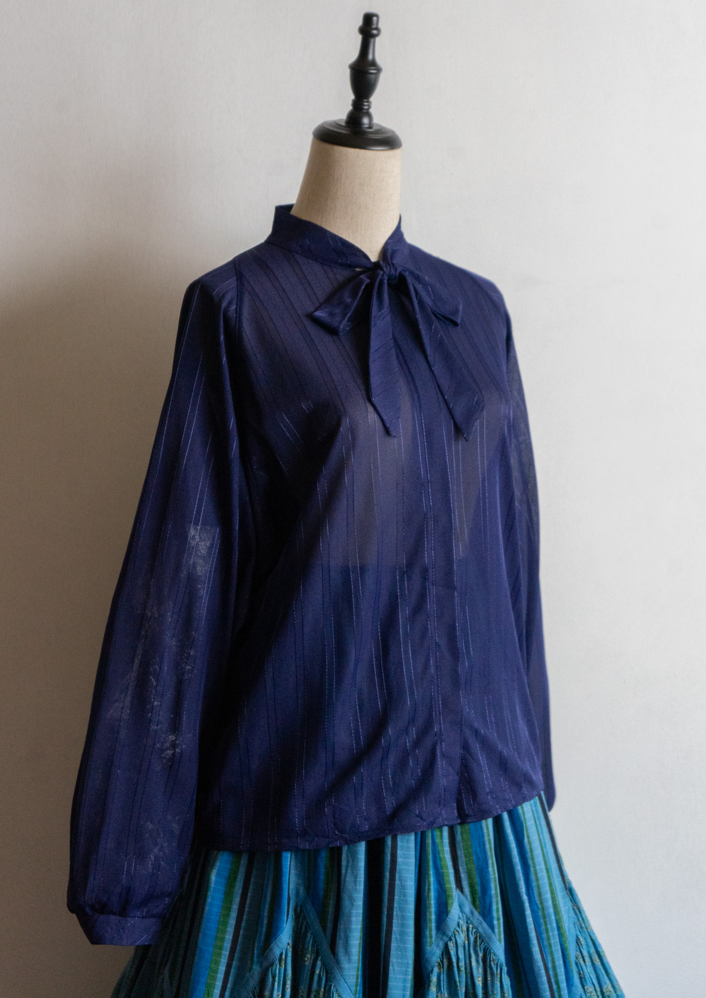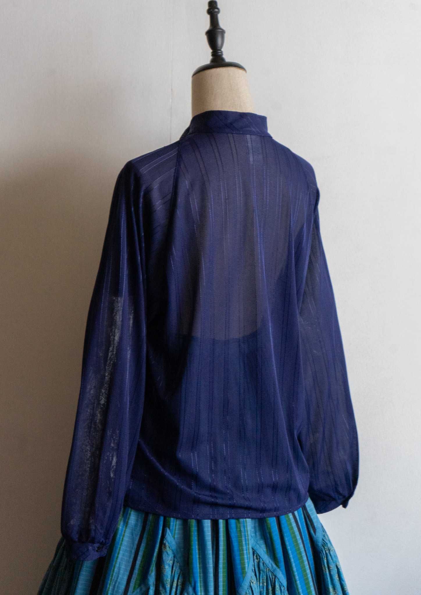 80~90's Euro Stripe Pattern Navy Sheer Bow-tie Blouse