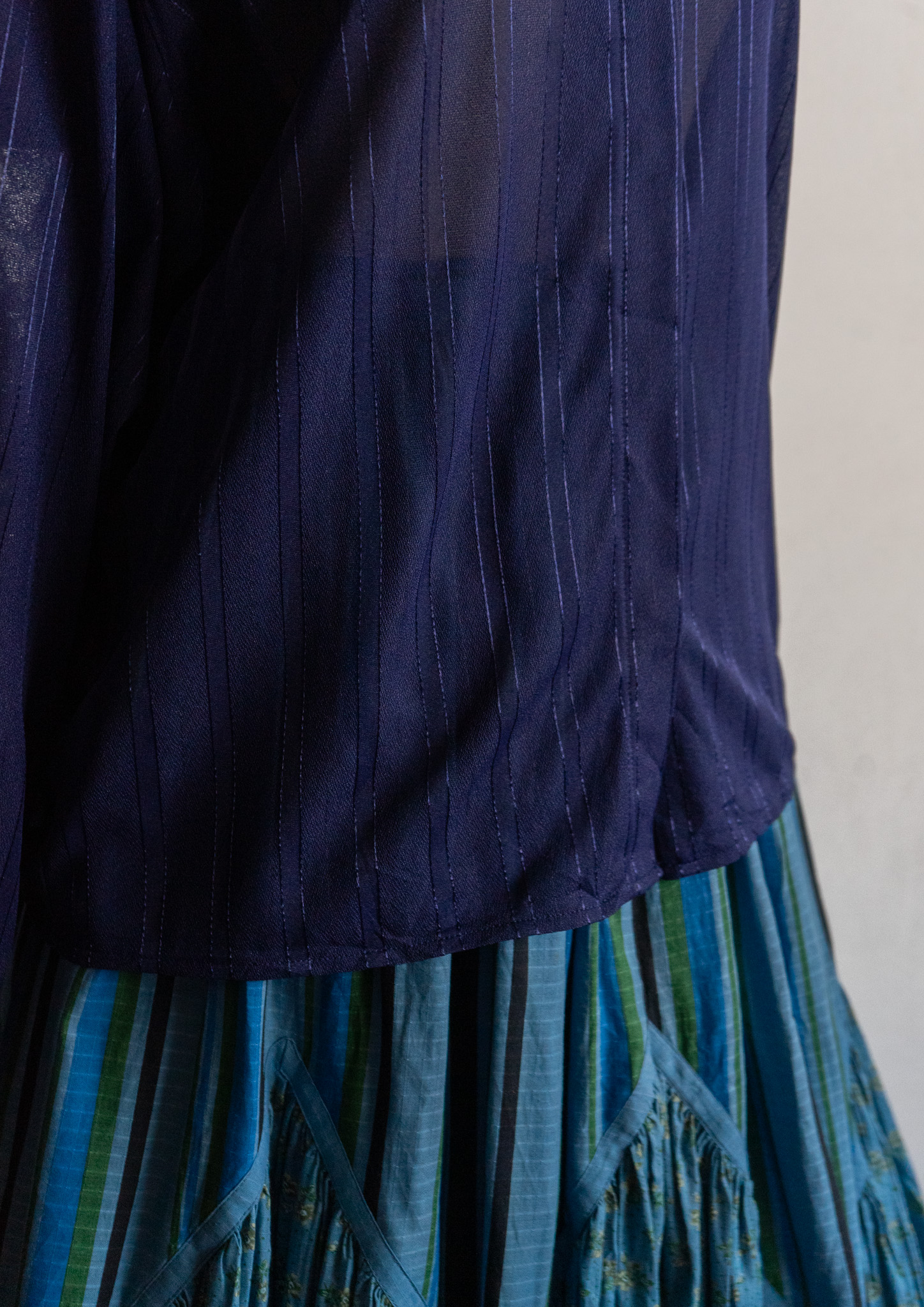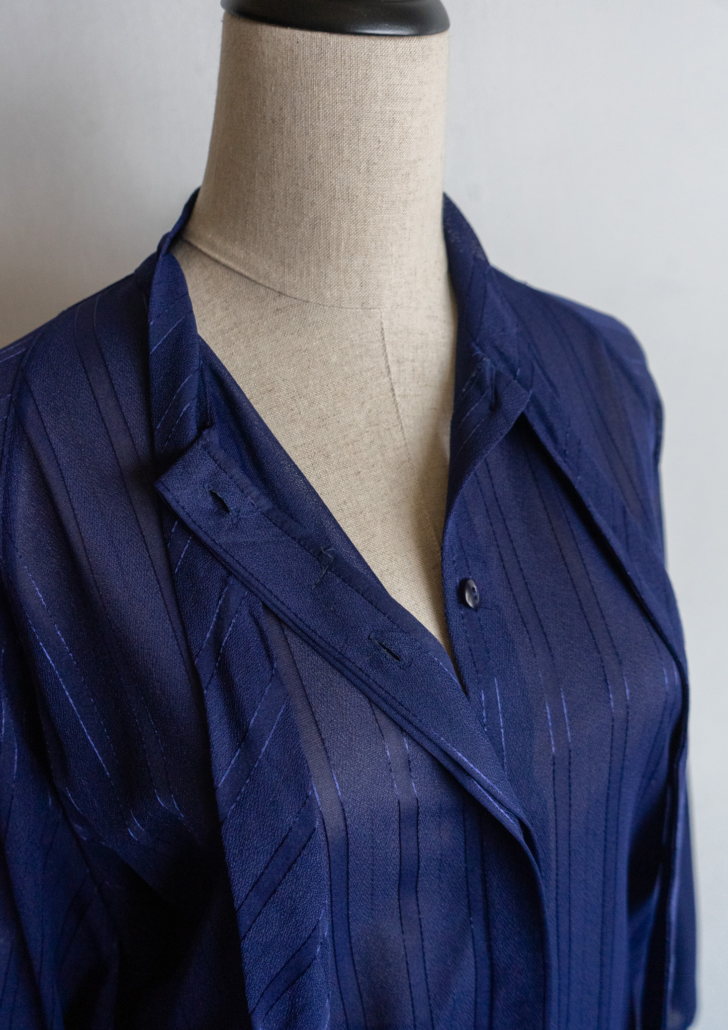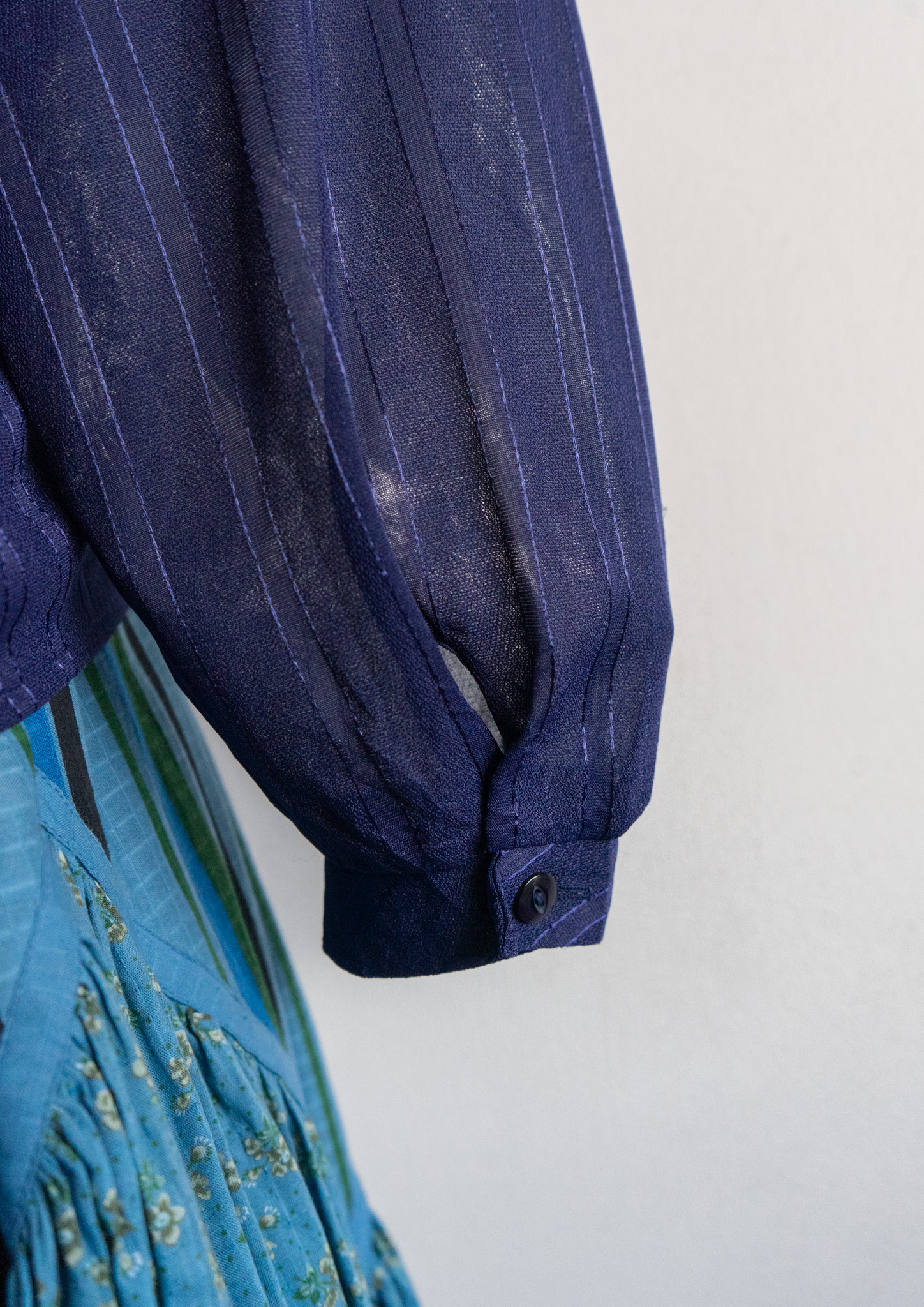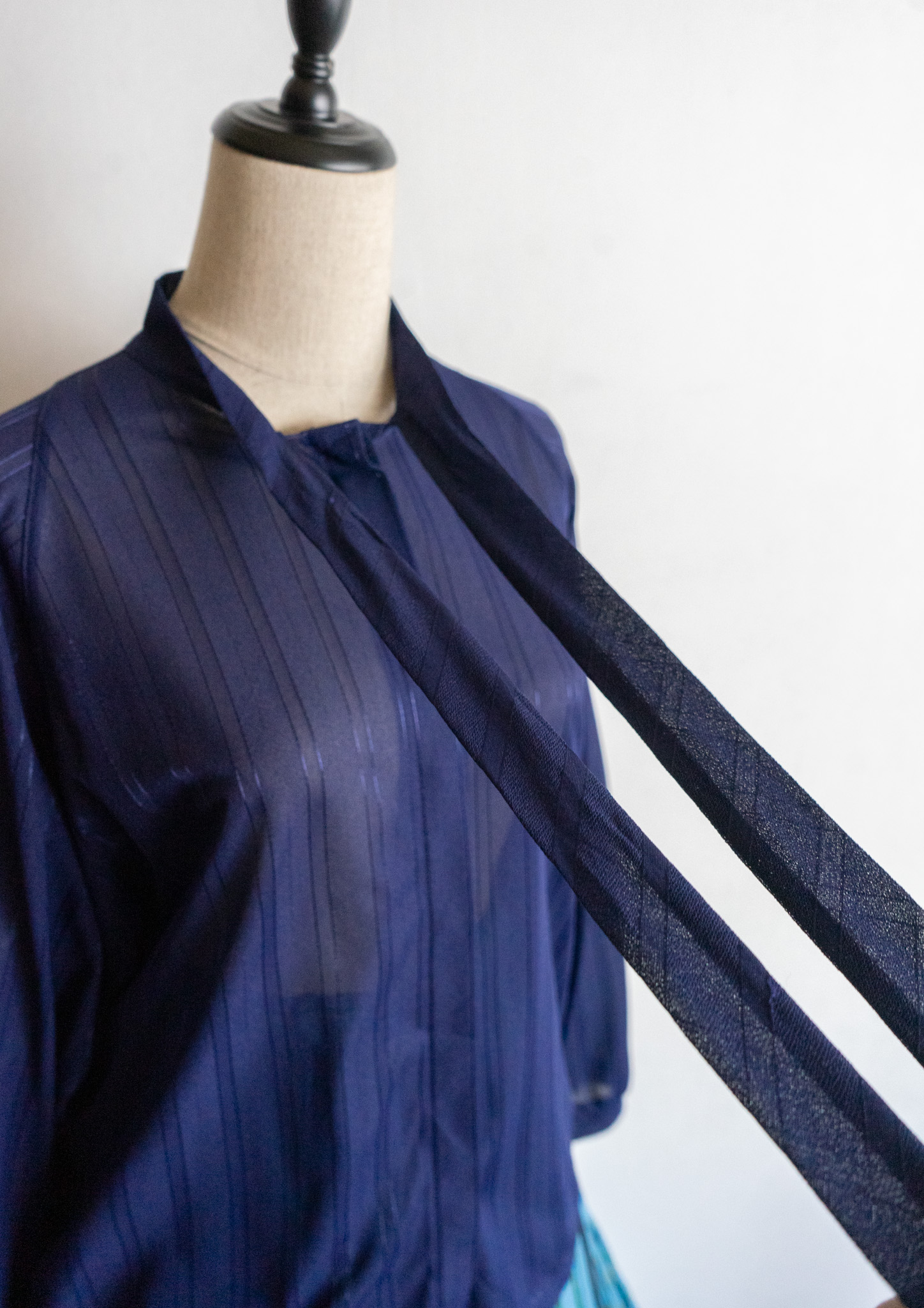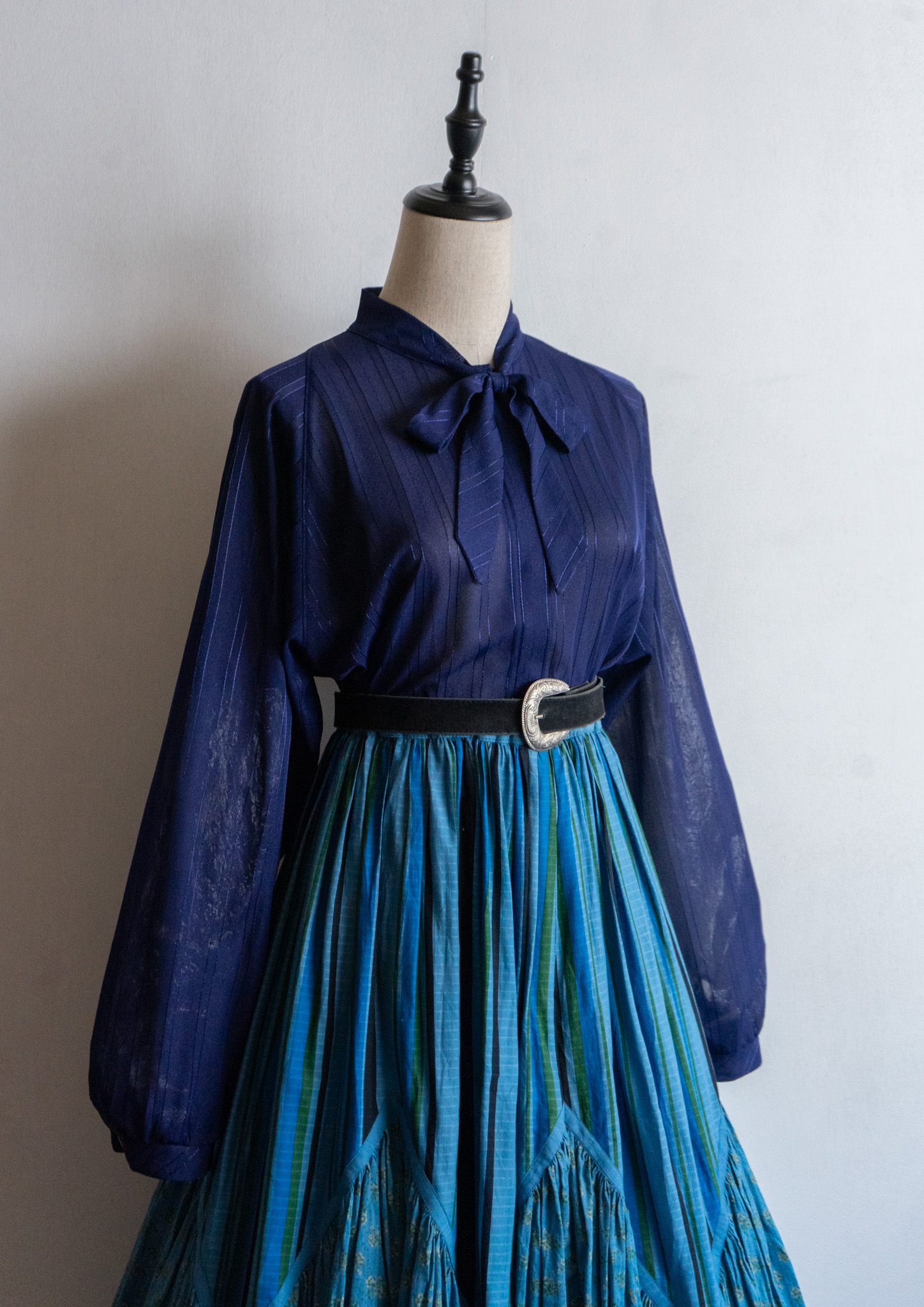 80~90's Euro Stripe Pattern Navy Sheer Bow-tie Blouse