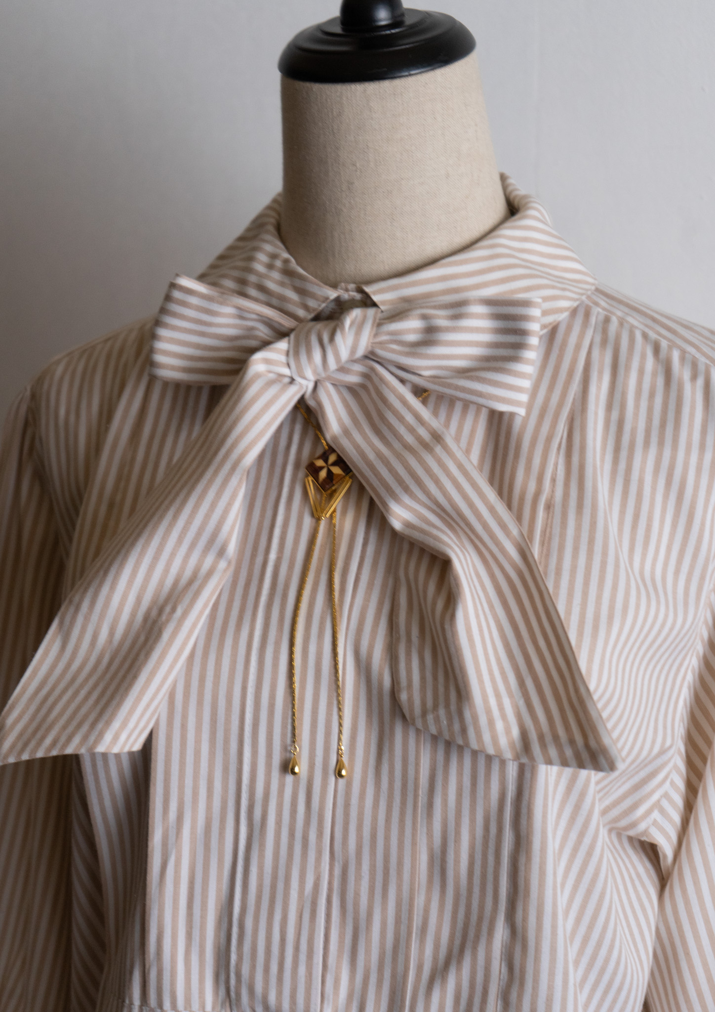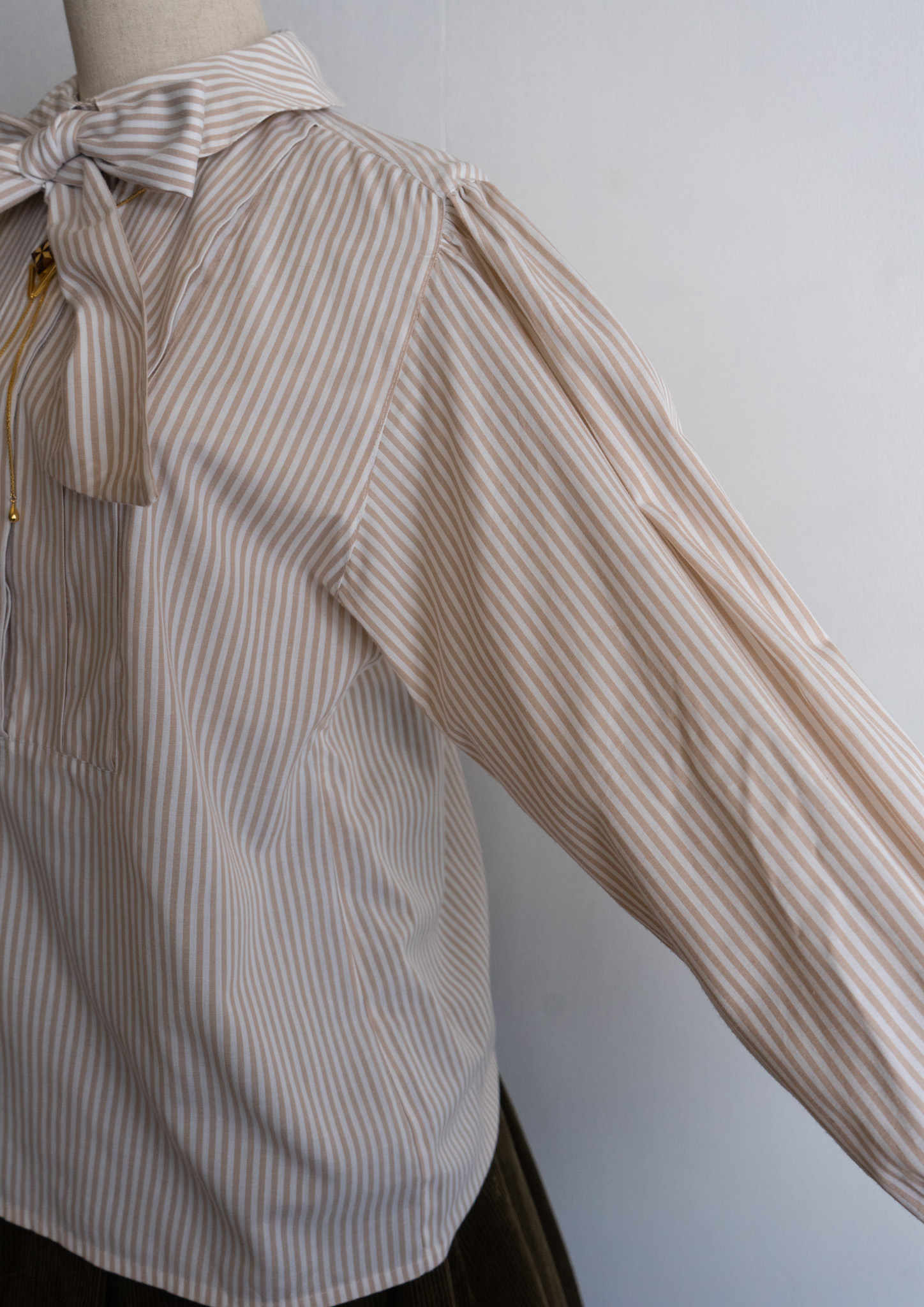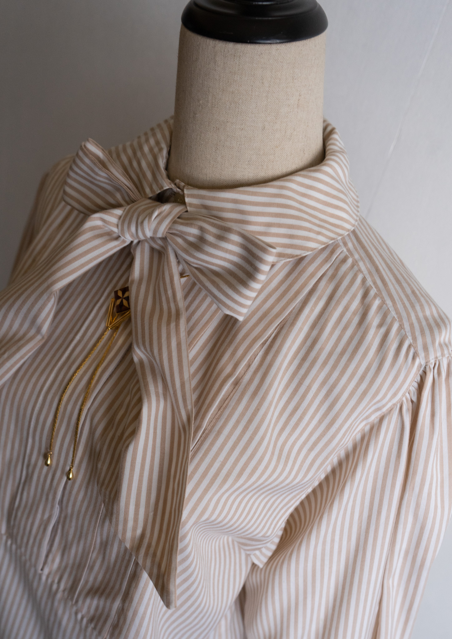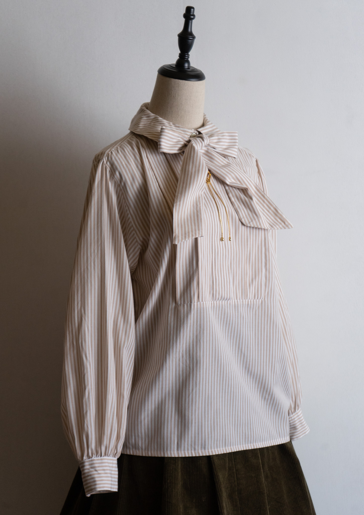 80~90's Beige × White Stripe Pattern Bow-tie Blosue