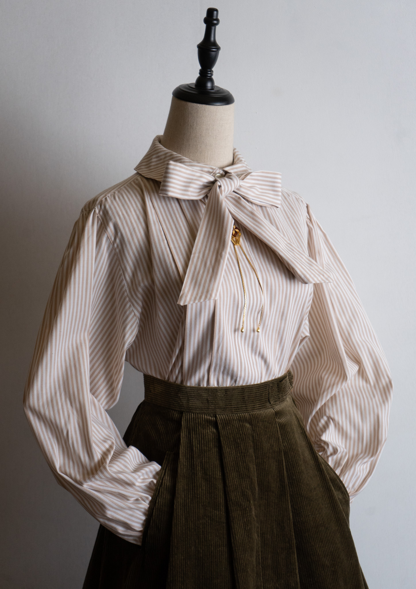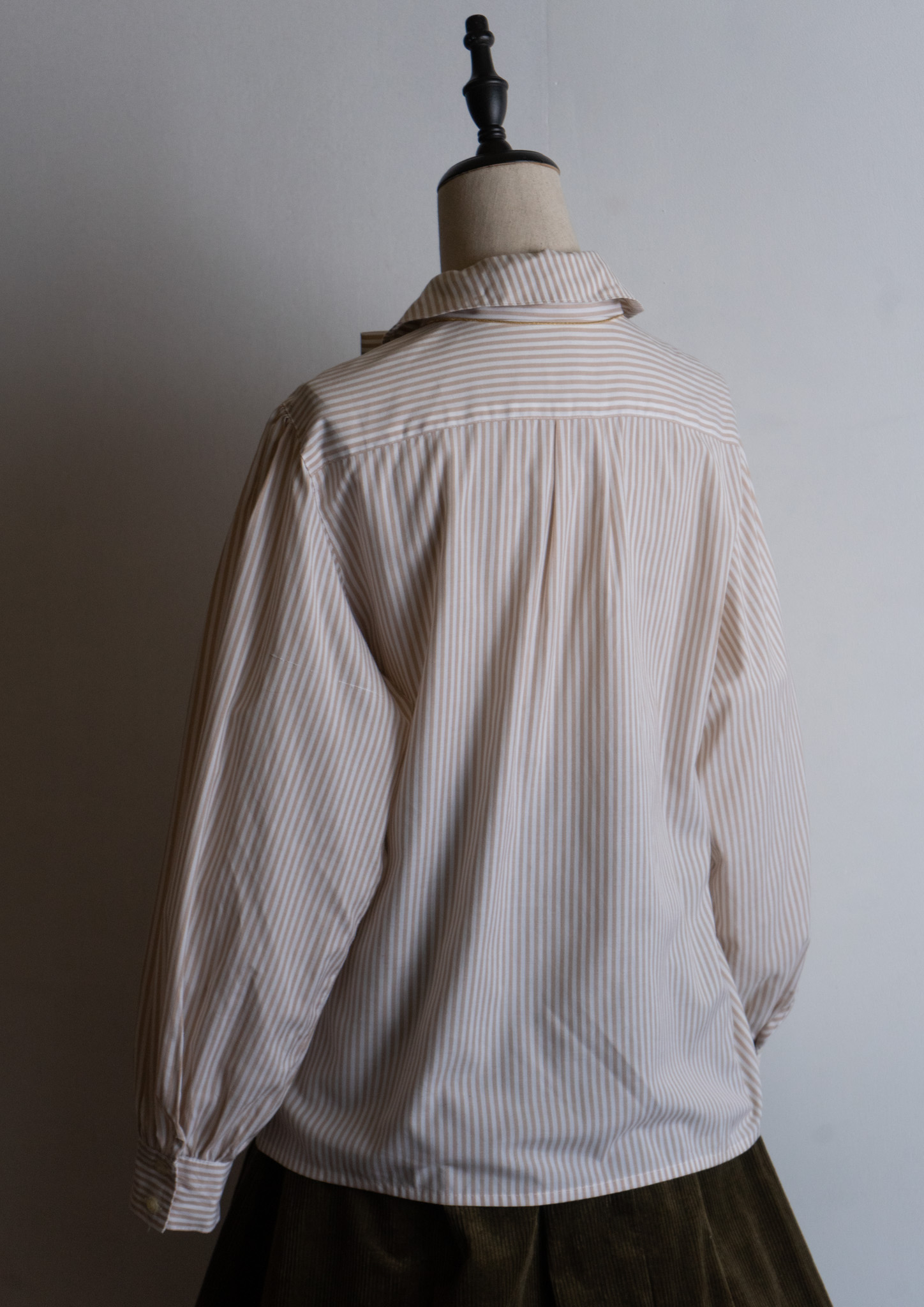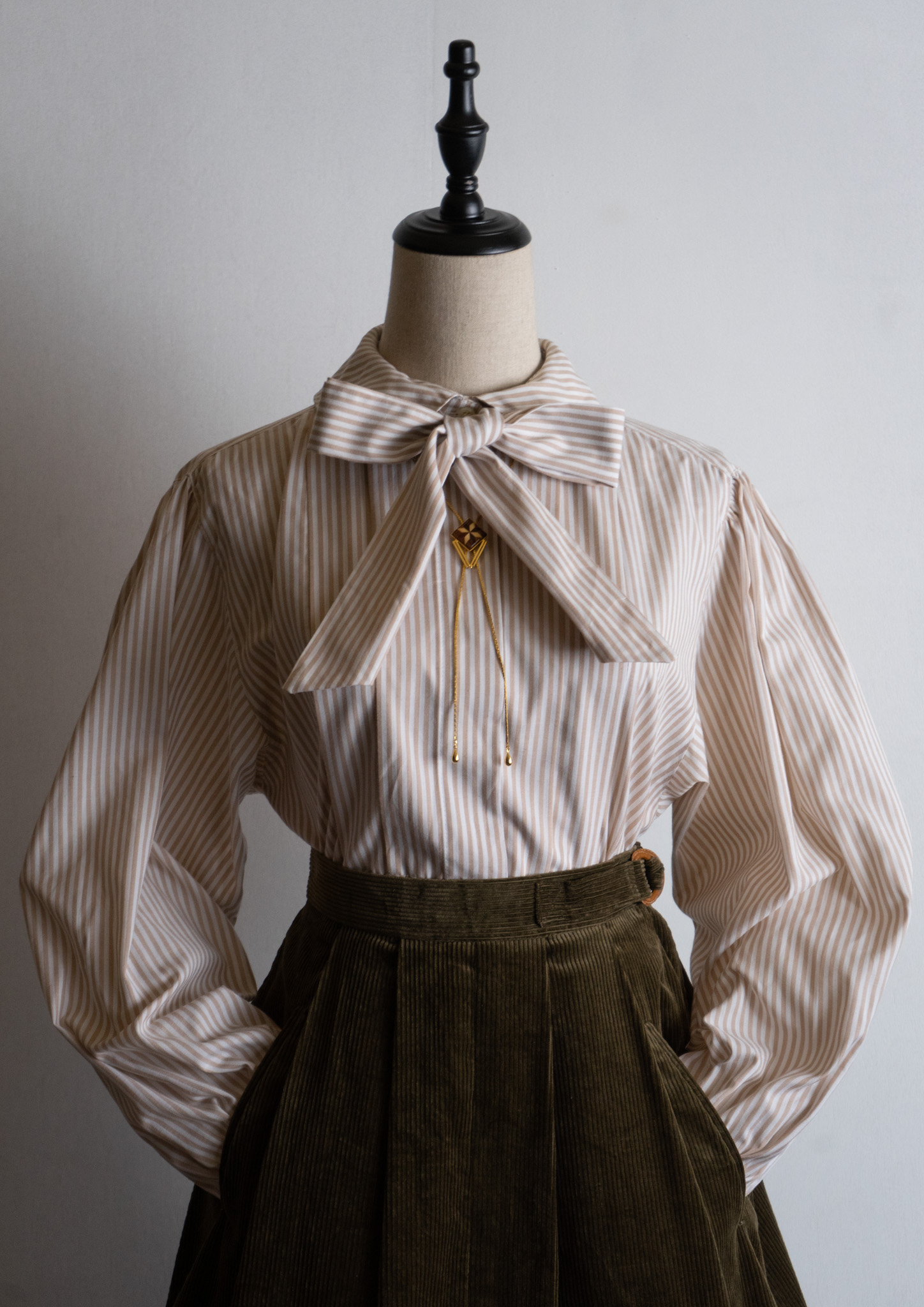 80~90's Beige × White Stripe Pattern Bow-tie Blosue