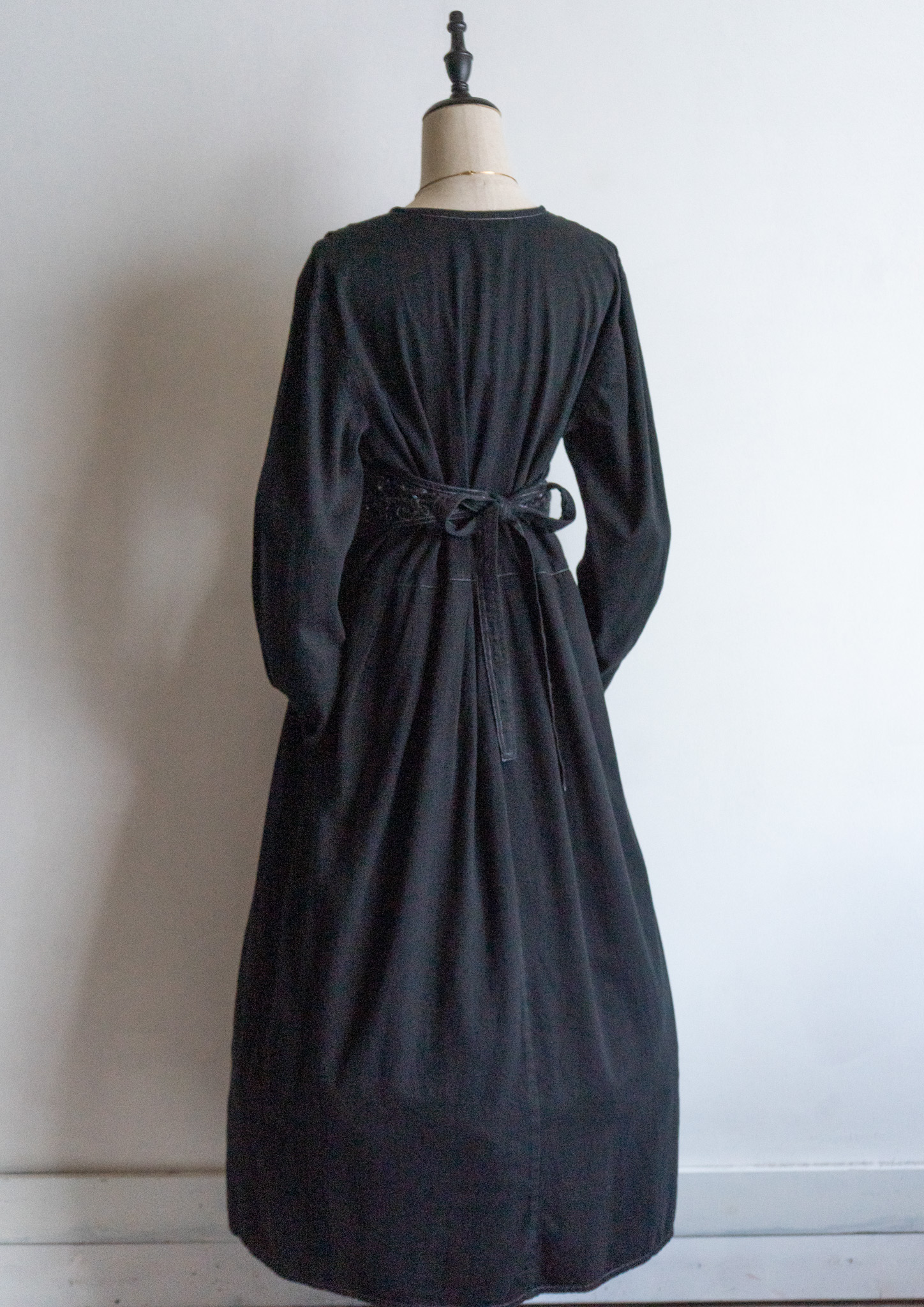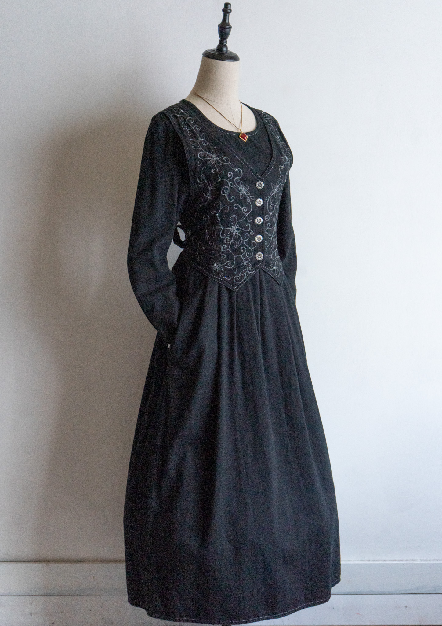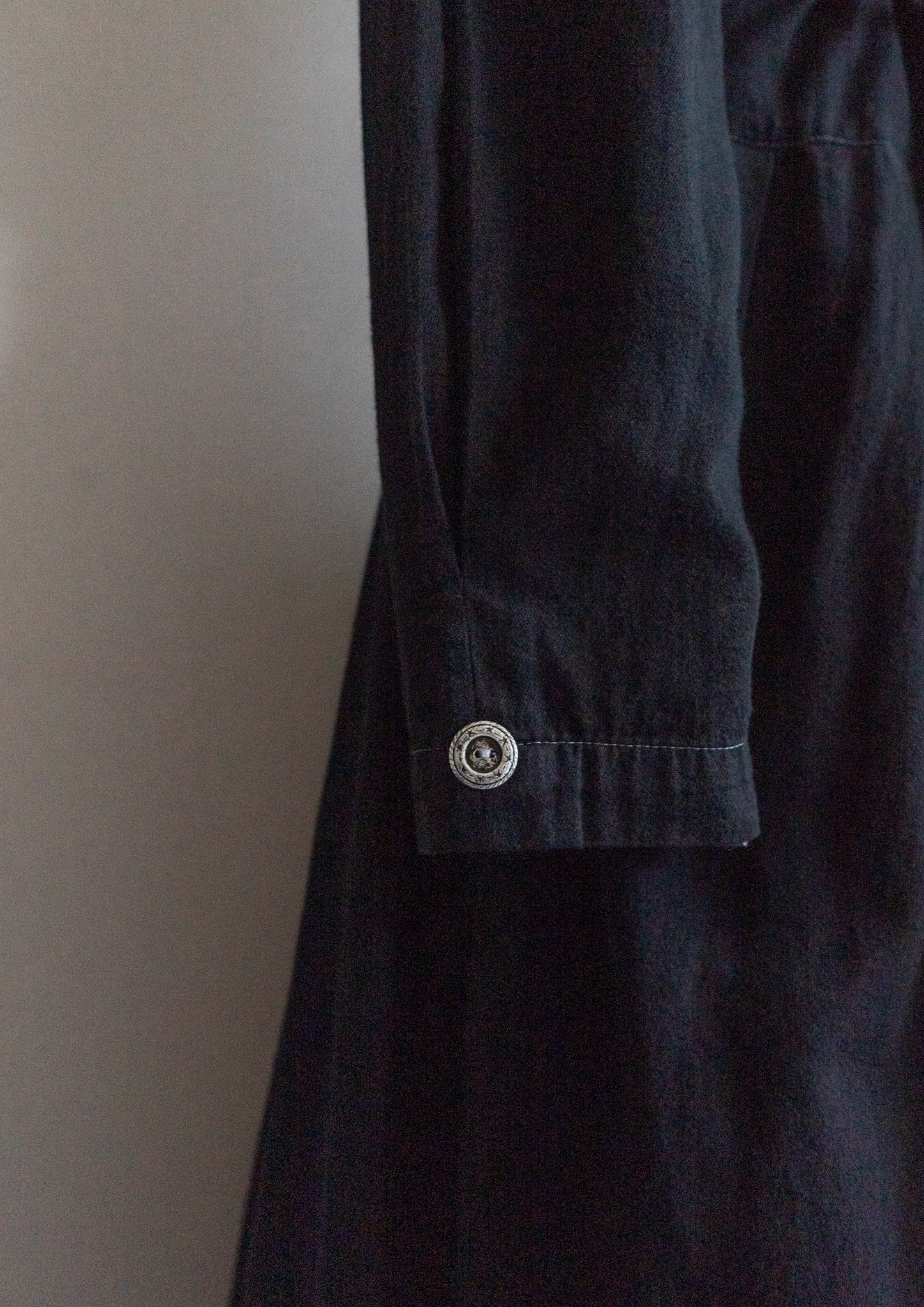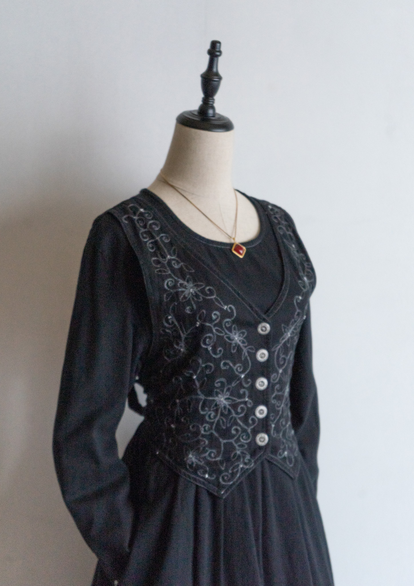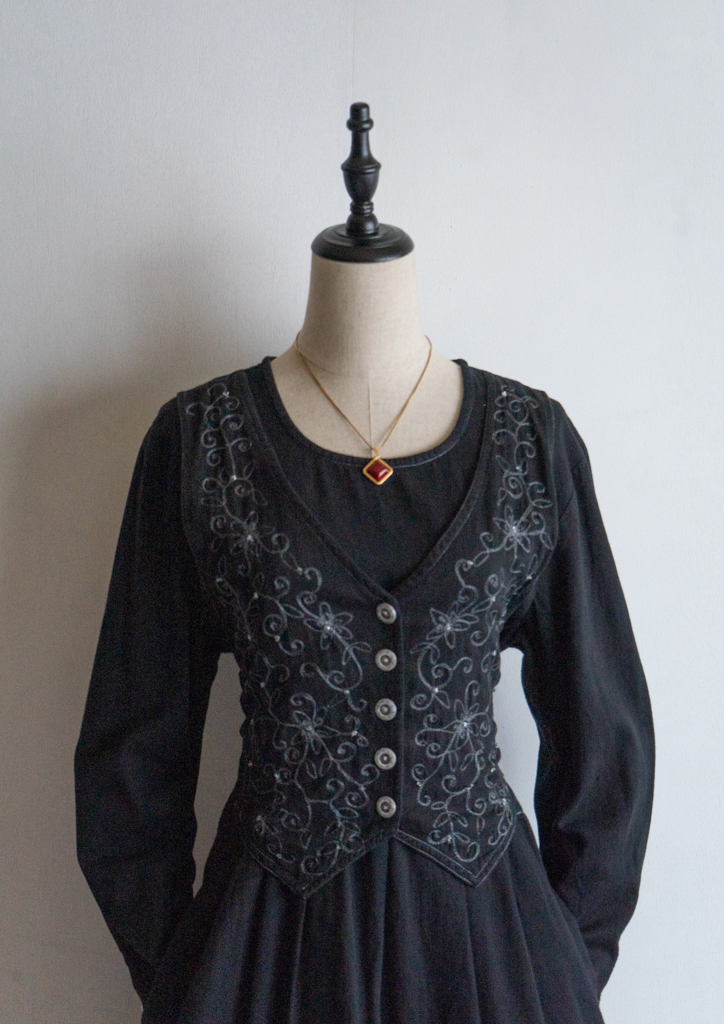 90's Black Velour Collar × Button Gray Over Dye Maxi Dress
