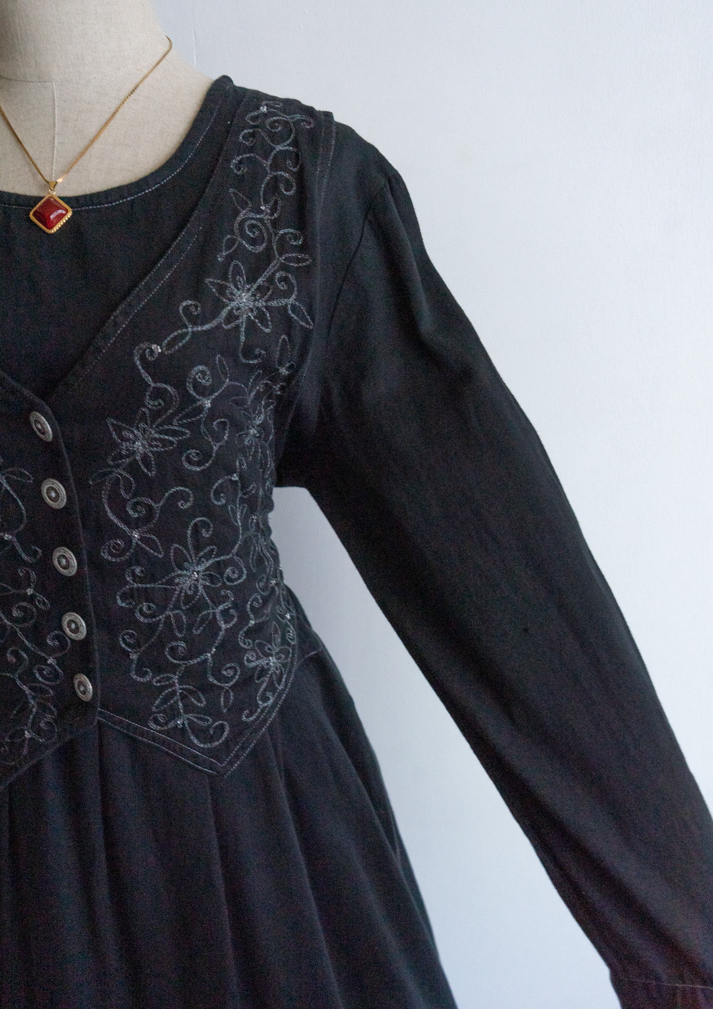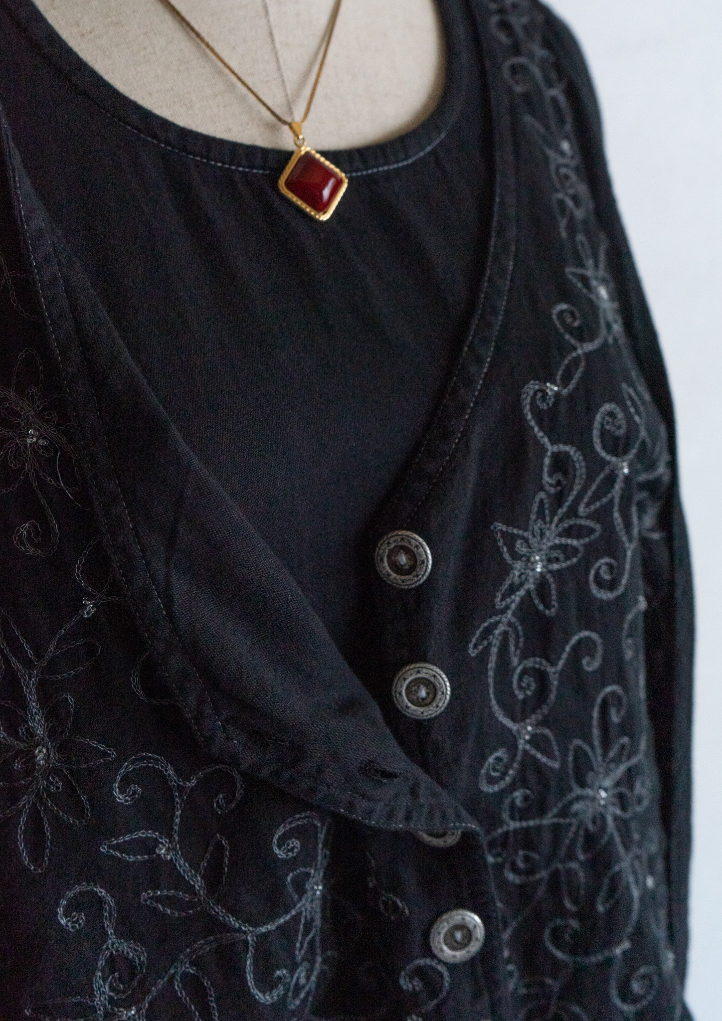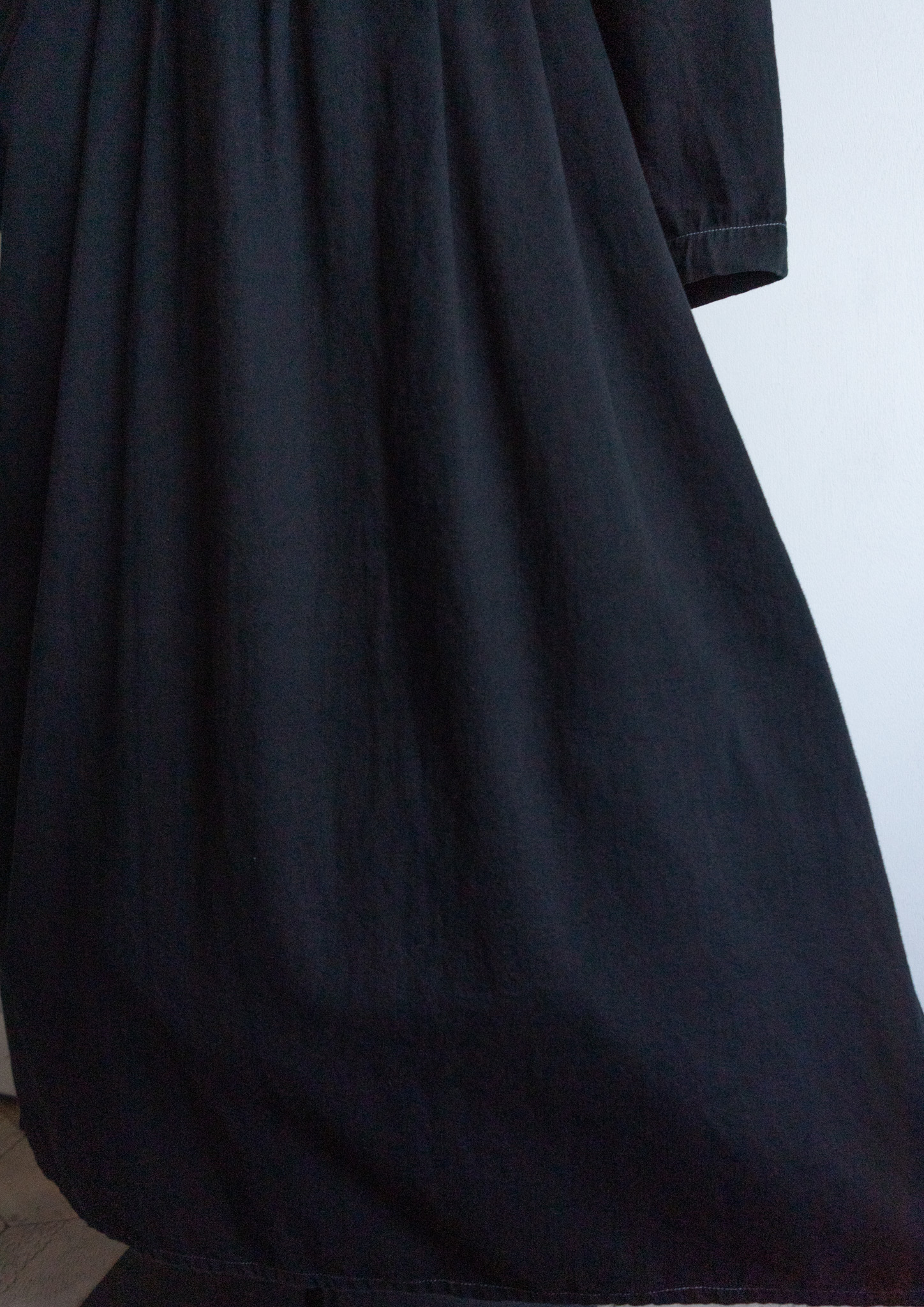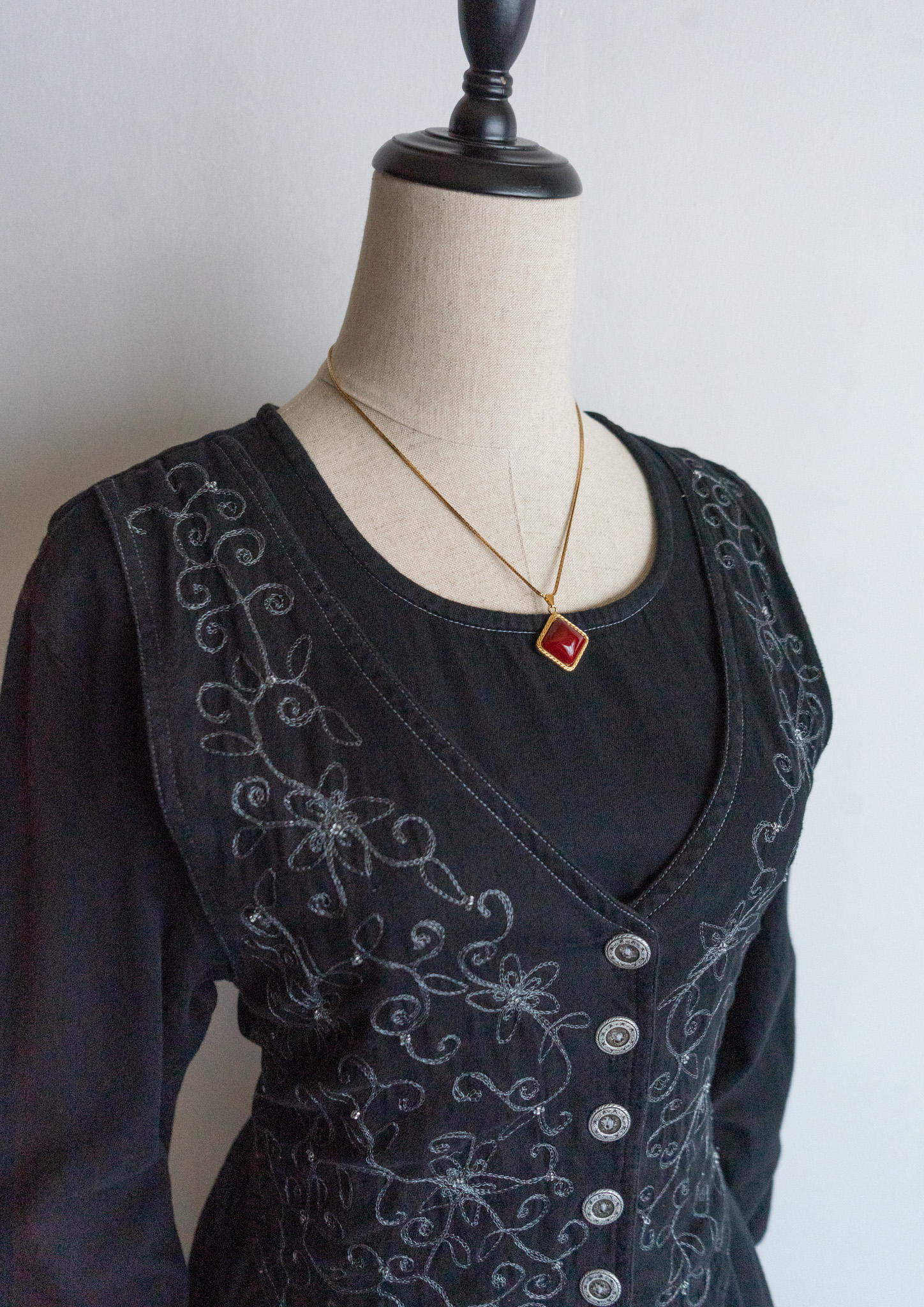 90's Black Velour Collar × Button Gray Over Dye Maxi Dress