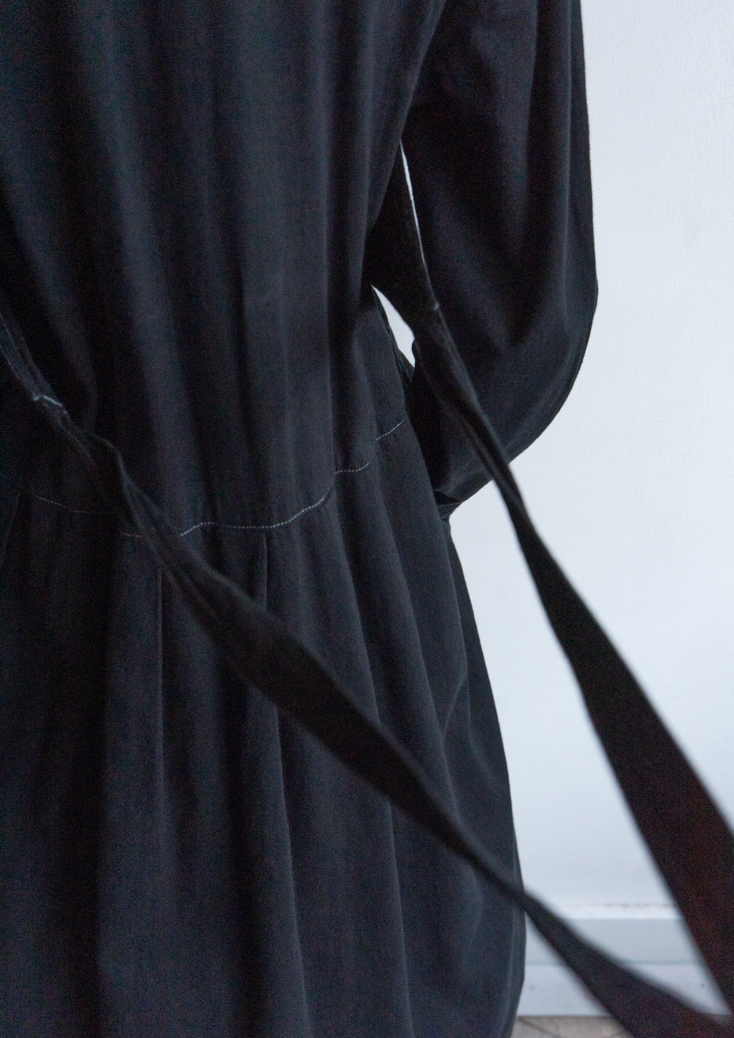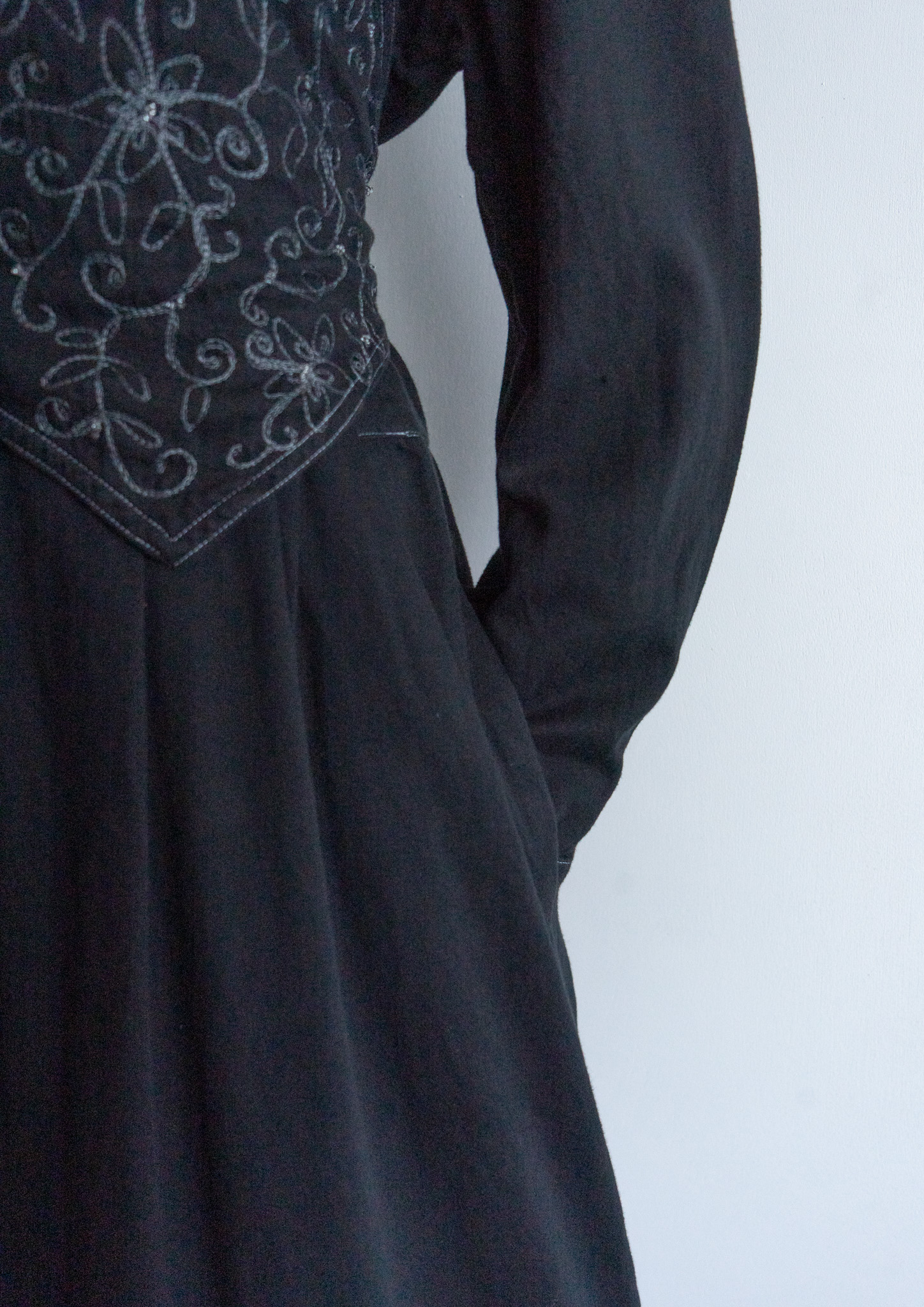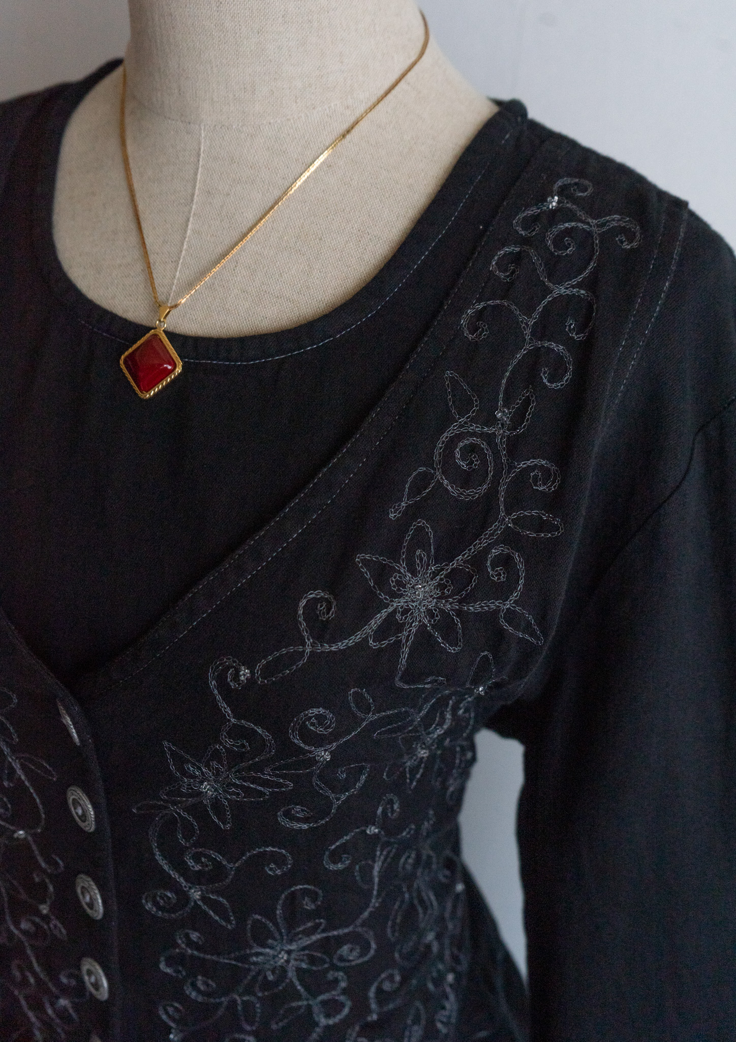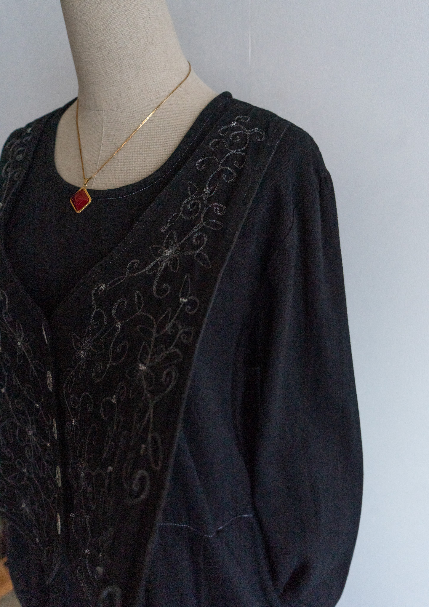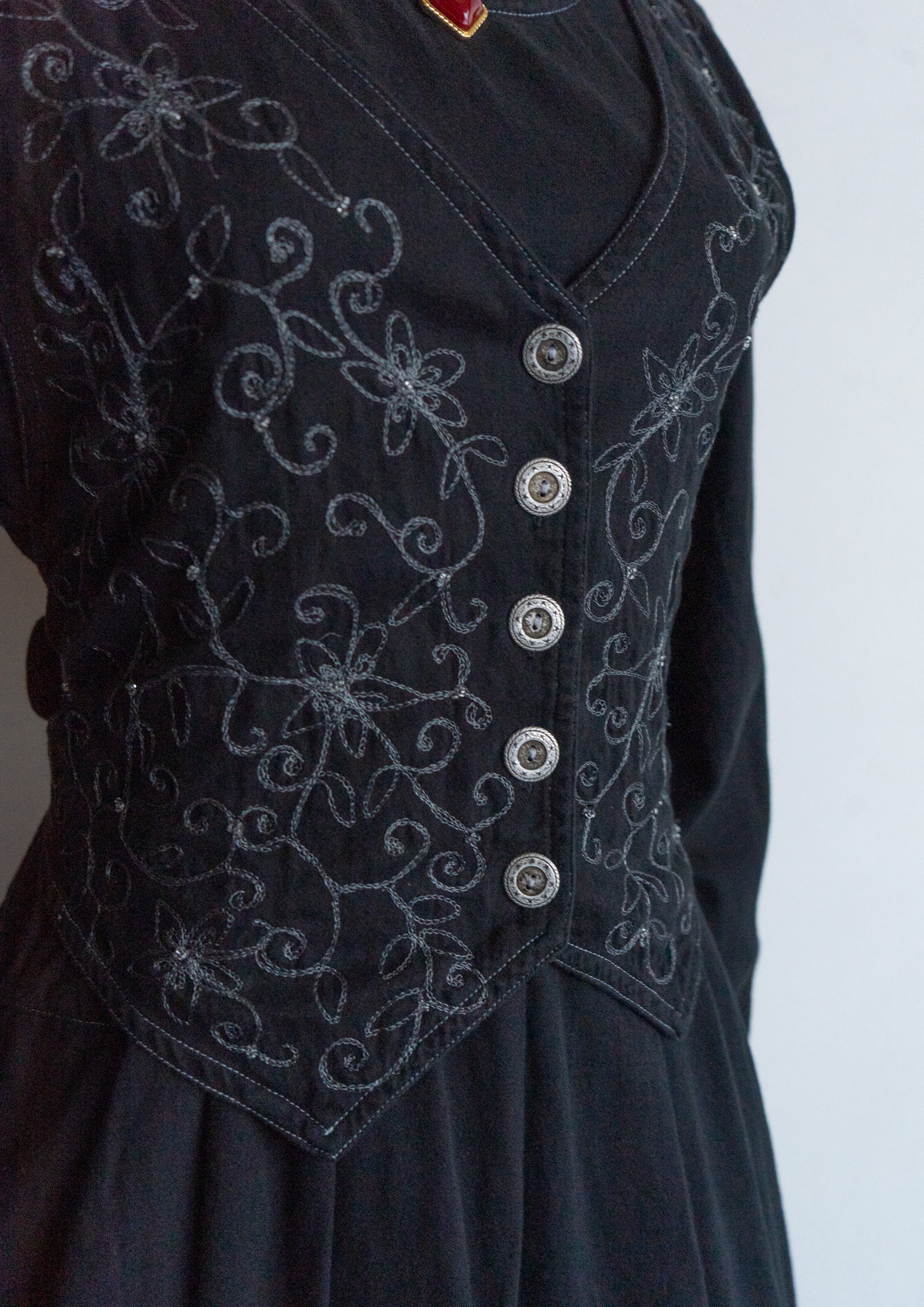 90's Black Velour Collar × Button Gray Over Dye Maxi Dress