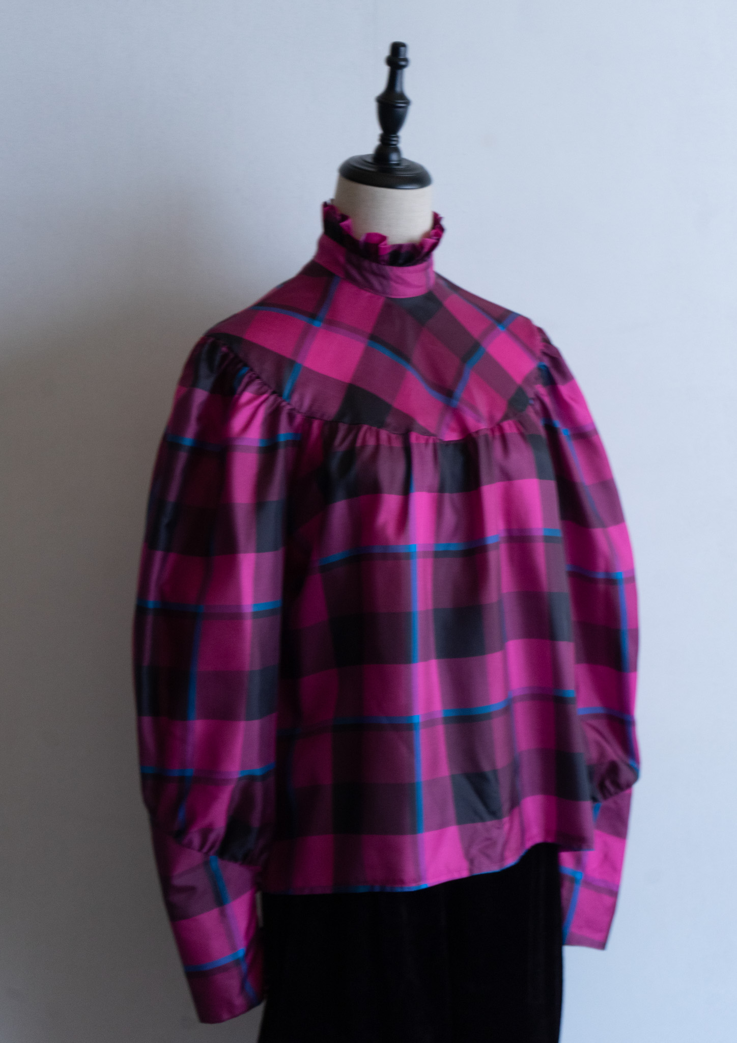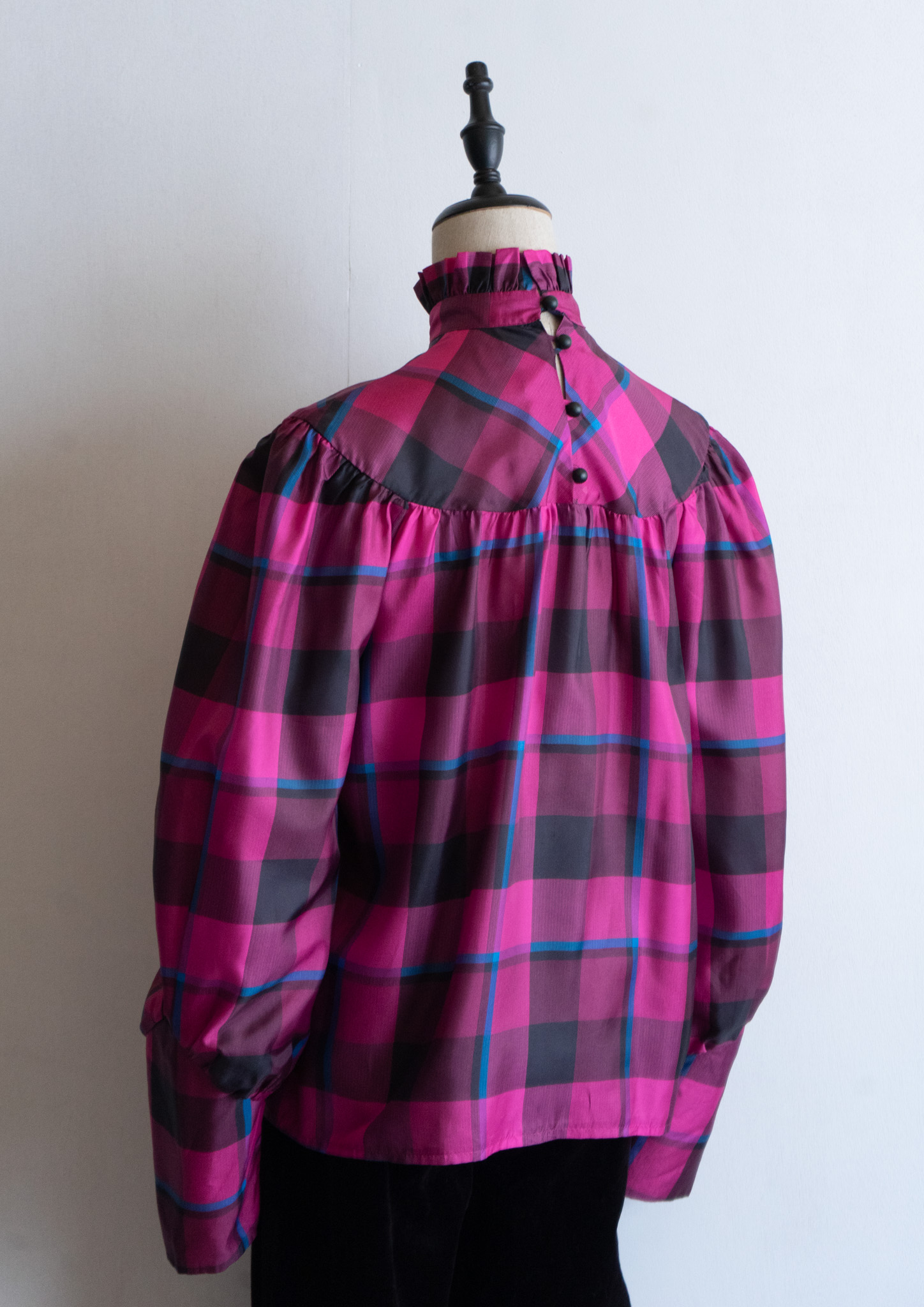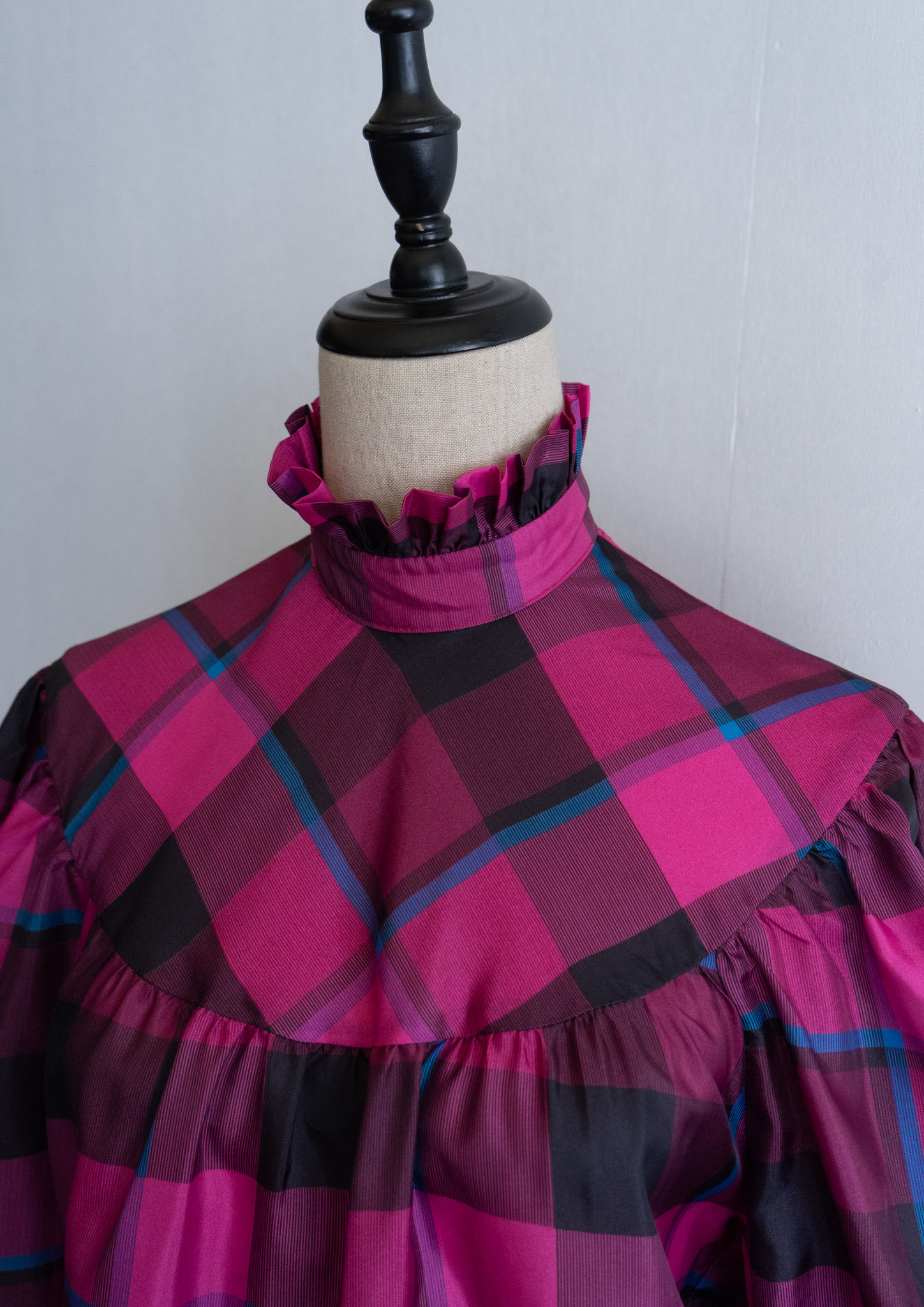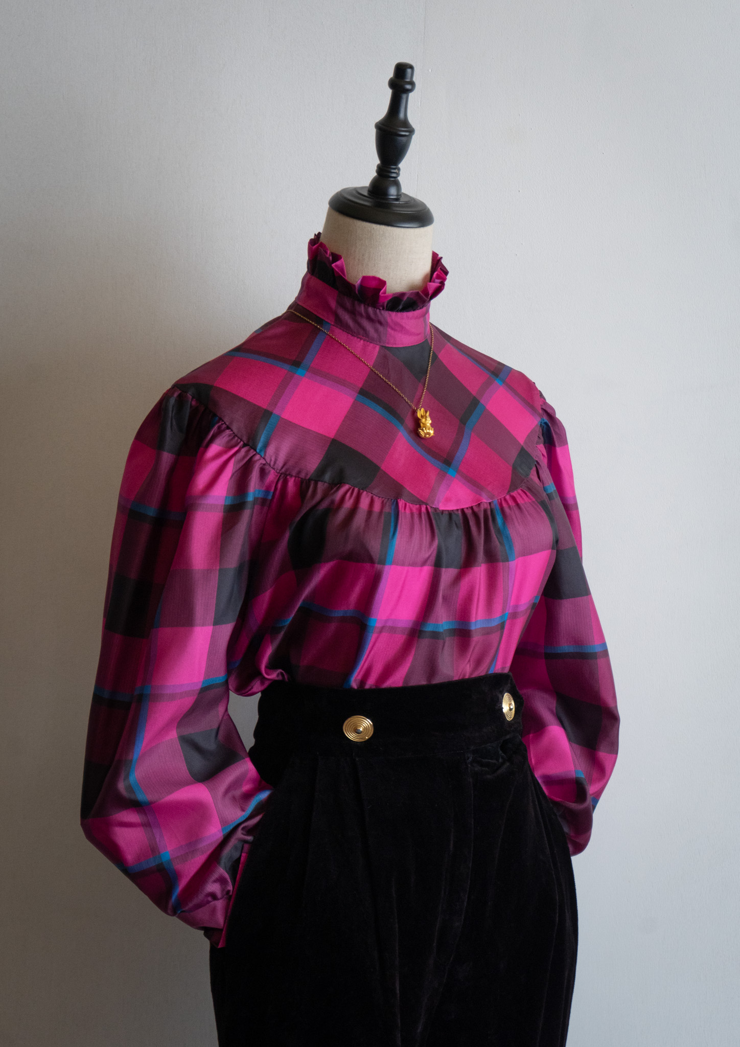 80's Euro Stand Frill Collar Gather Design Check Pattern Dark Pink Tops