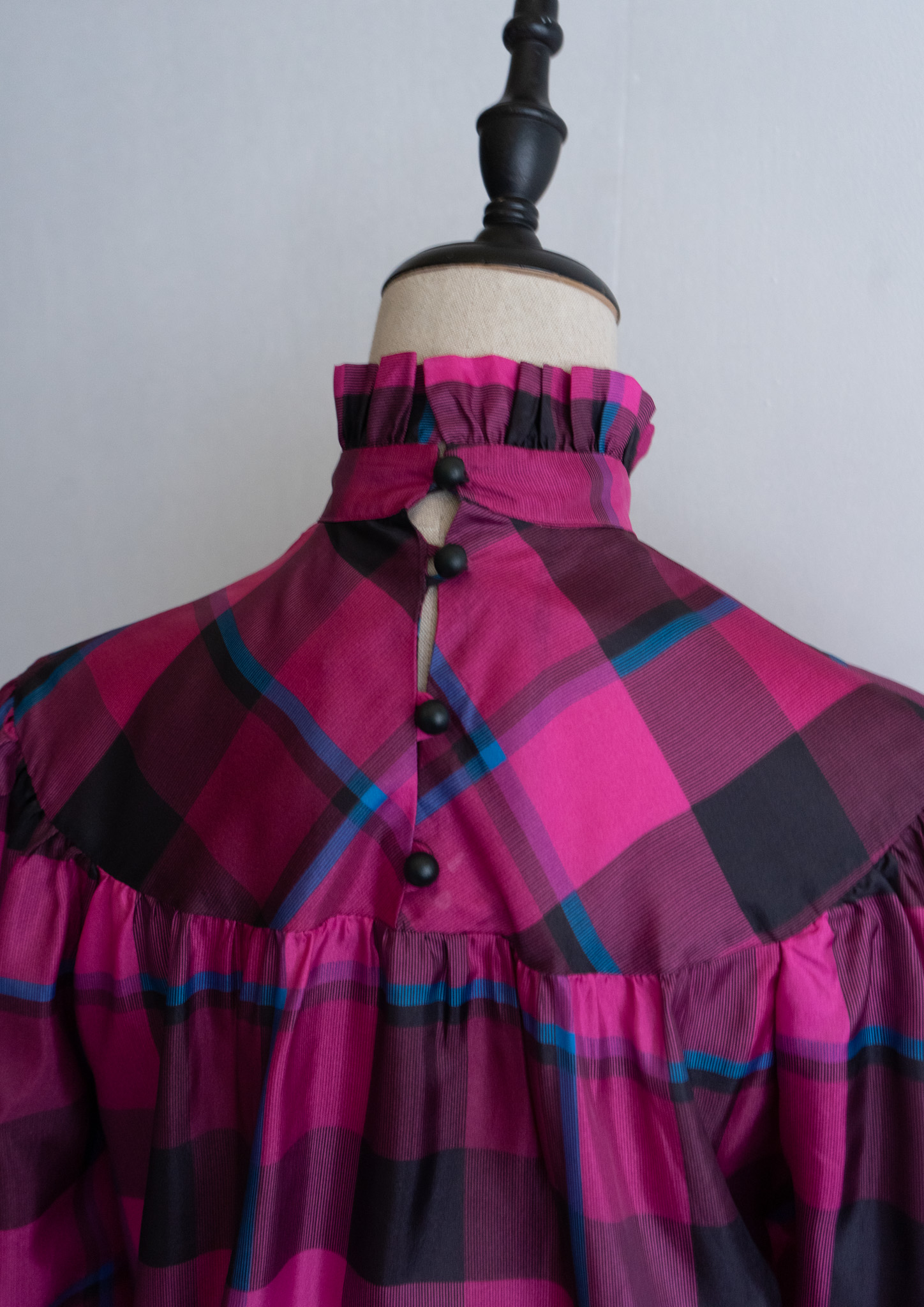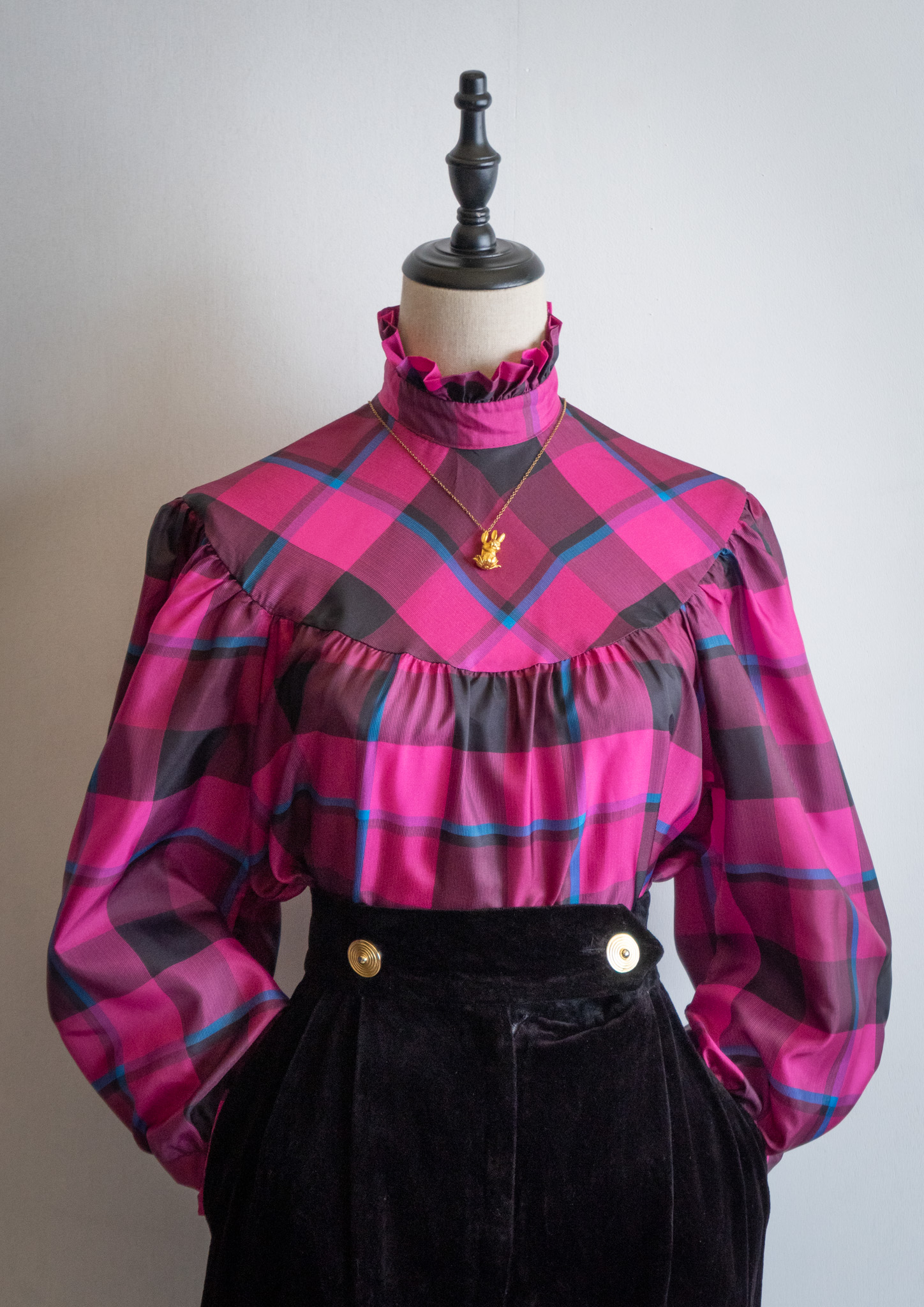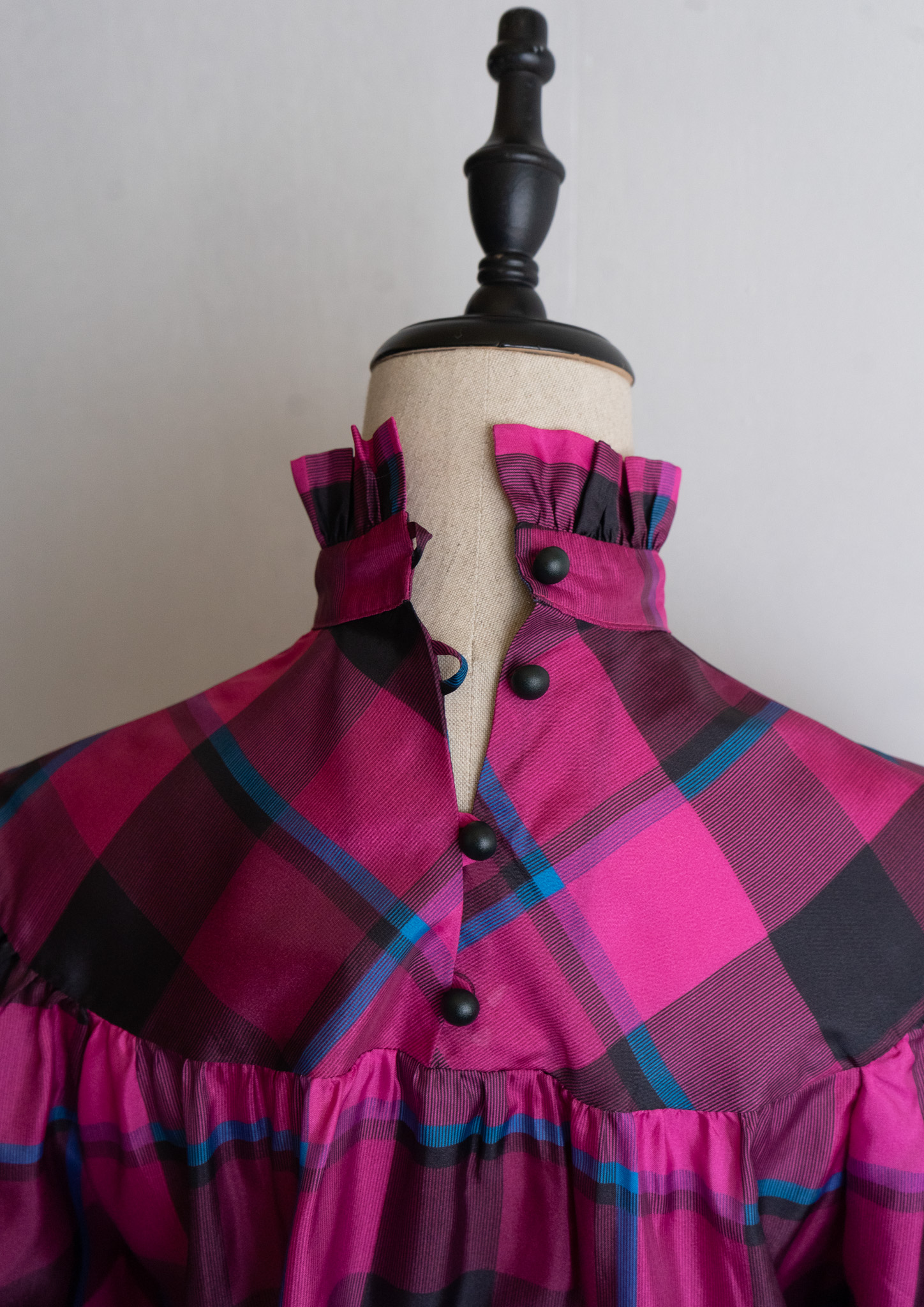 80's Euro Stand Frill Collar Gather Design Check Pattern Dark Pink Tops