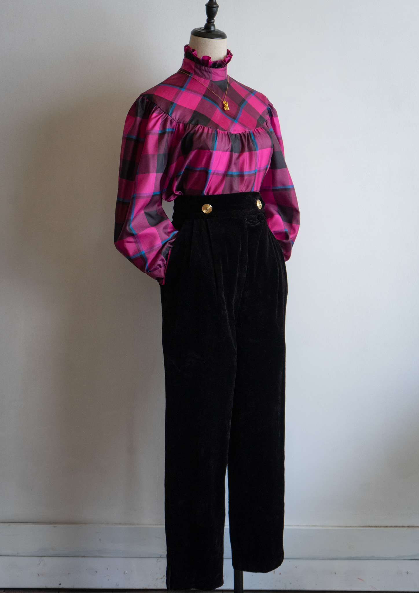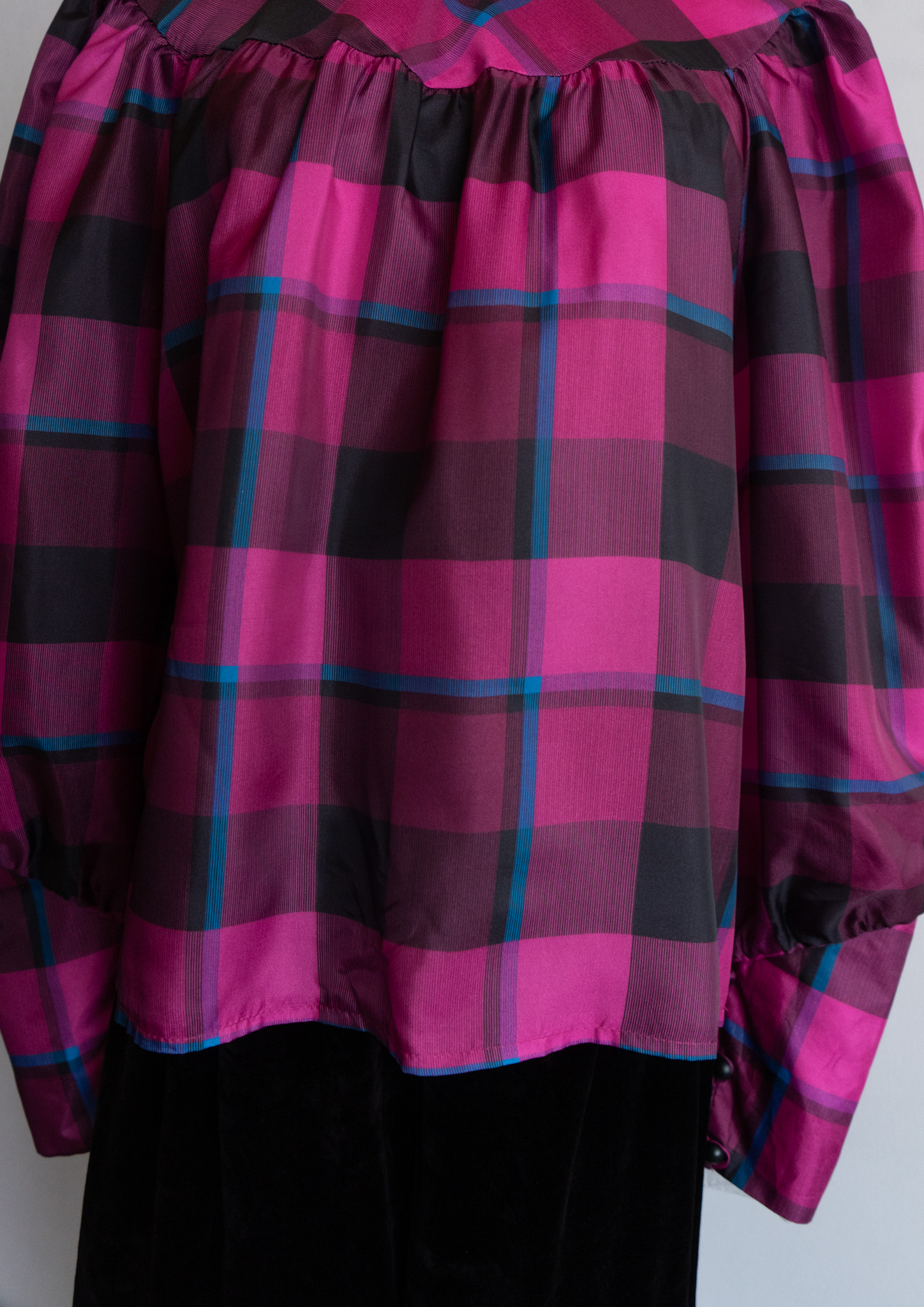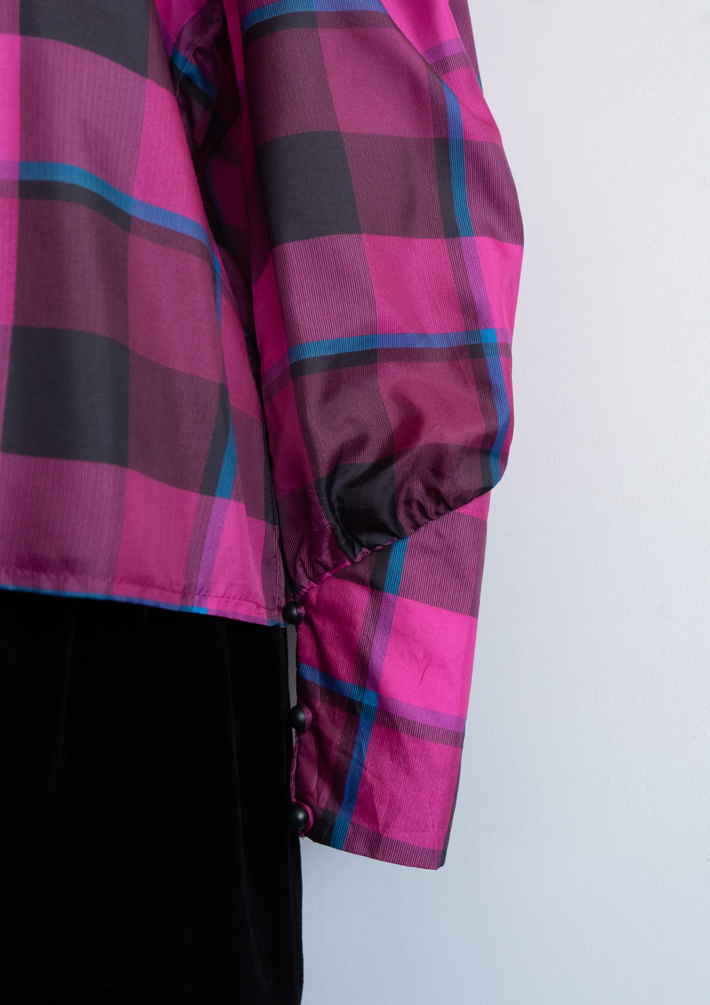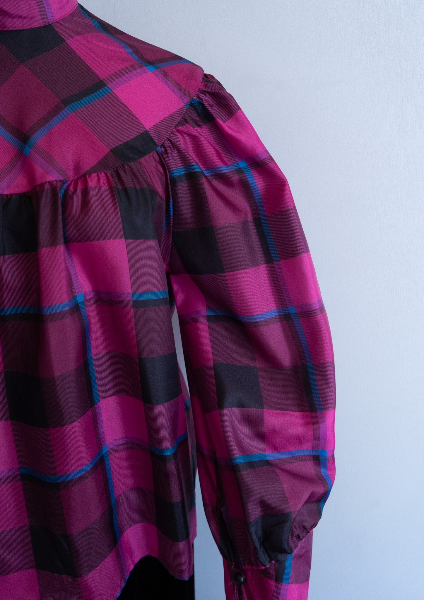 80's Euro Stand Frill Collar Gather Design Check Pattern Dark Pink Tops