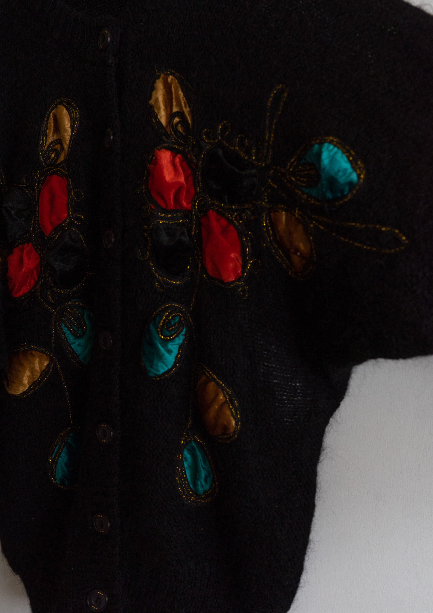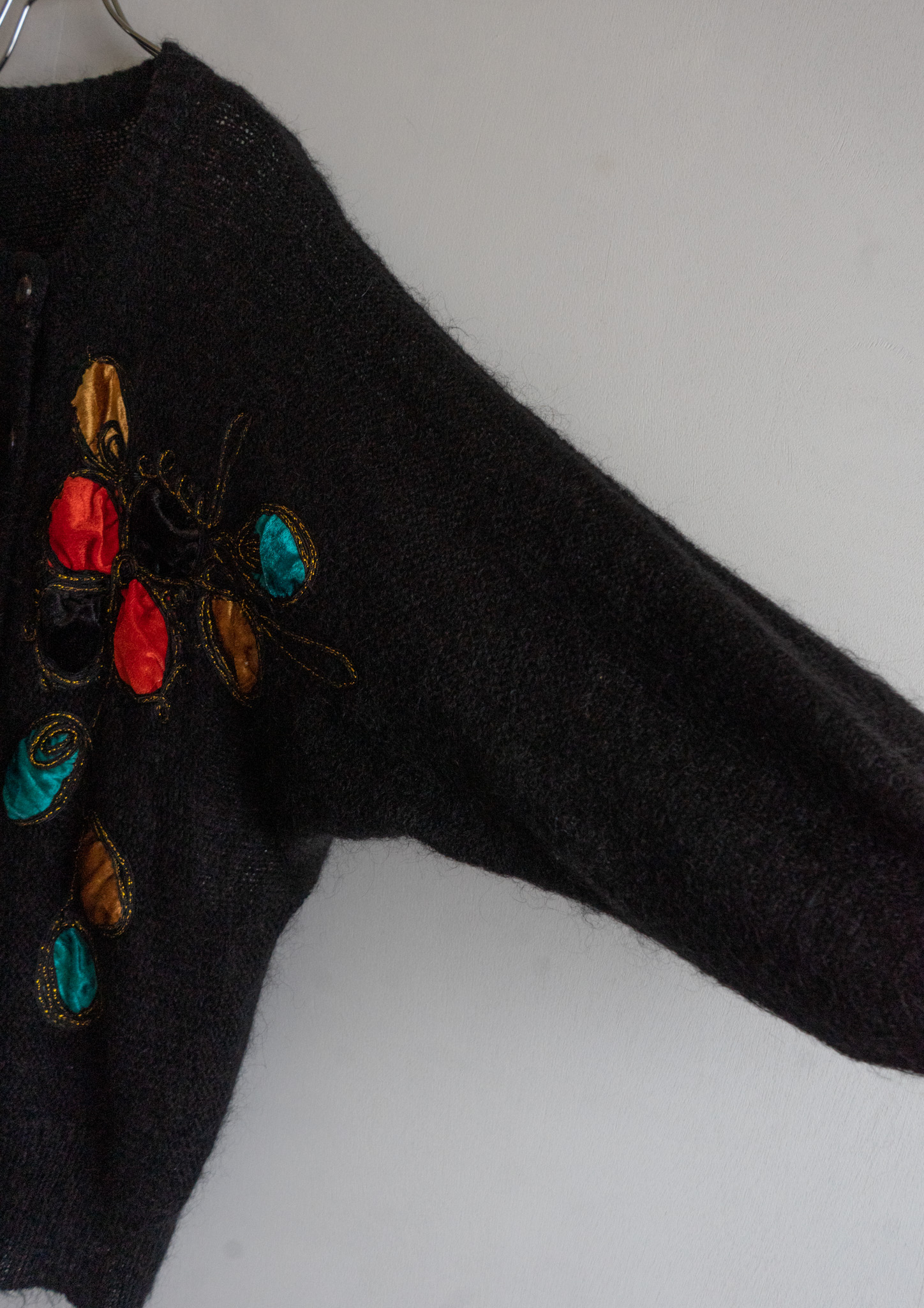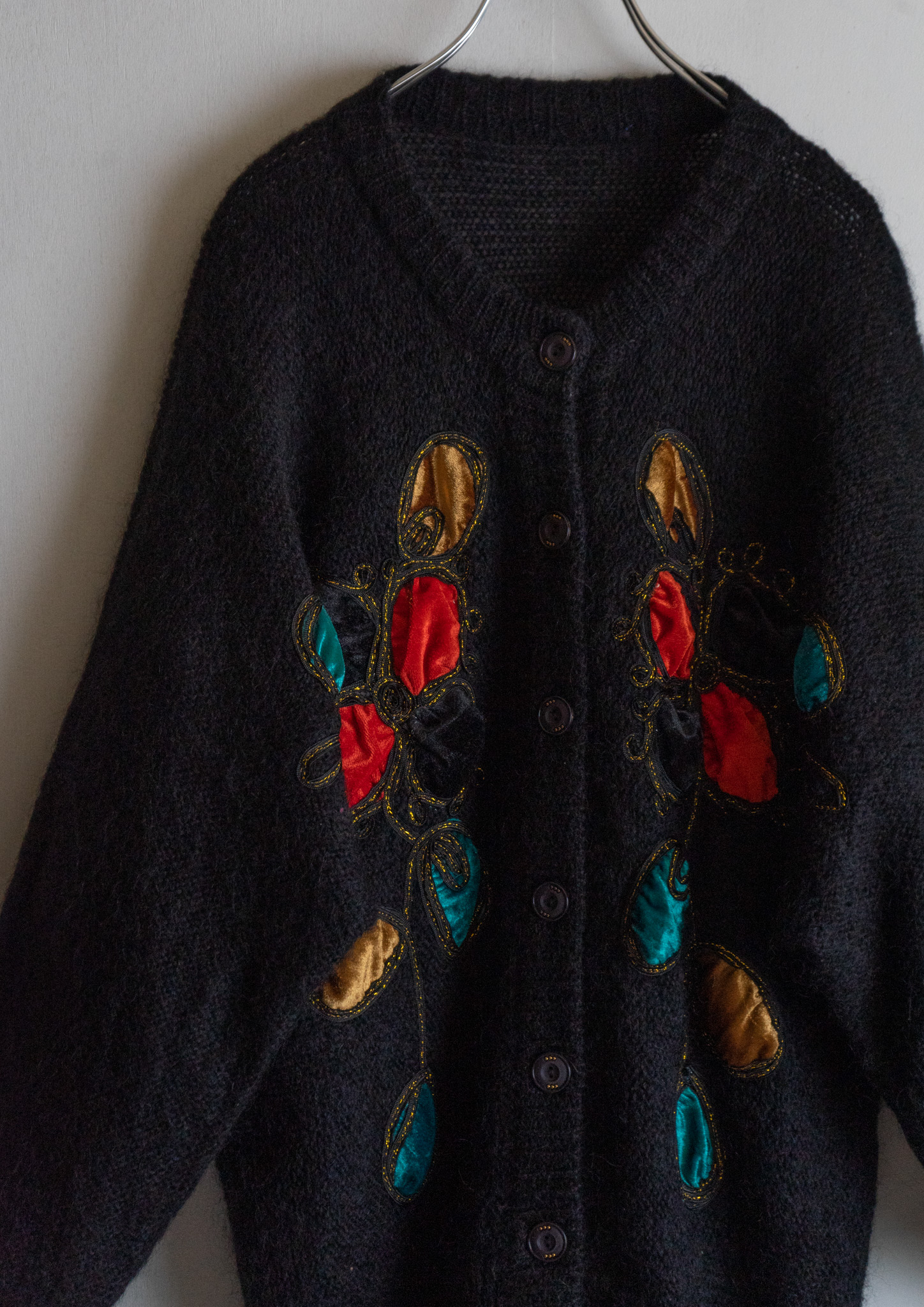 80's Unique Velour Flower Design Black Cardigan
