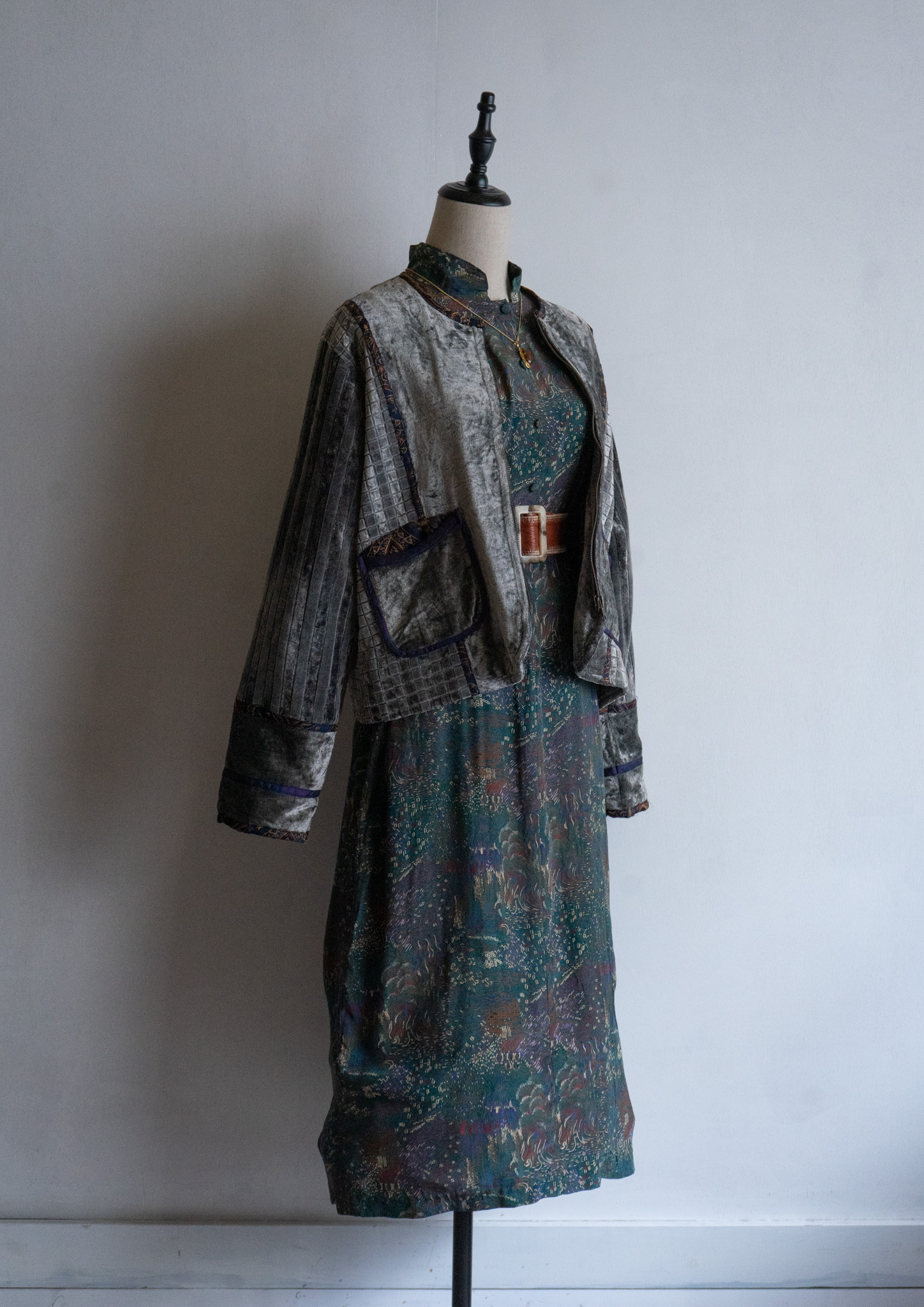 90's Black Velour Collar × Button Gray Over Dye Maxi Dress