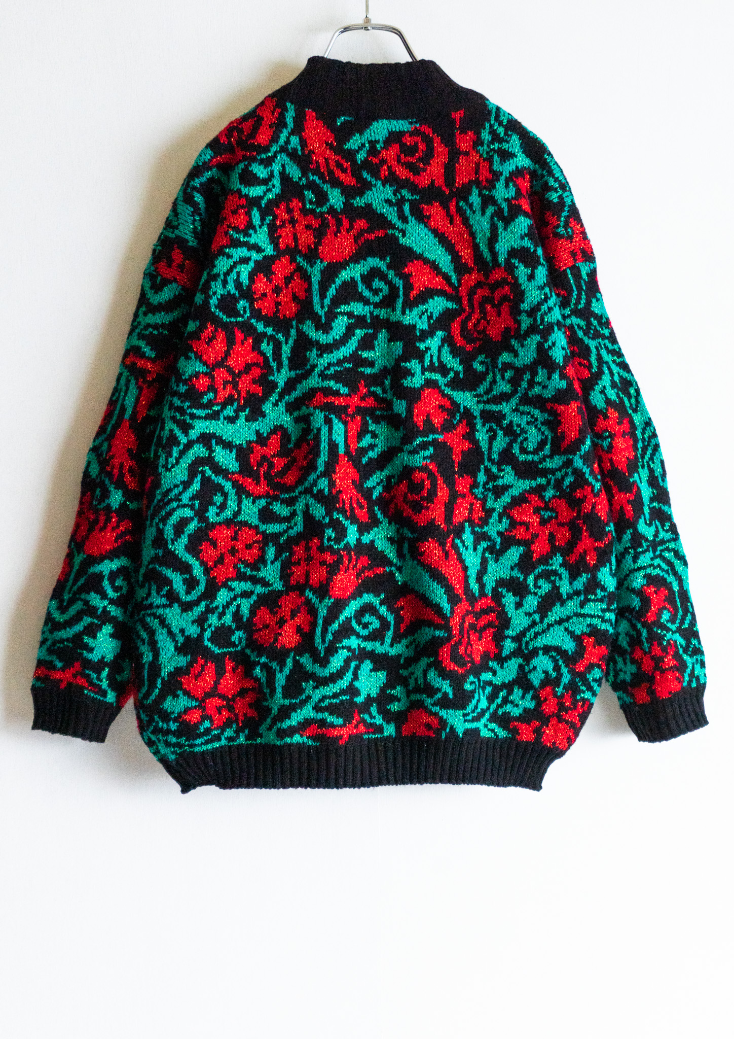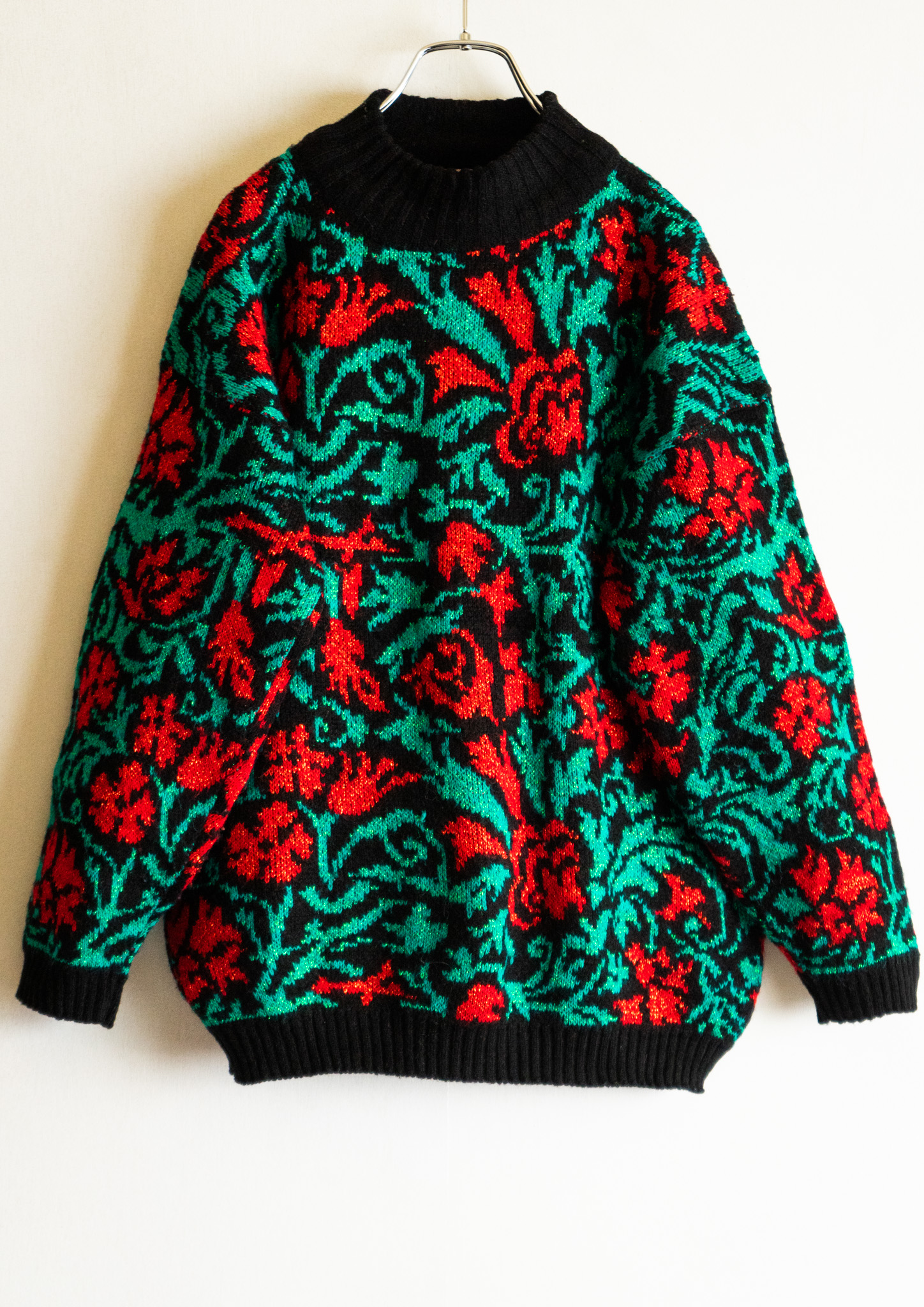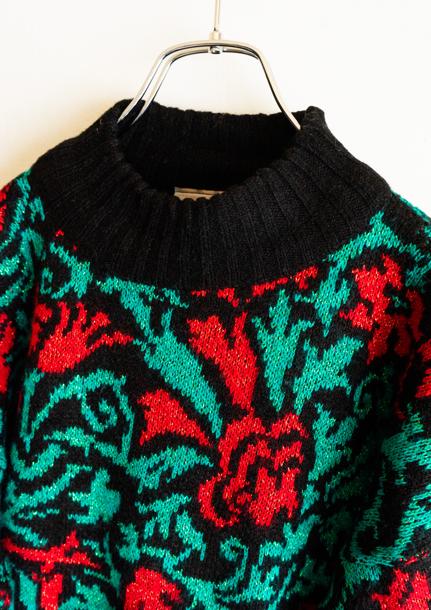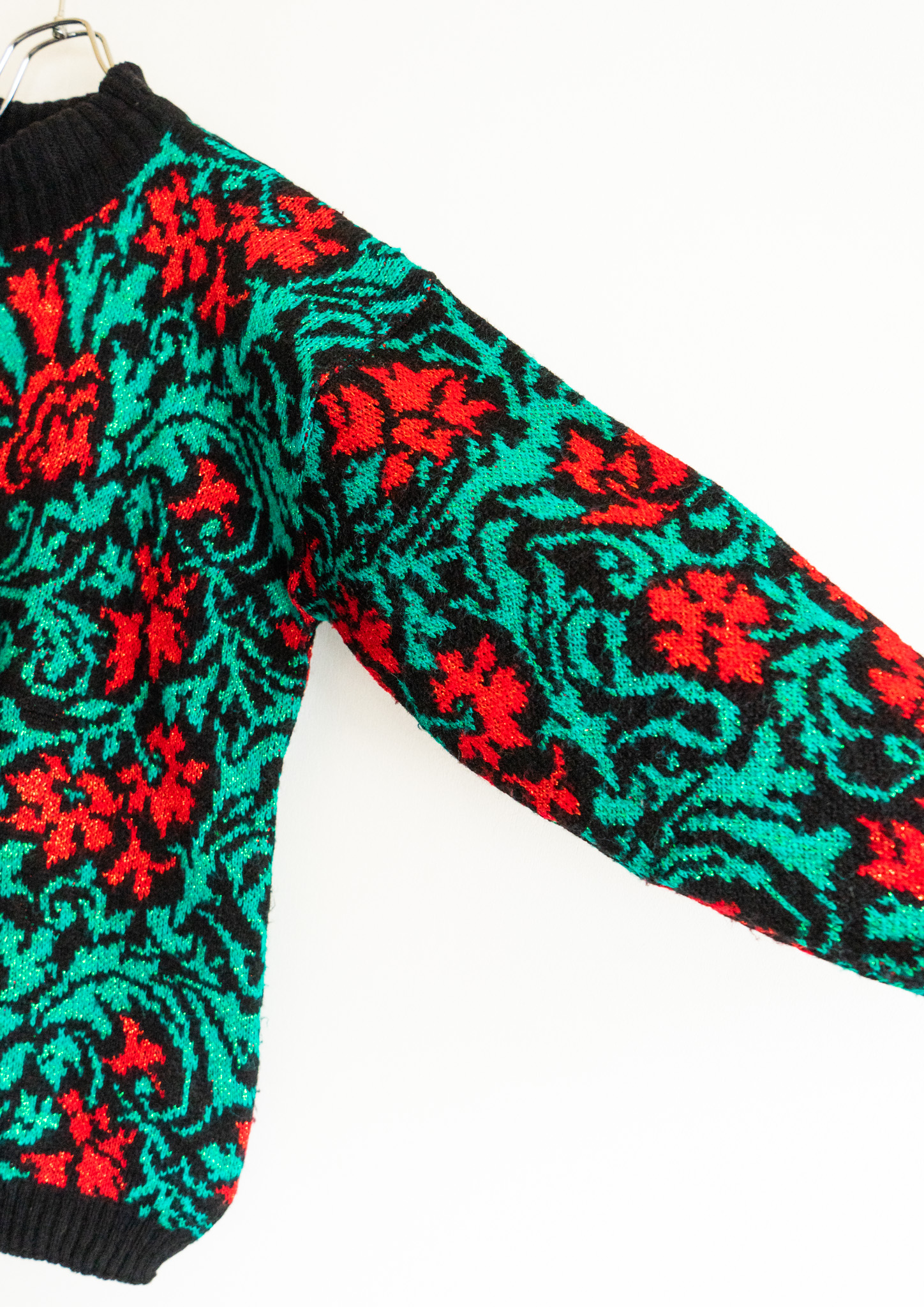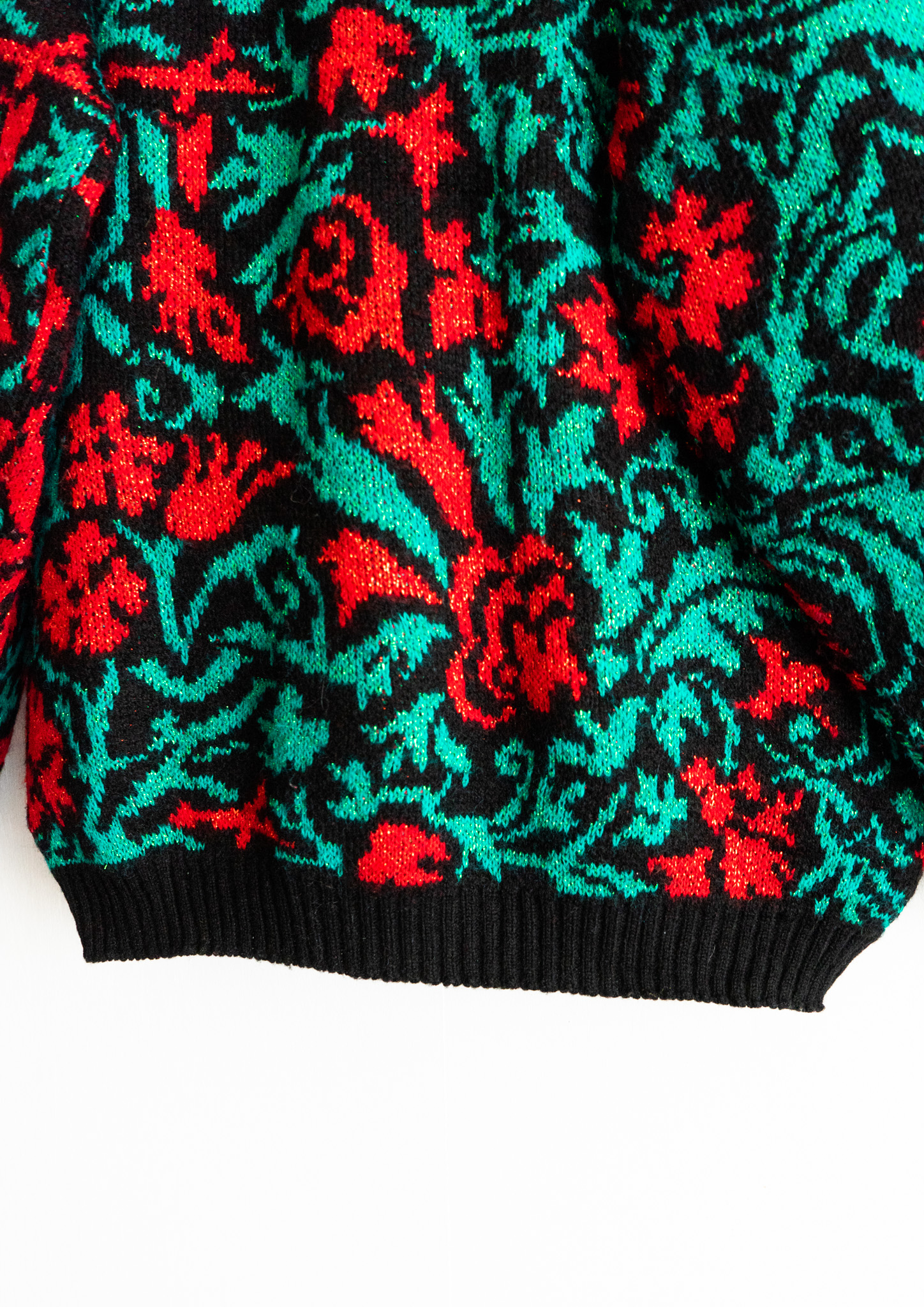 80's Red × Green Botanical Lame Mix Pattern Black Sweater