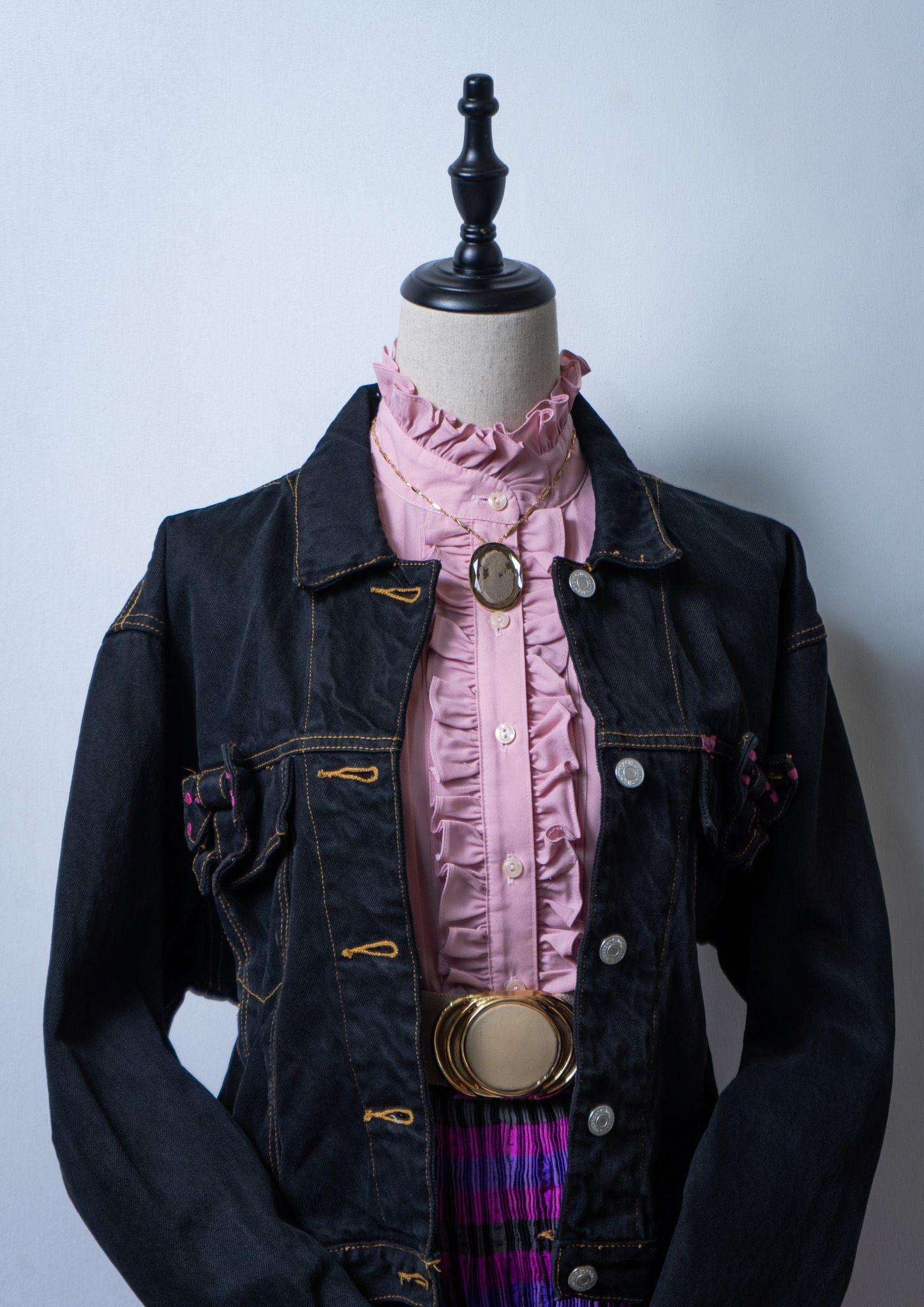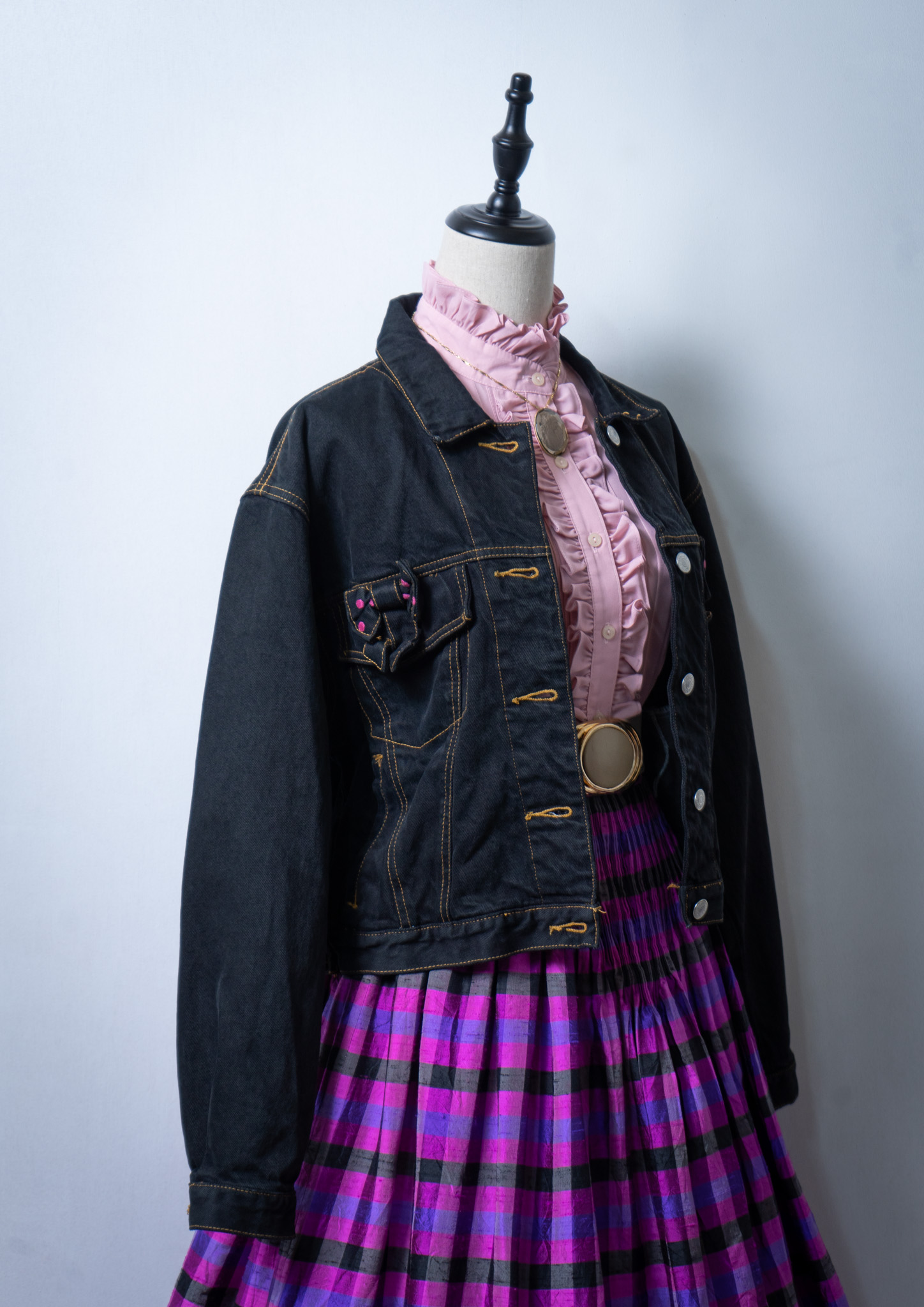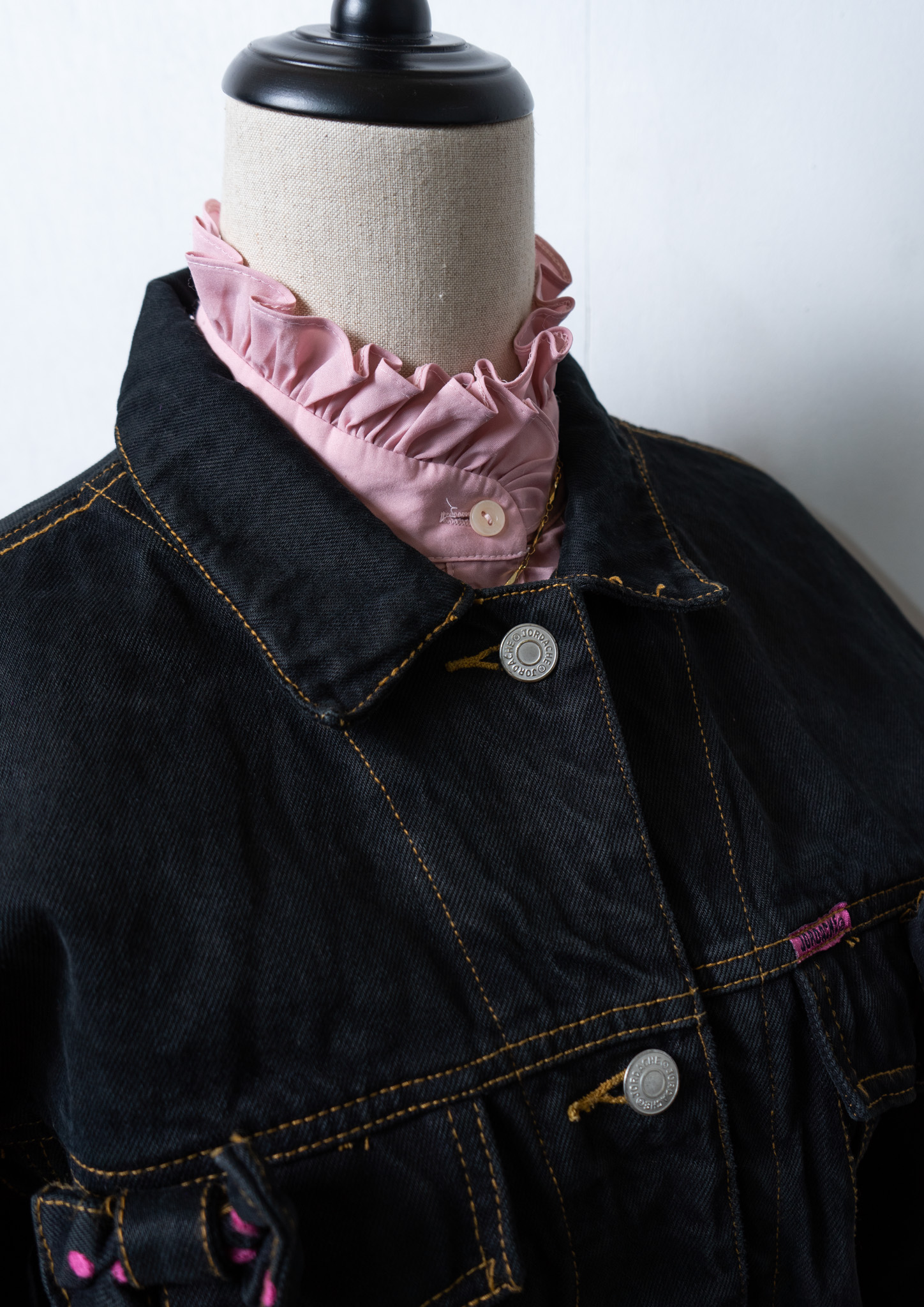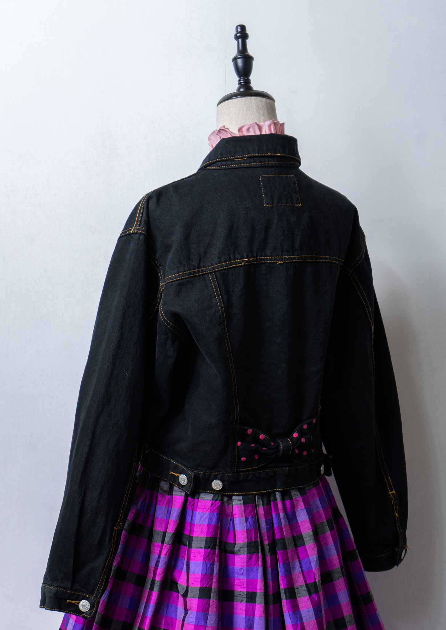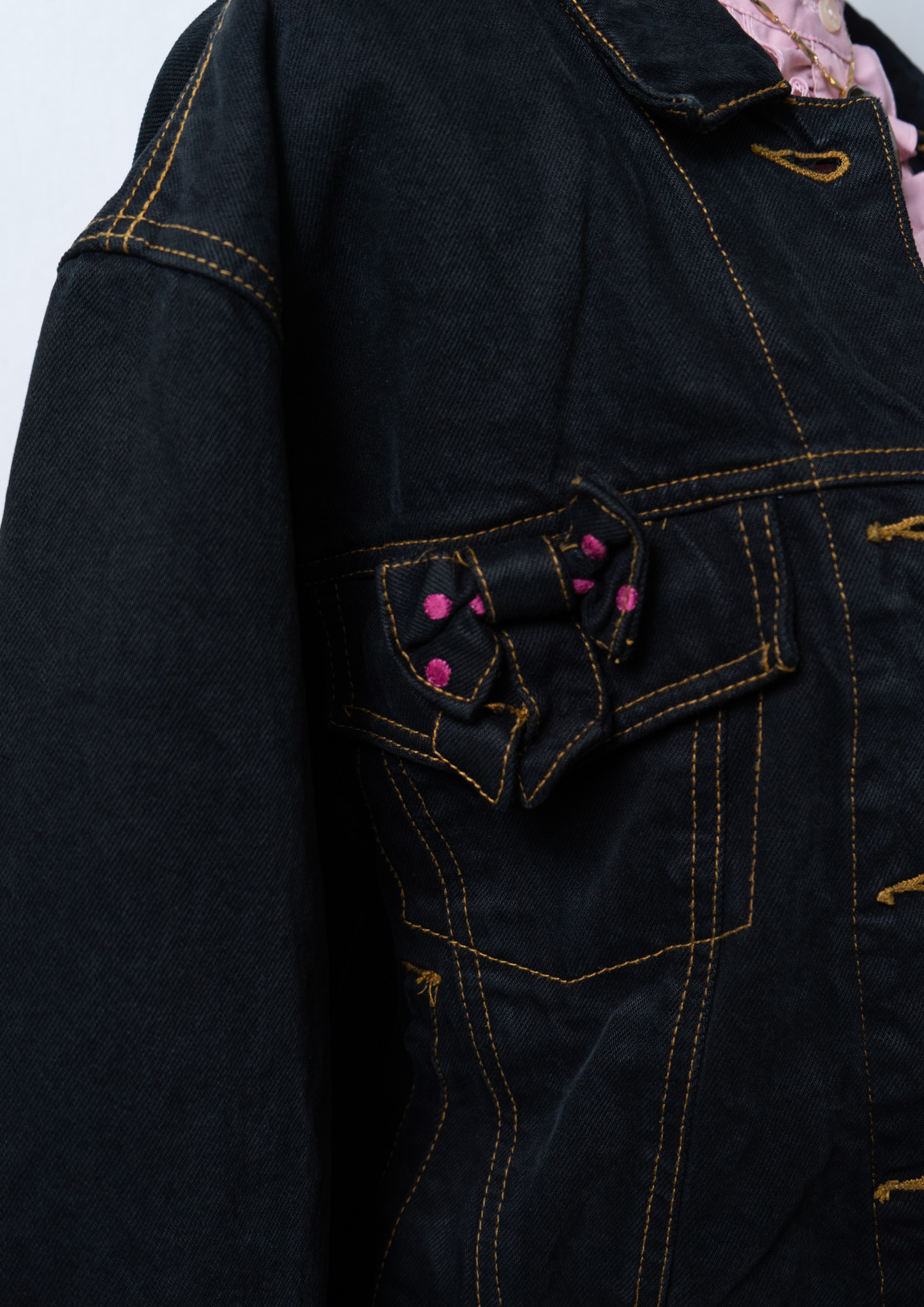 80's Pink Dot Ribbon Design Denim Black Jacket