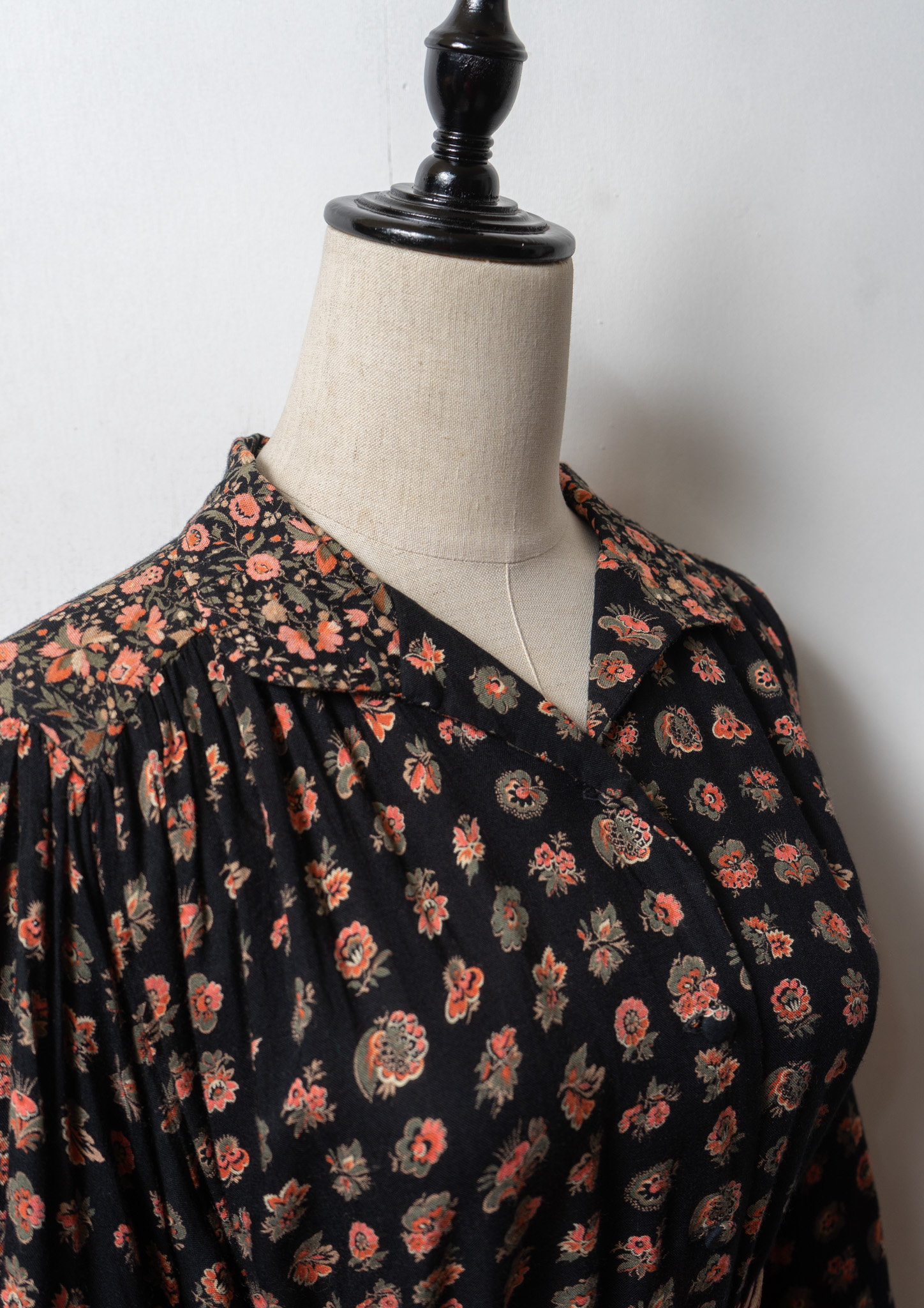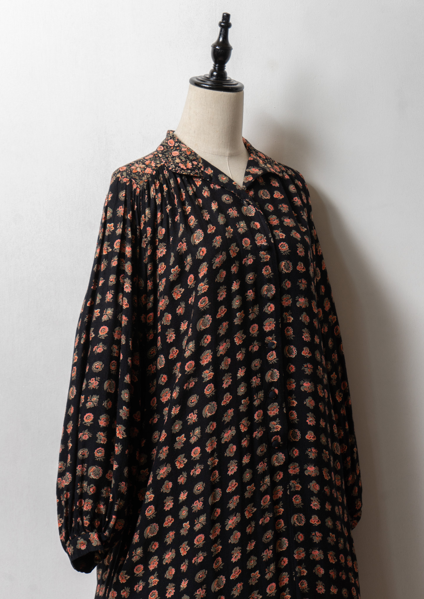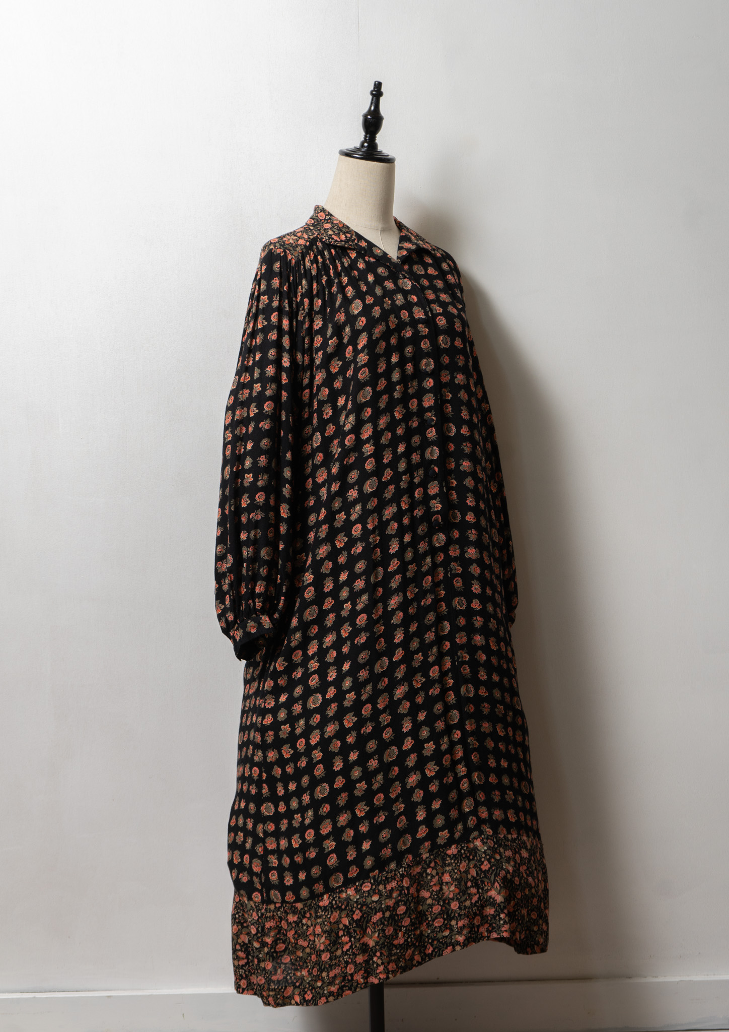 90's Black Velour Collar × Button Gray Over Dye Maxi Dress