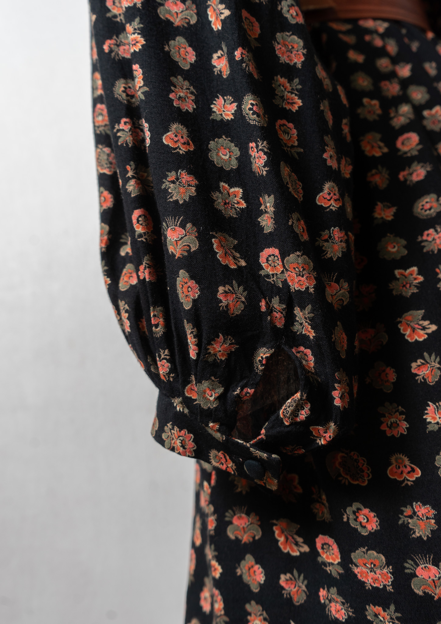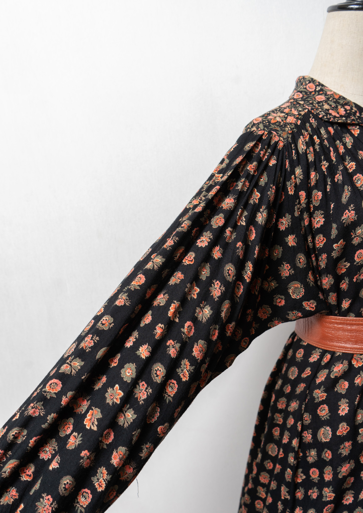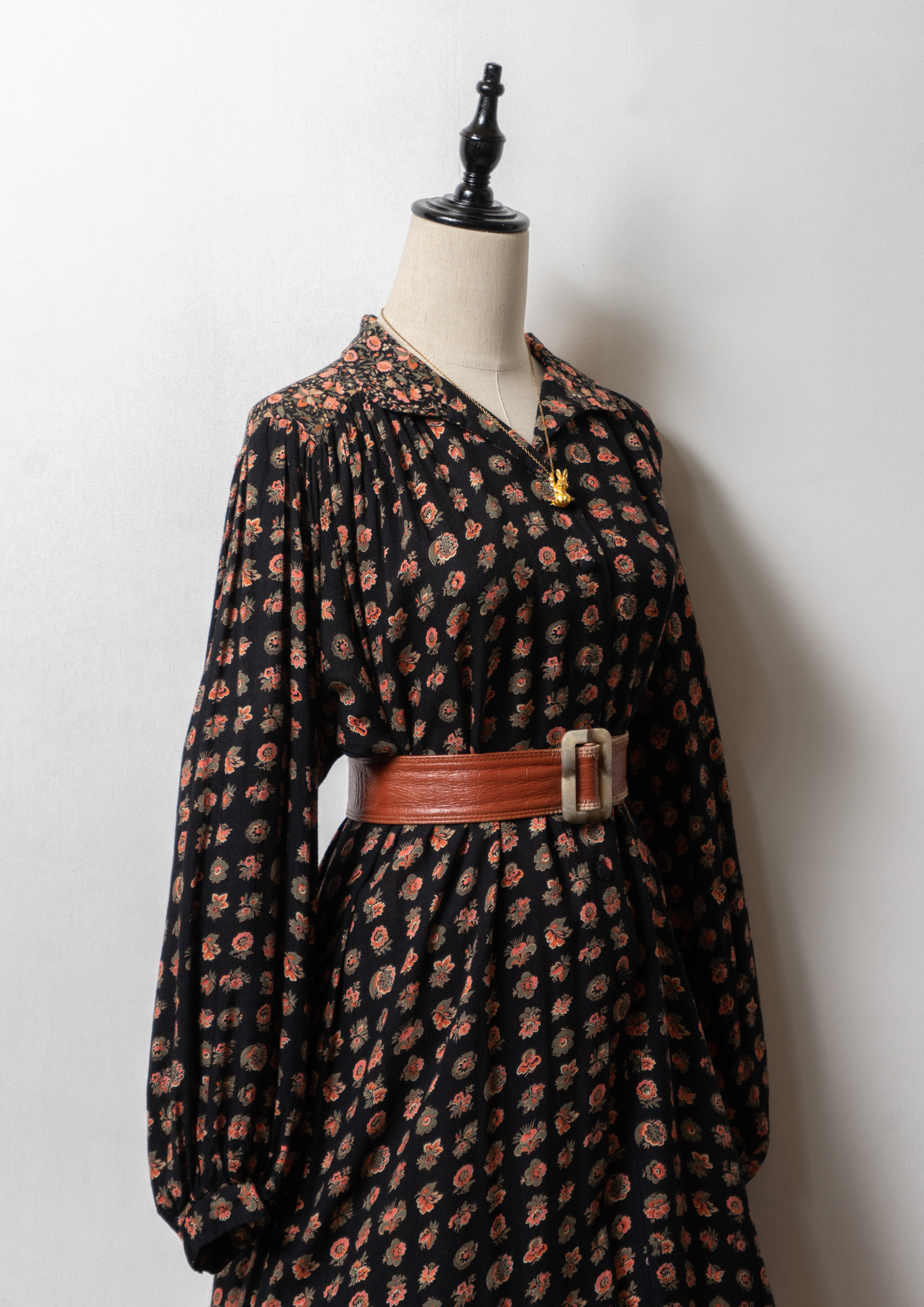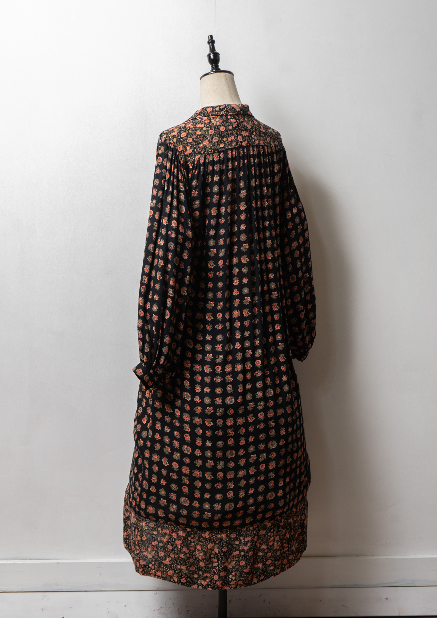 90's Black Velour Collar × Button Gray Over Dye Maxi Dress