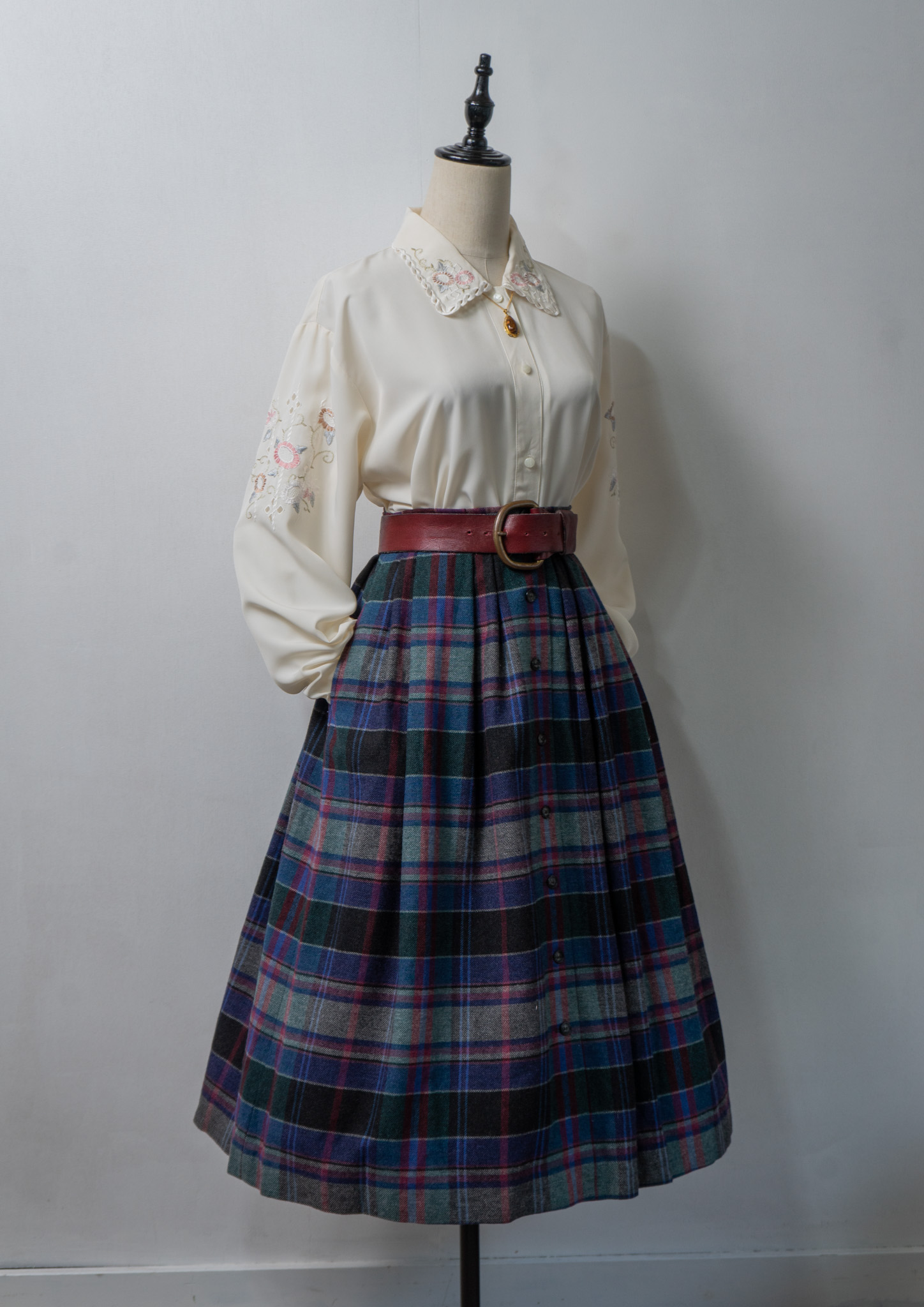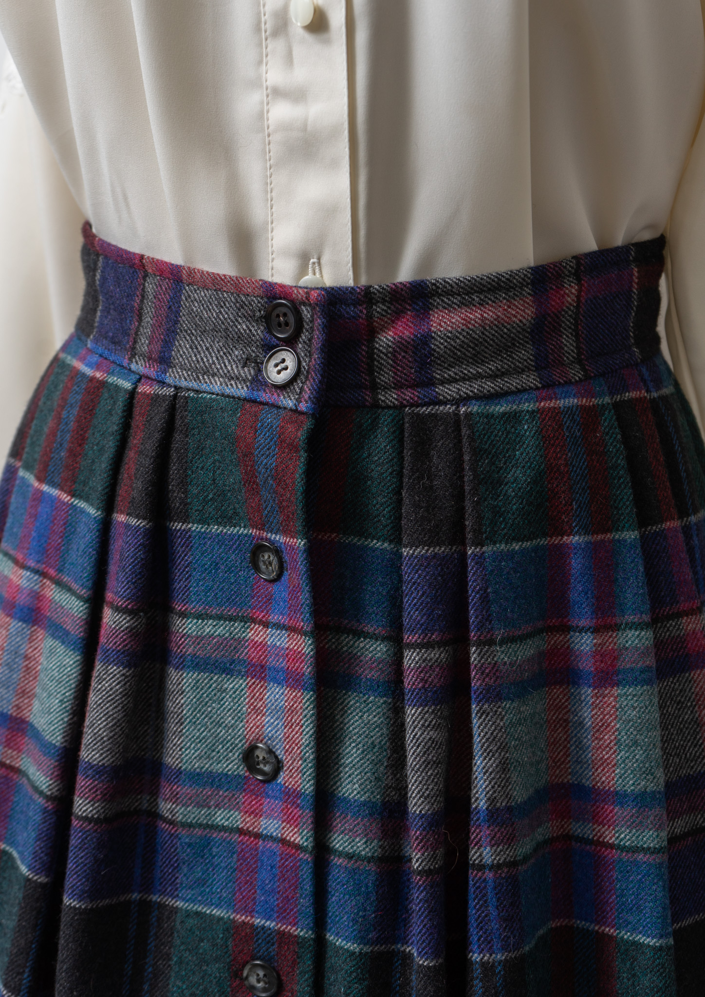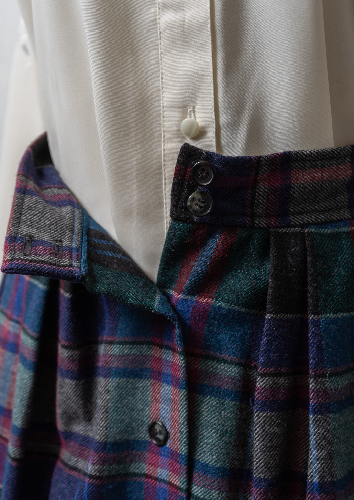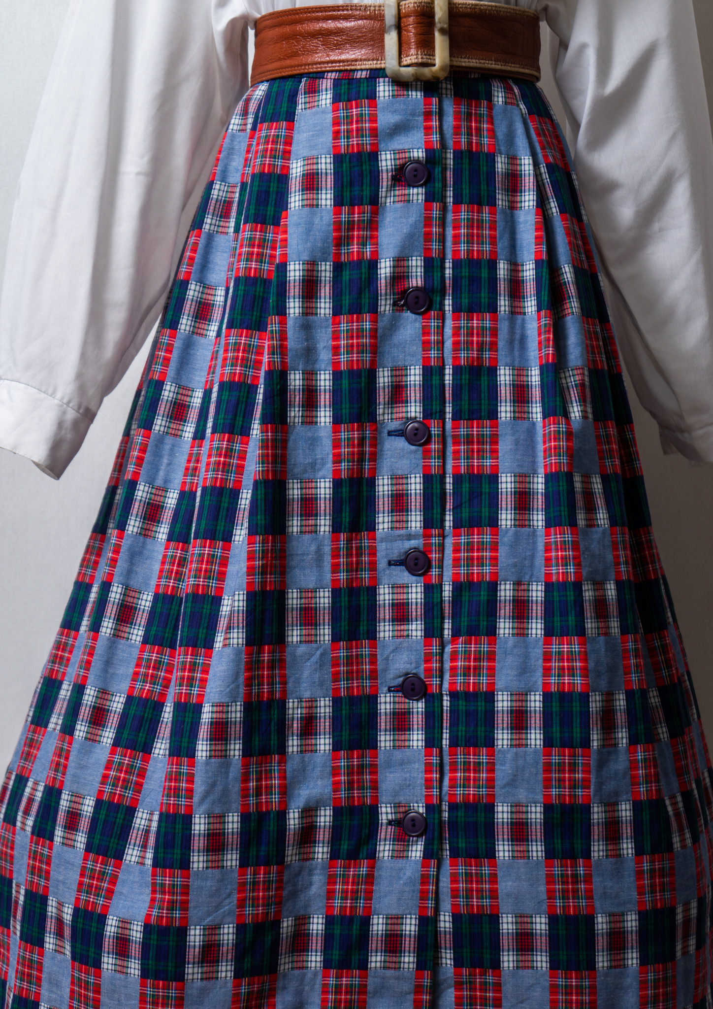 90's Front Button Design Check × Square Patchwork Like Pattern Skirt