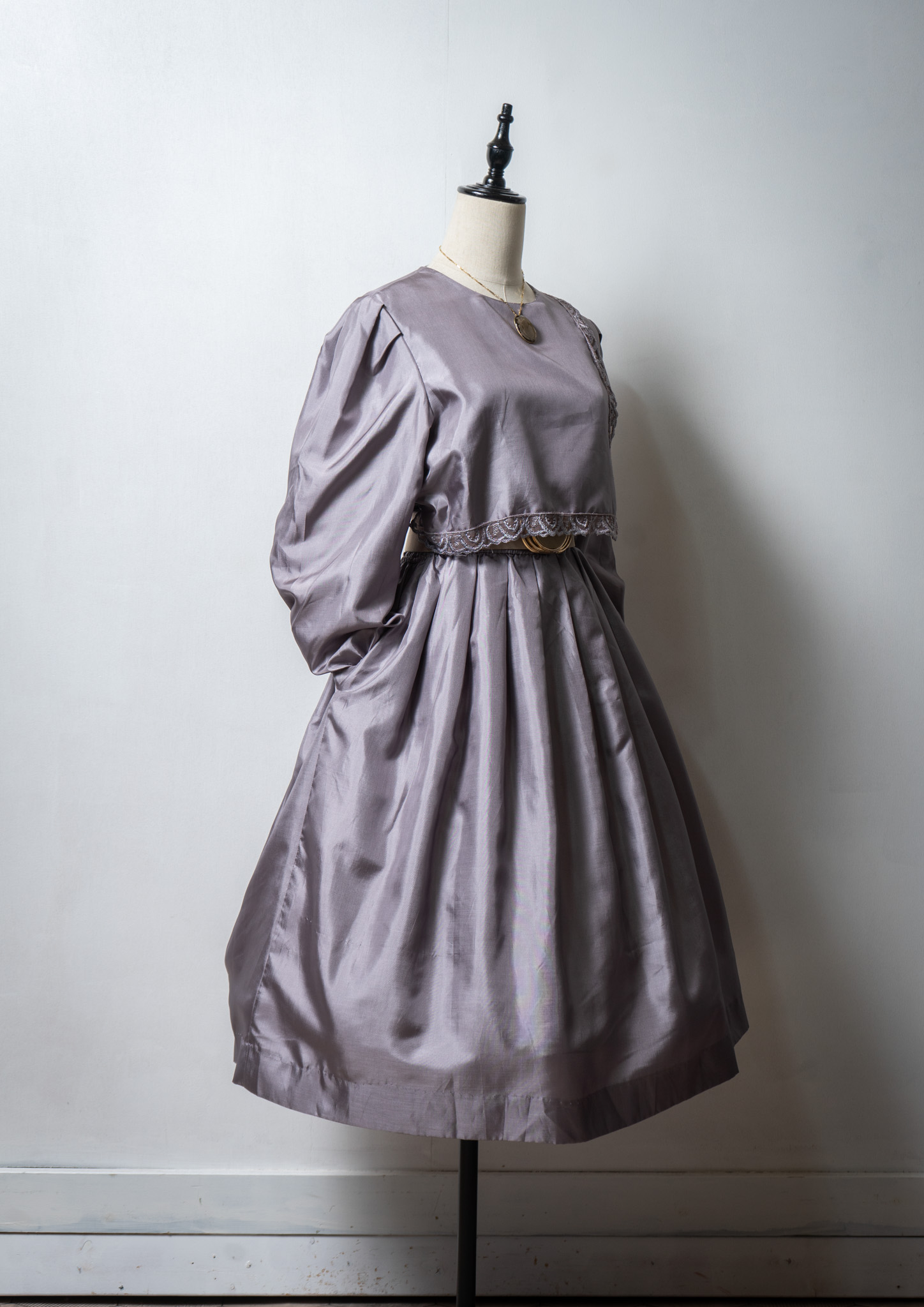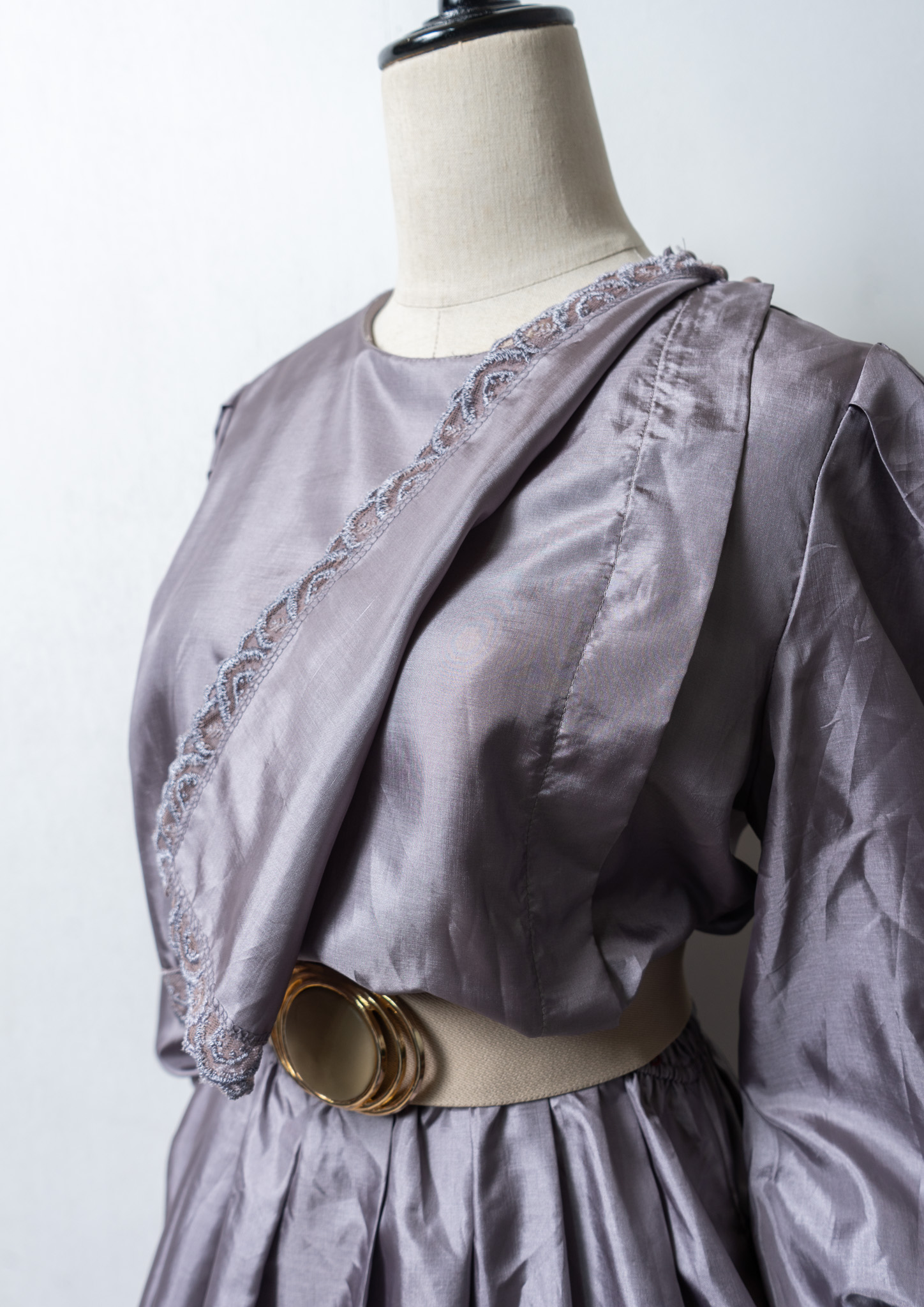 80's W.Germany C&A Multi Stripe Pattern Pleats Design Gray Dress