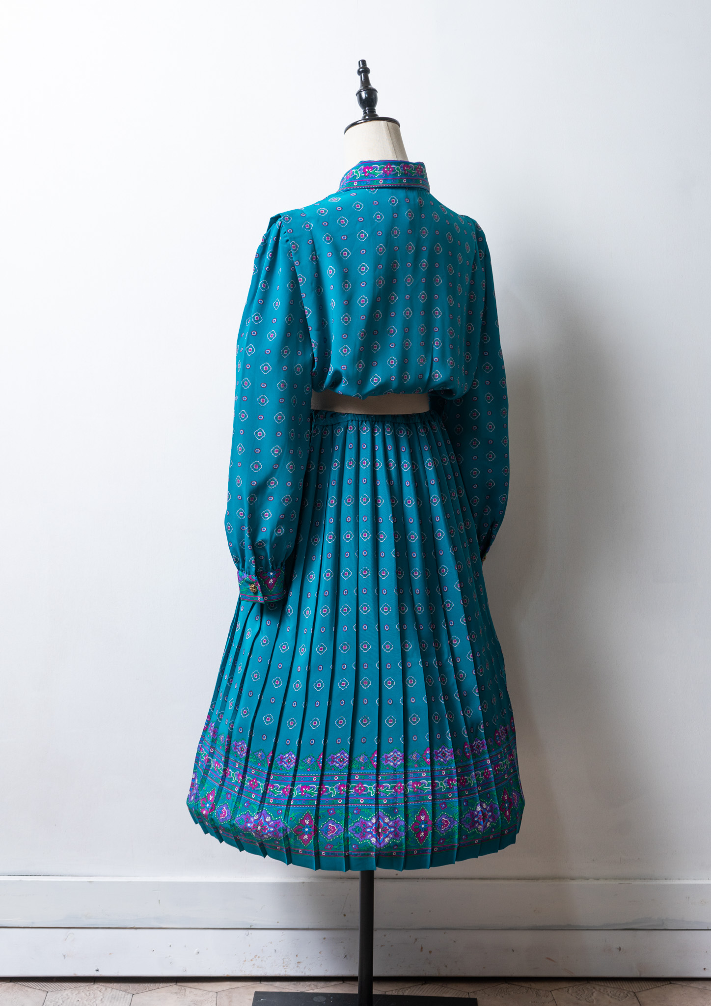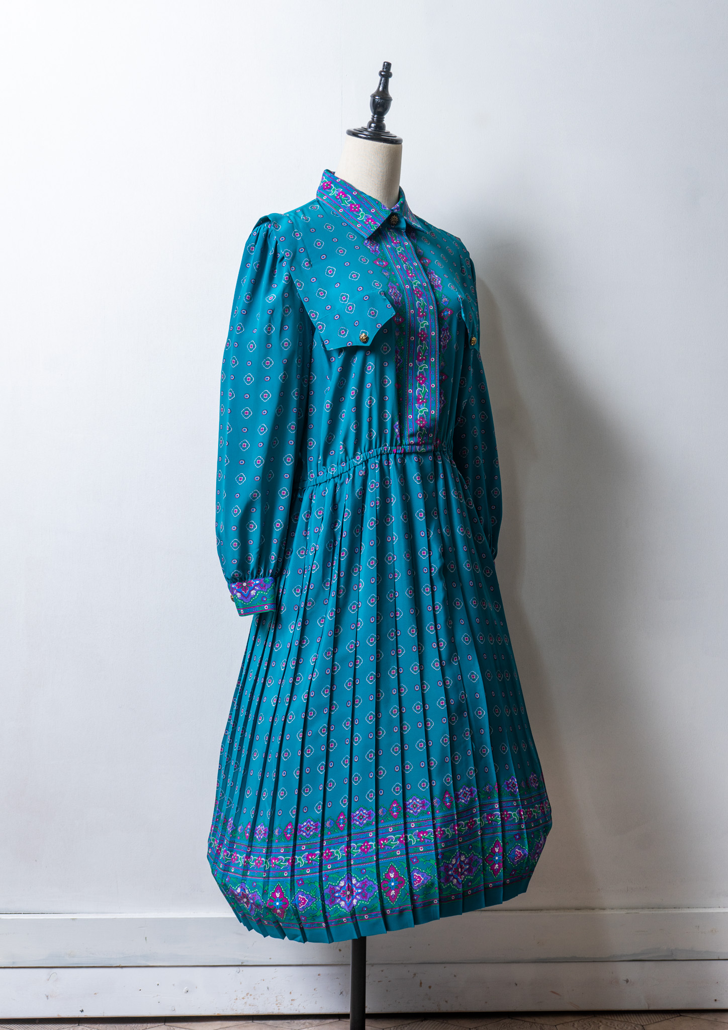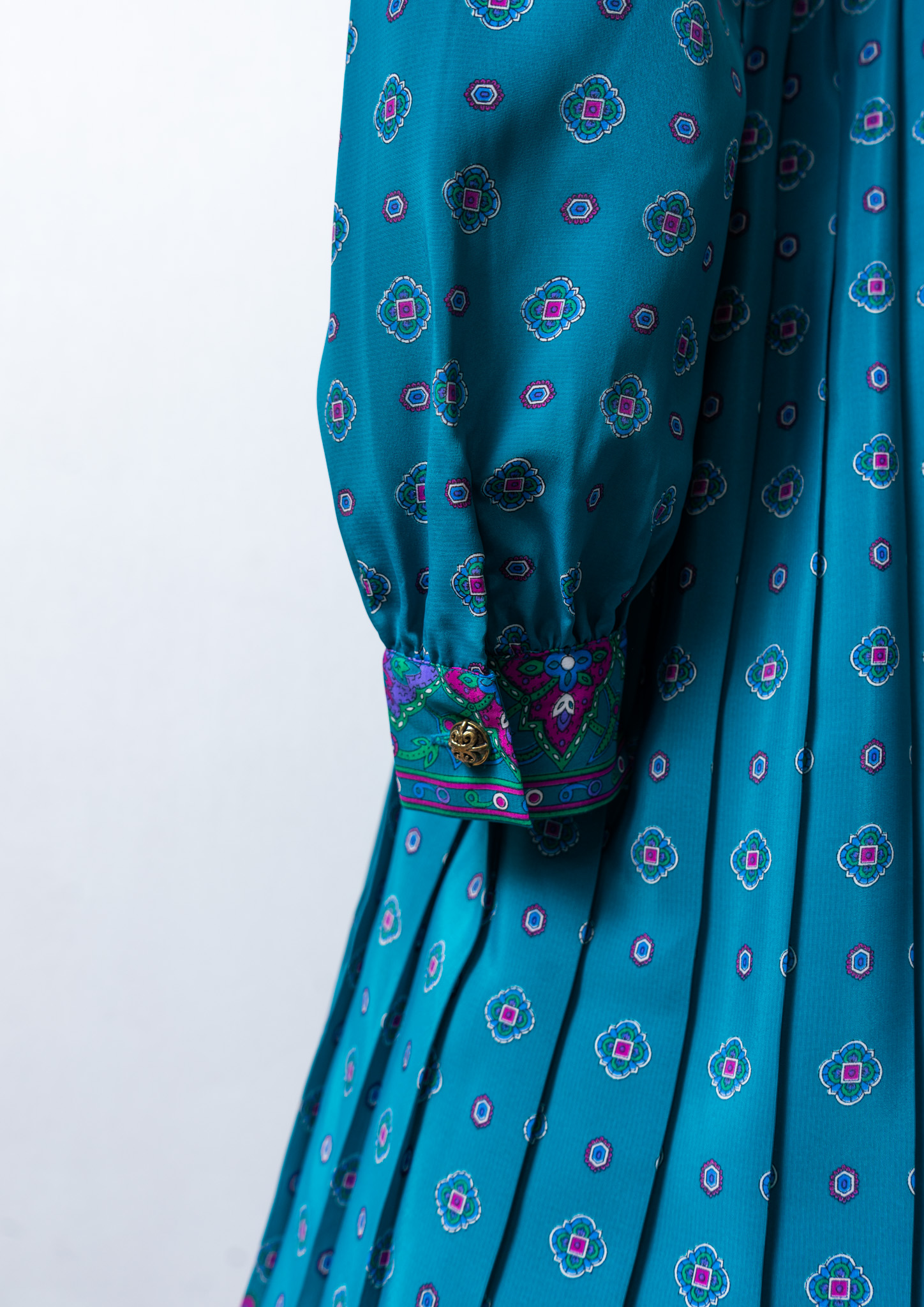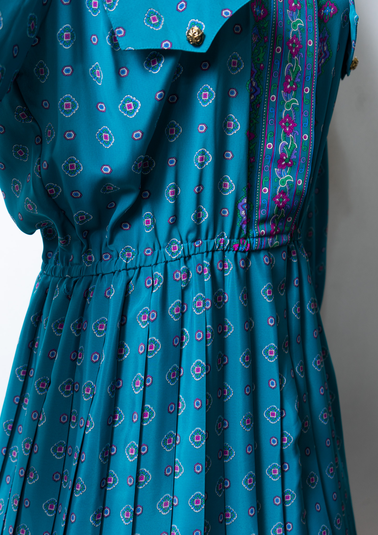 80~90's Flower × geometric Pattern Pleats Design Turquoise Blue Dress