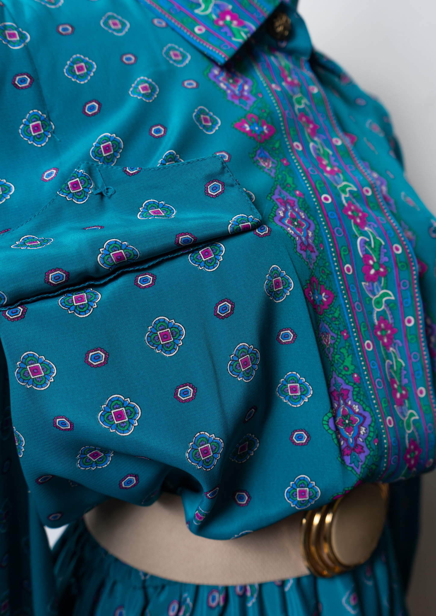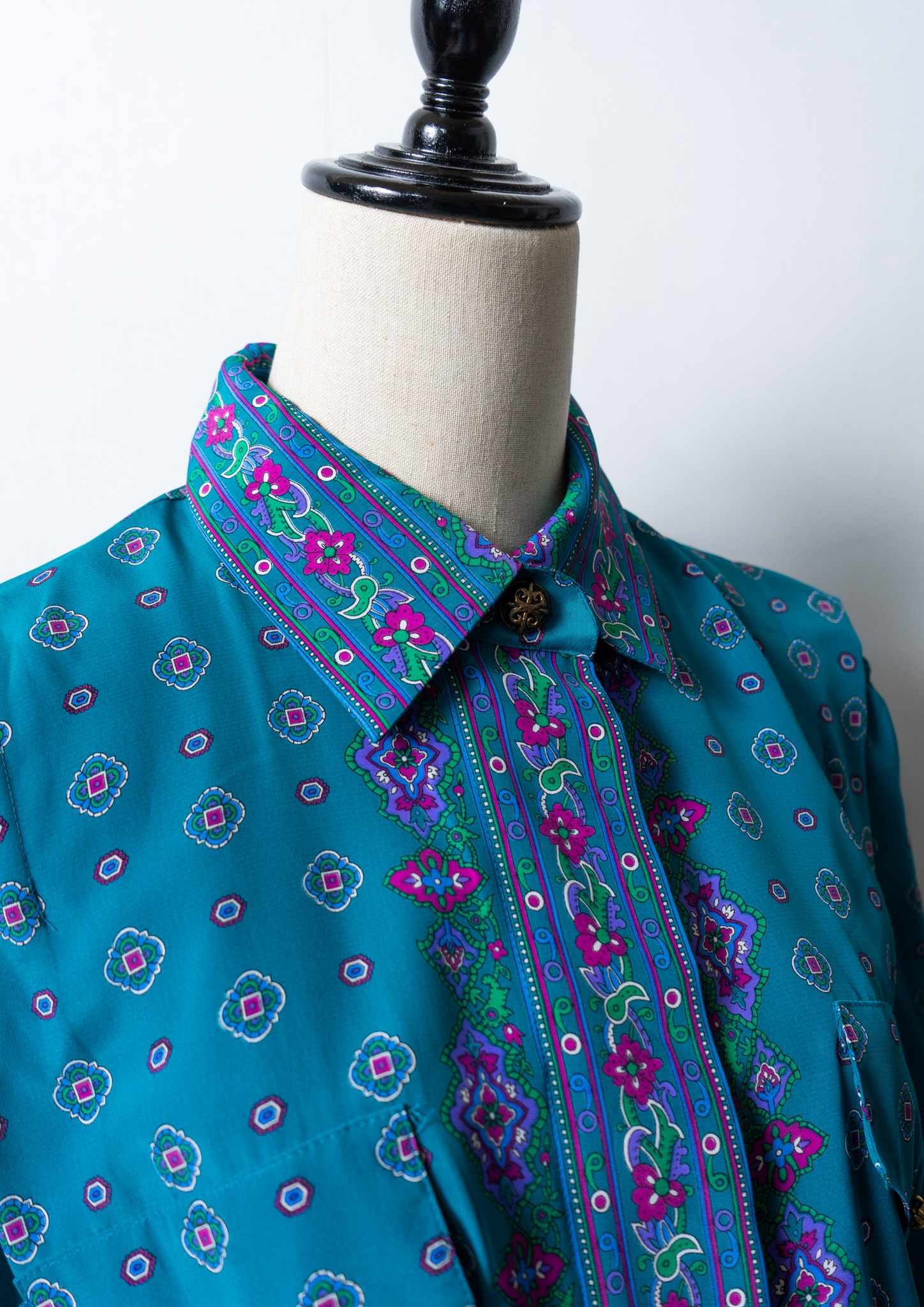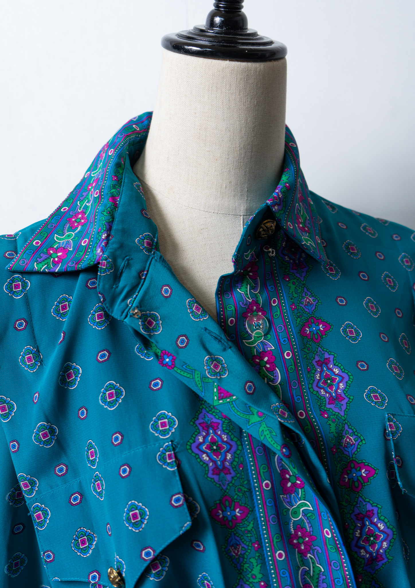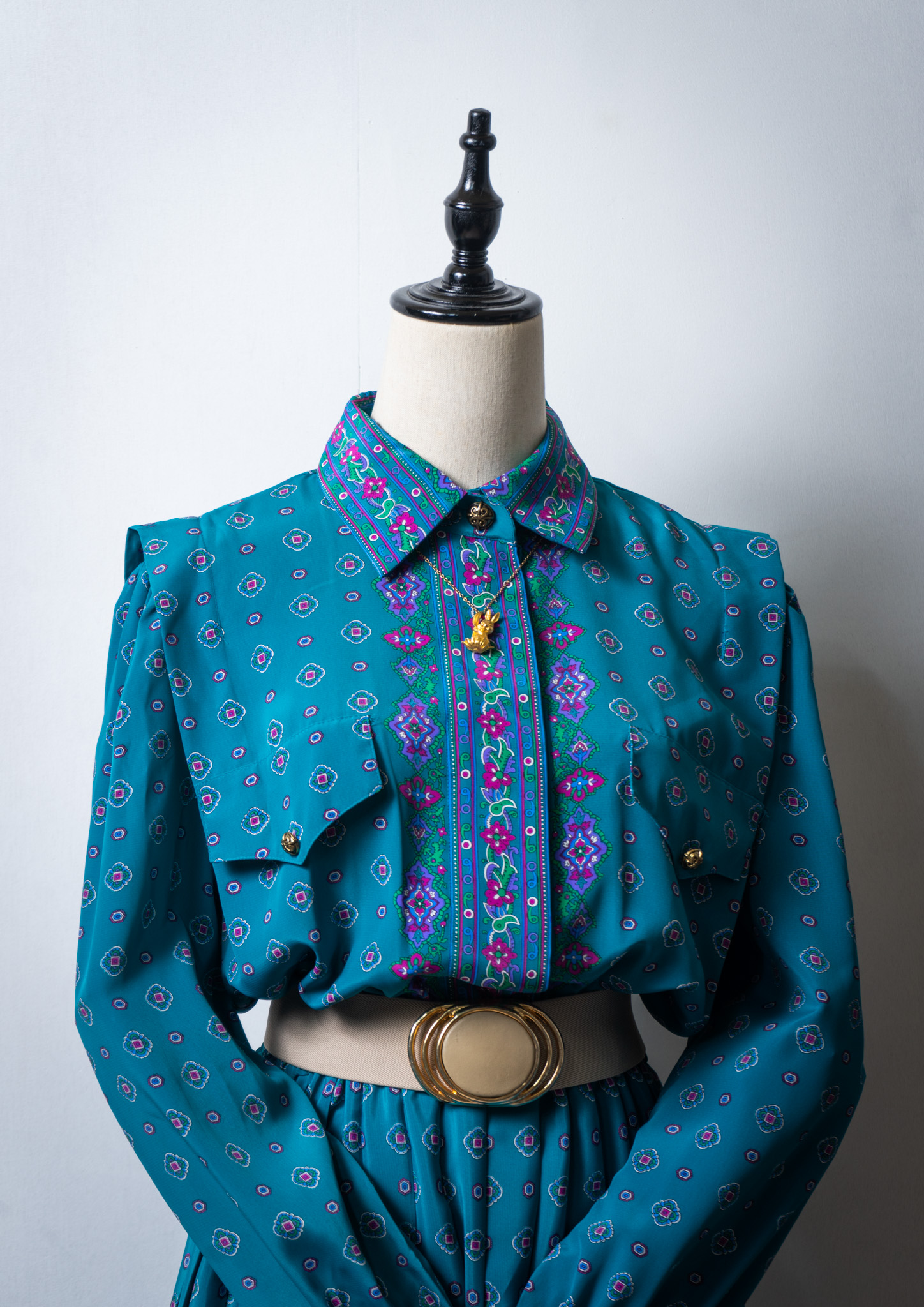 80~90's Flower × geometric Pattern Pleats Design Turquoise Blue Dress