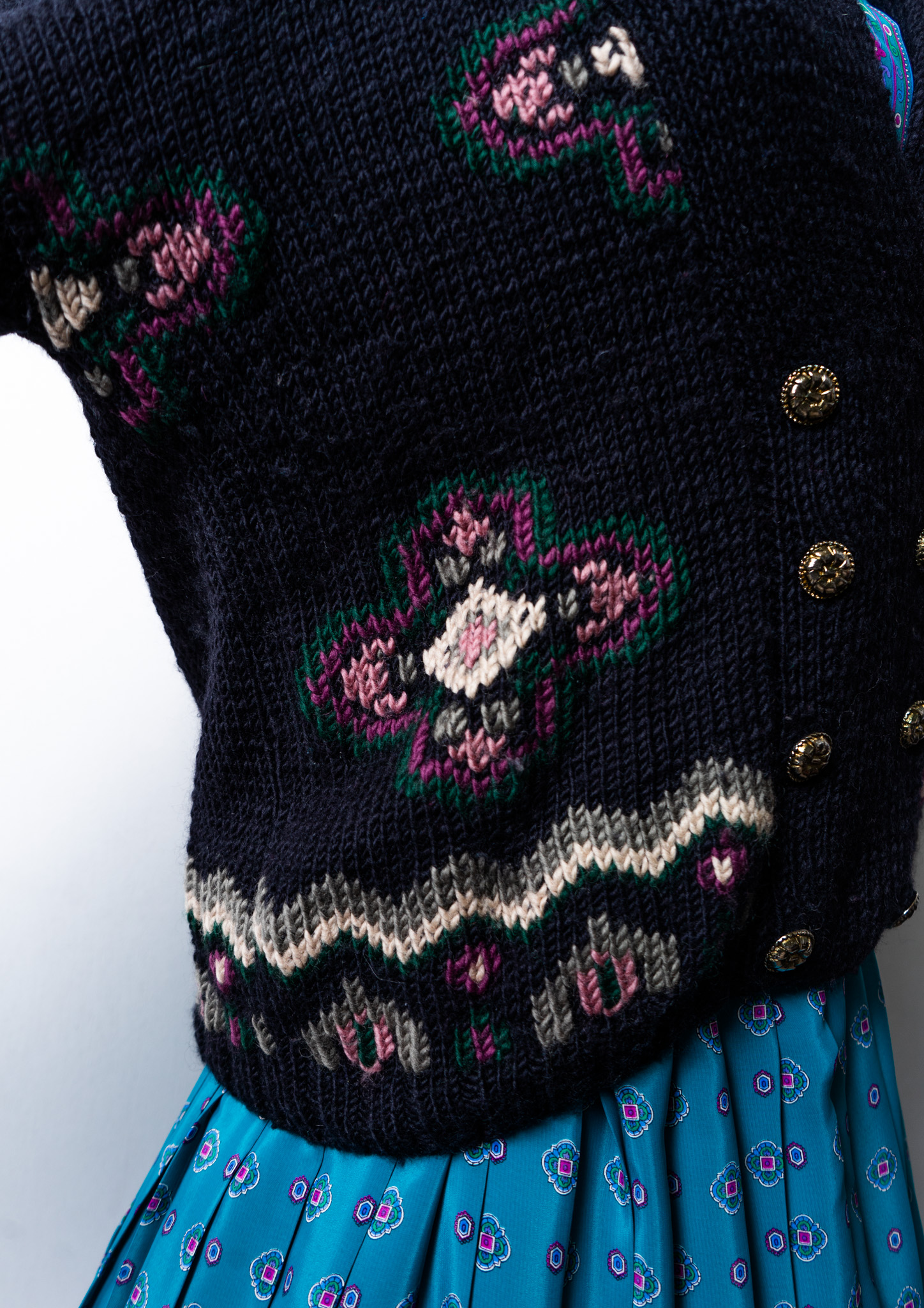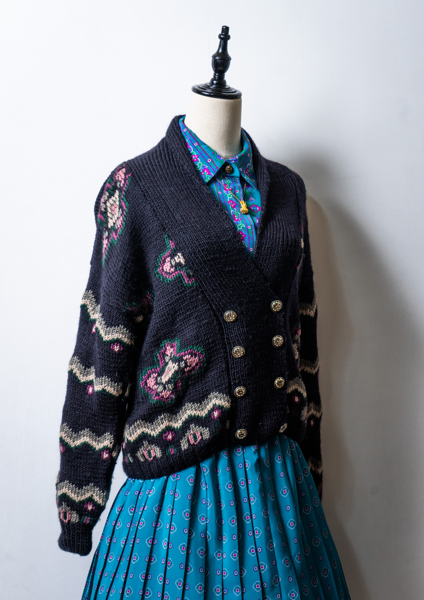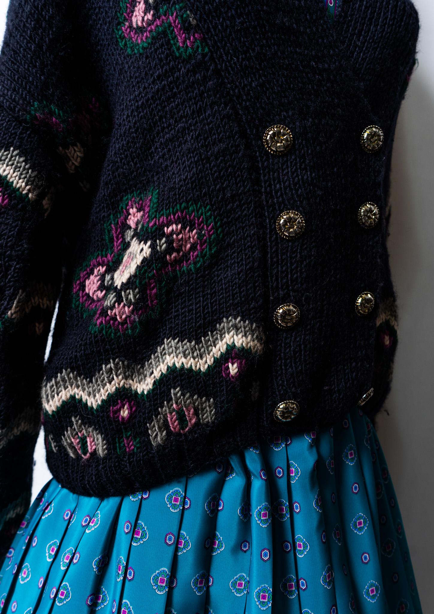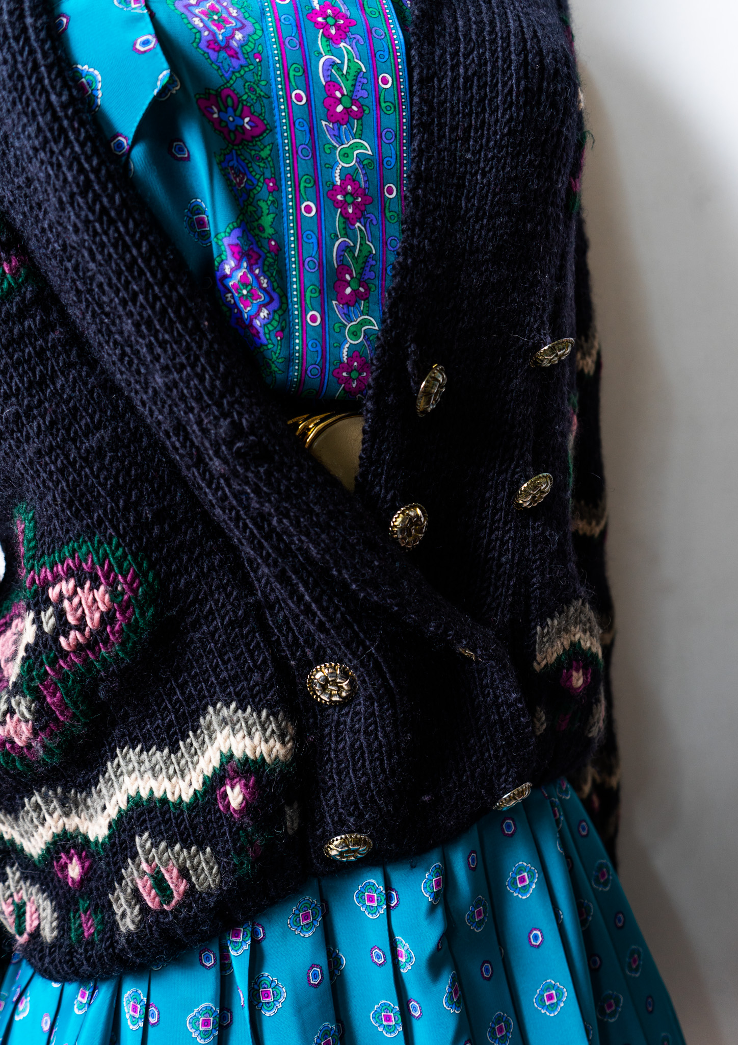 80's Austria Heat Tyrol Button Design Green × Black Knit Tyrol Cardigan