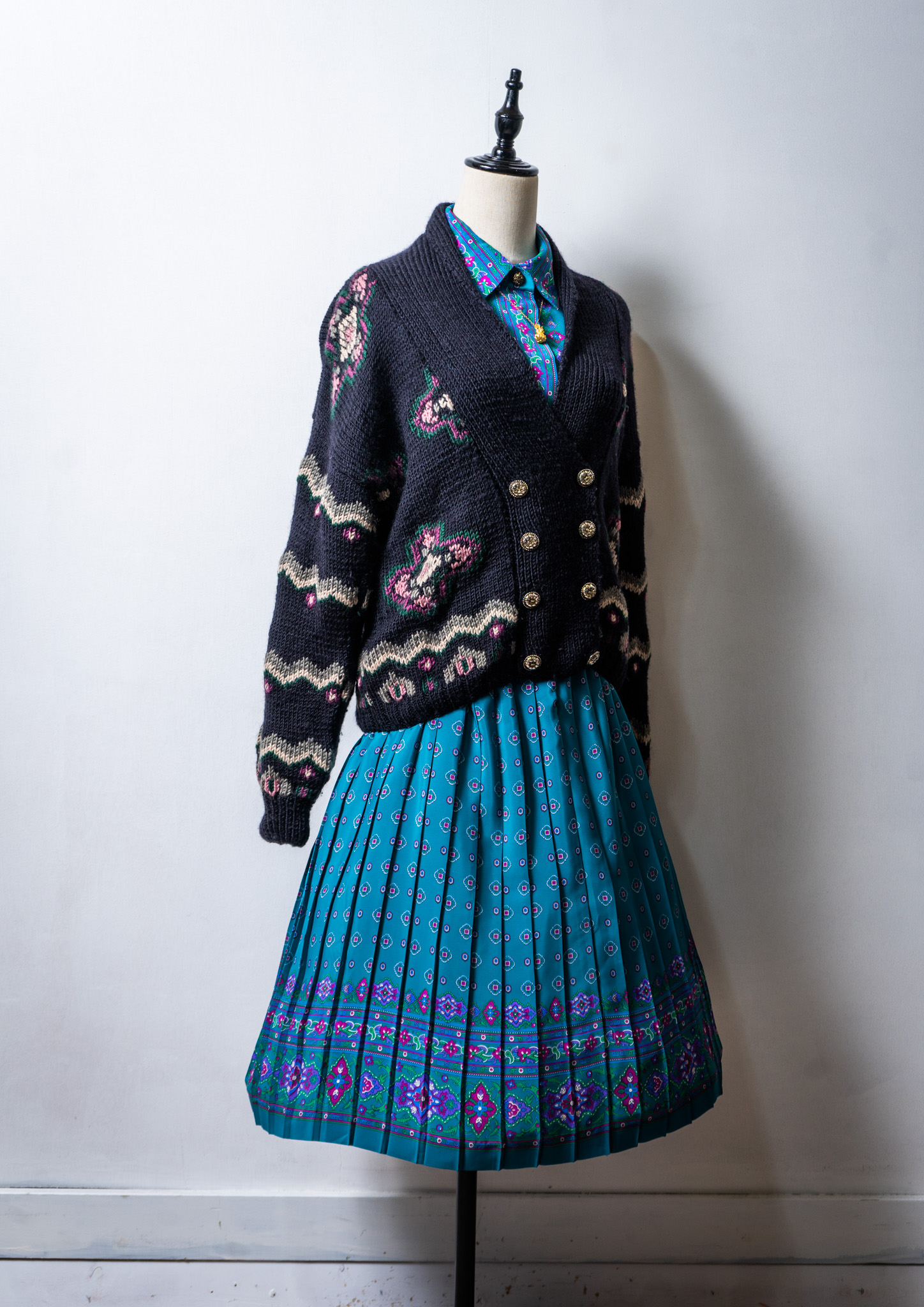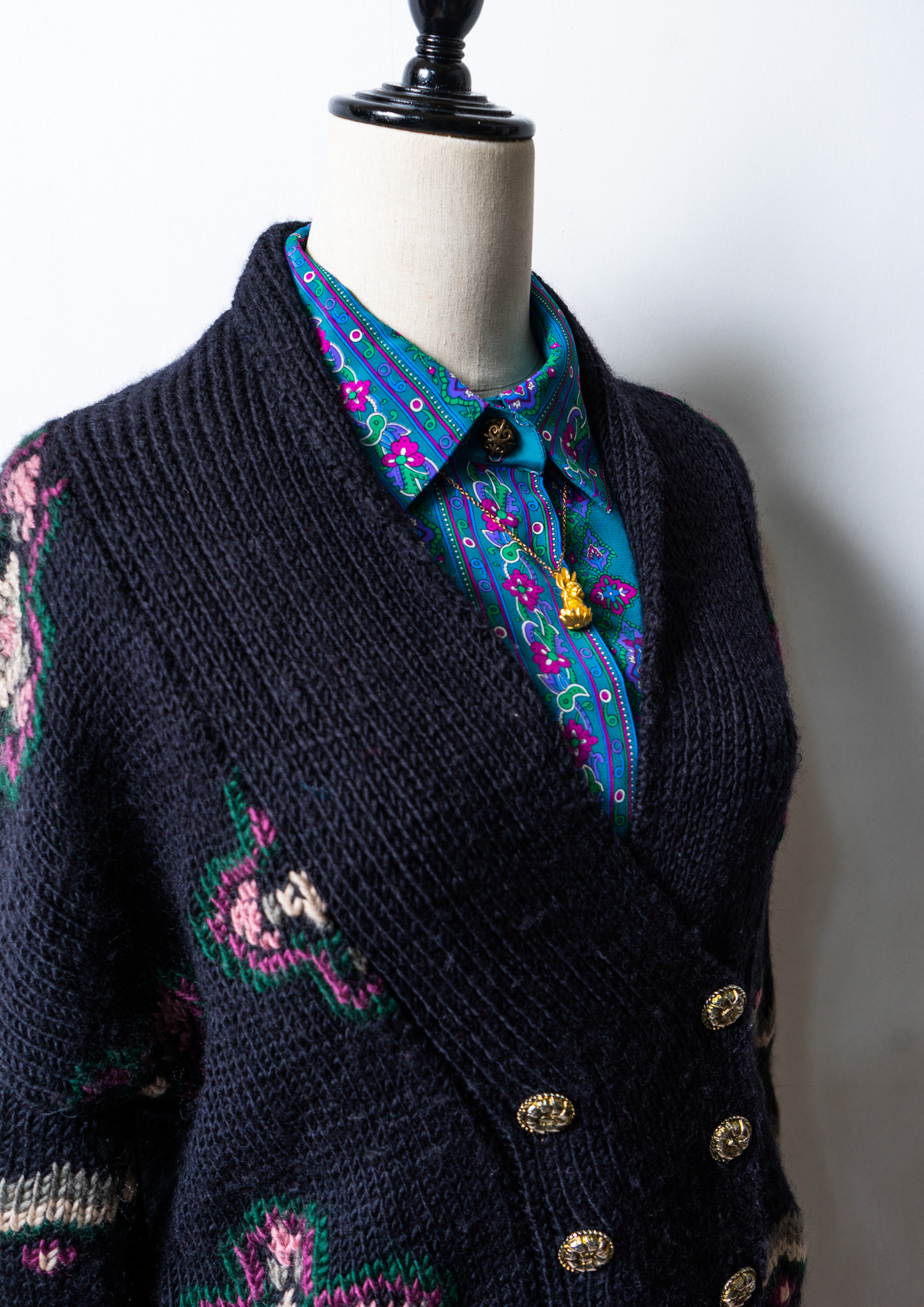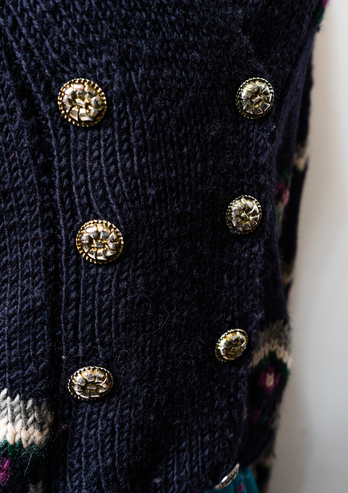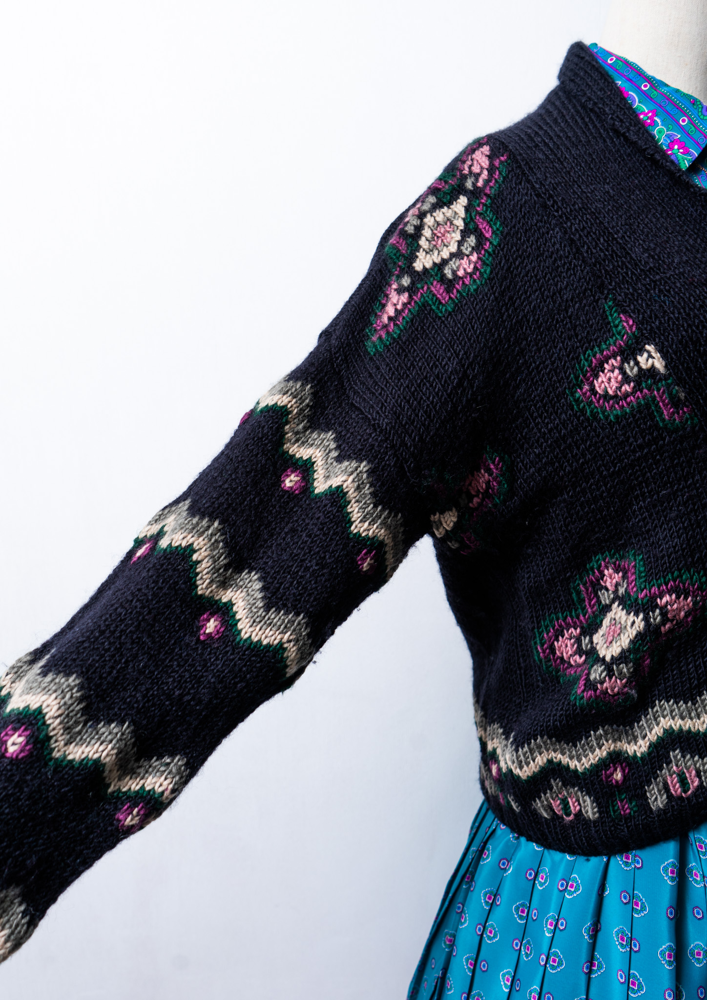 80's Austria Heat Tyrol Button Design Green × Black Knit Tyrol Cardigan