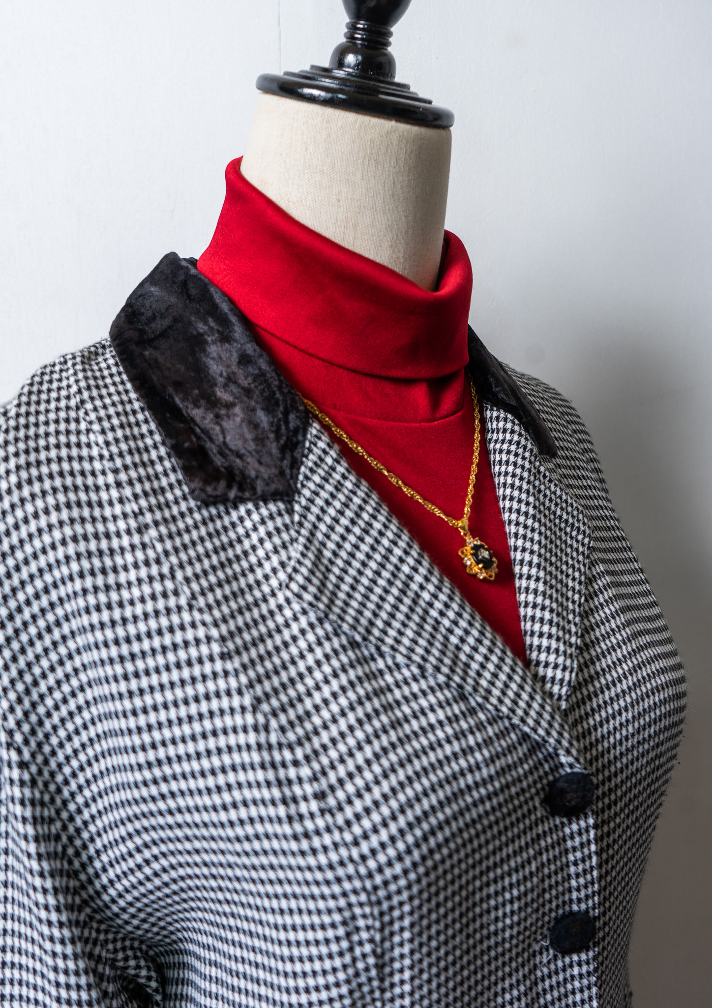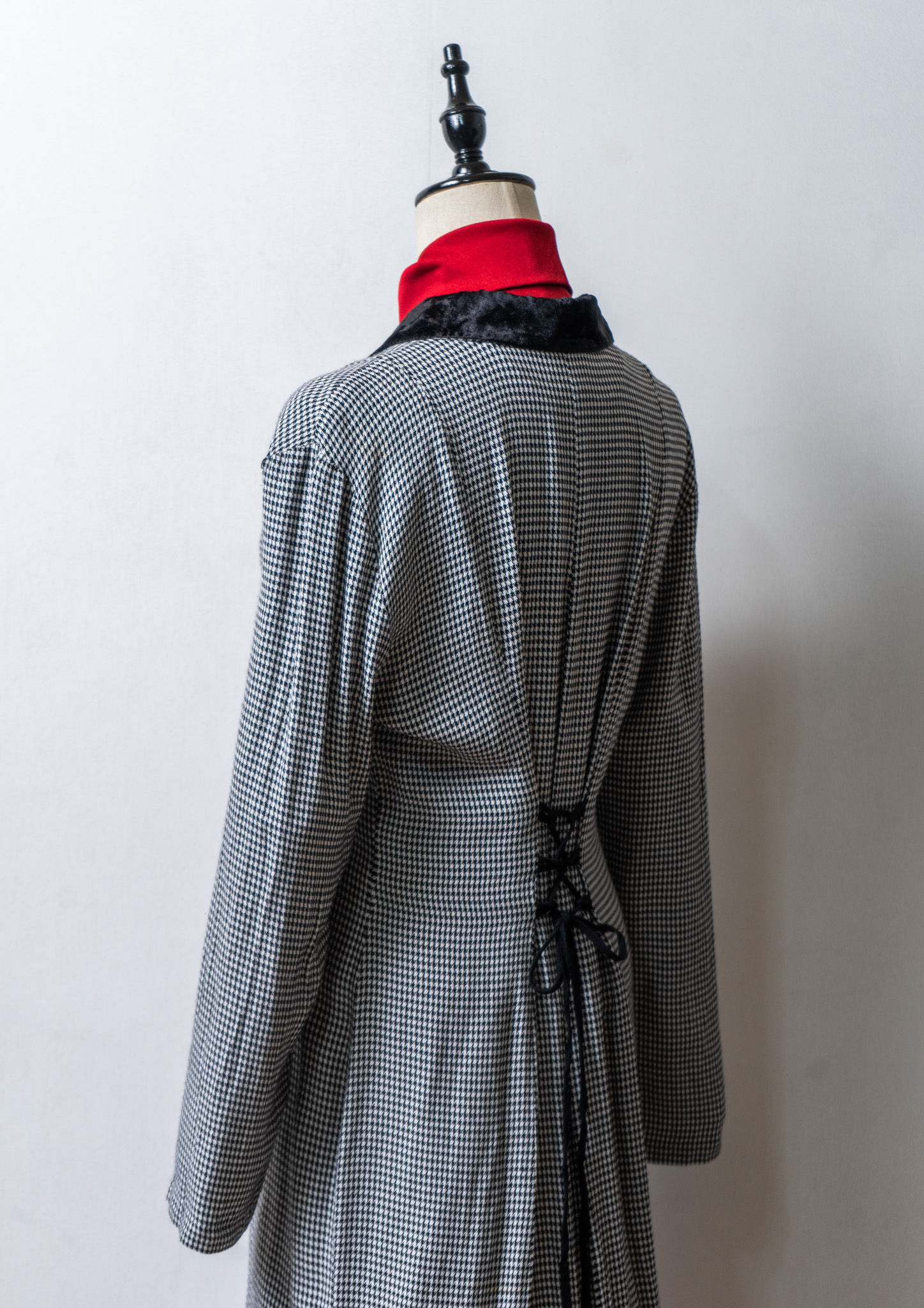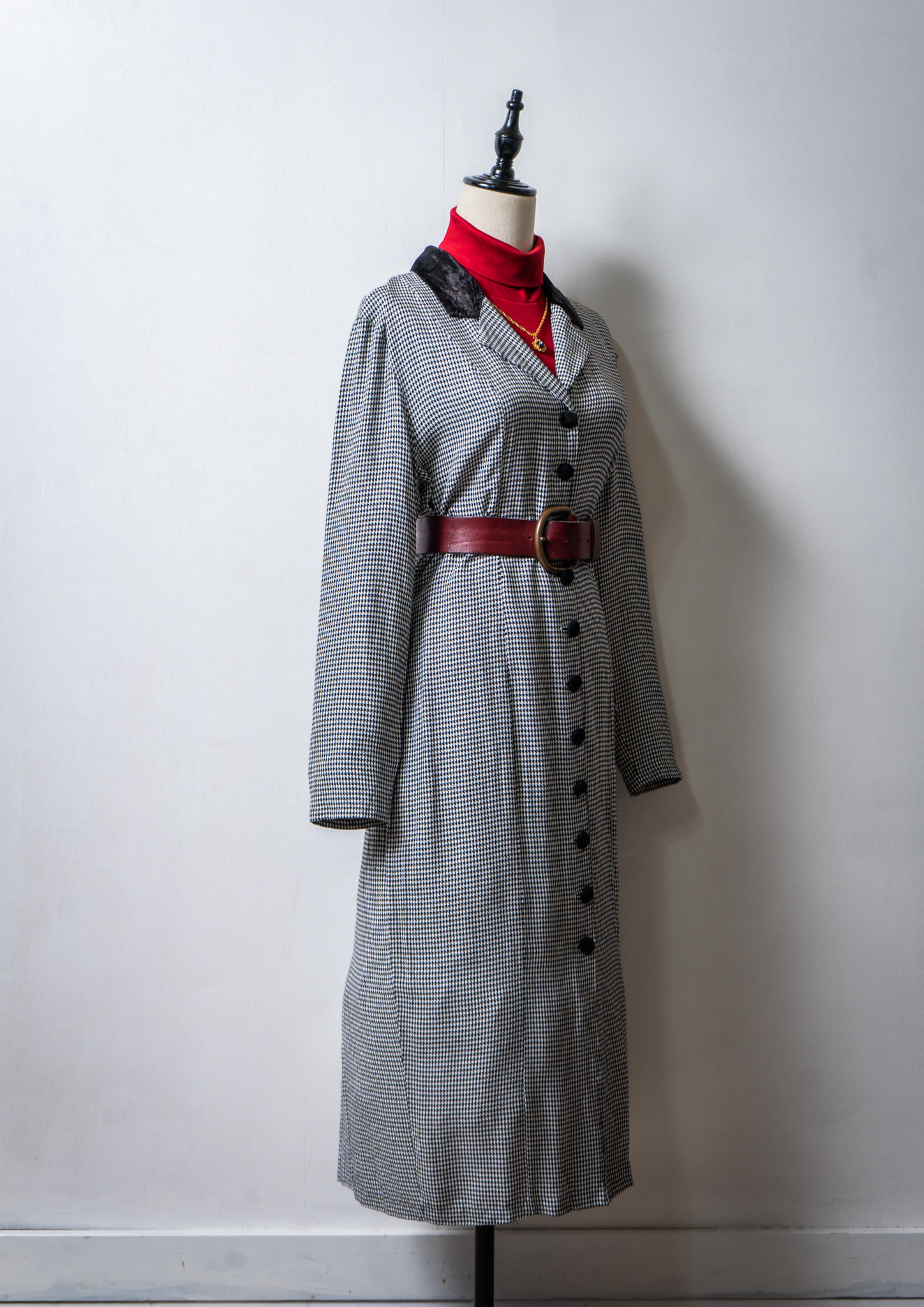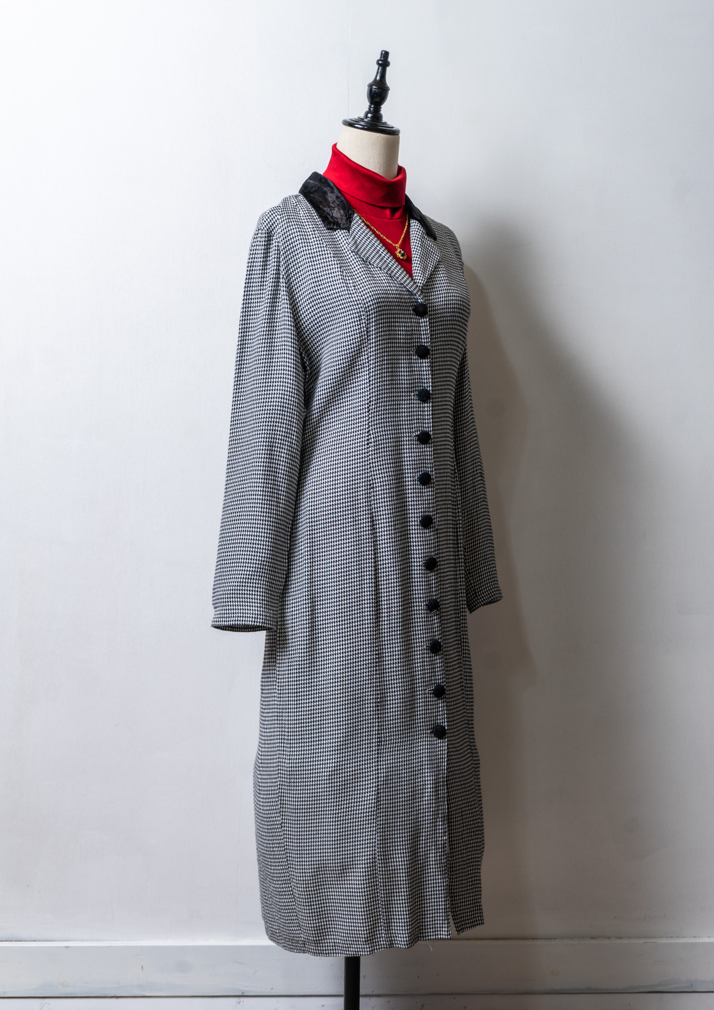 80's USA Houndstooth Pattern Velour Collar × Button Dress