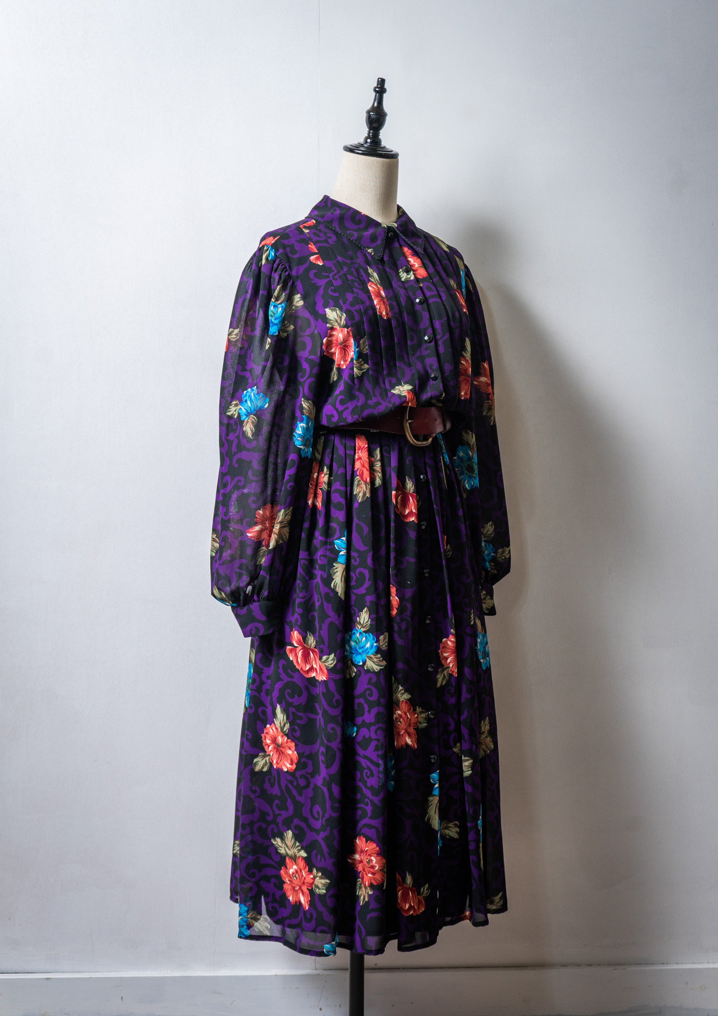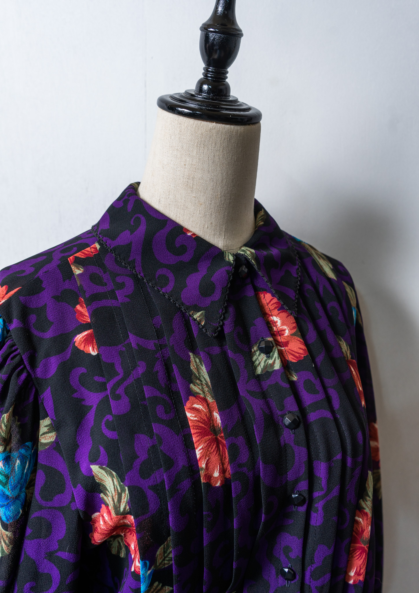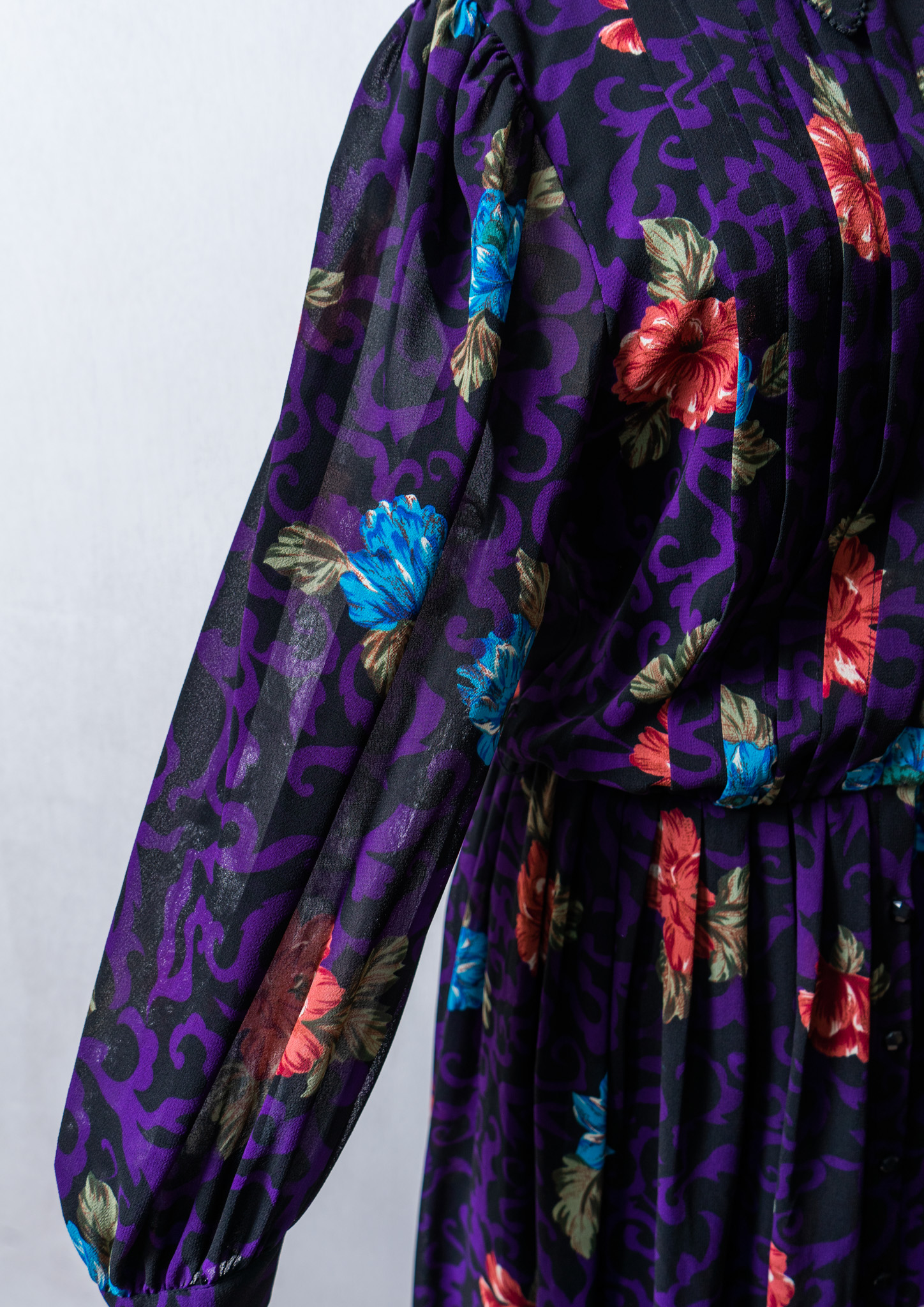 90's Donna Morgan Botanical Pattern Tuck Design Purple Dress