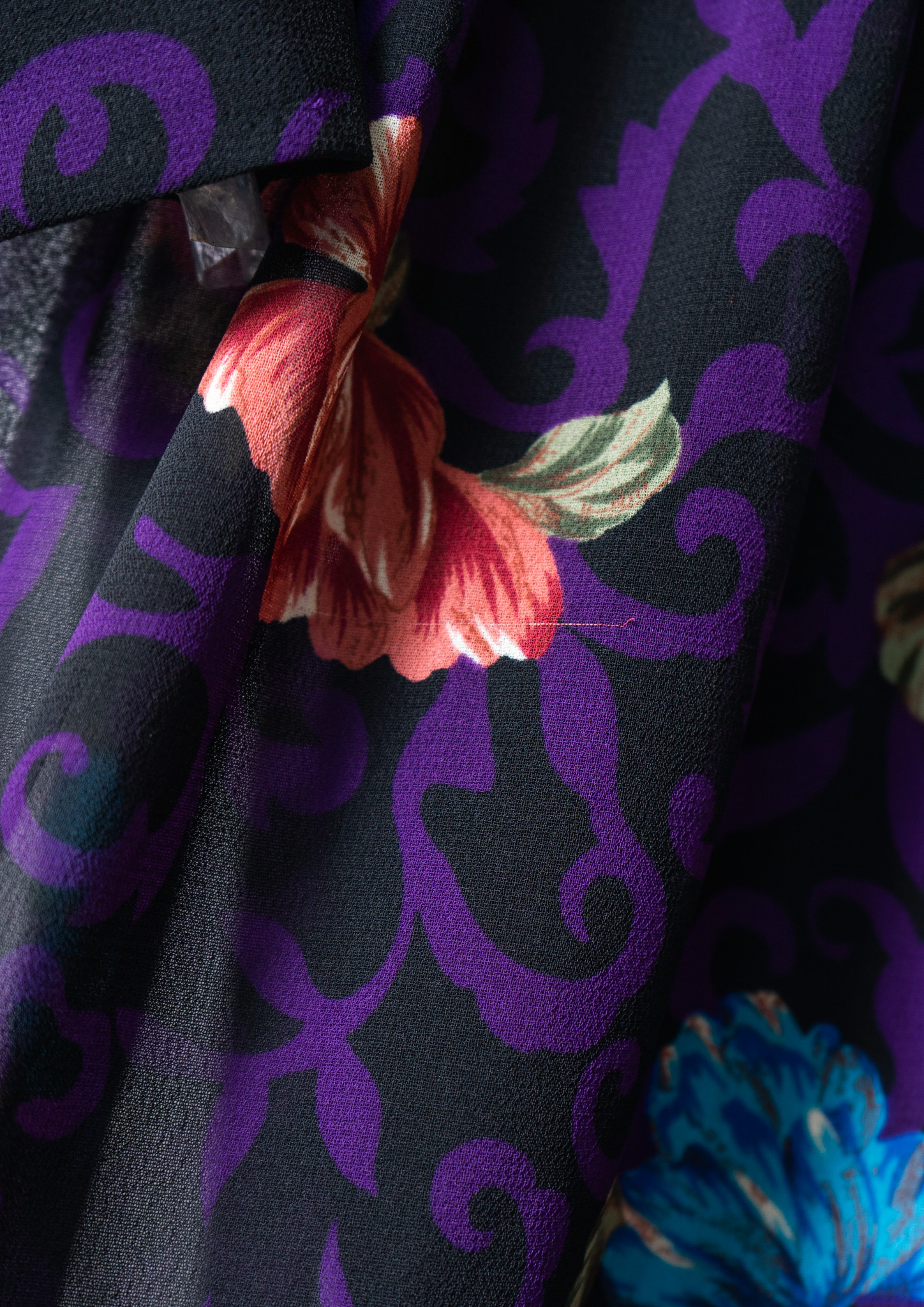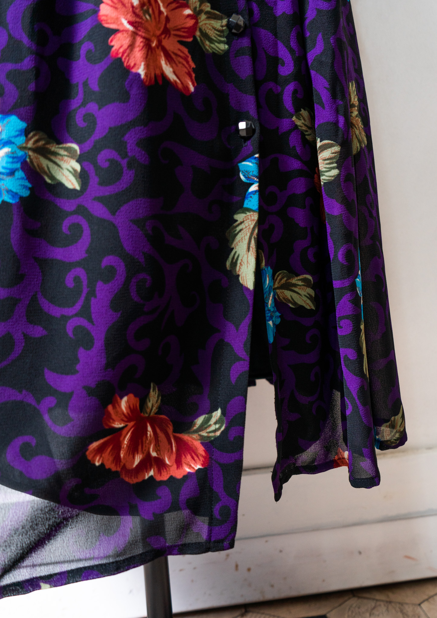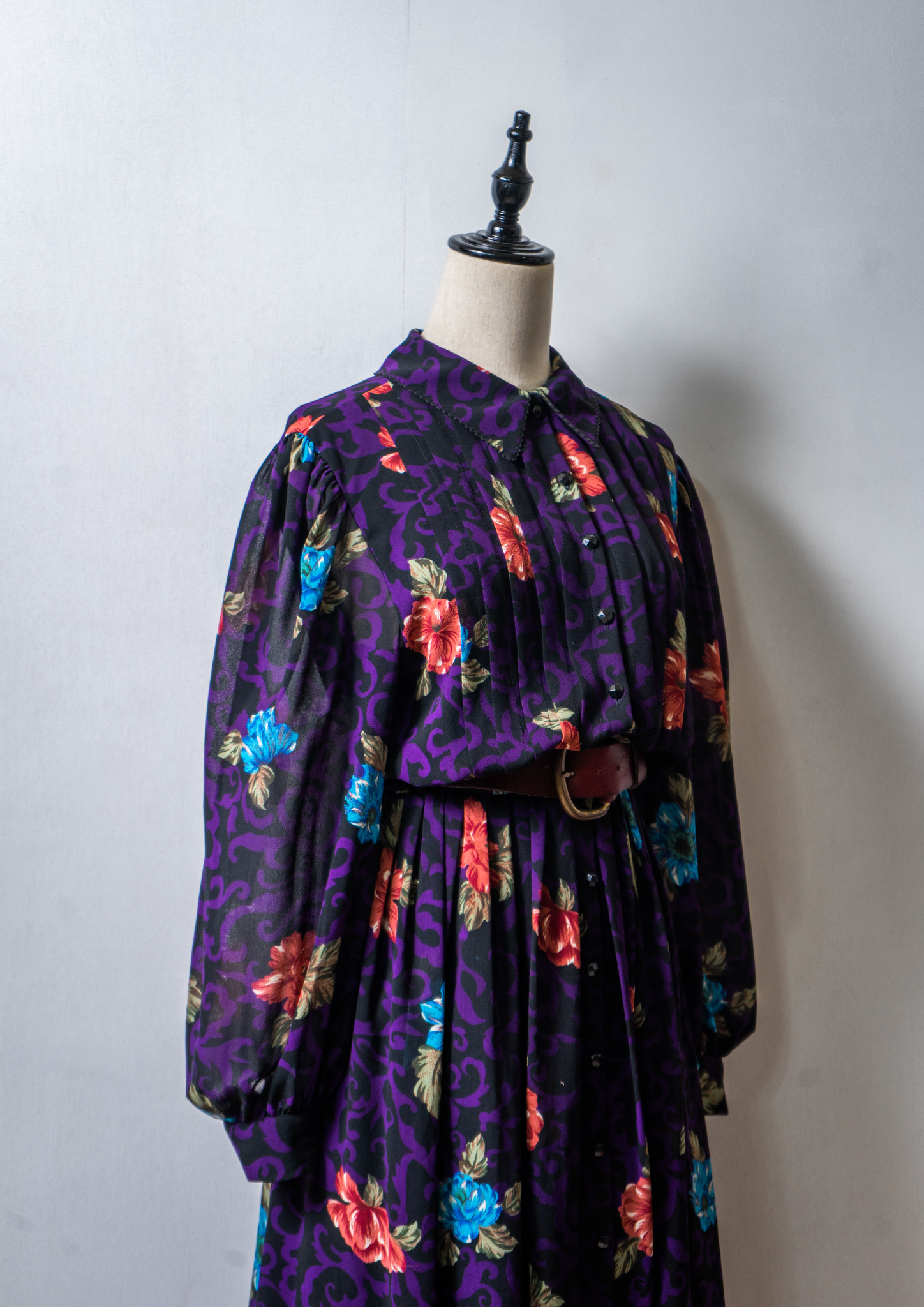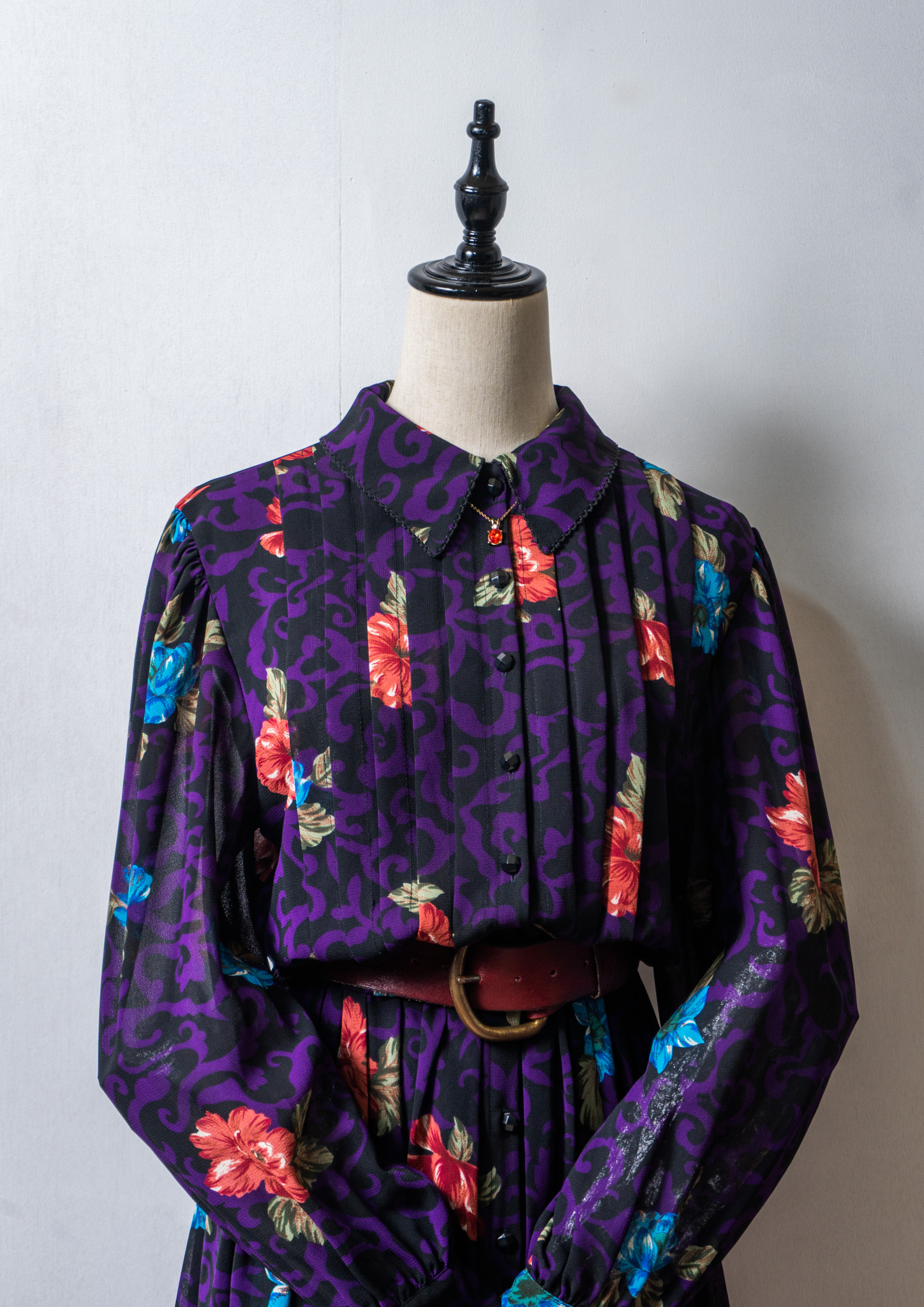 90's Donna Morgan Botanical Pattern Tuck Design Purple Dress