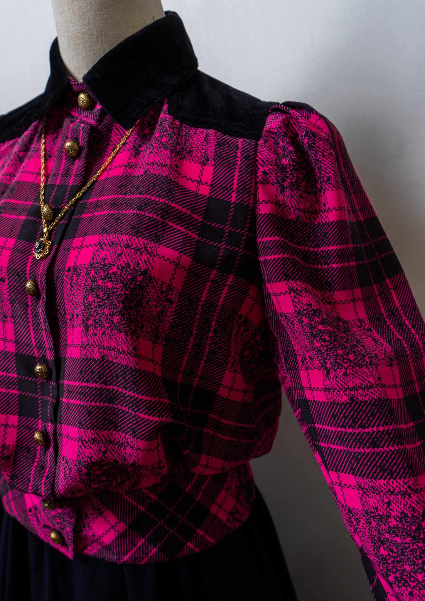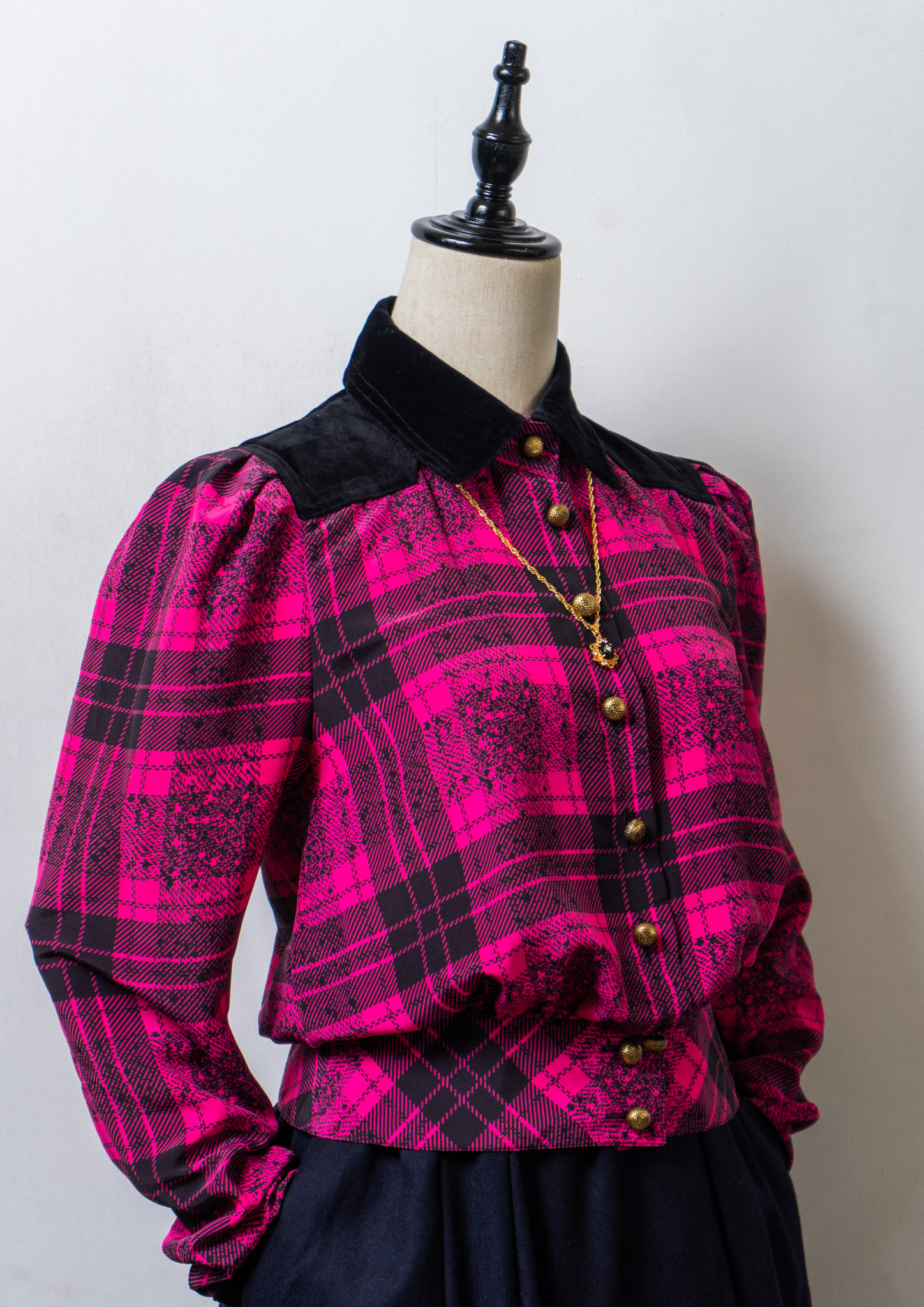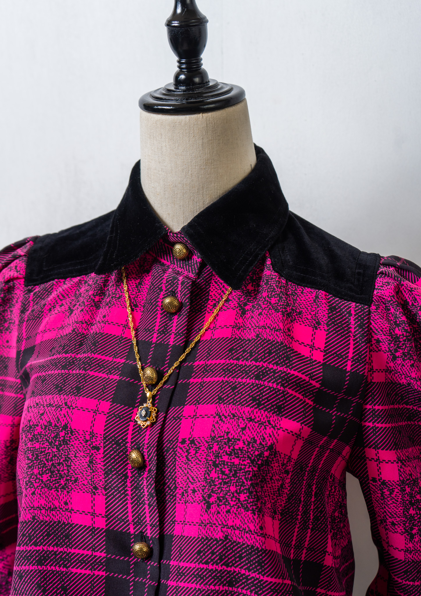 80's Euro Point Velor Design Check Pattern Vivid Pink Jacket Blouse