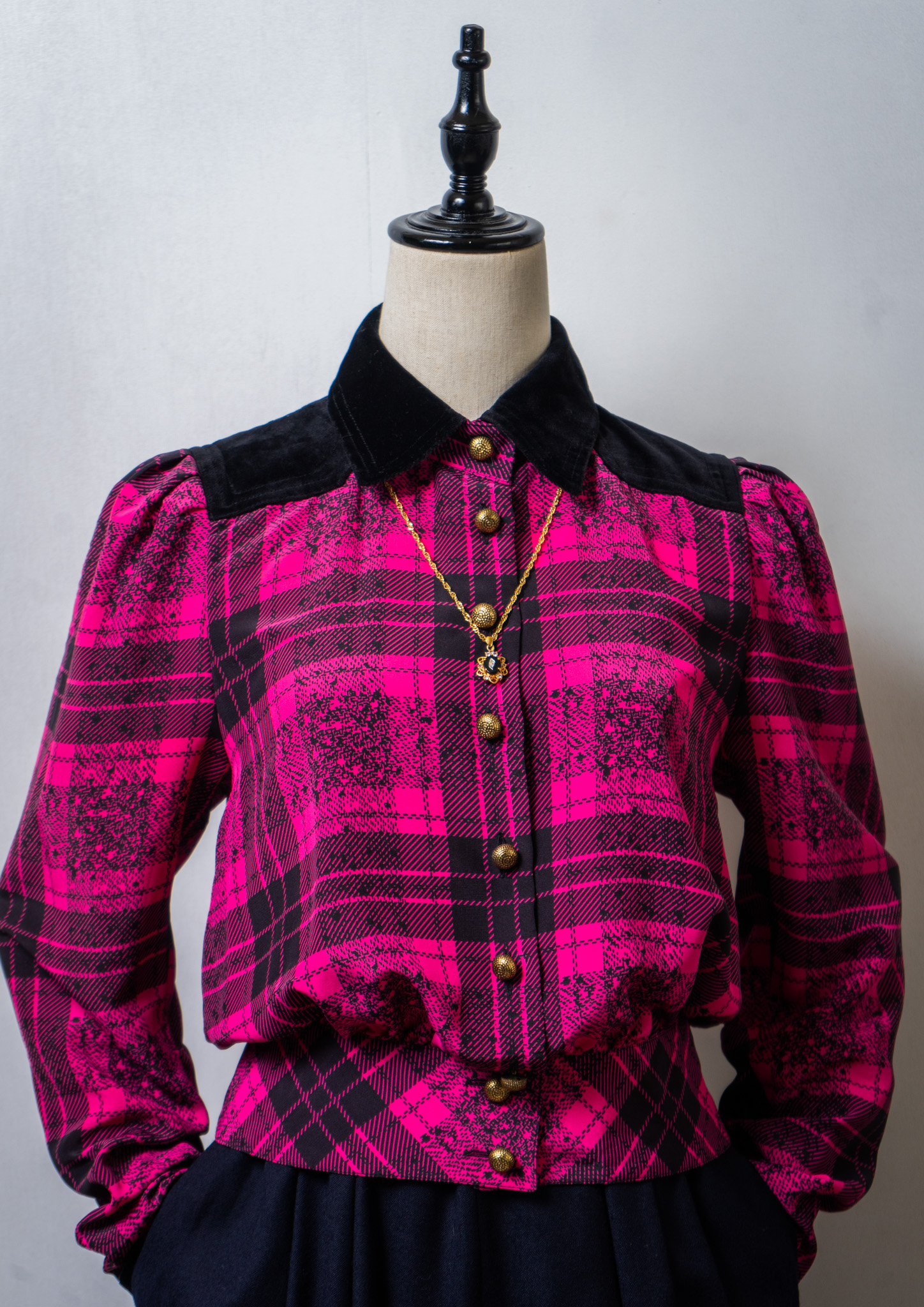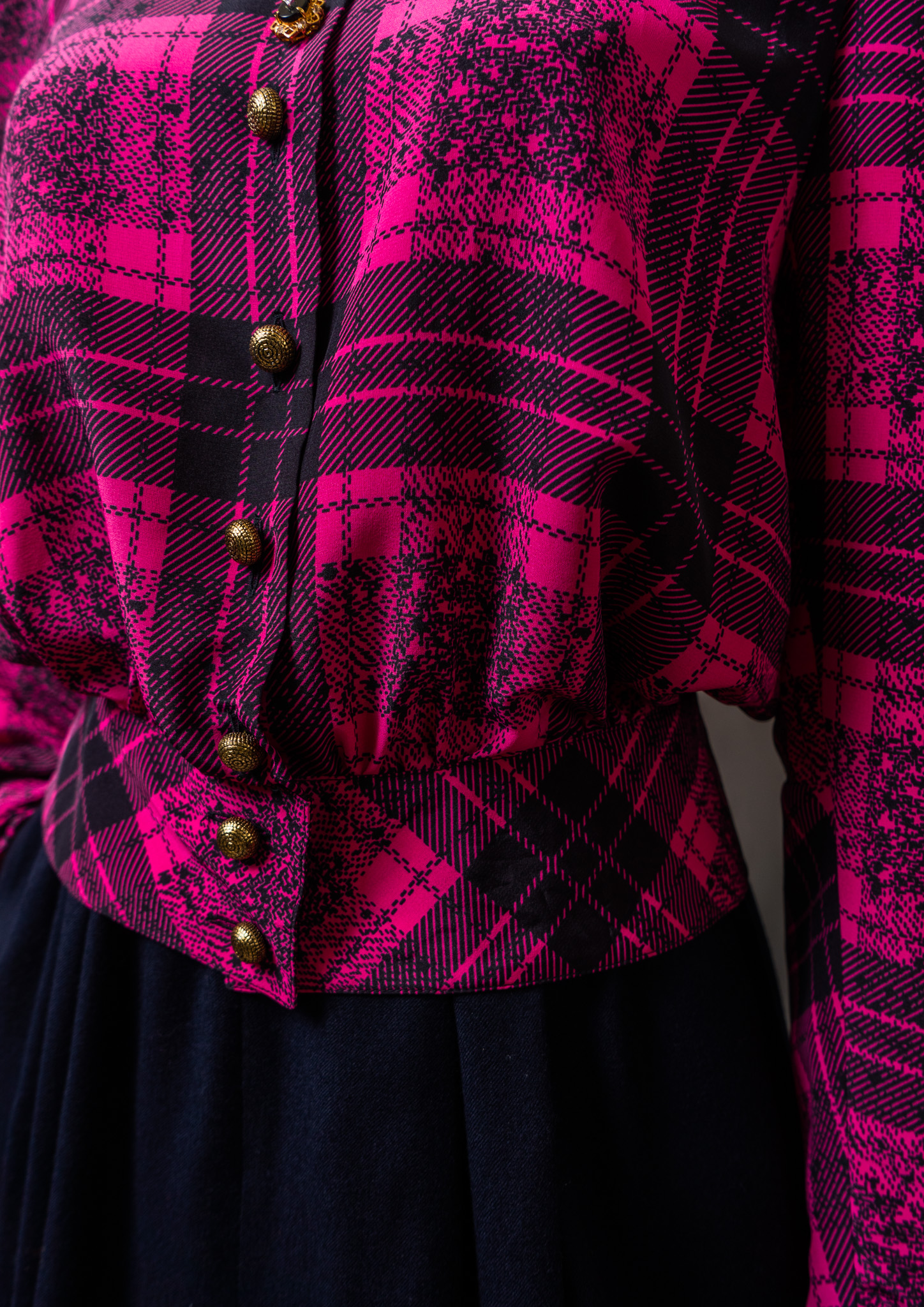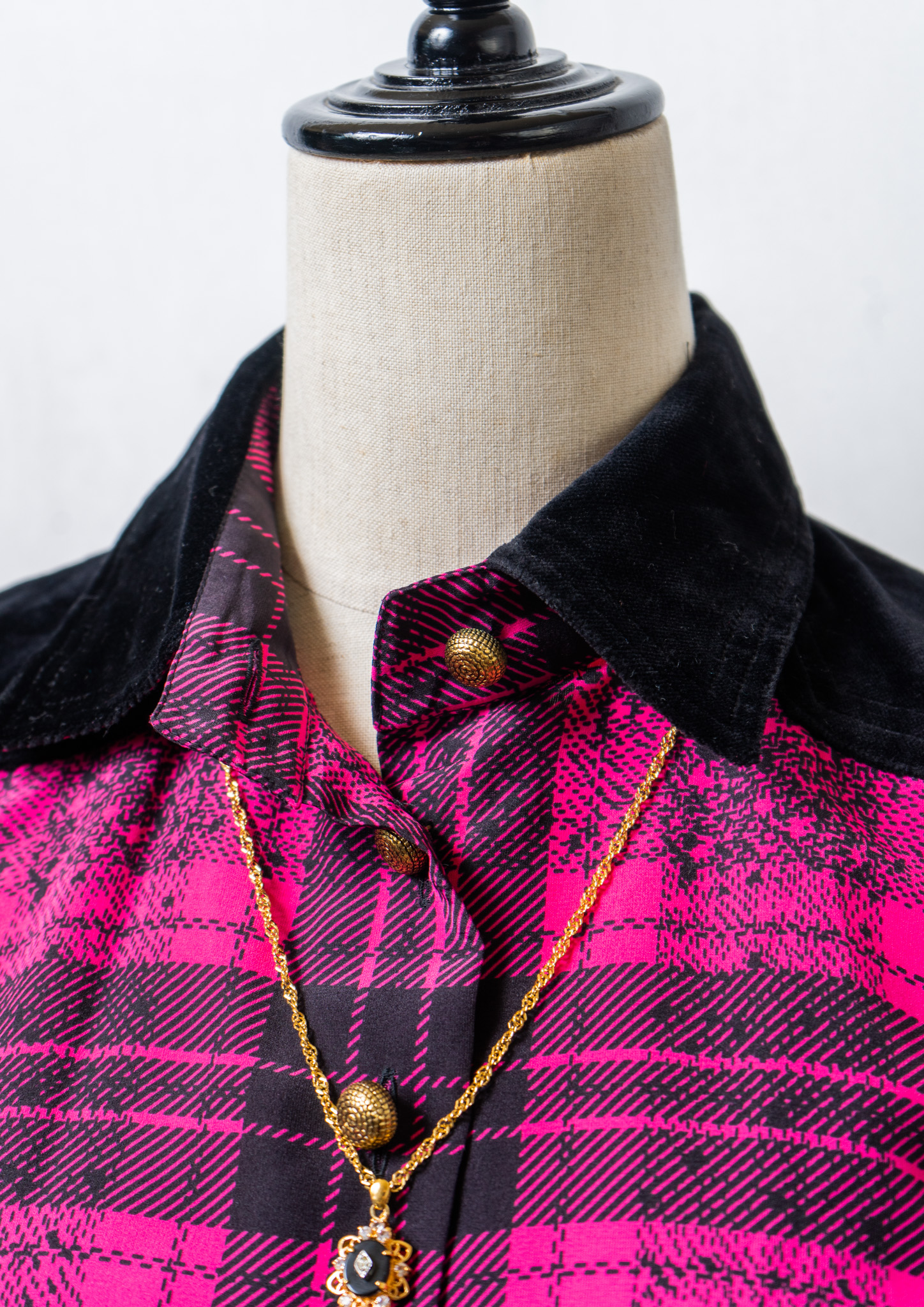 80's Euro Point Velor Design Check Pattern Vivid Pink Jacket Blouse