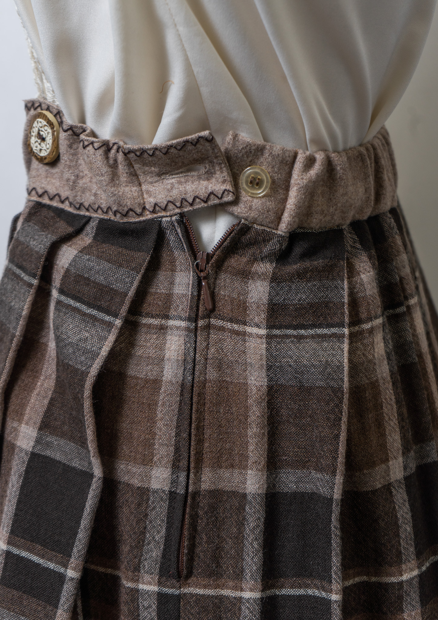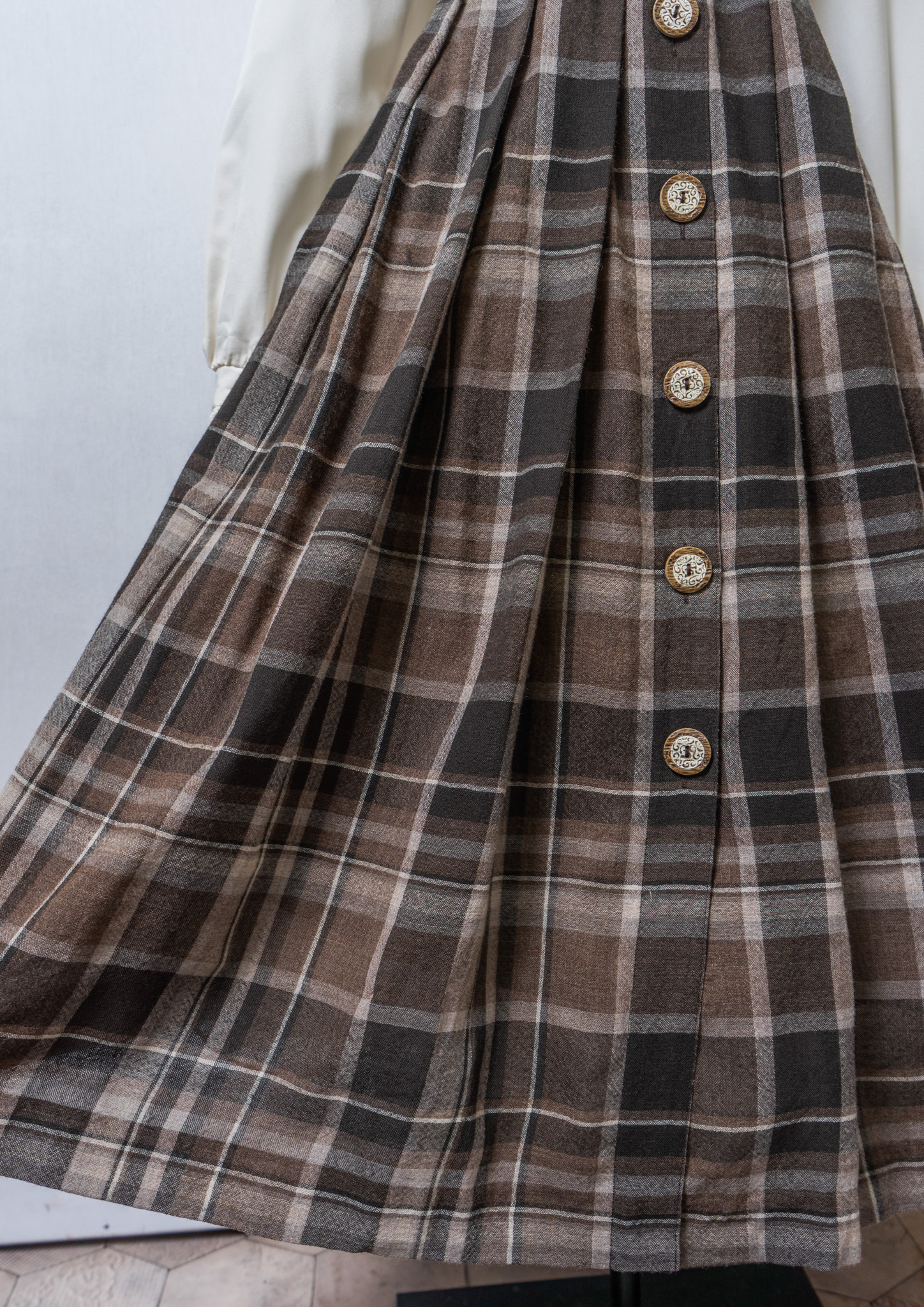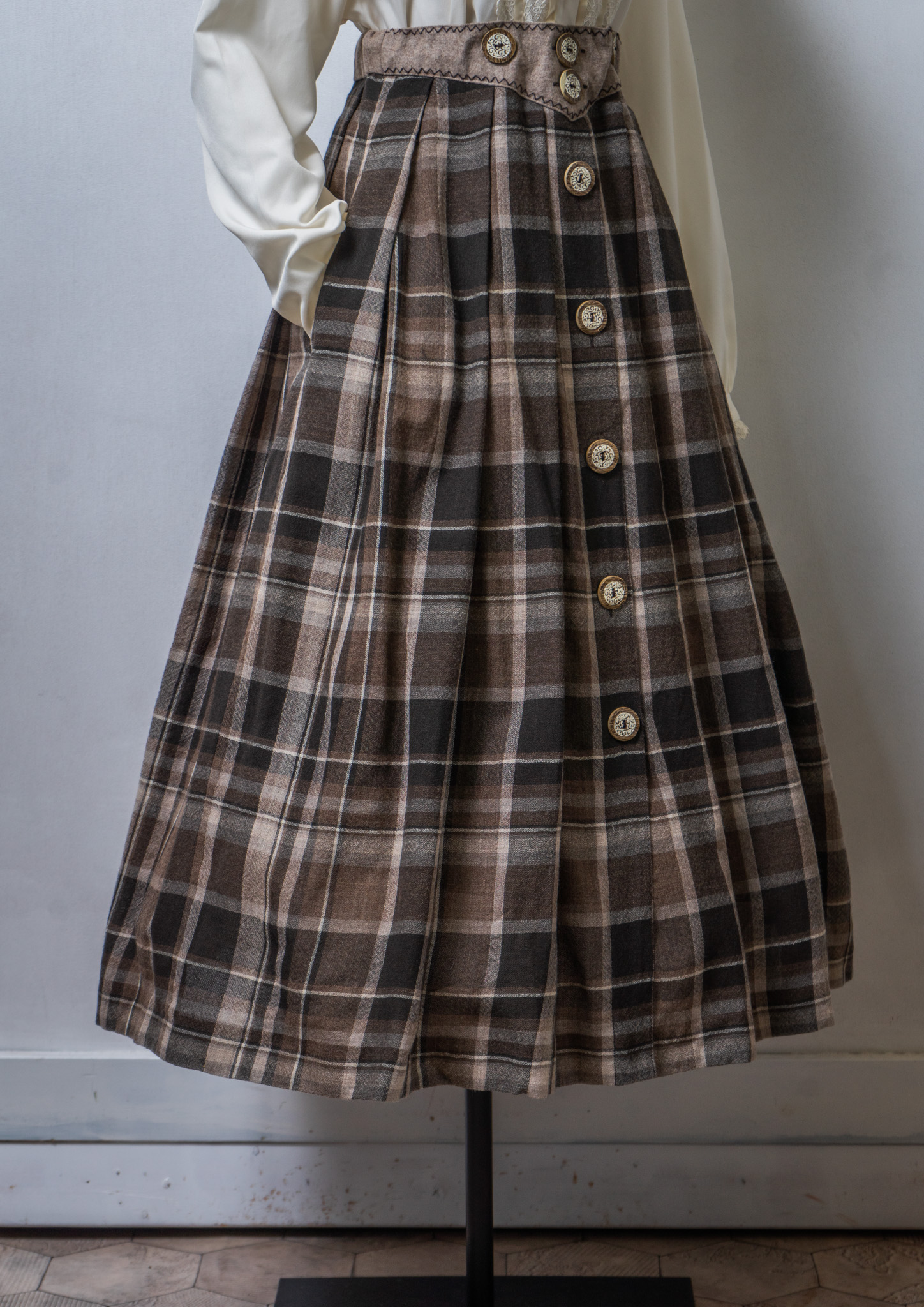 90's Euro Front Uique Big Button Design Check Pattern Brown Tyrol Skirt