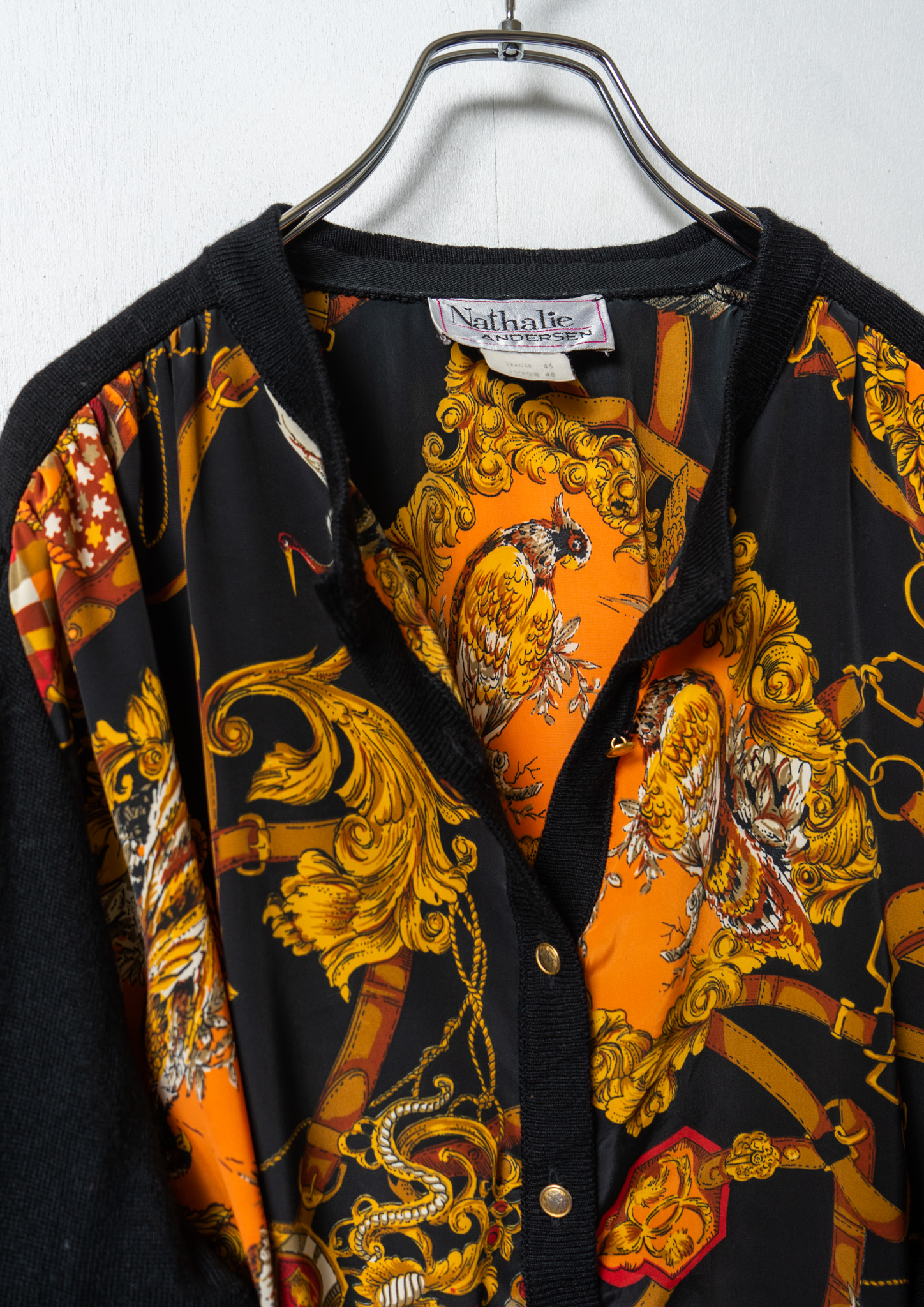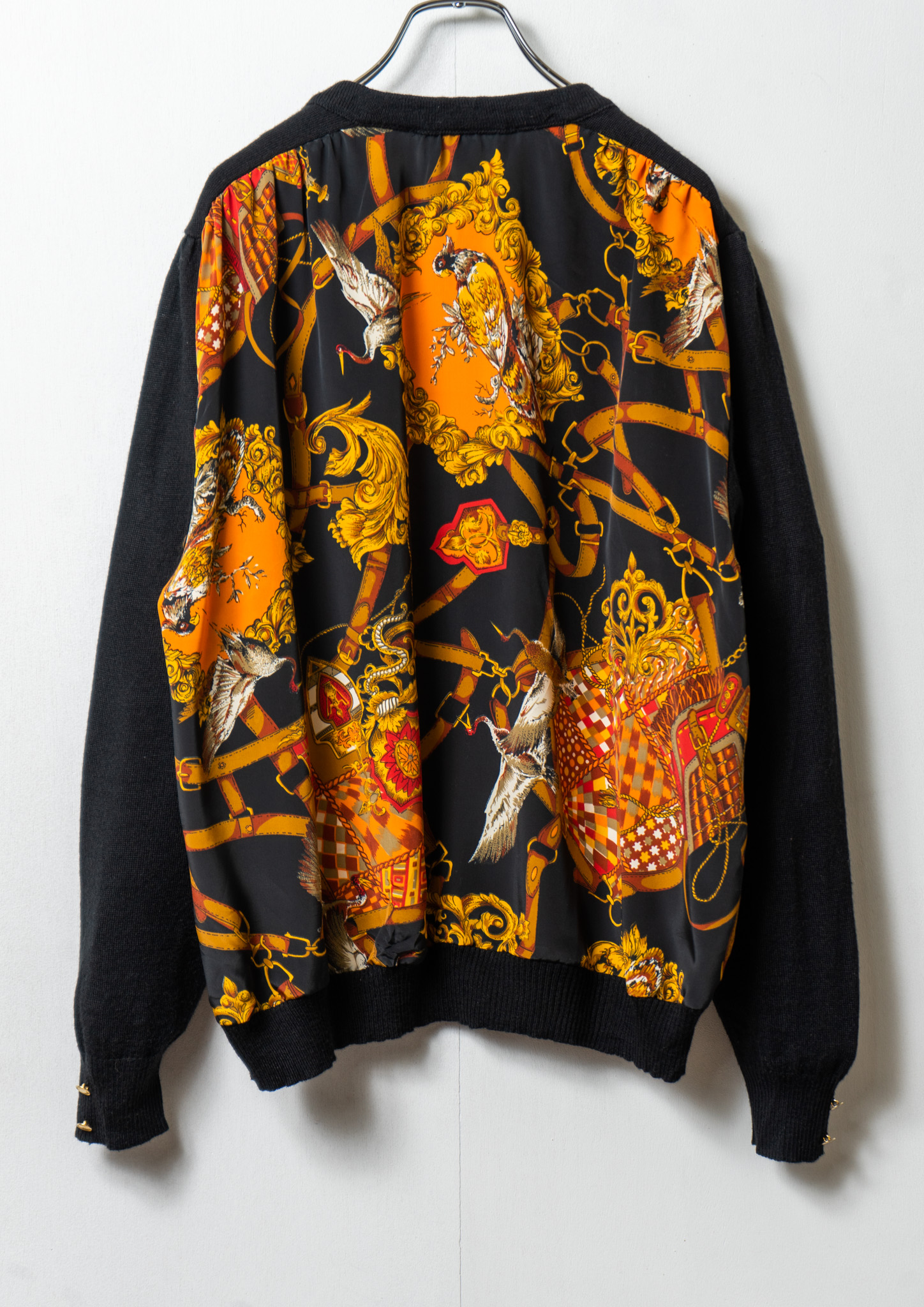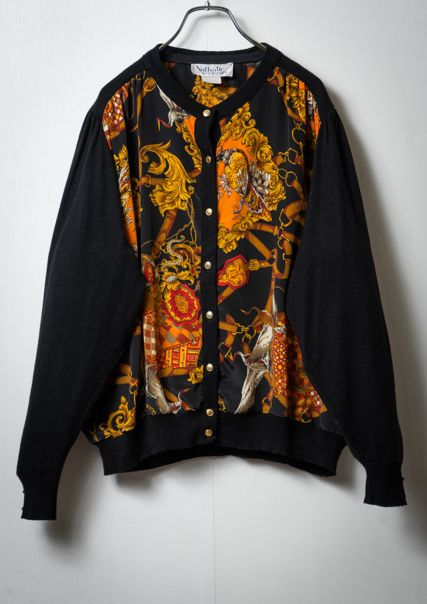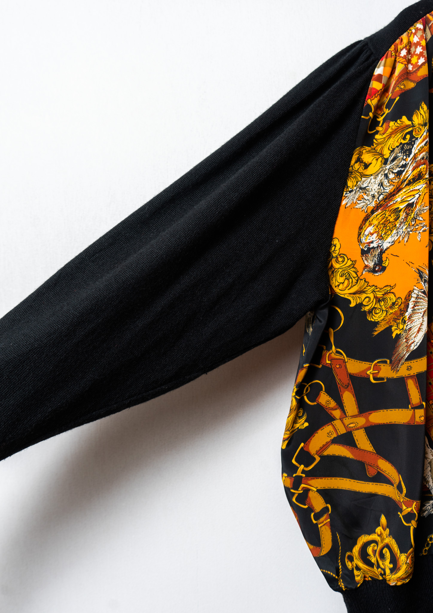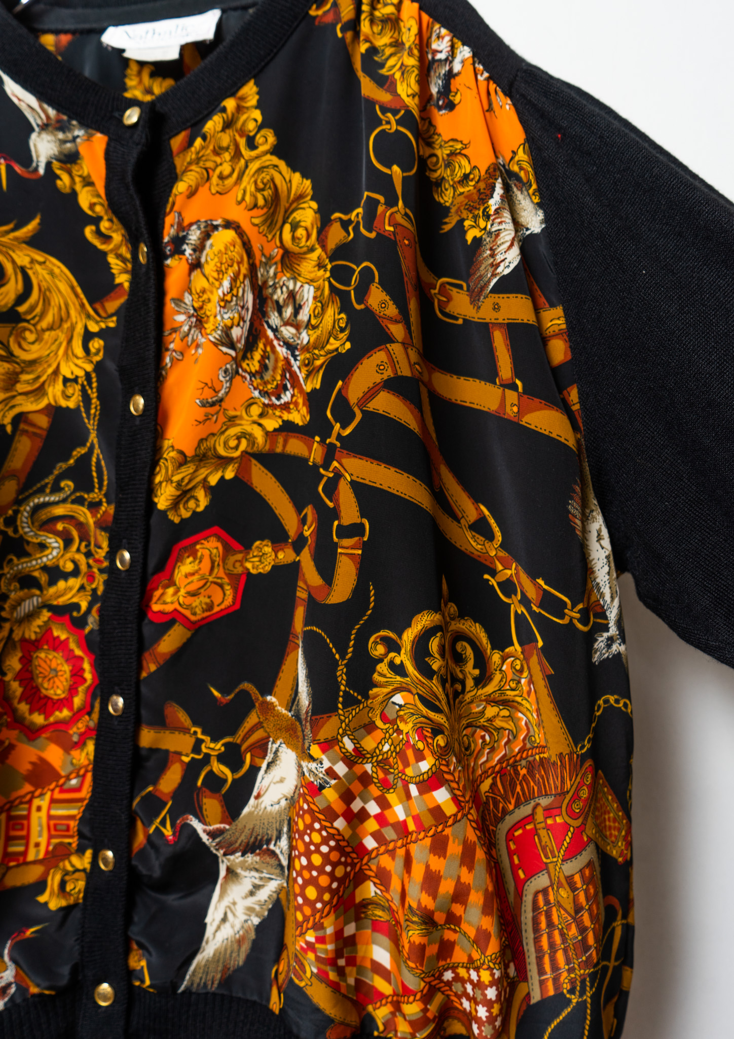 80's Euro Gold Button Design Scarf Like Pattern Black Cardigan
