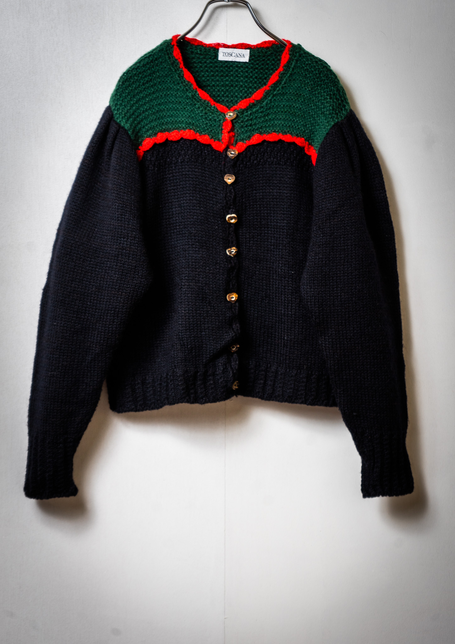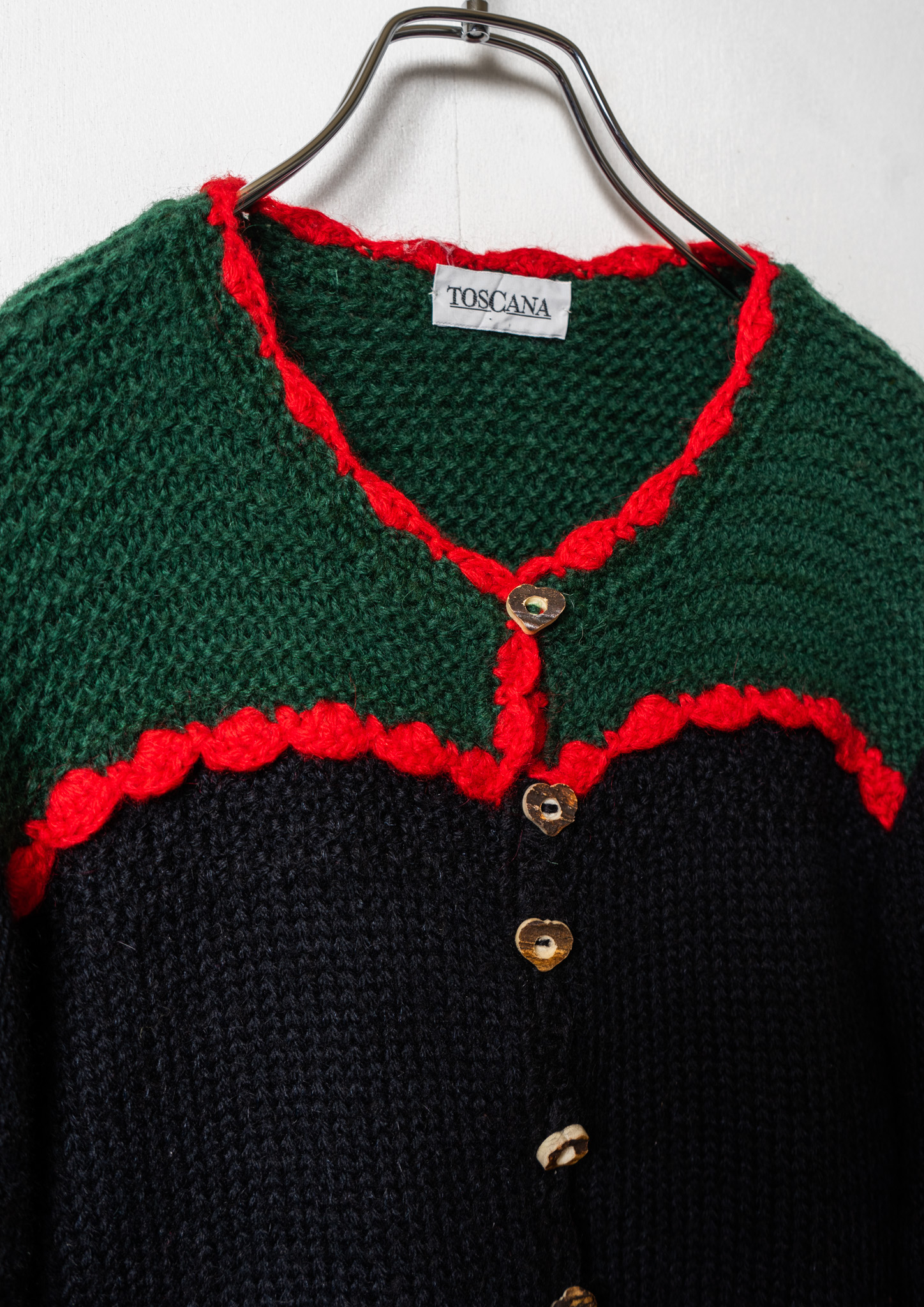 80's Austria Heat Tyrol Button Design Green × Black Knit Tyrol Cardigan