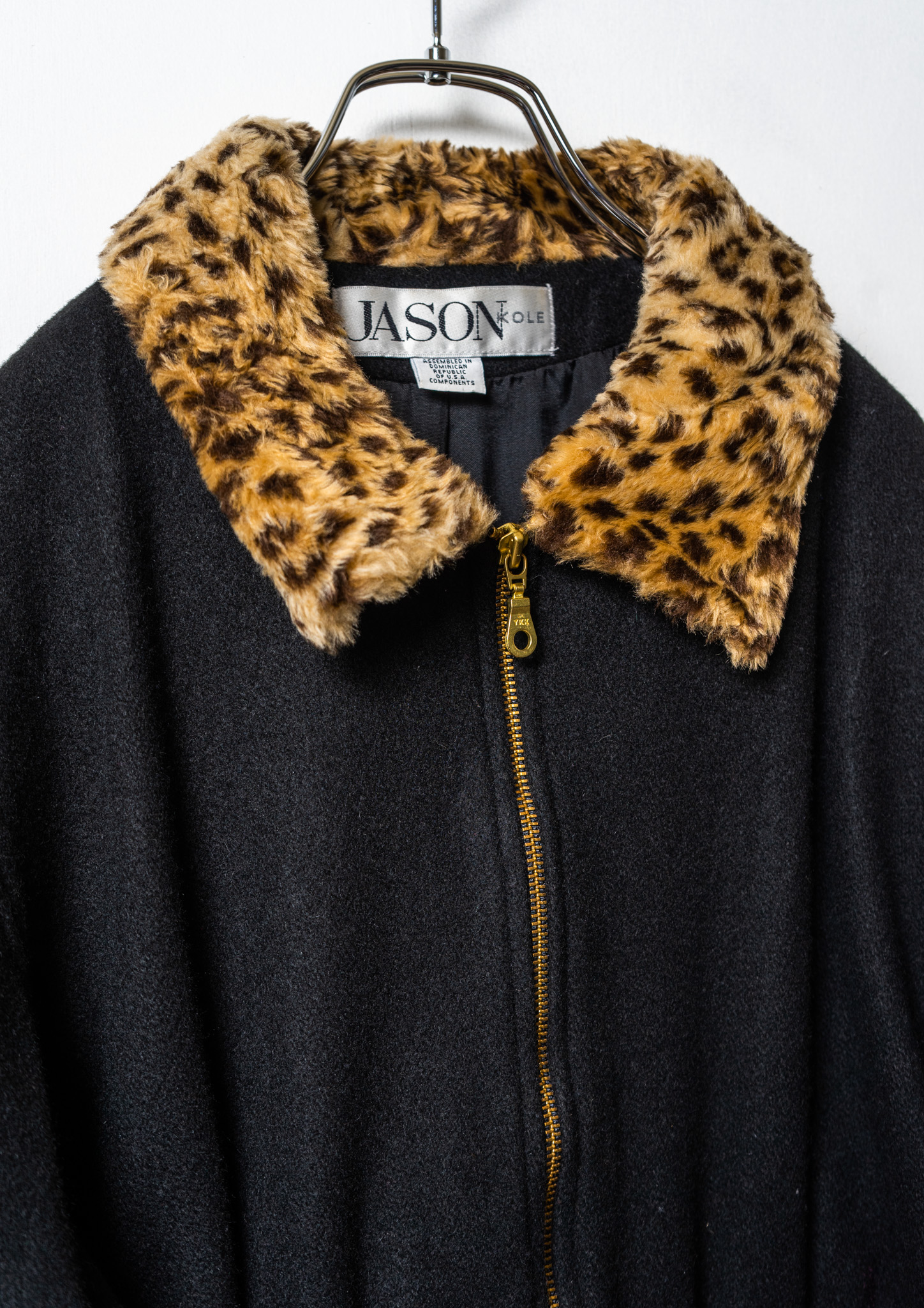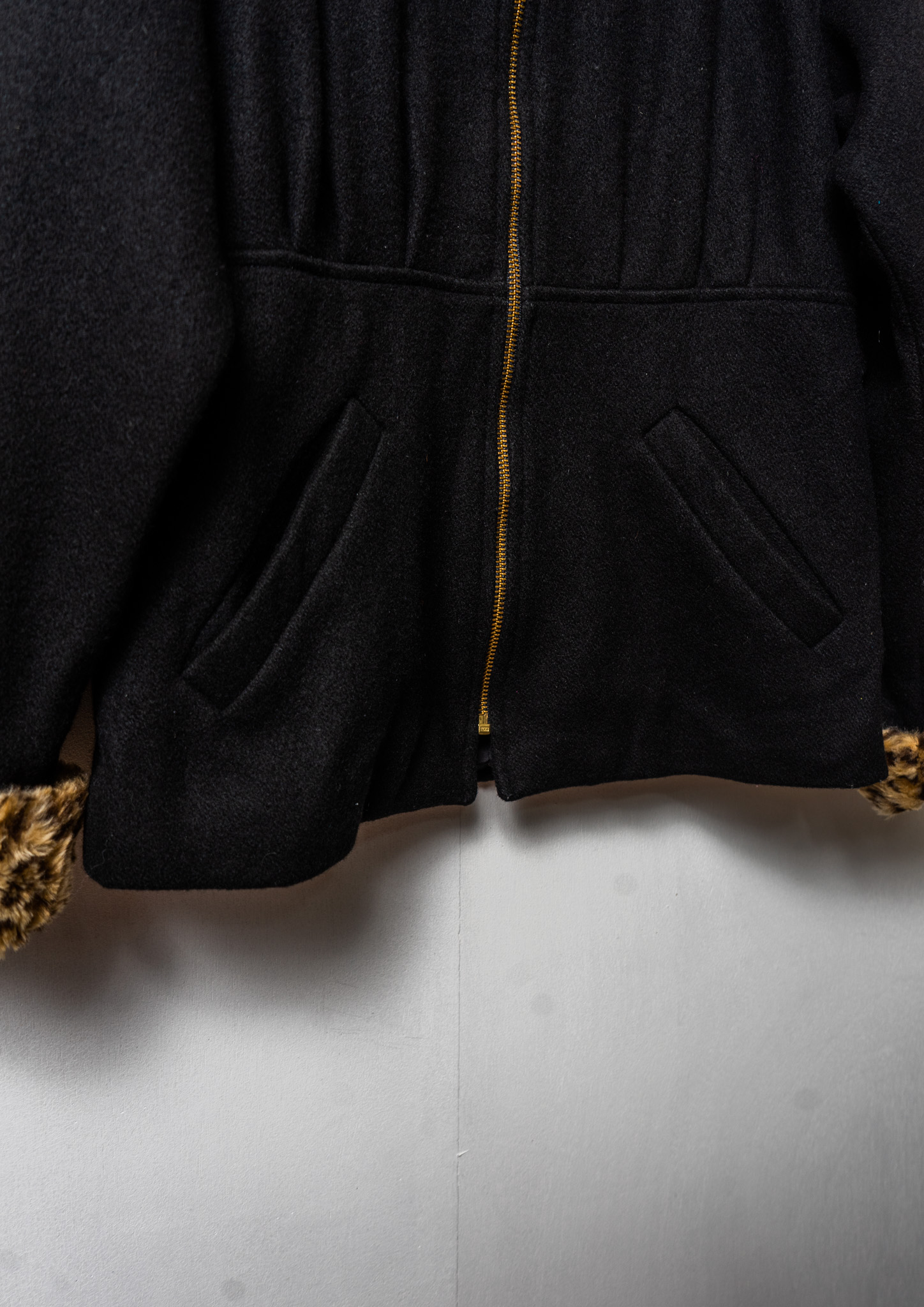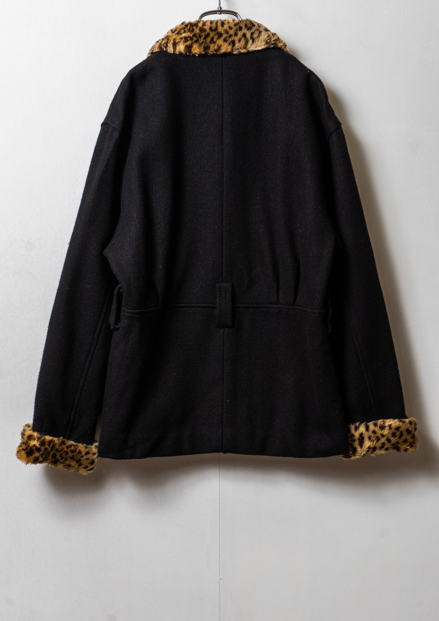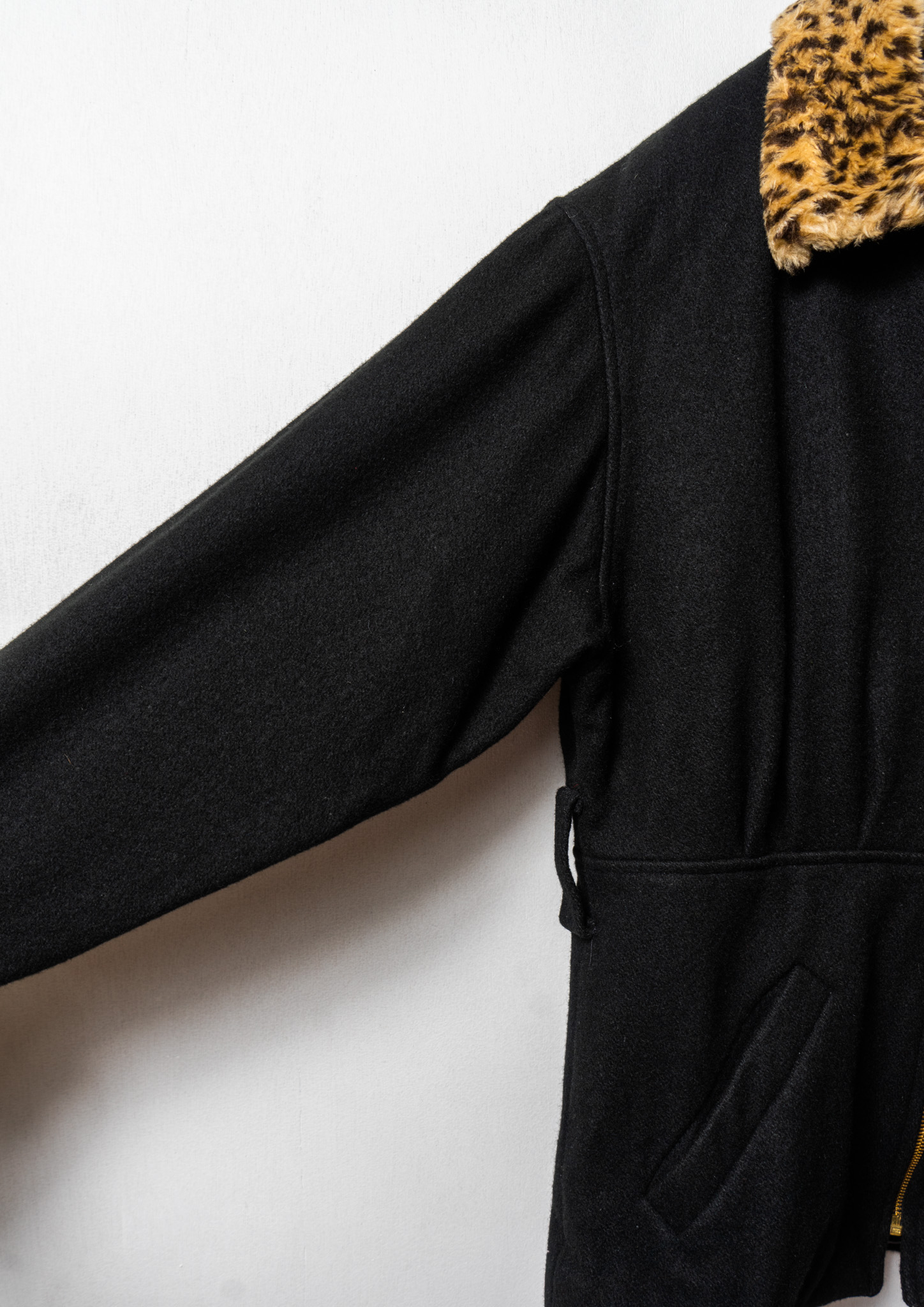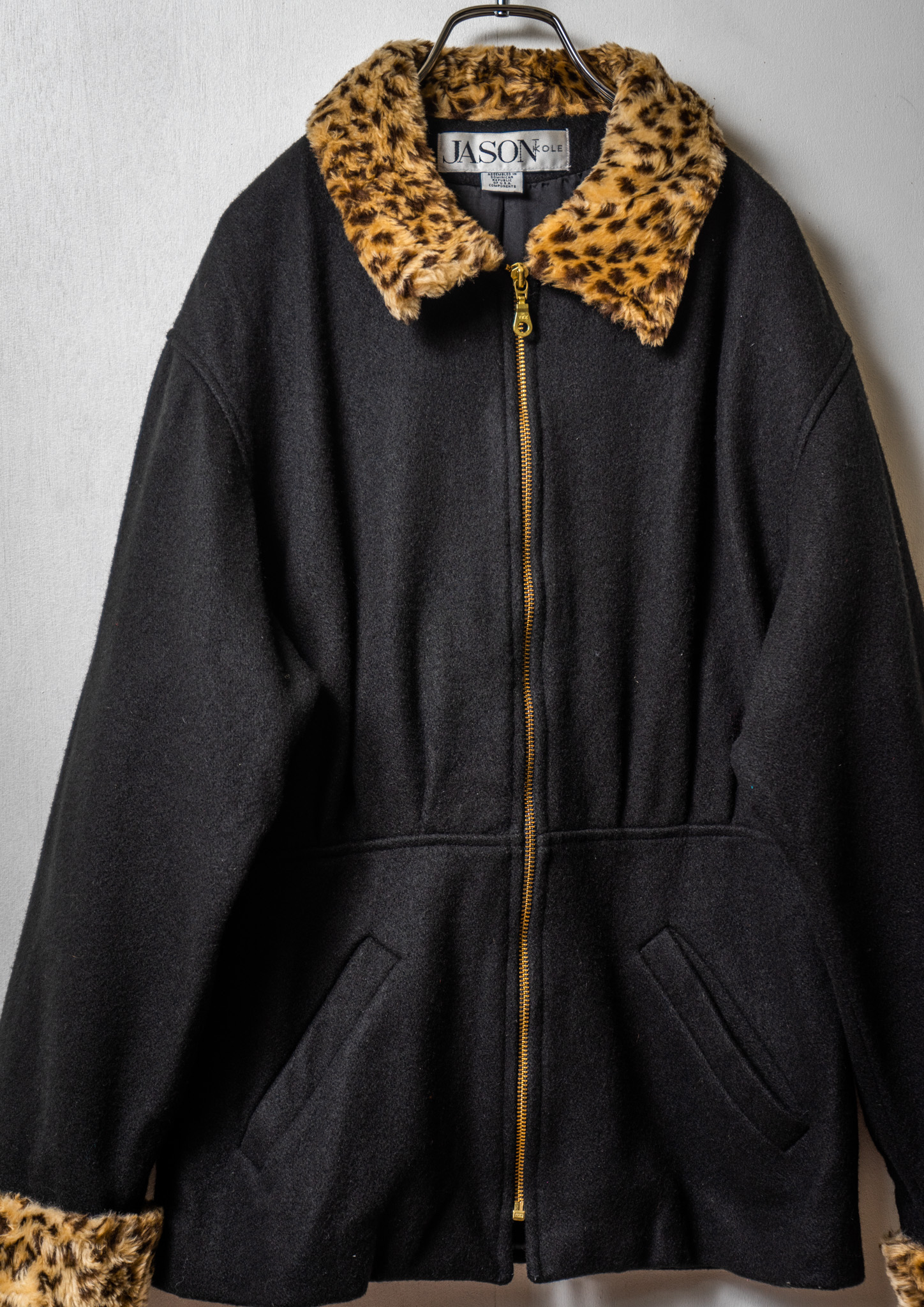 80's Double Pocket Design Point Leopard Pattern Black Wool Jacket