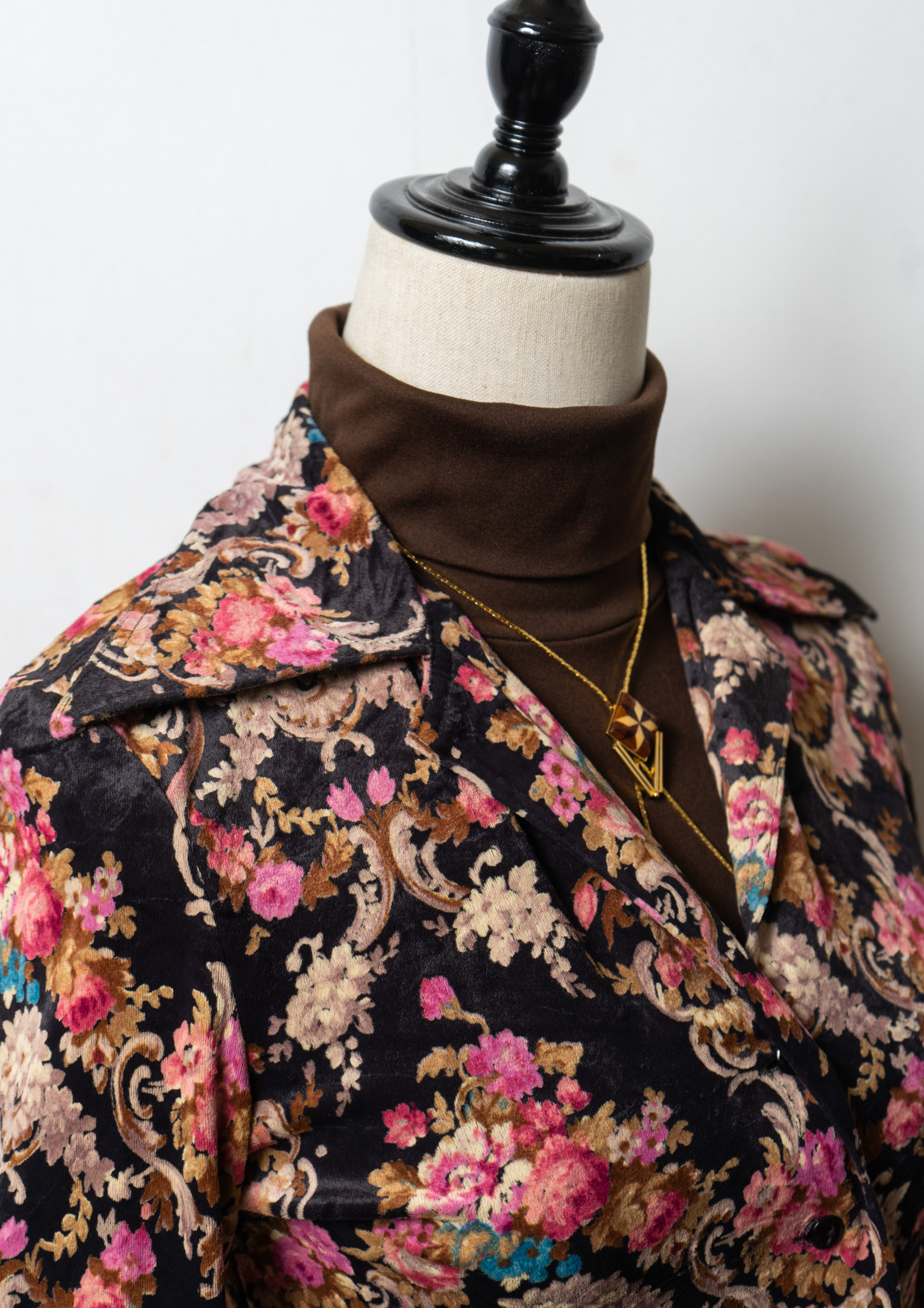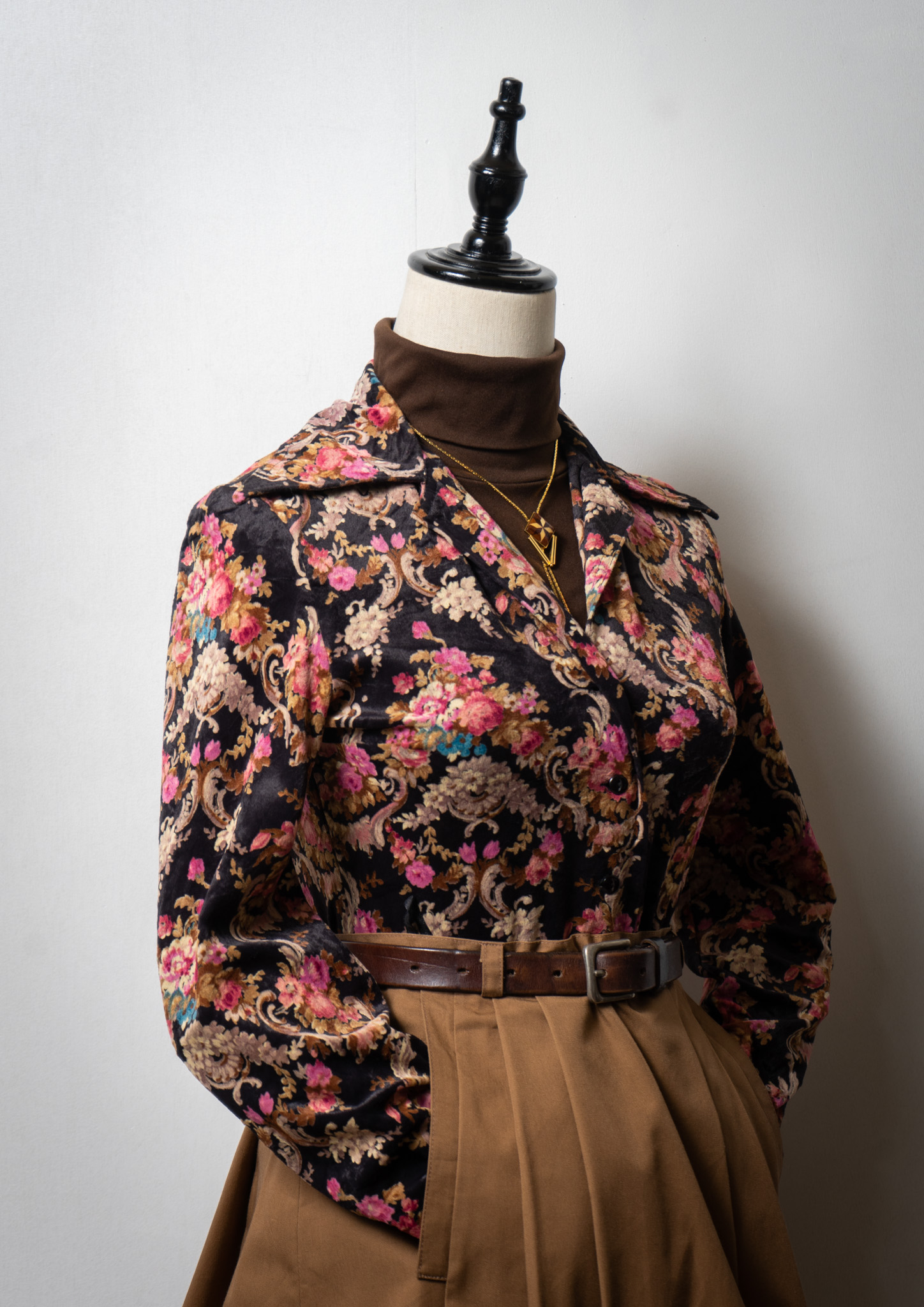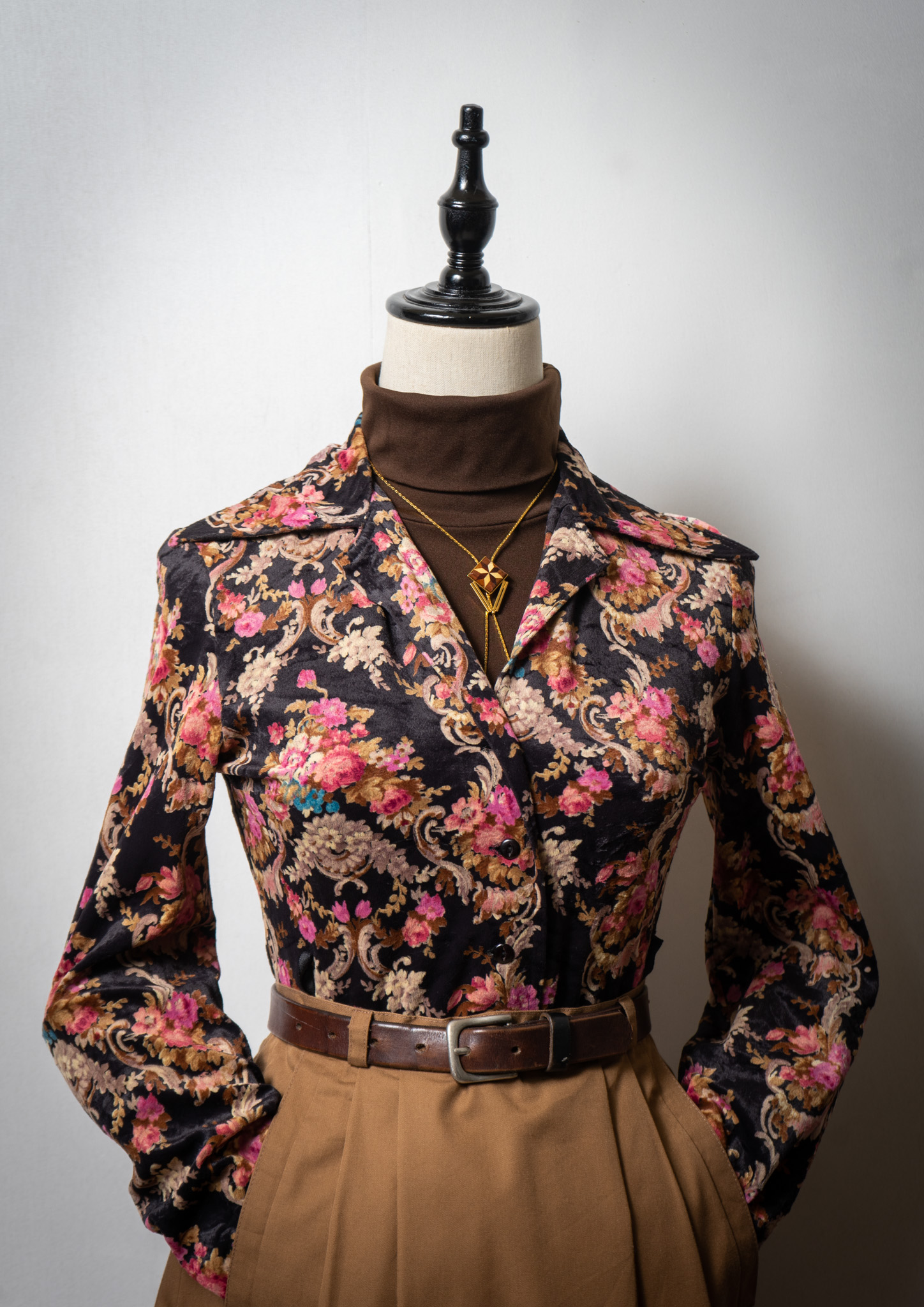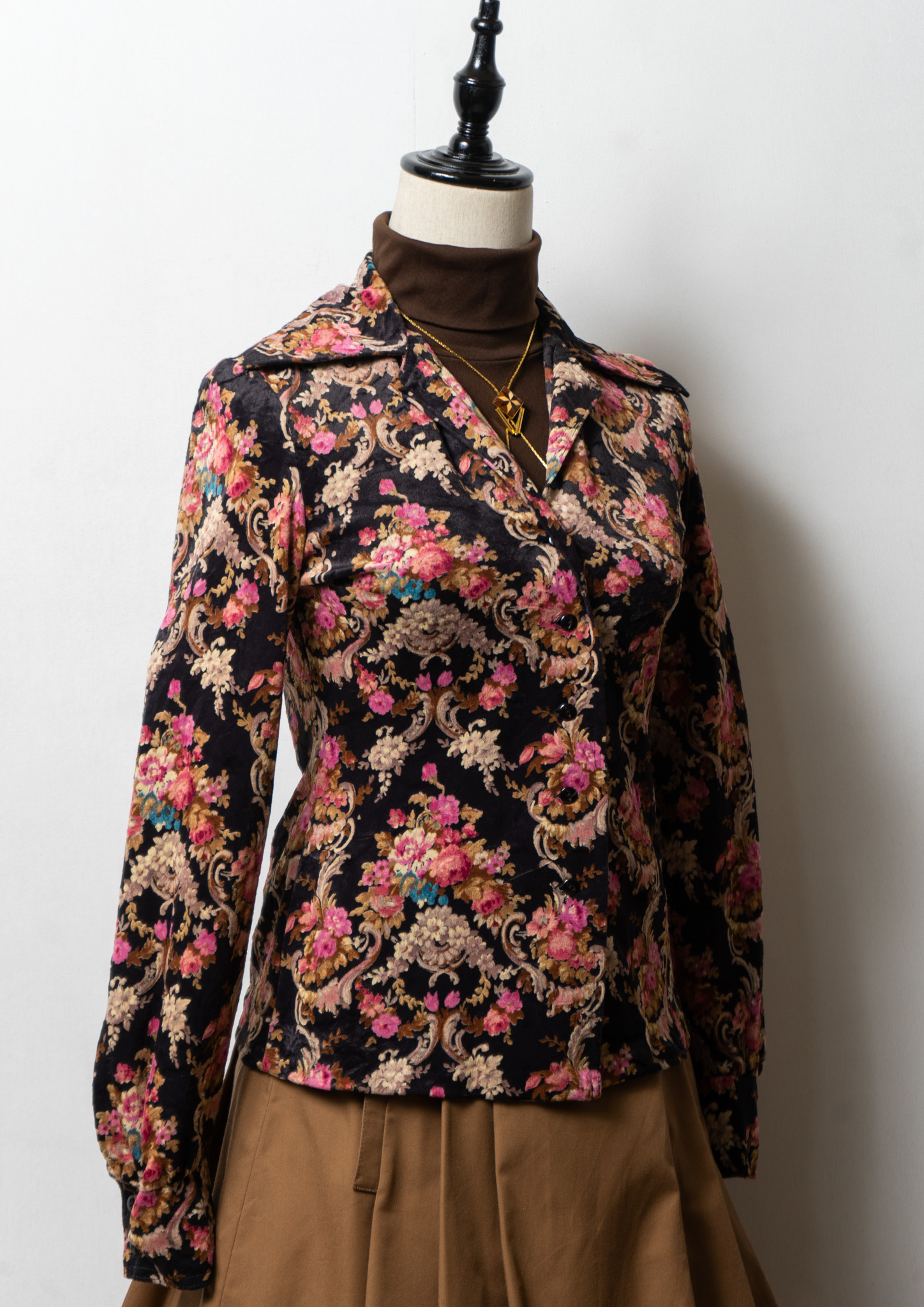 70's Euro Botanical Art Pattern Black Blouse