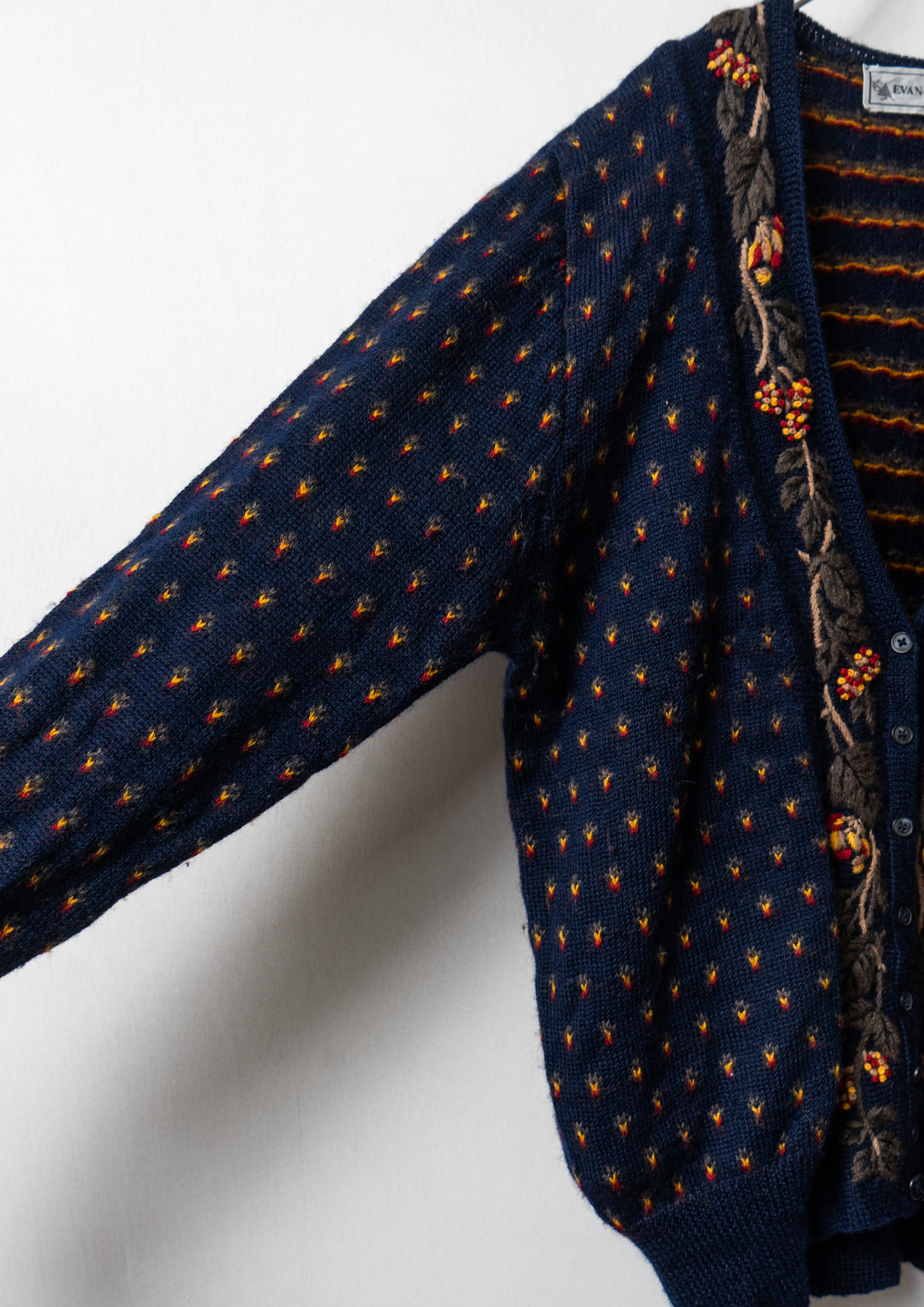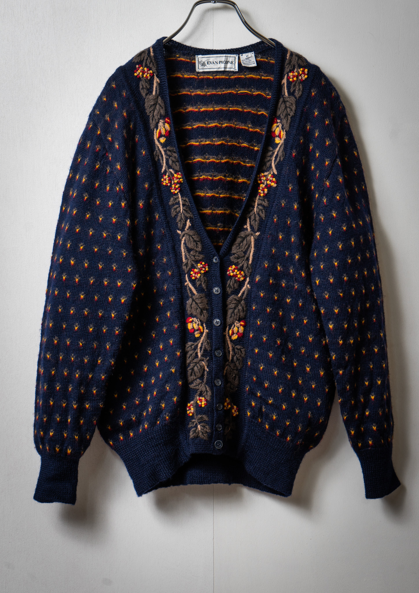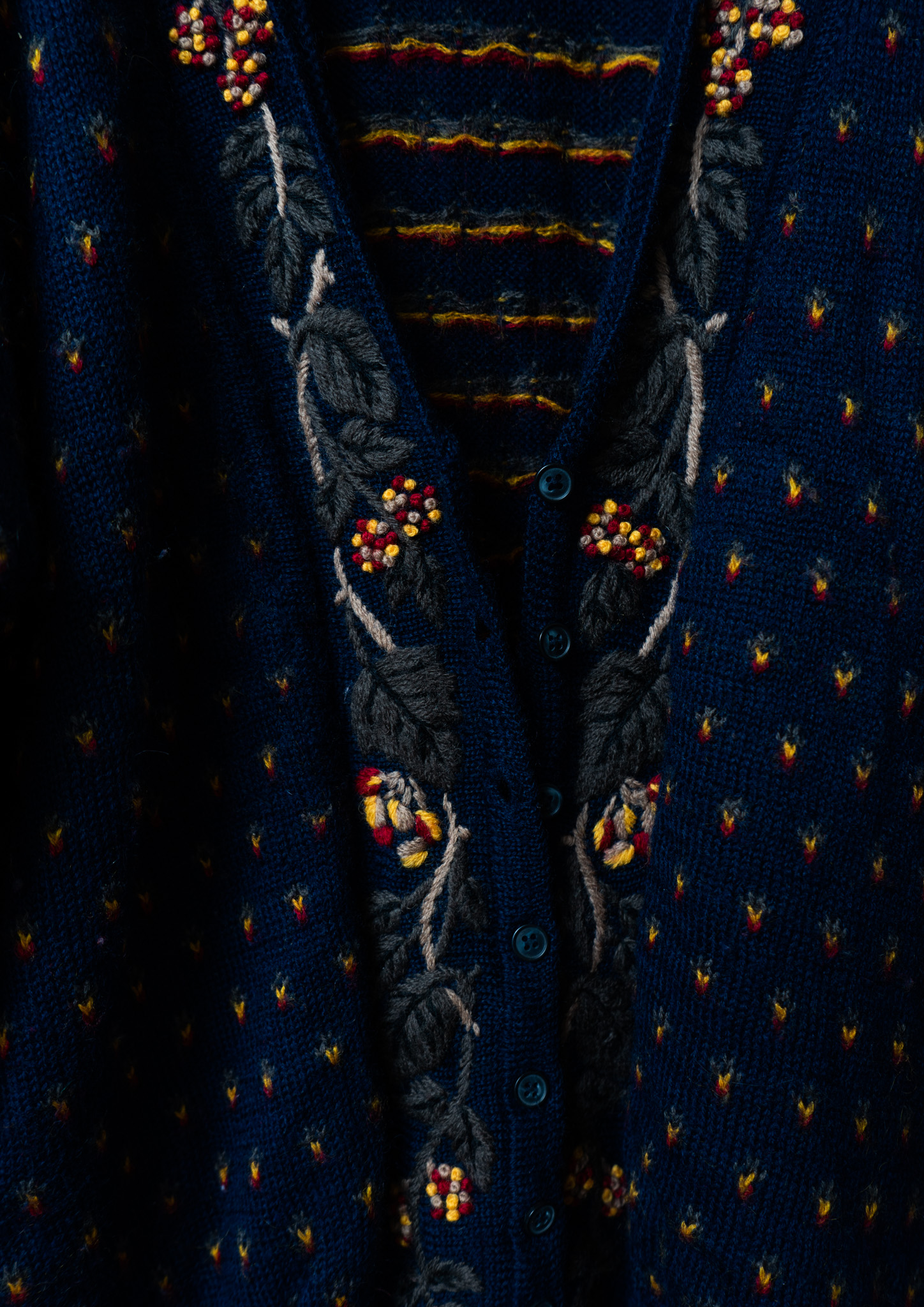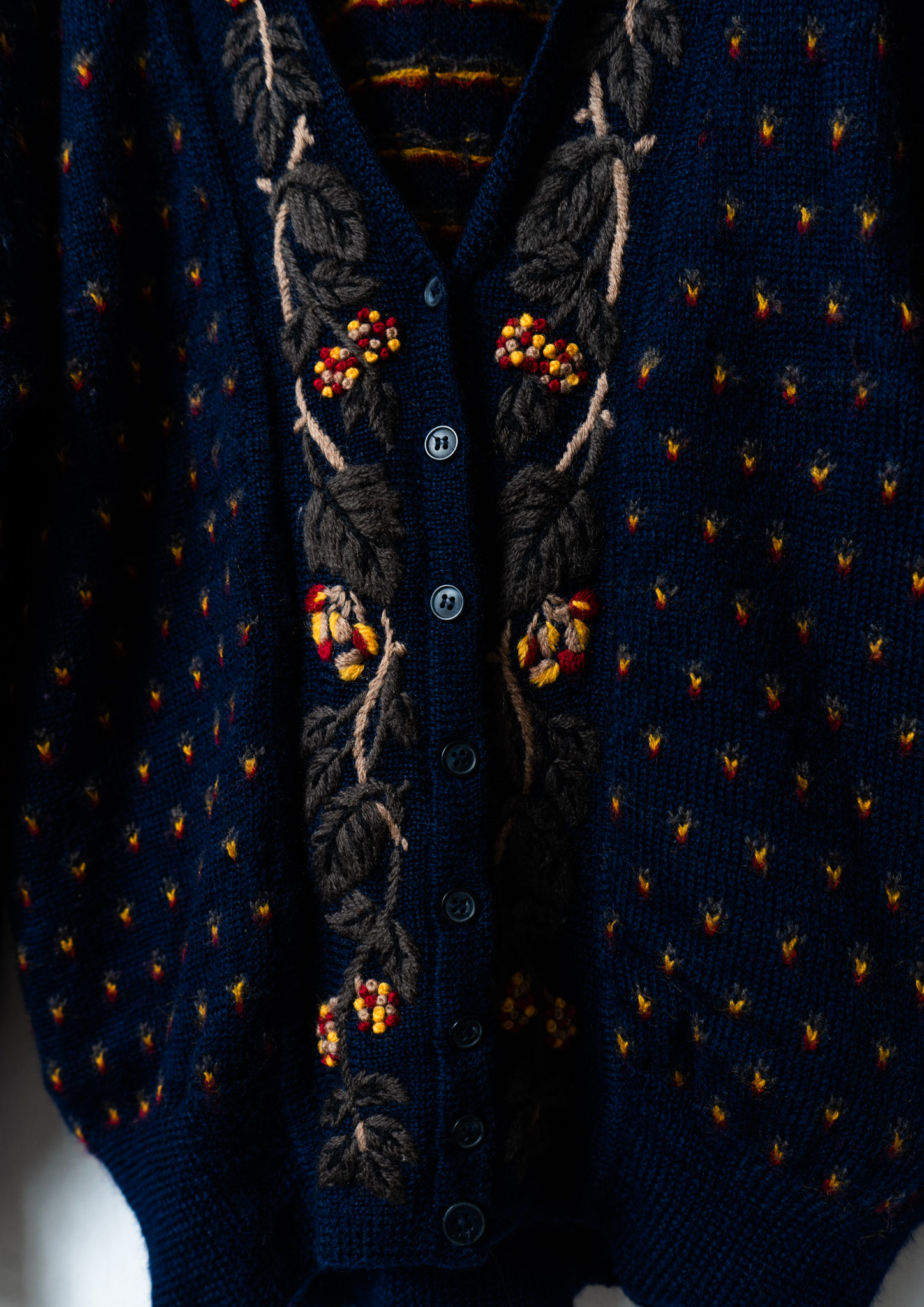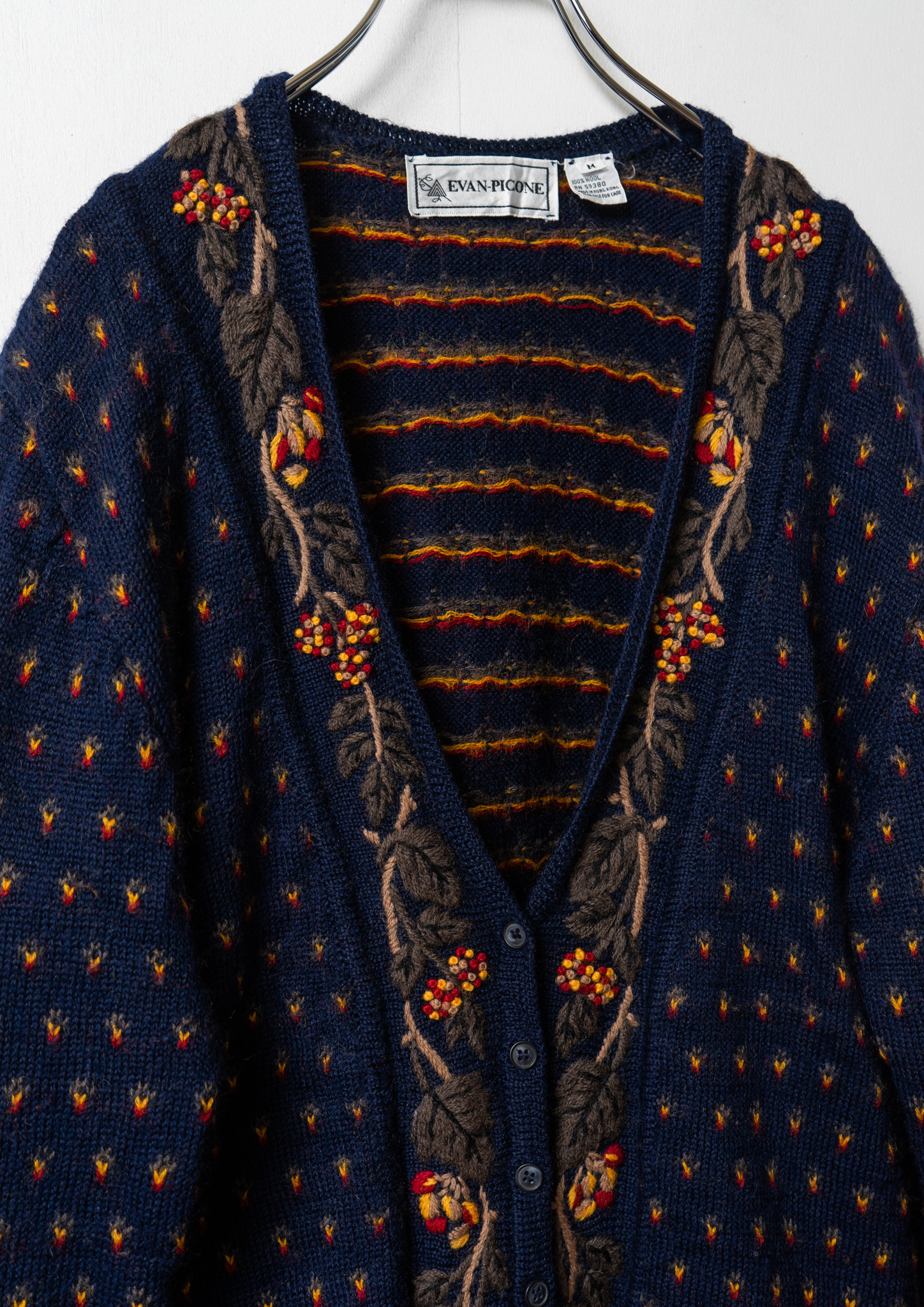 80's Botanical Cord Embroidery Double Pocket Design Angora Black Cardigan
