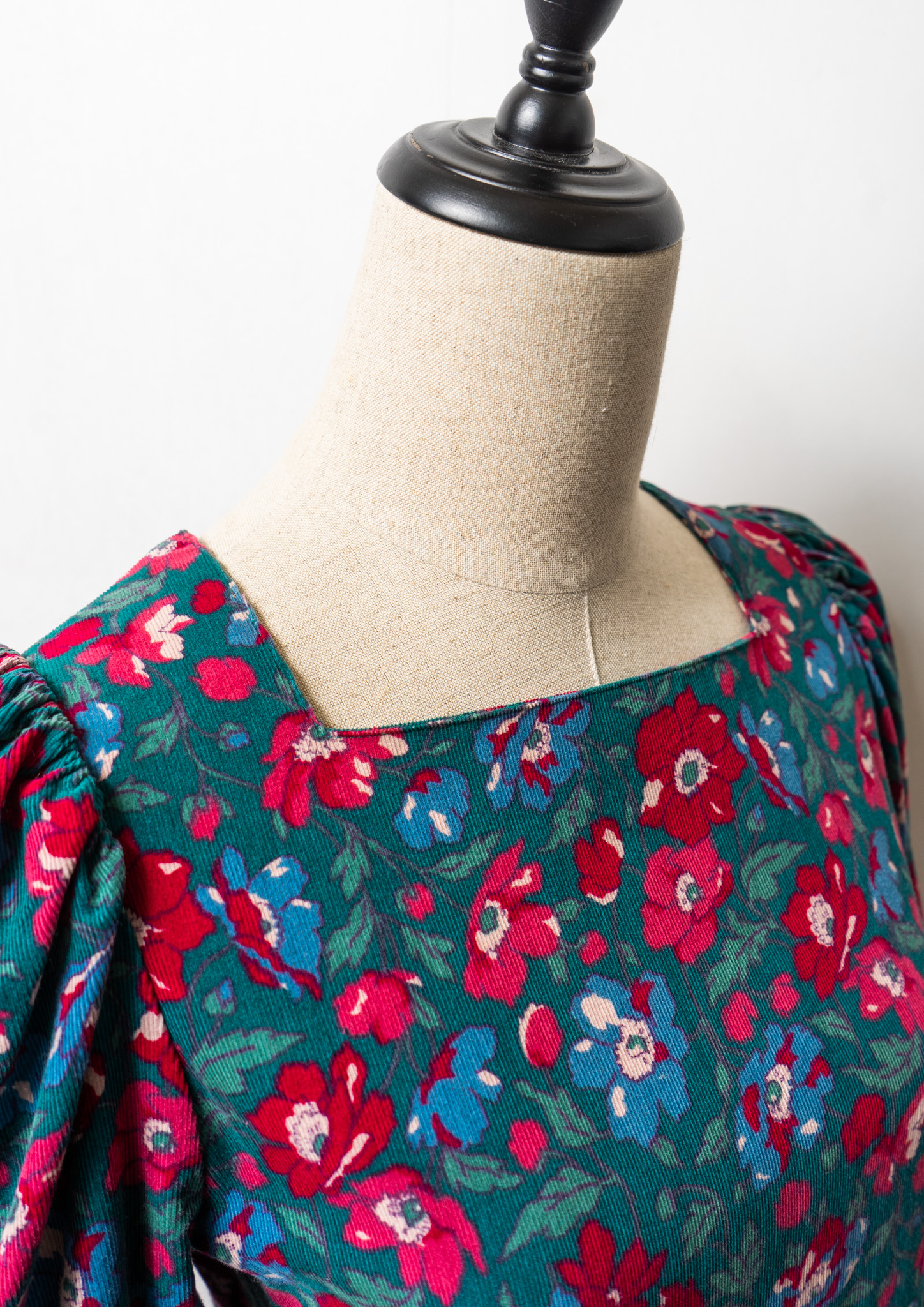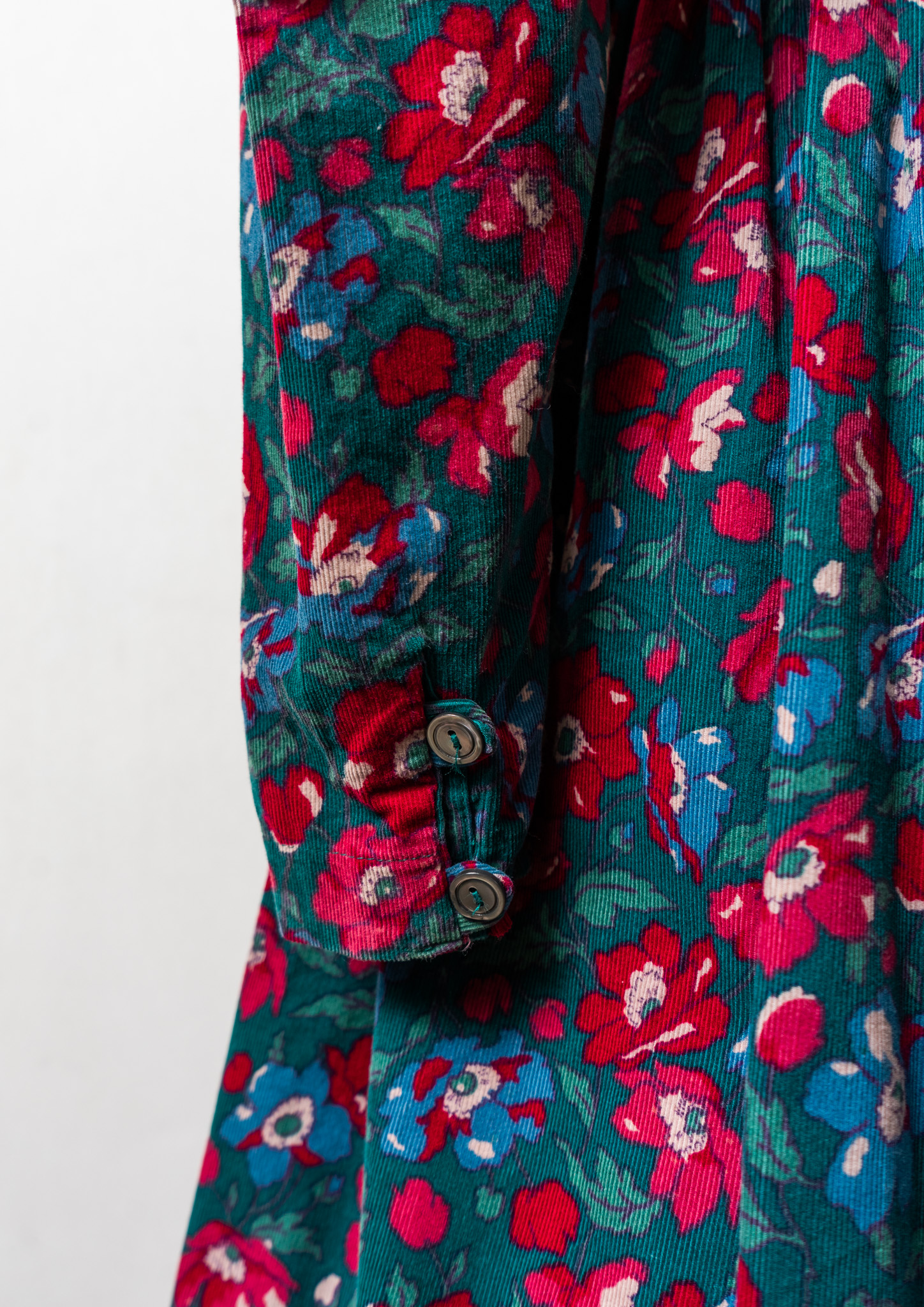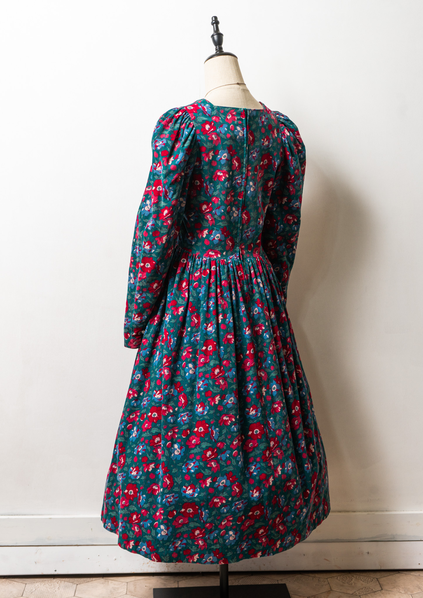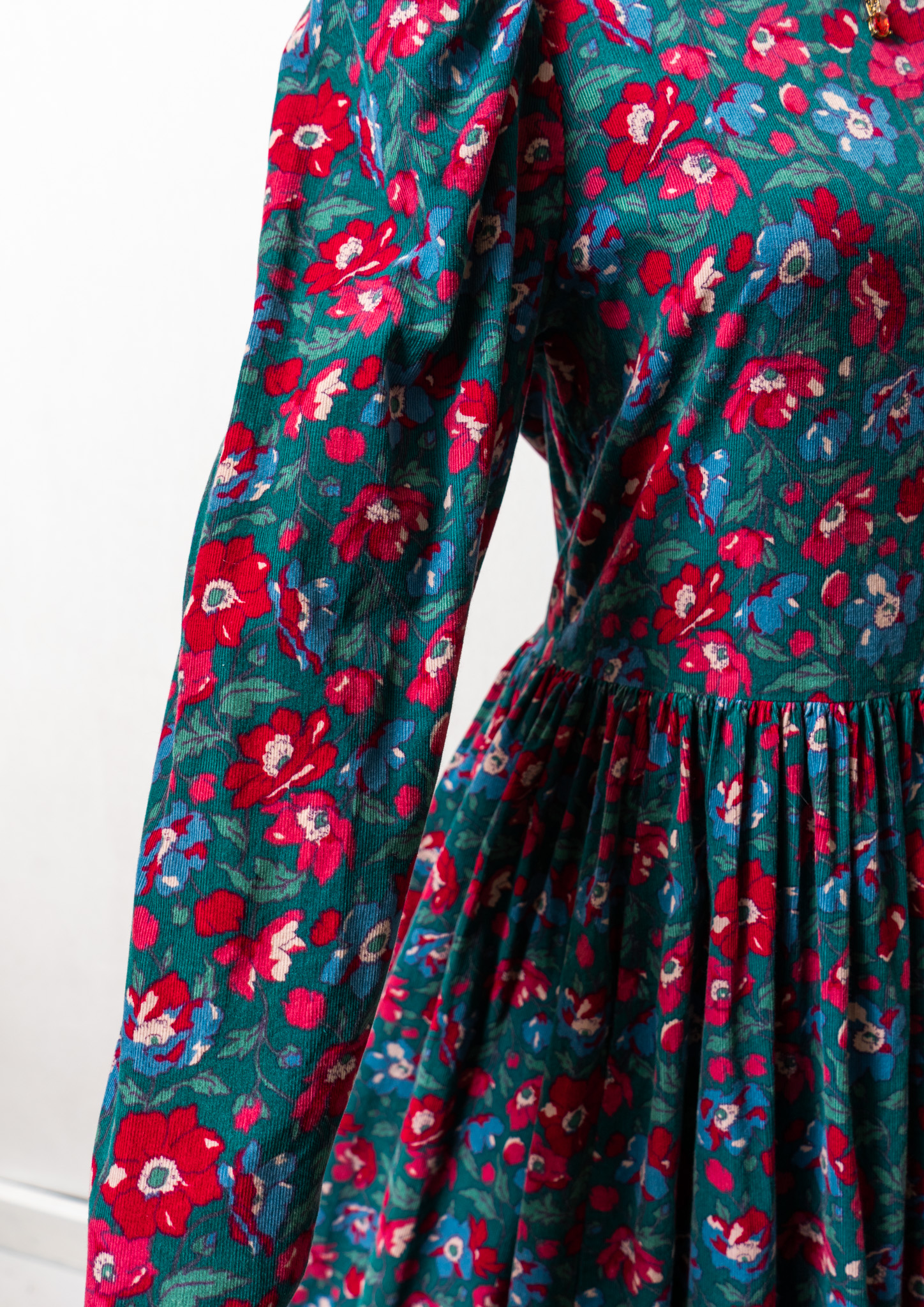 80's UK Laura Ashley Gather Design Flower Pattern Green Corduroy Dress