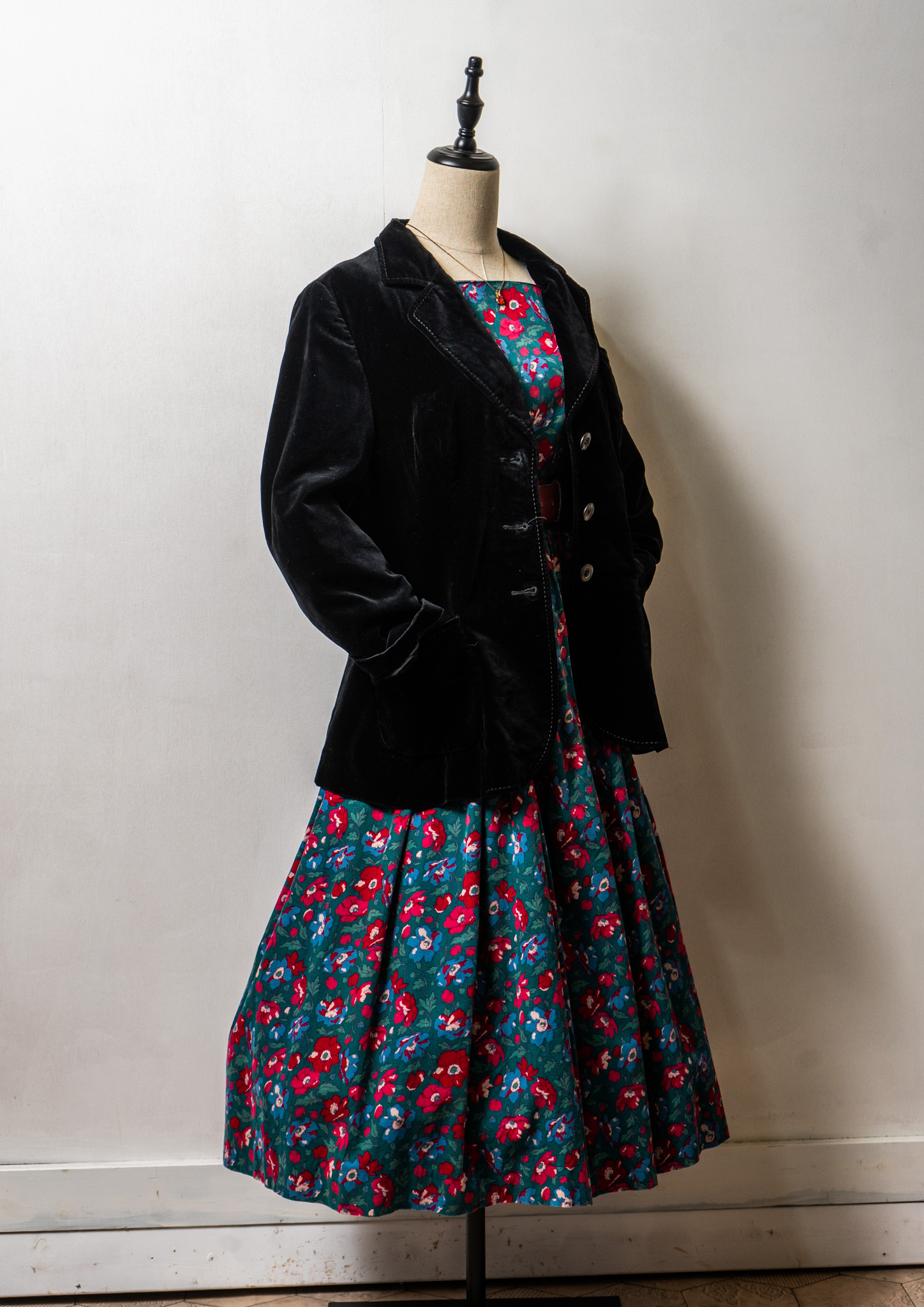 80's UK Laura Ashley Low Waist Design Flower Pattern Navy Corduroy Dress