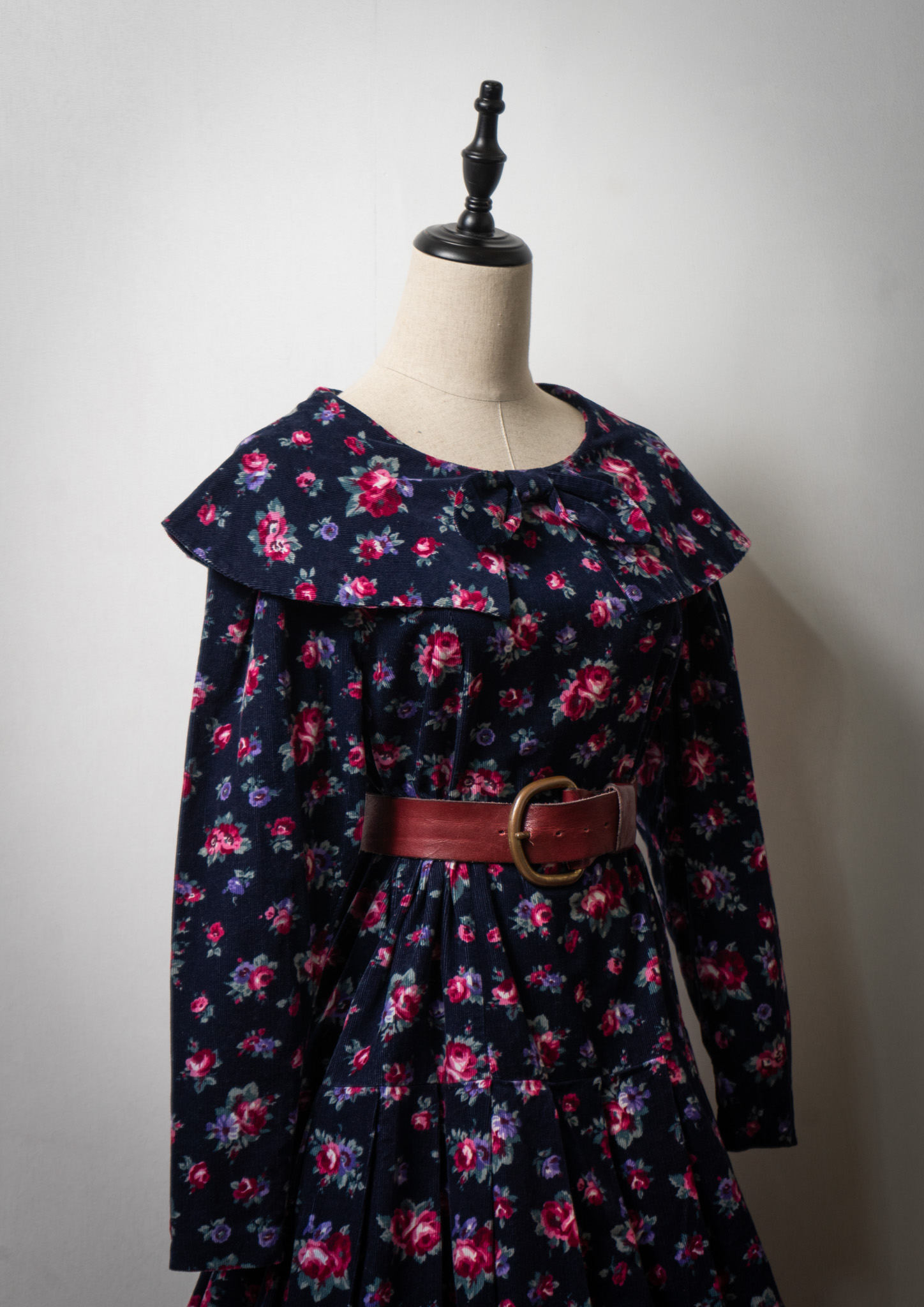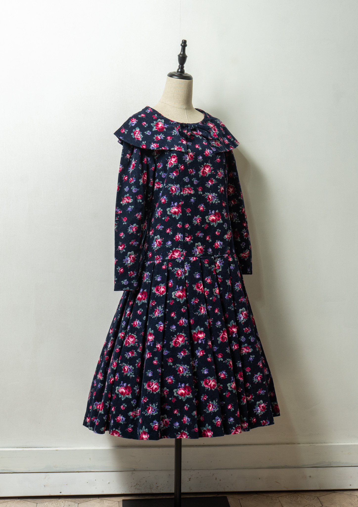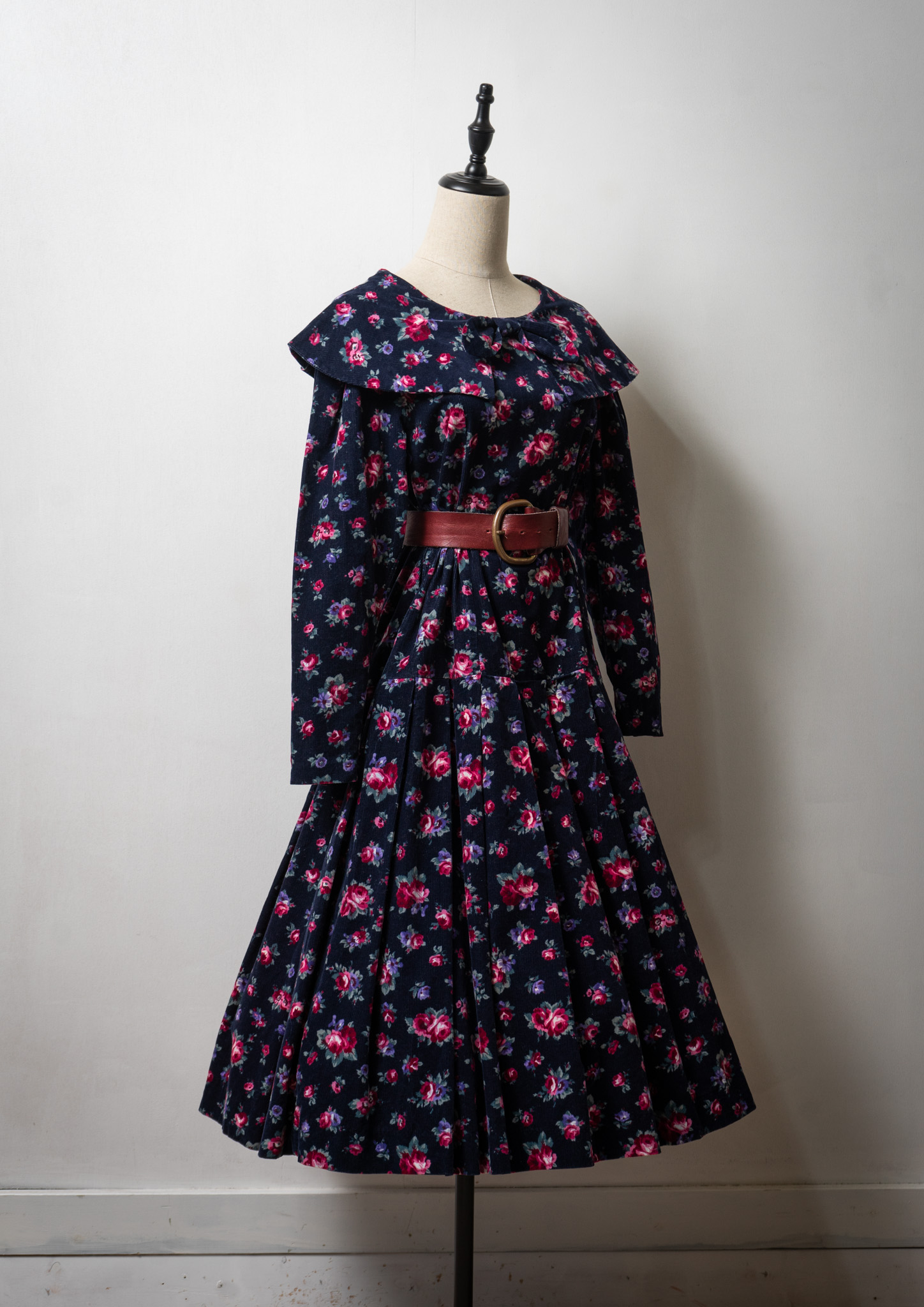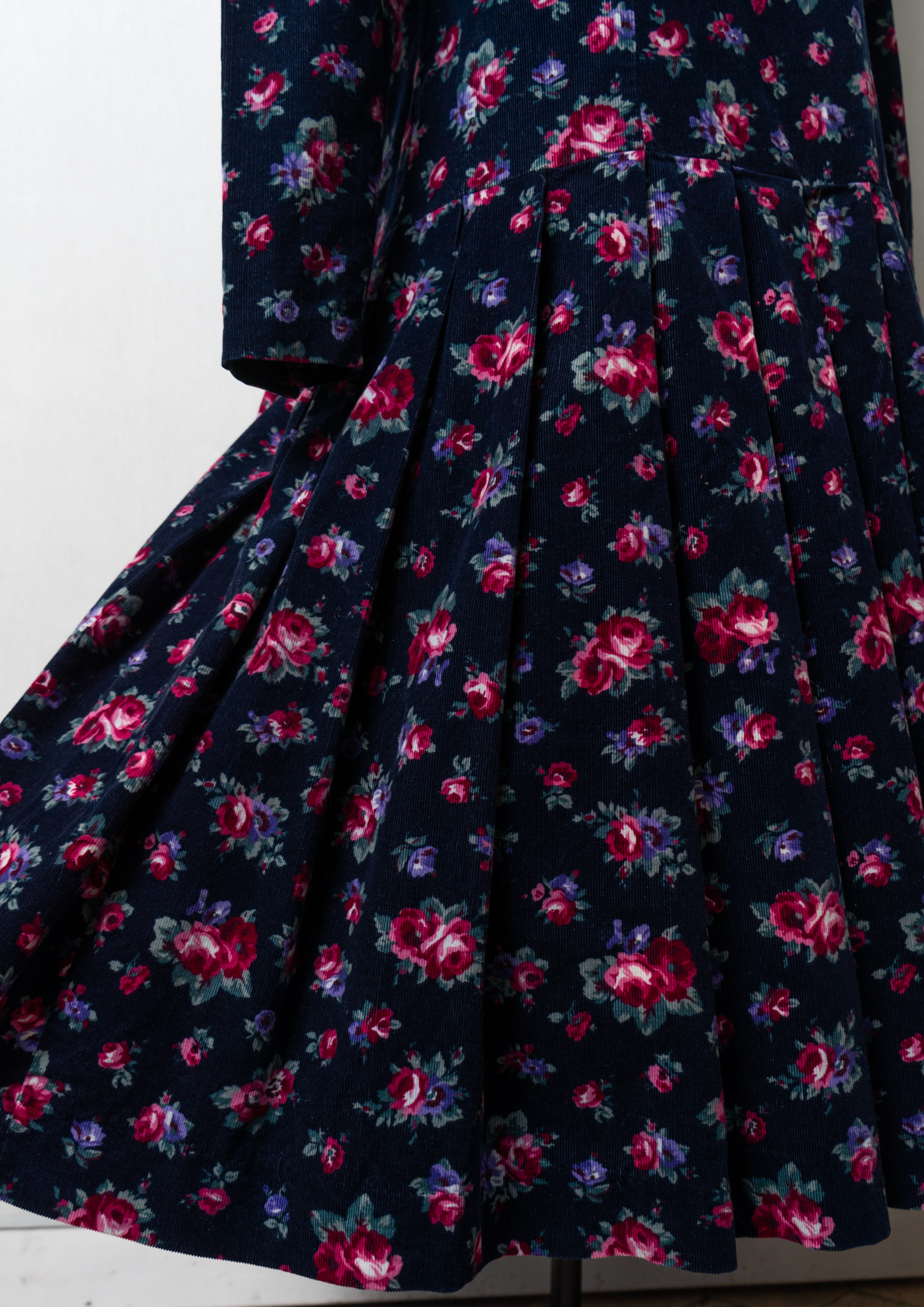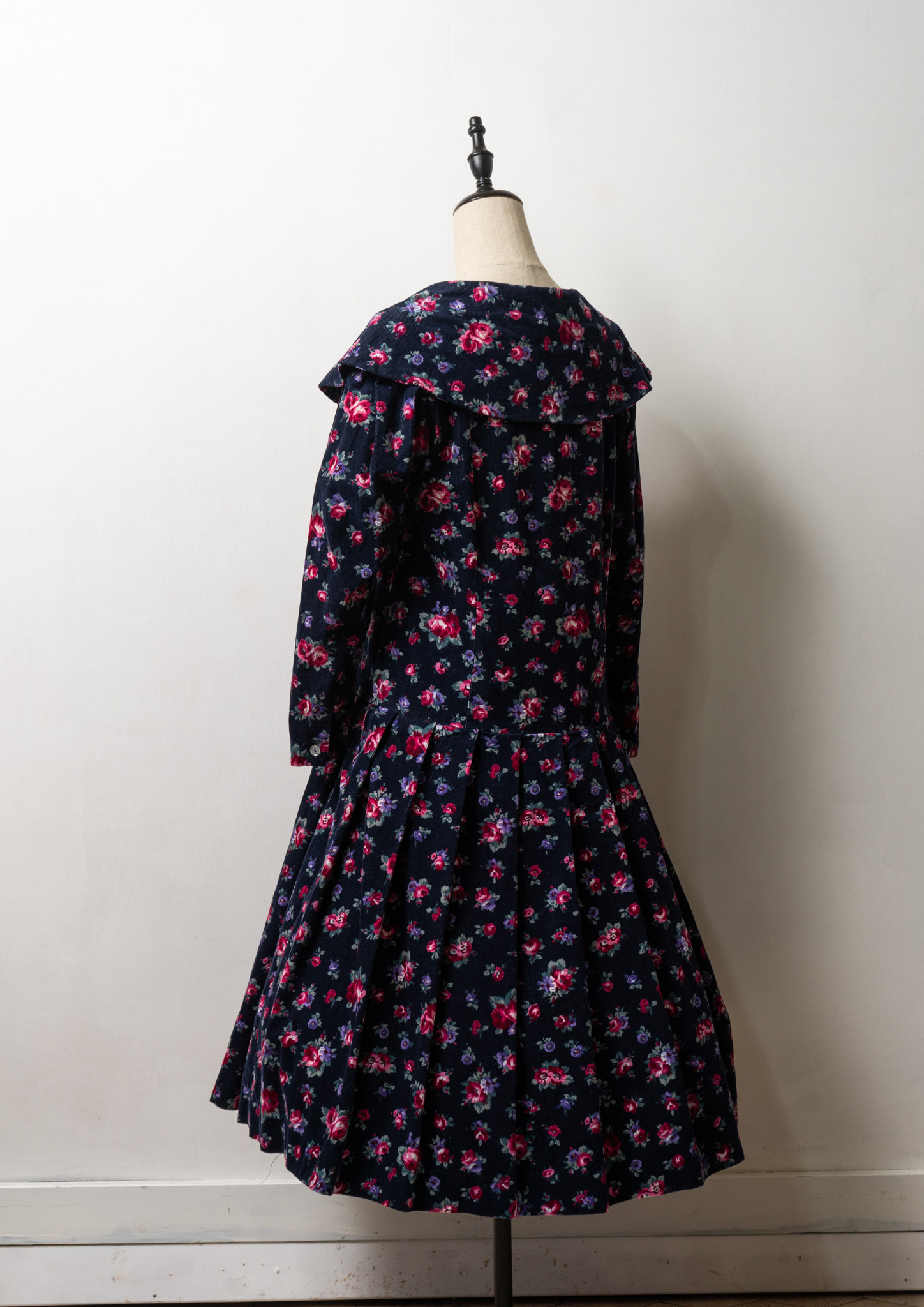 80's UK Laura Ashley Low Waist Design Flower Pattern Navy Corduroy Dress