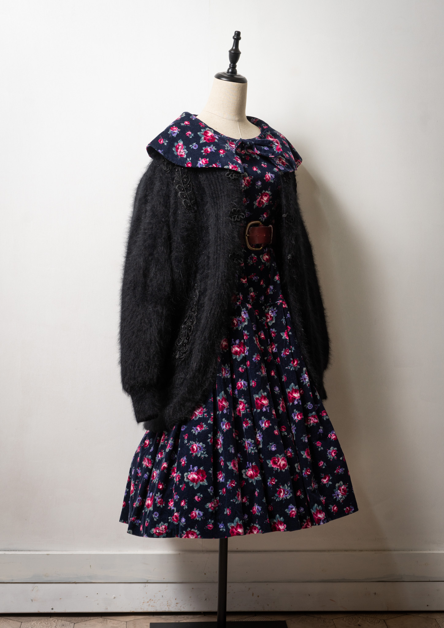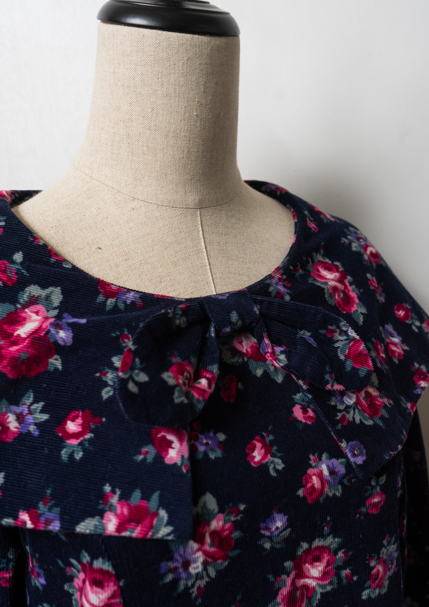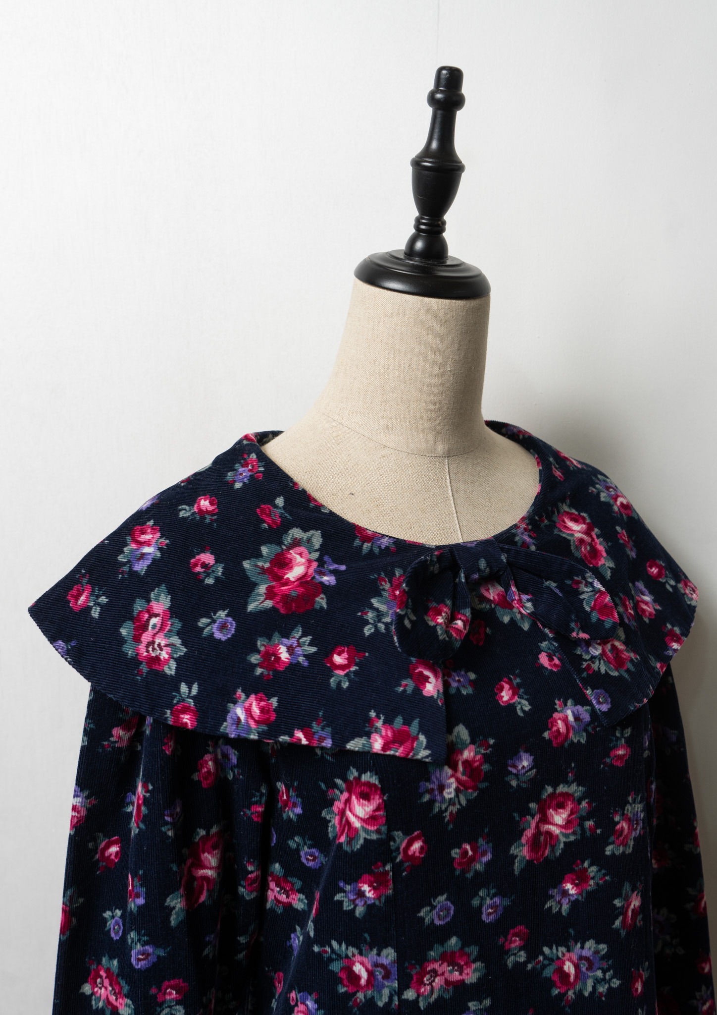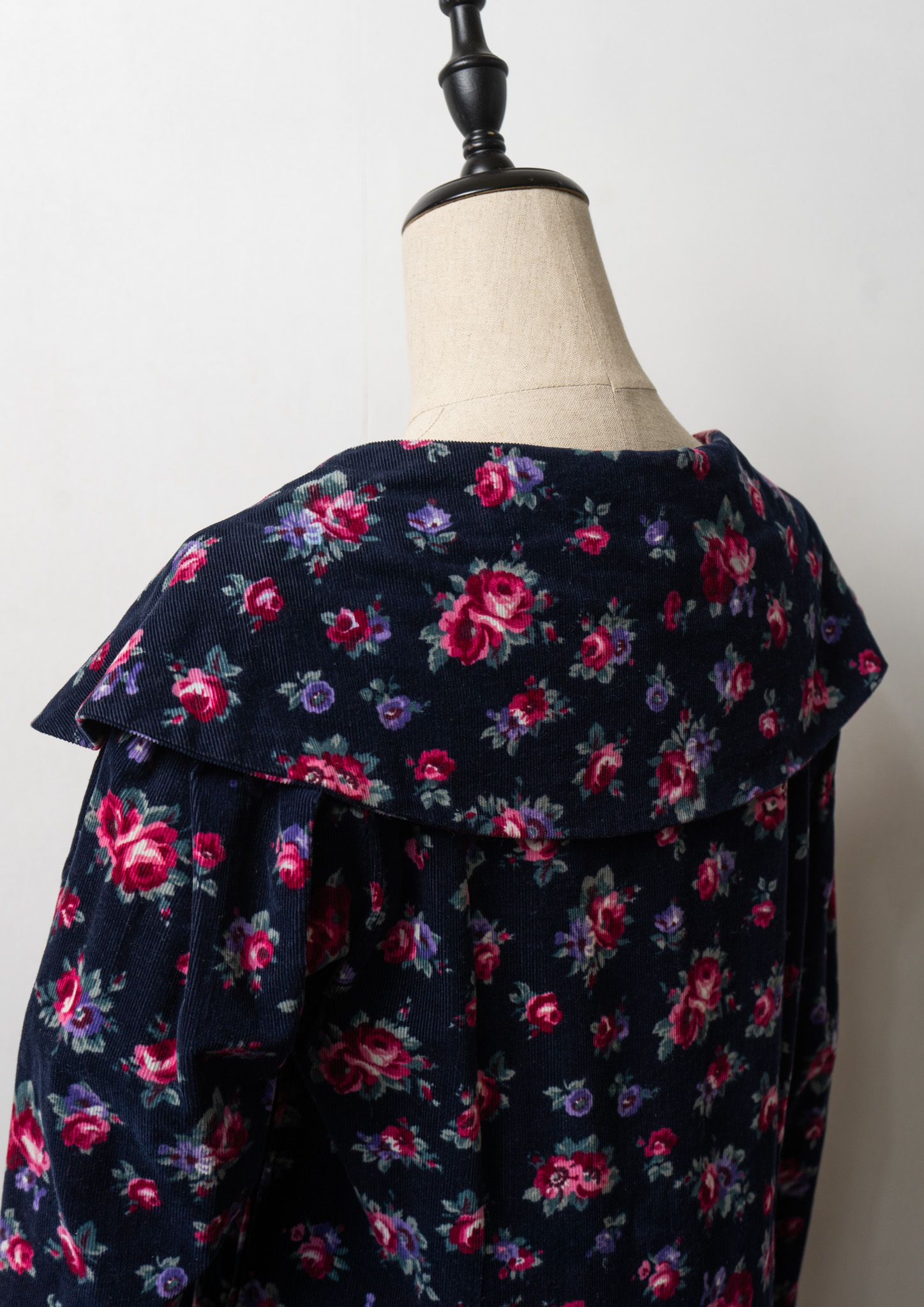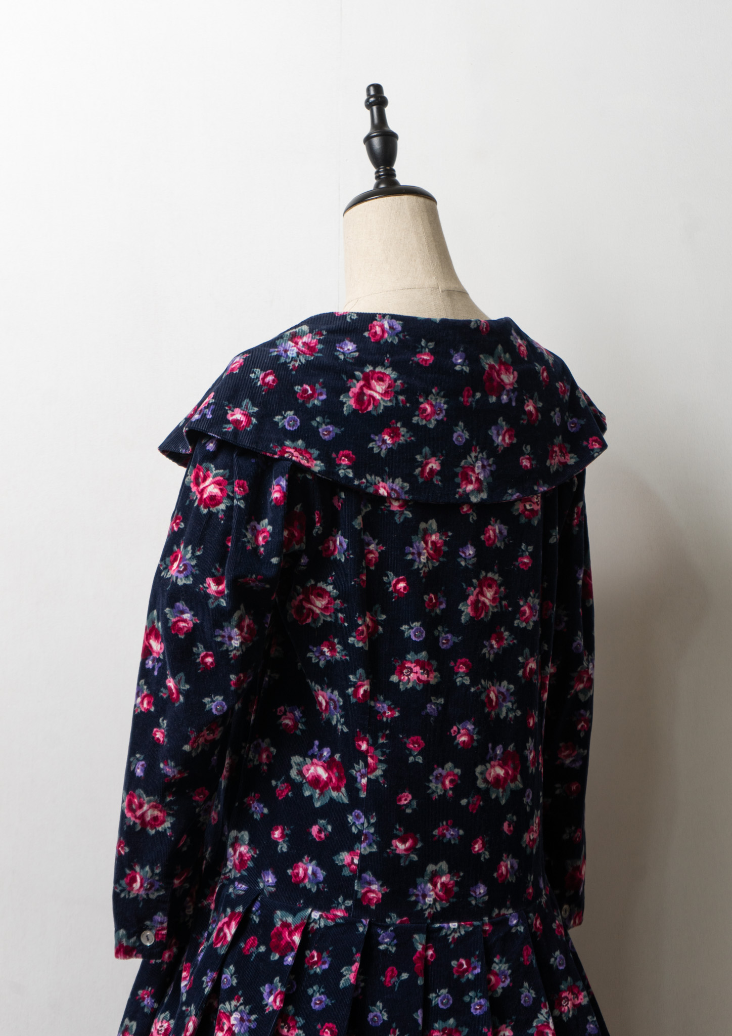 80's UK Laura Ashley Low Waist Design Flower Pattern Navy Corduroy Dress