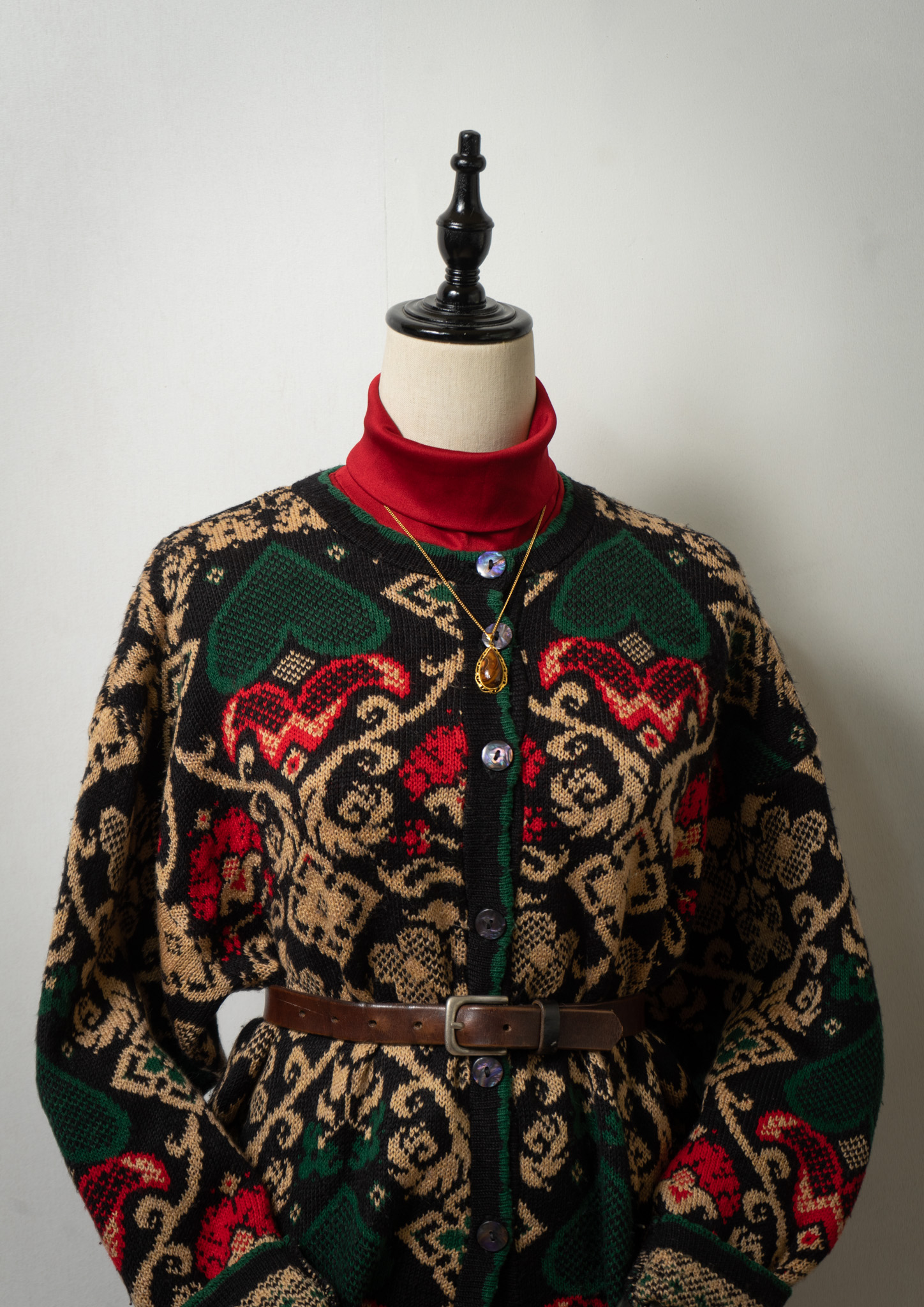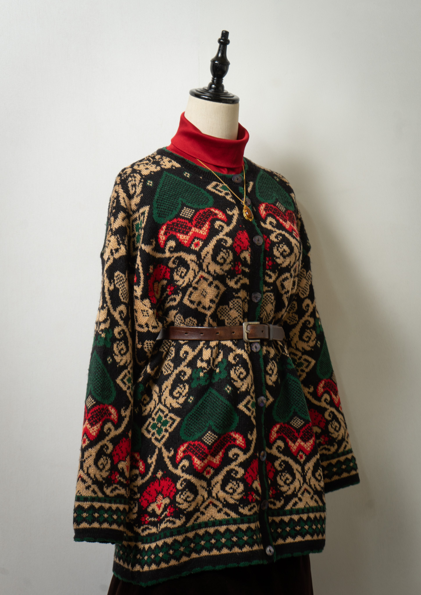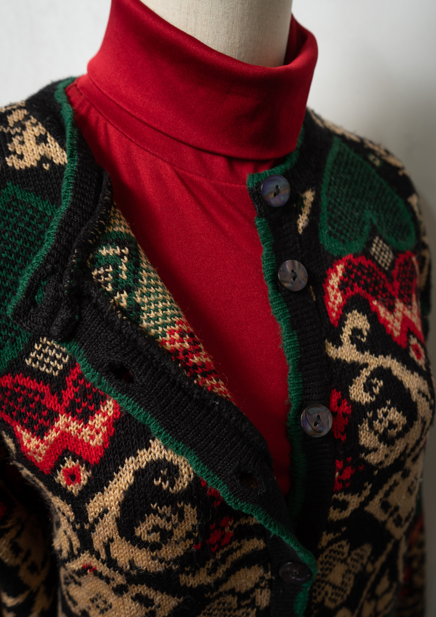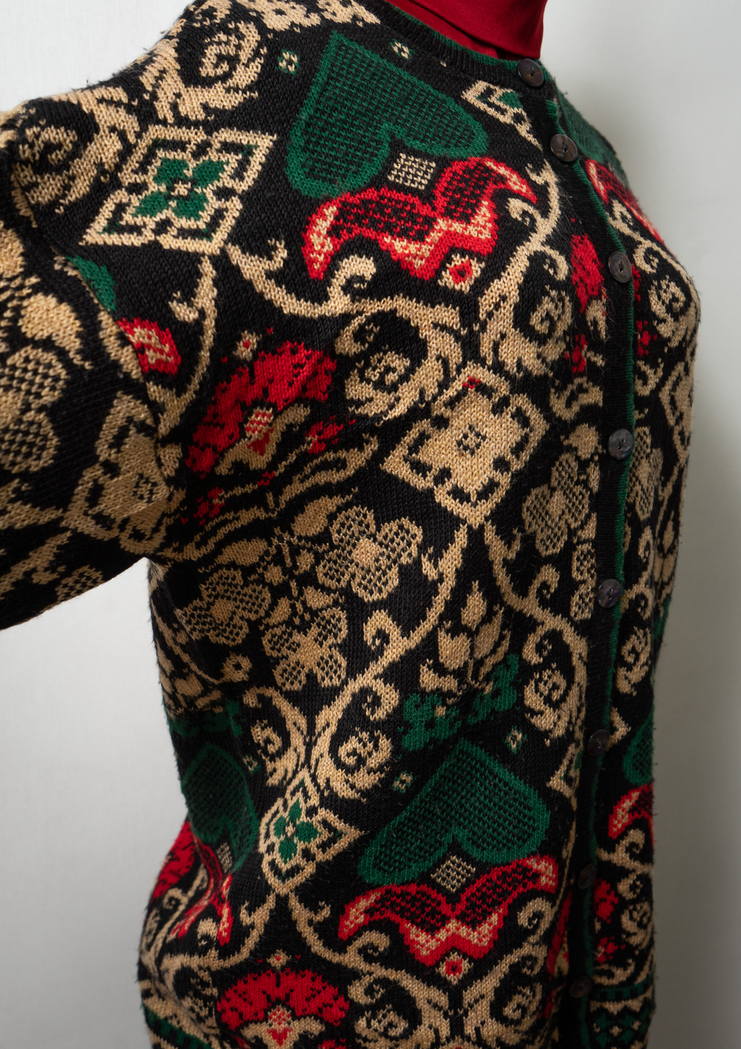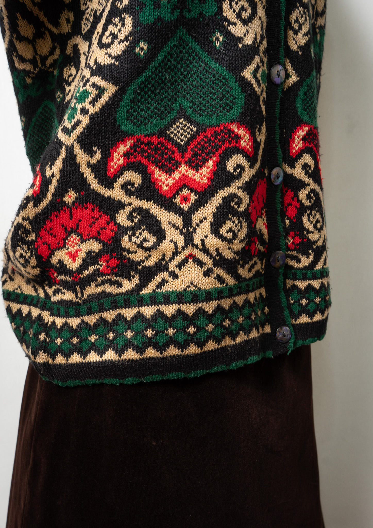 80~90's England Heart Damask Pattern Black Knit Cardigan