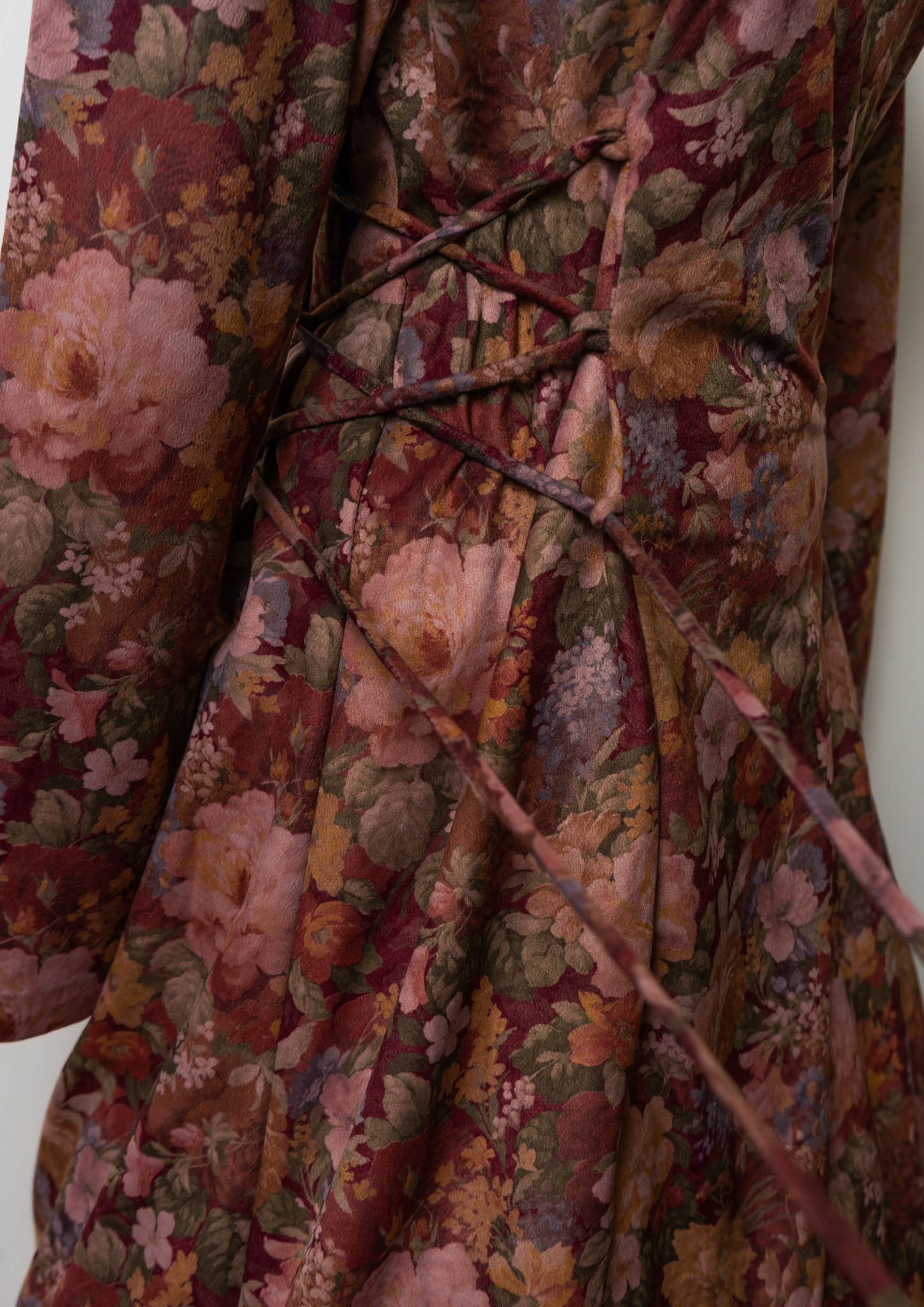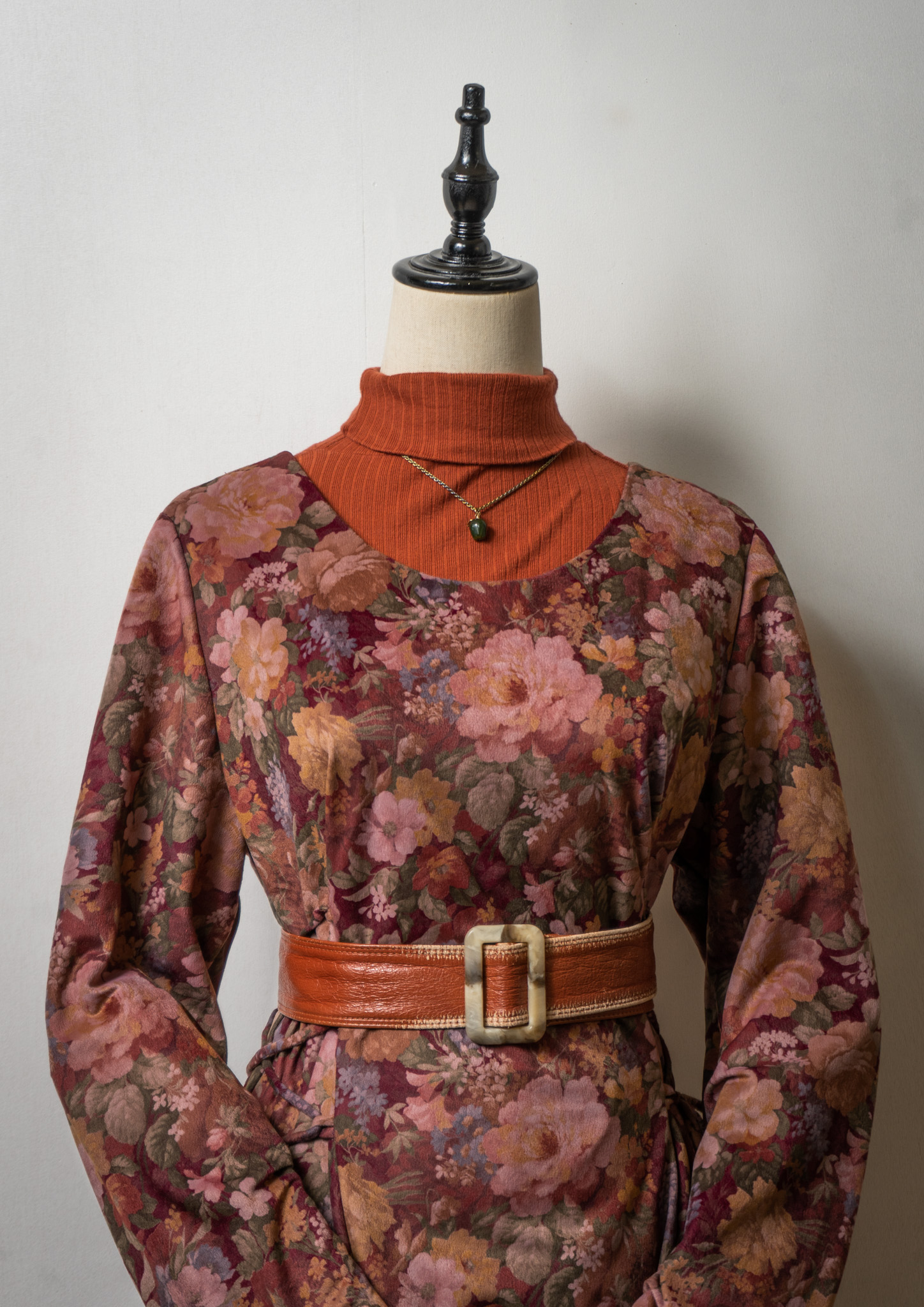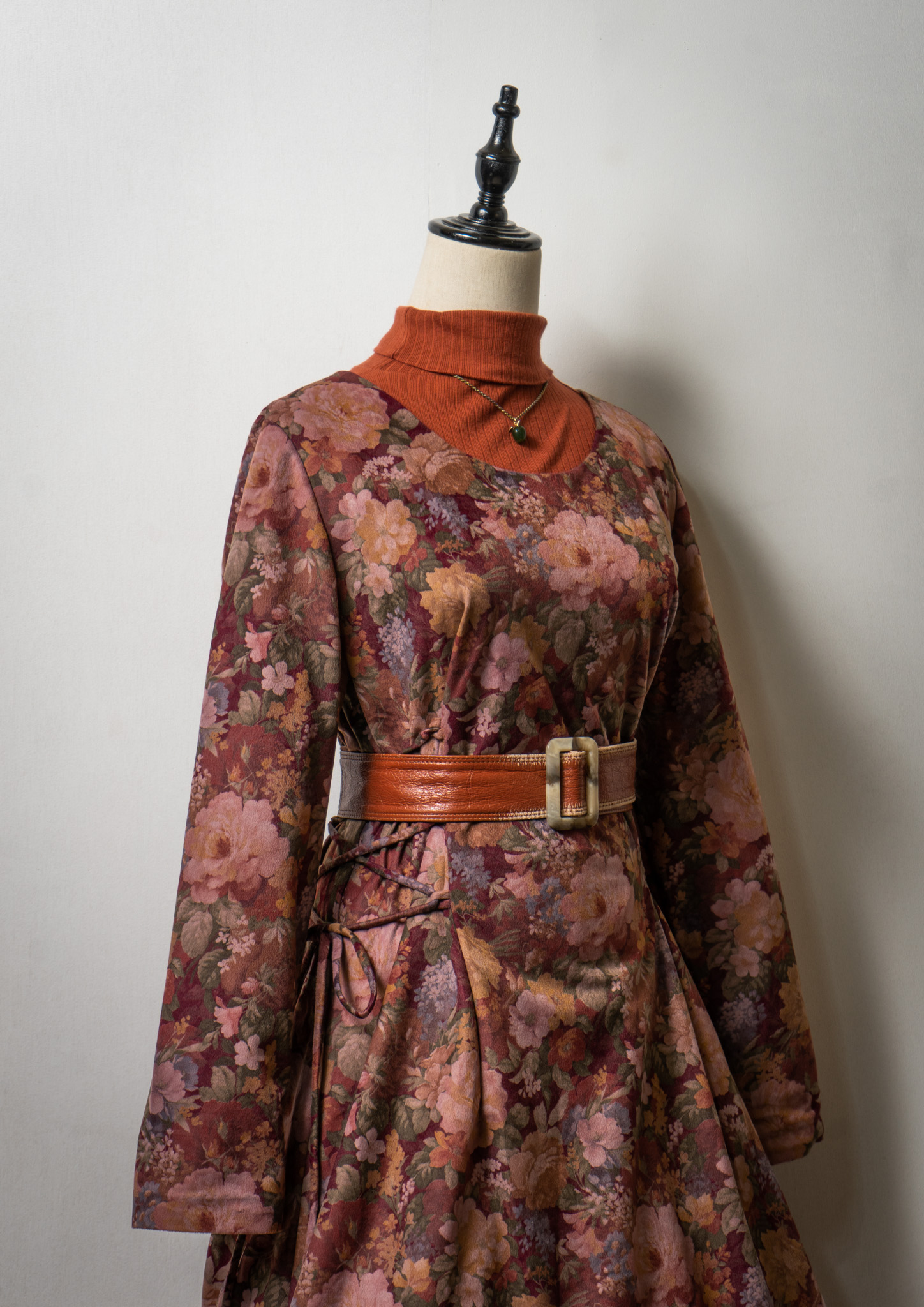 70~80's Hand Made Lace up Design Flower Pattern Dress