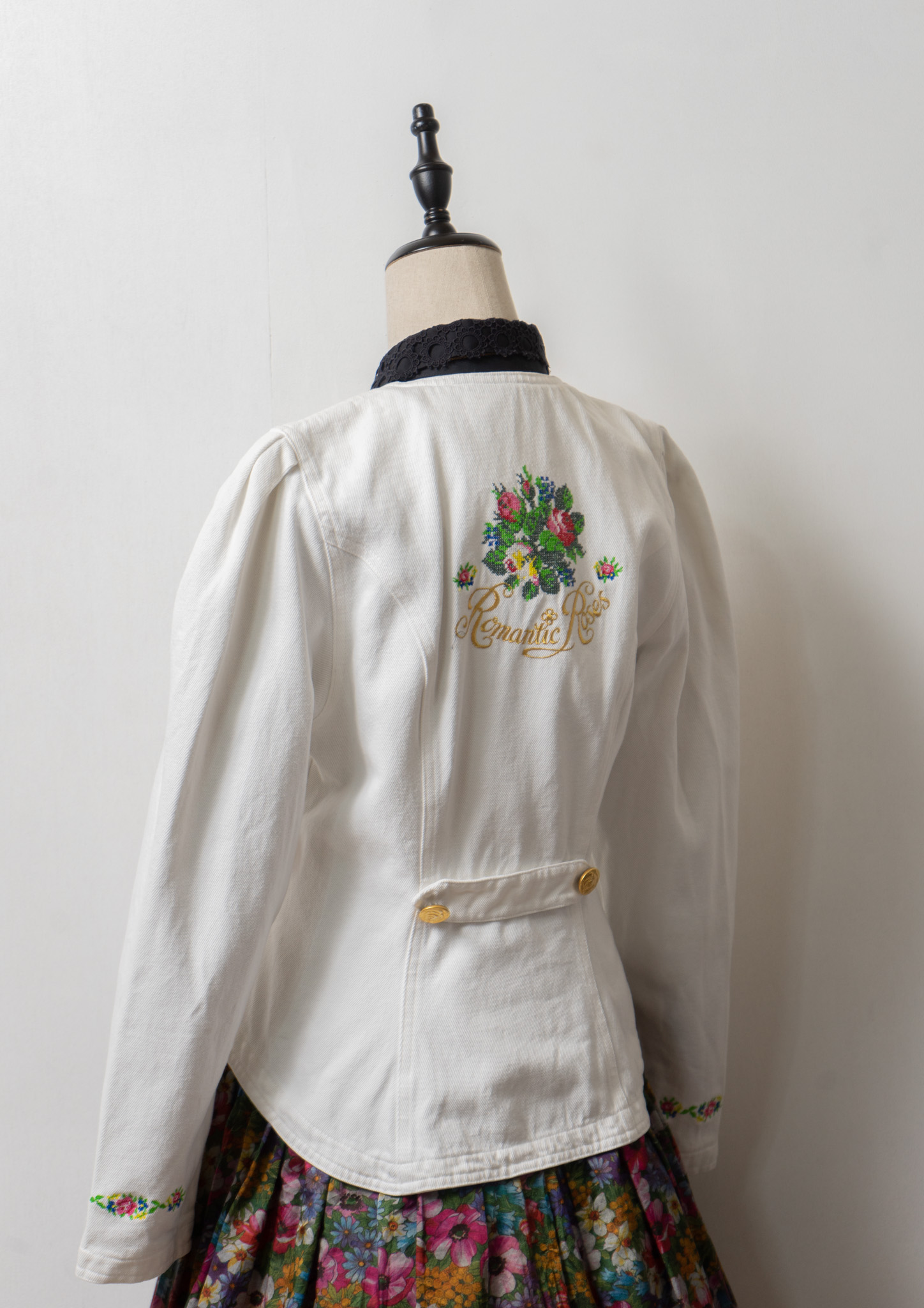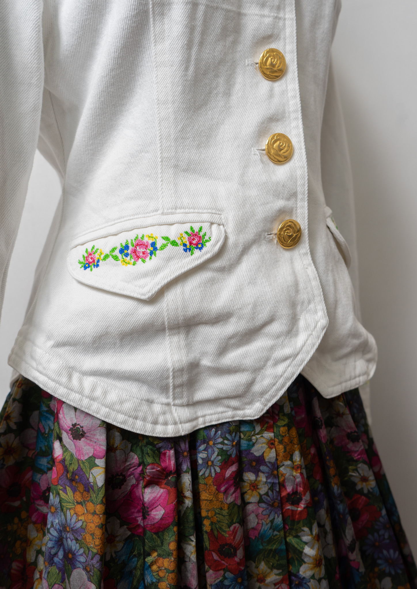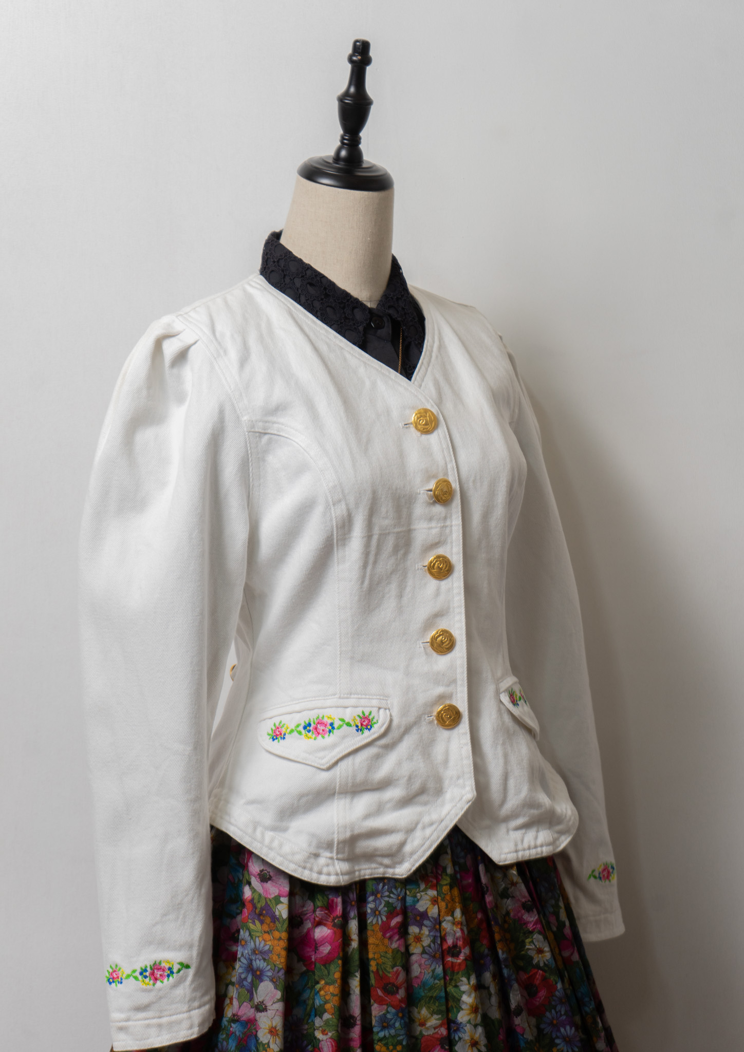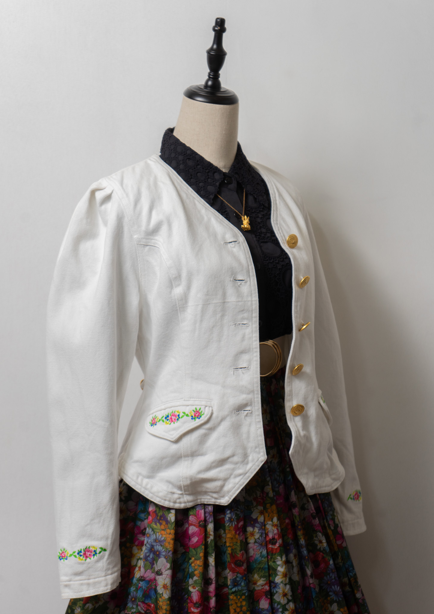 90's Swizerland Gold Rose Button Cross Stitch Like Rose Pattern White Jacket