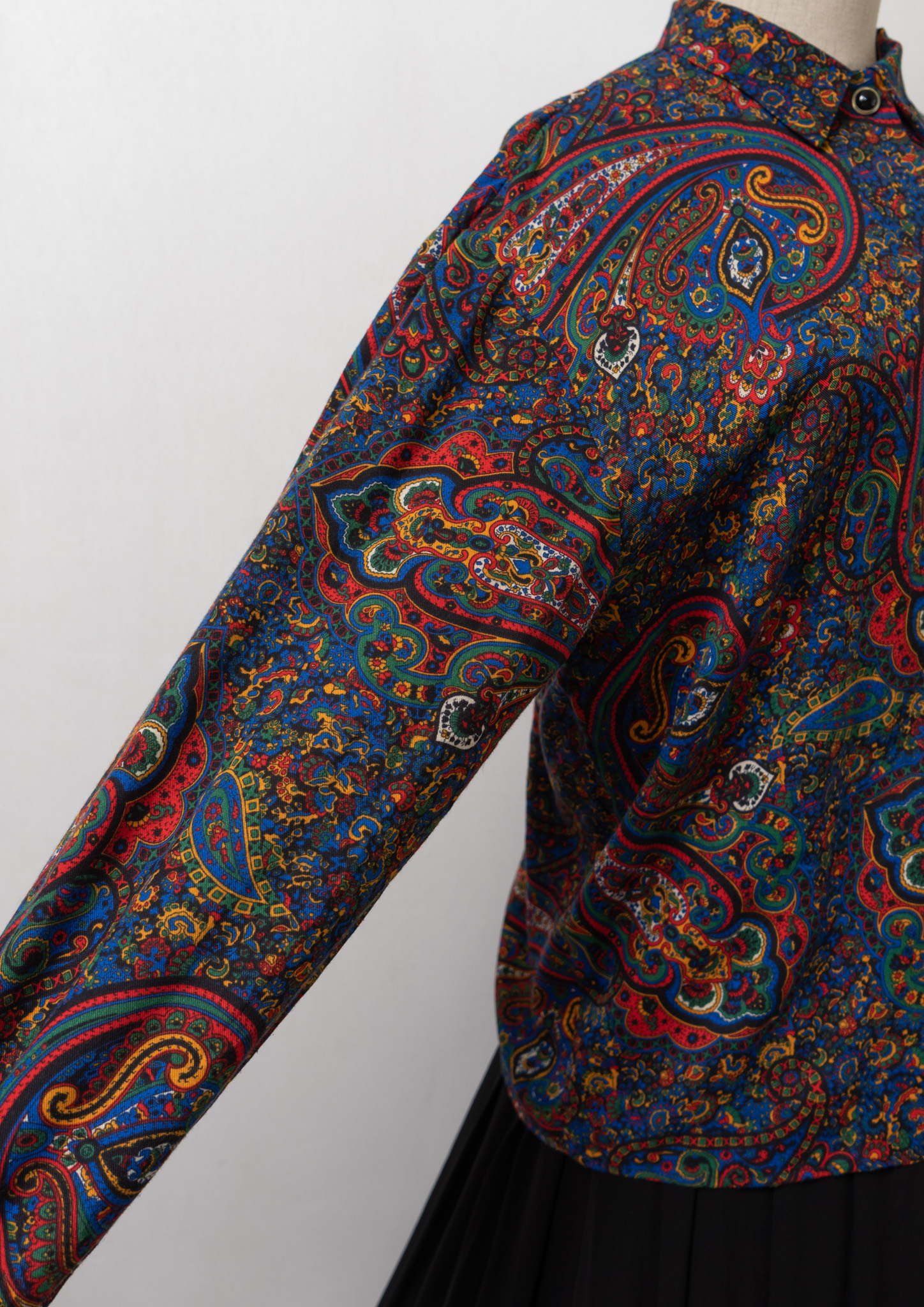 80's Paisley Flower Pattern Tuck Design Stand Neck Tops