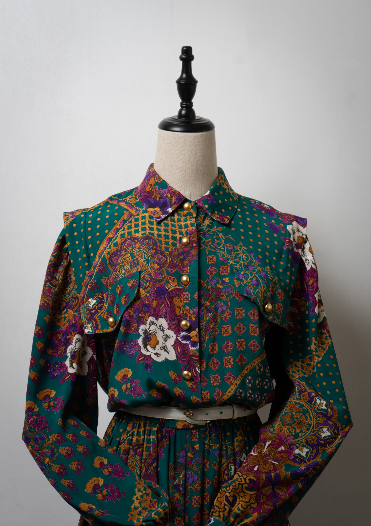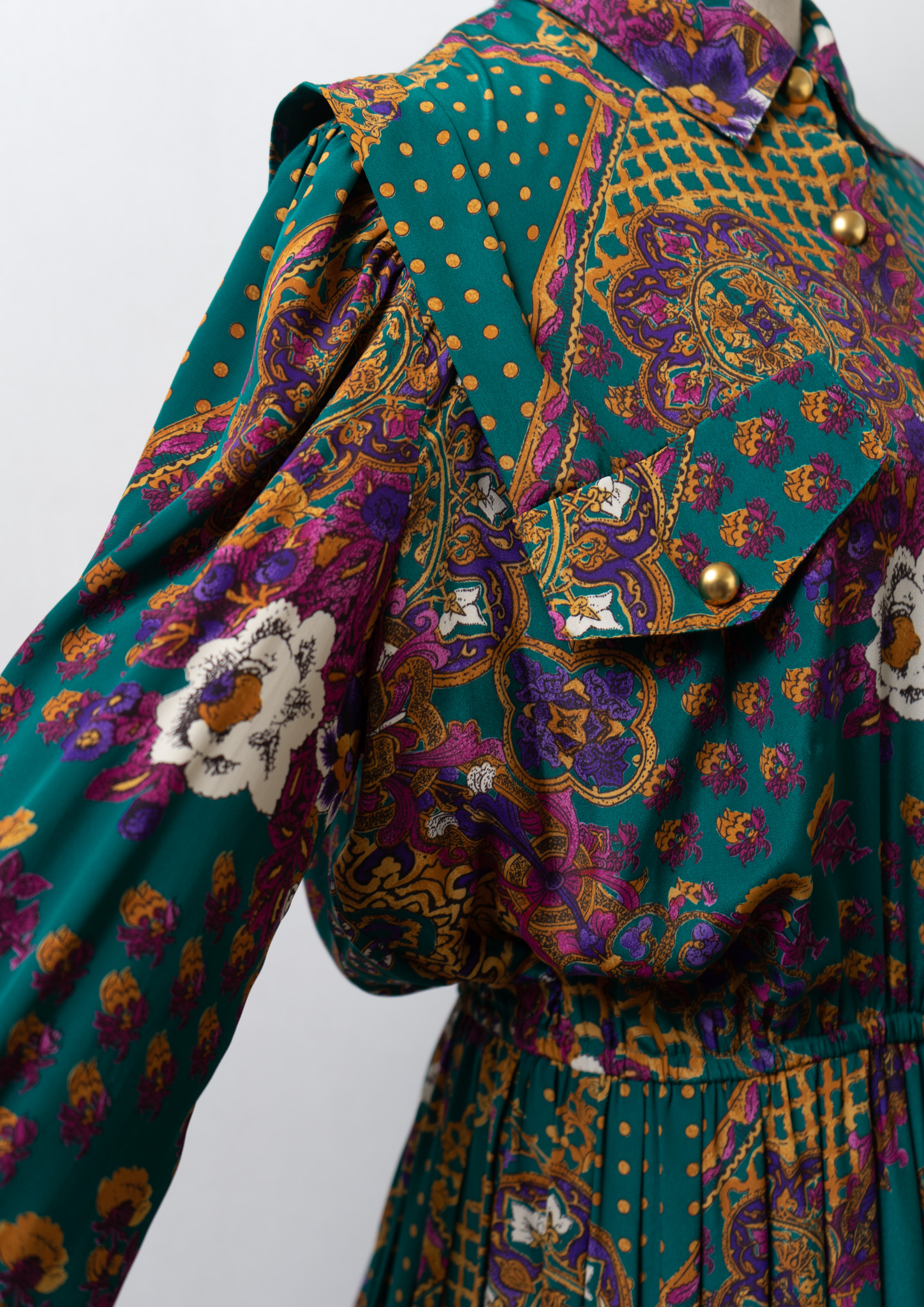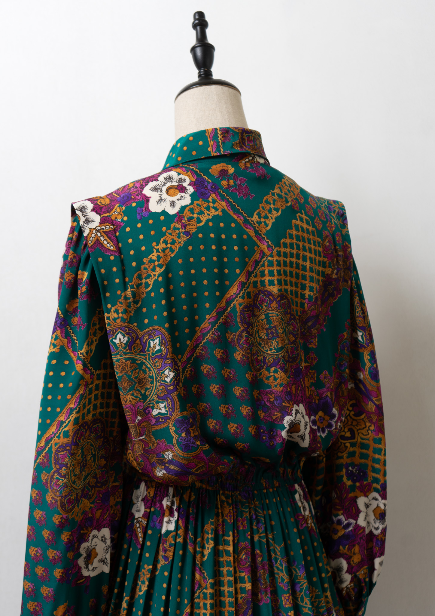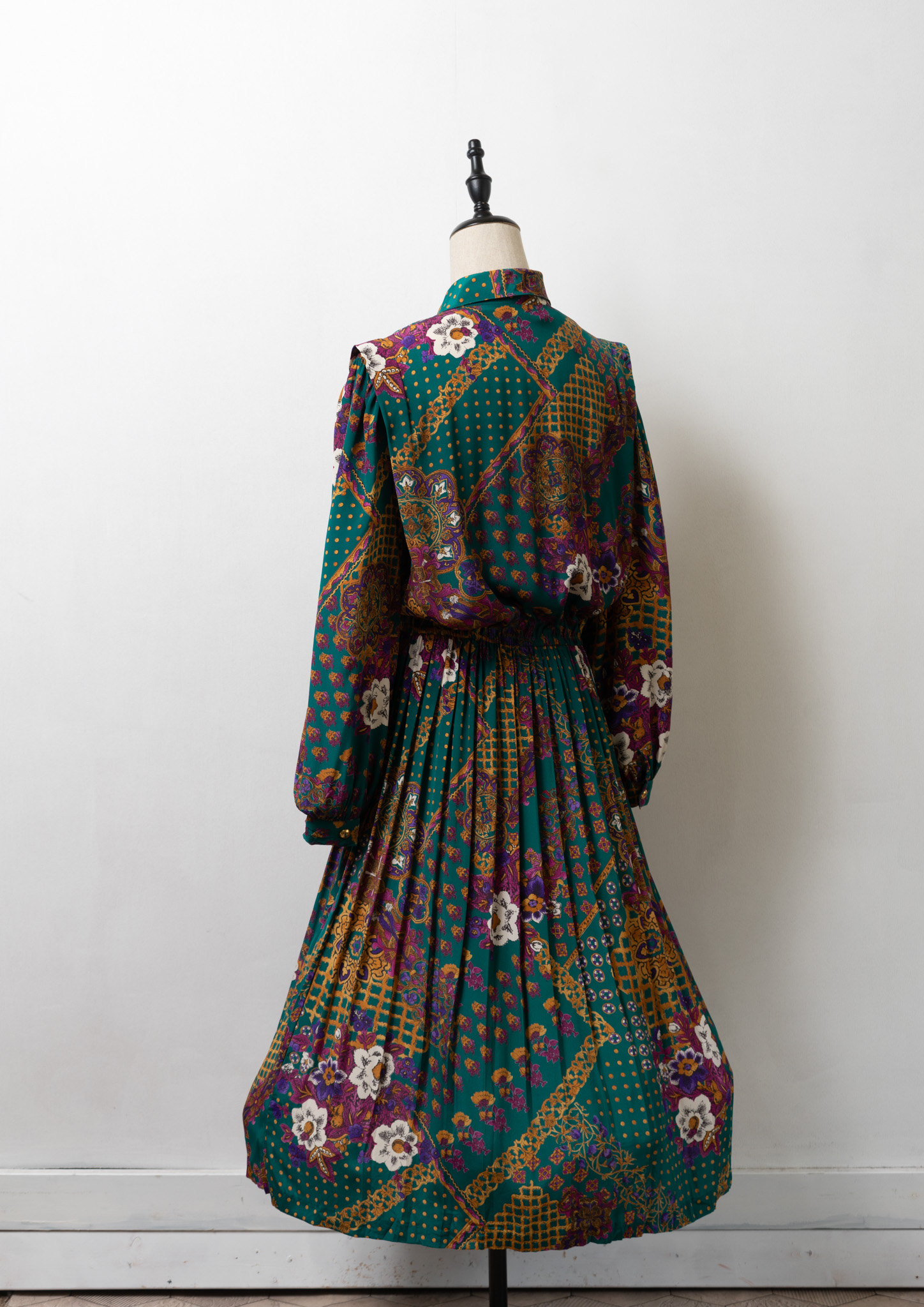 80~90's LESLIE FAY Mixd Scarf Pattern Pleats Design Green Dress