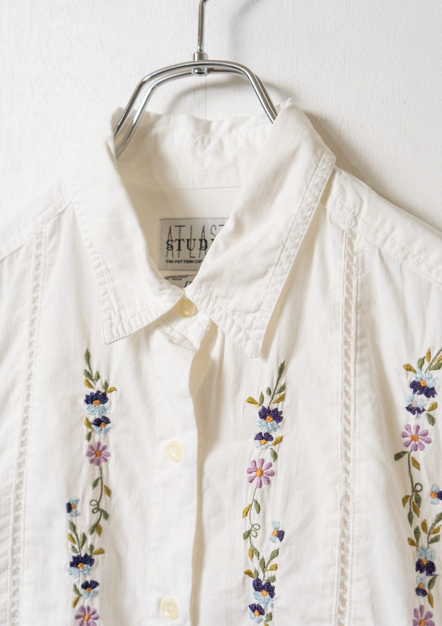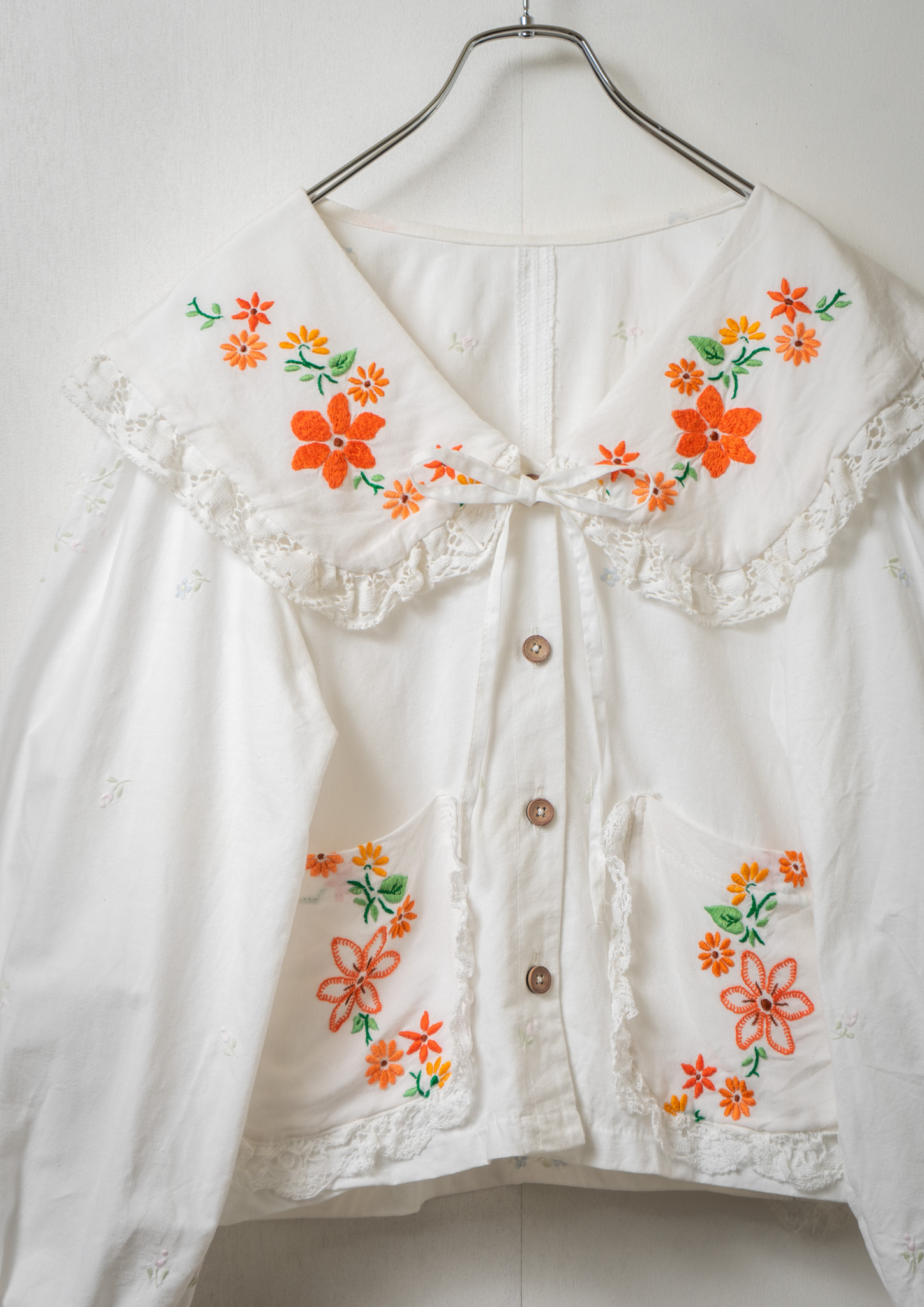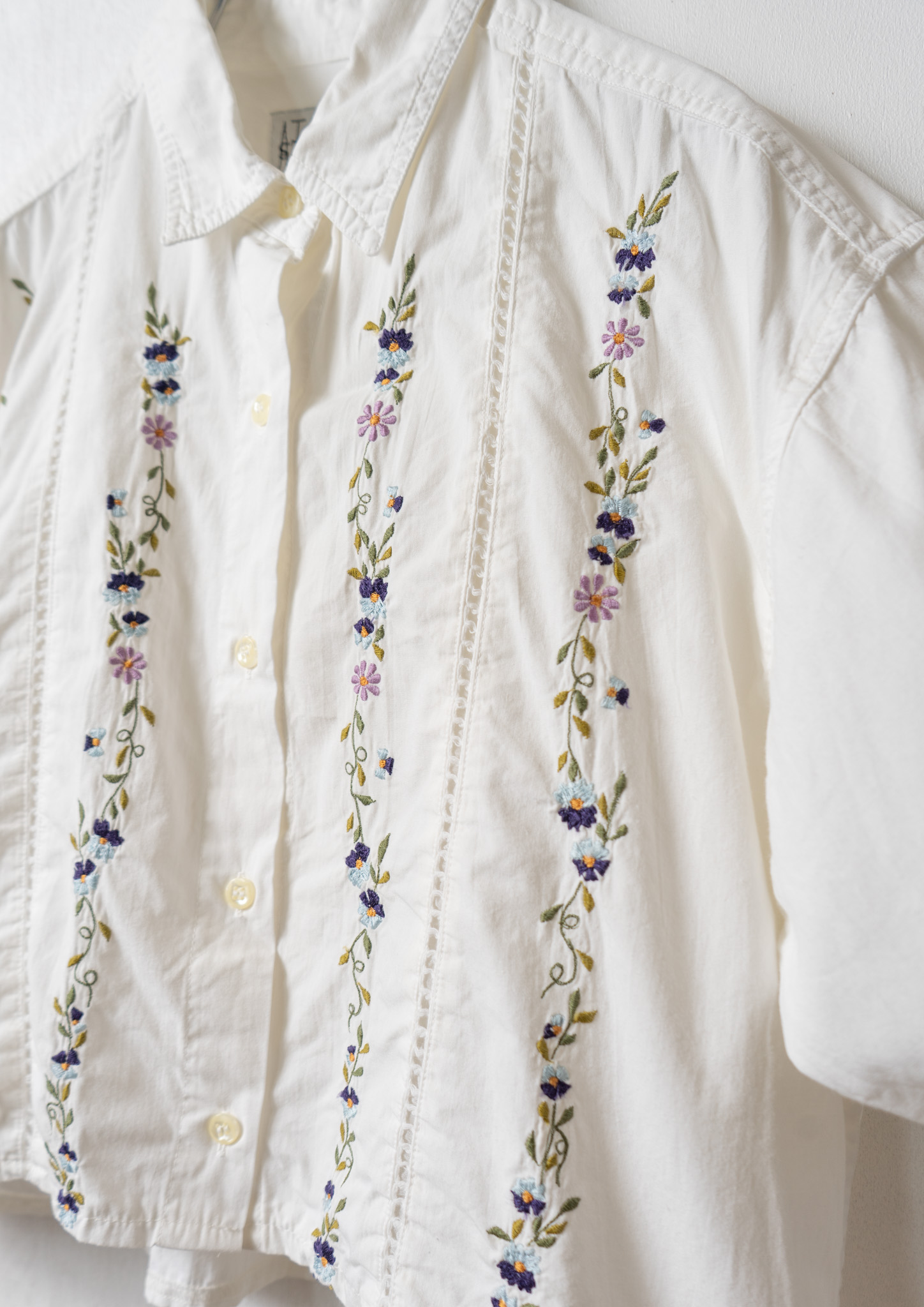 Upcycle Flower Embroidery Big Collar White Blouse