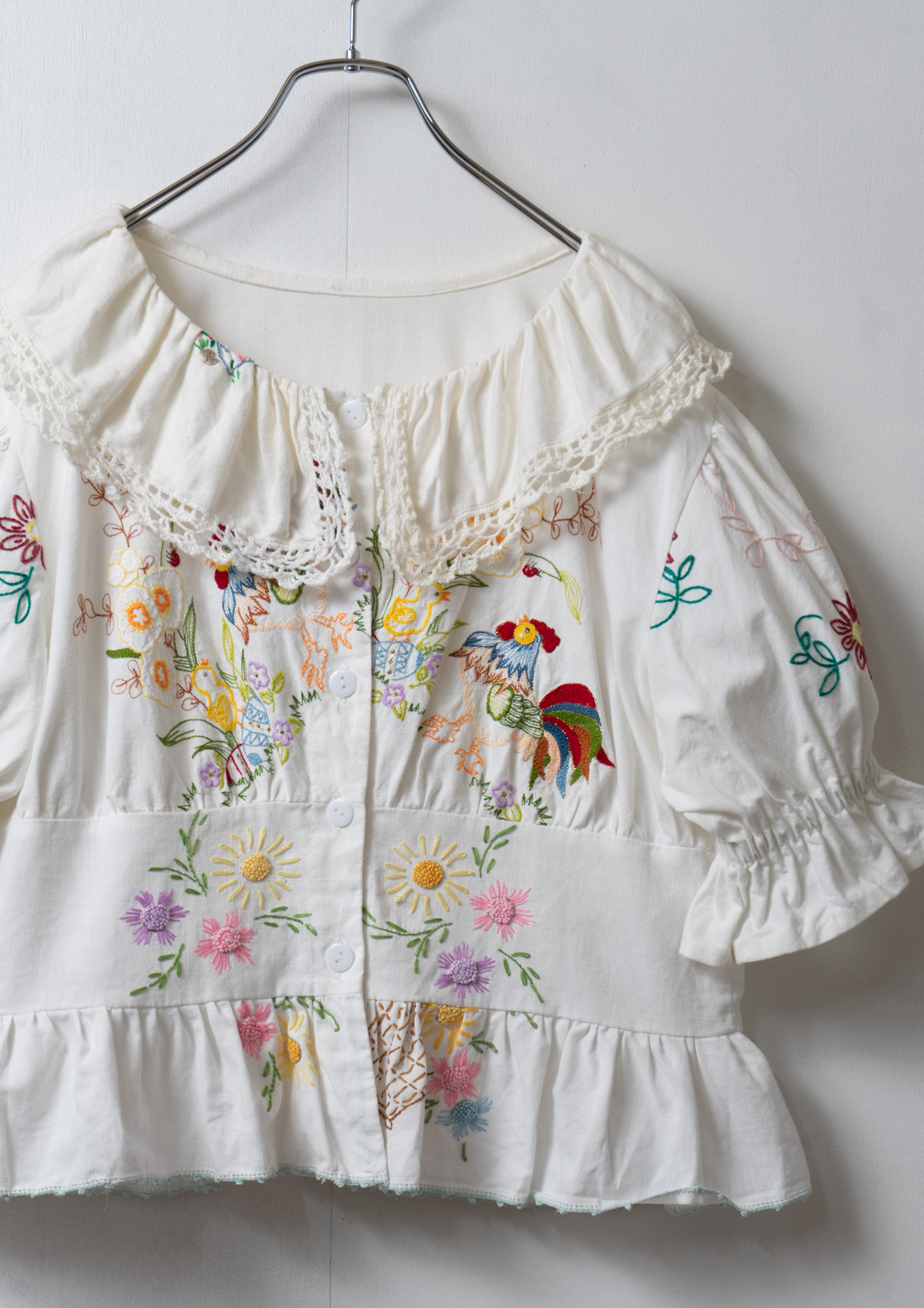 Upcycle Bird × Flower Embroidery Lace Collar White Blouse
