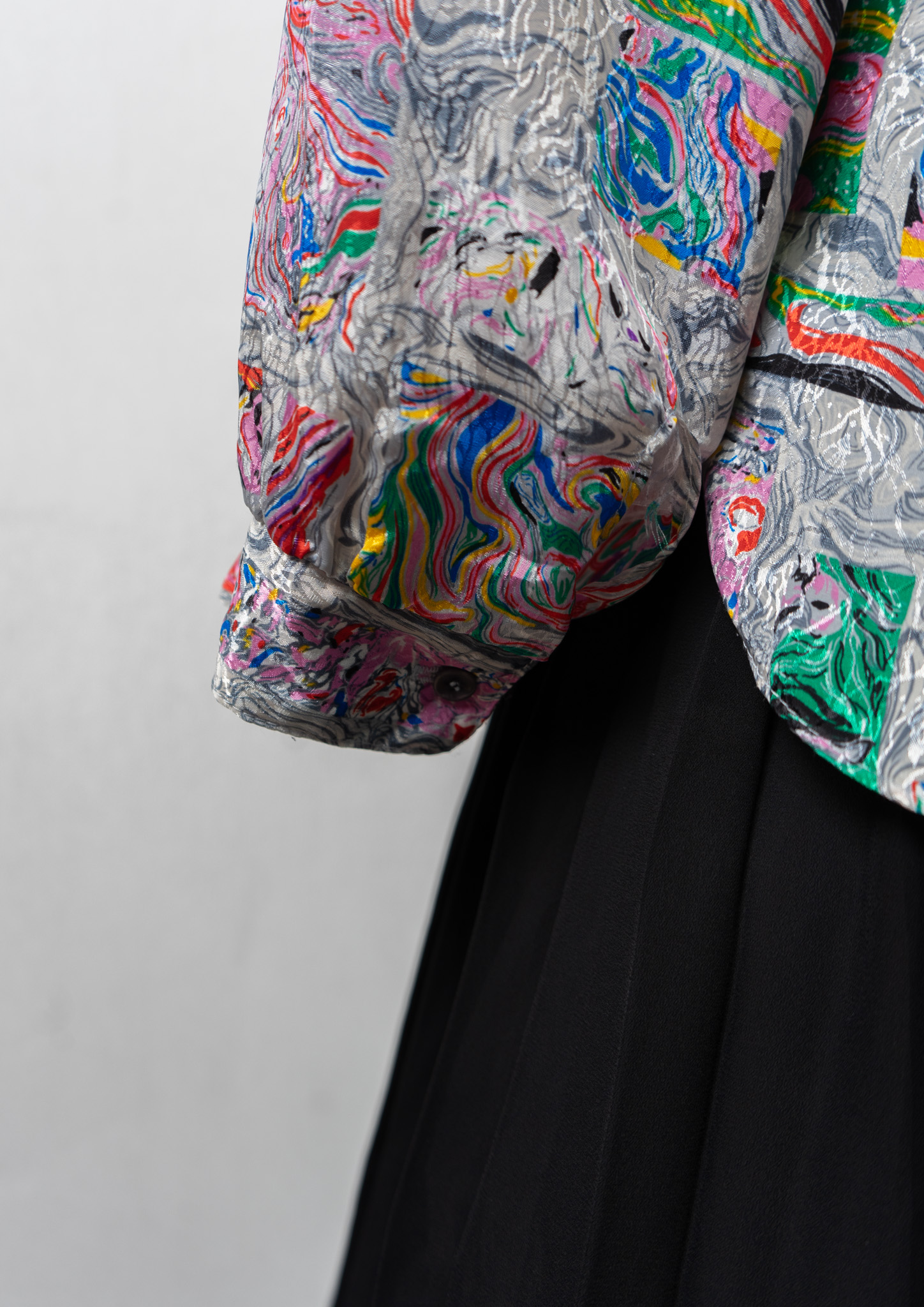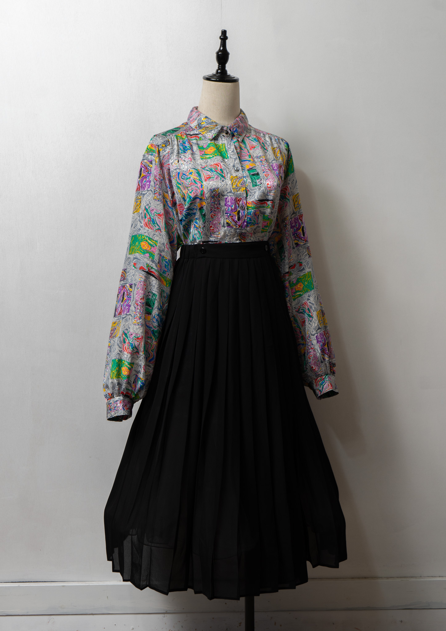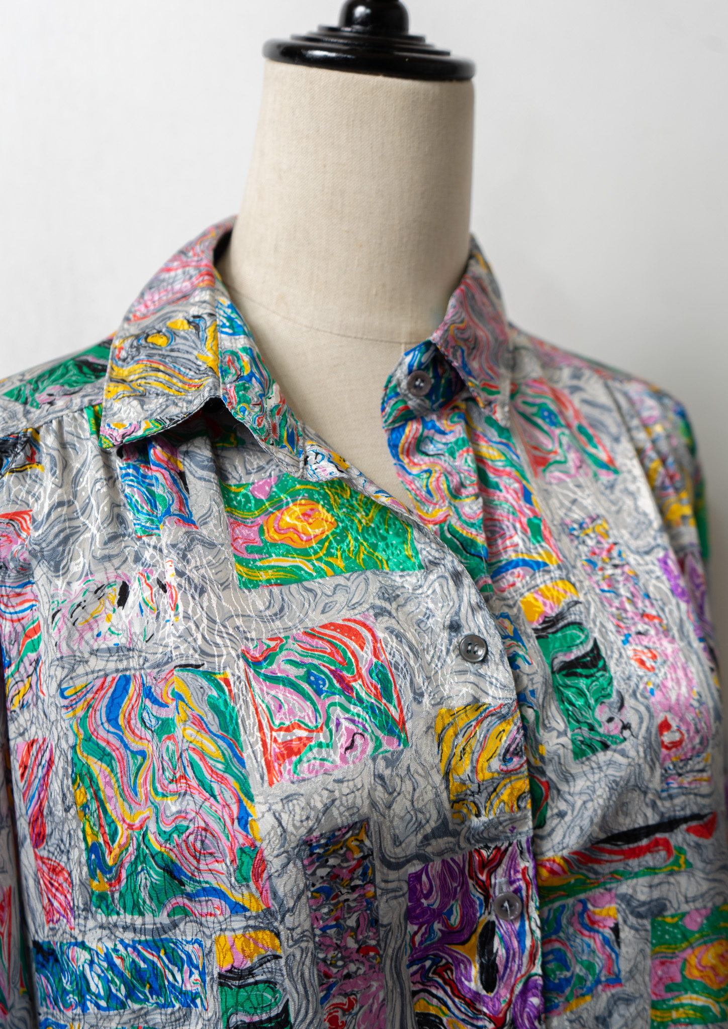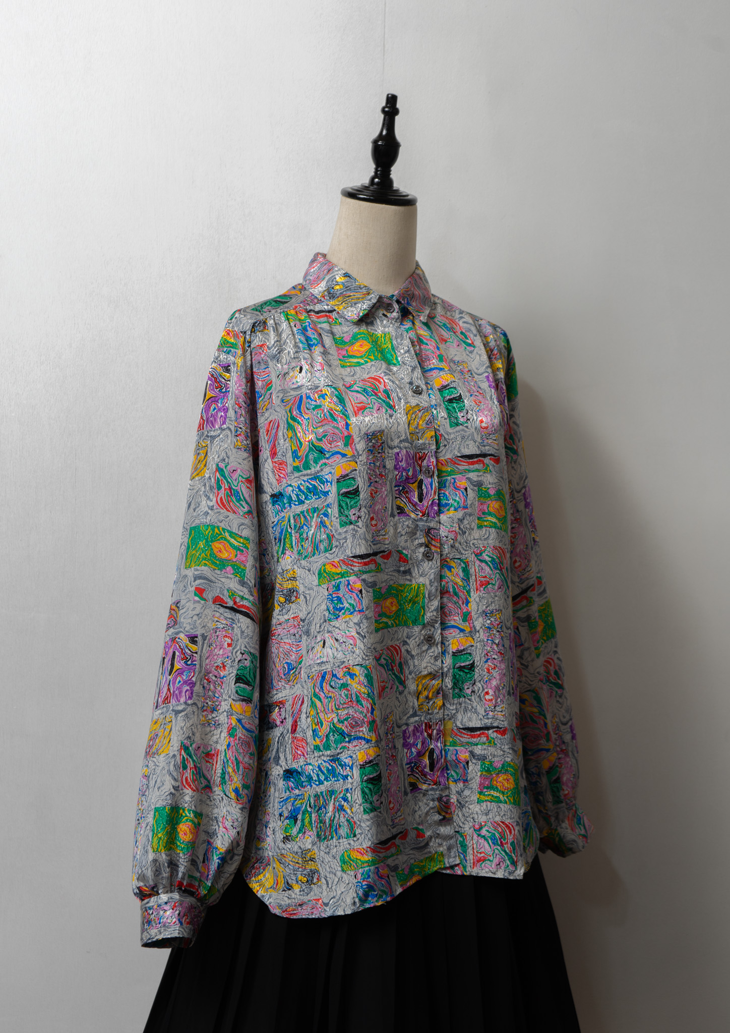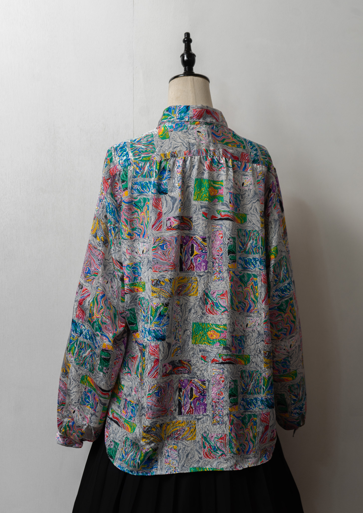 80's USA LESLIE FAY Unique Art Pattern Glossy Blouse
