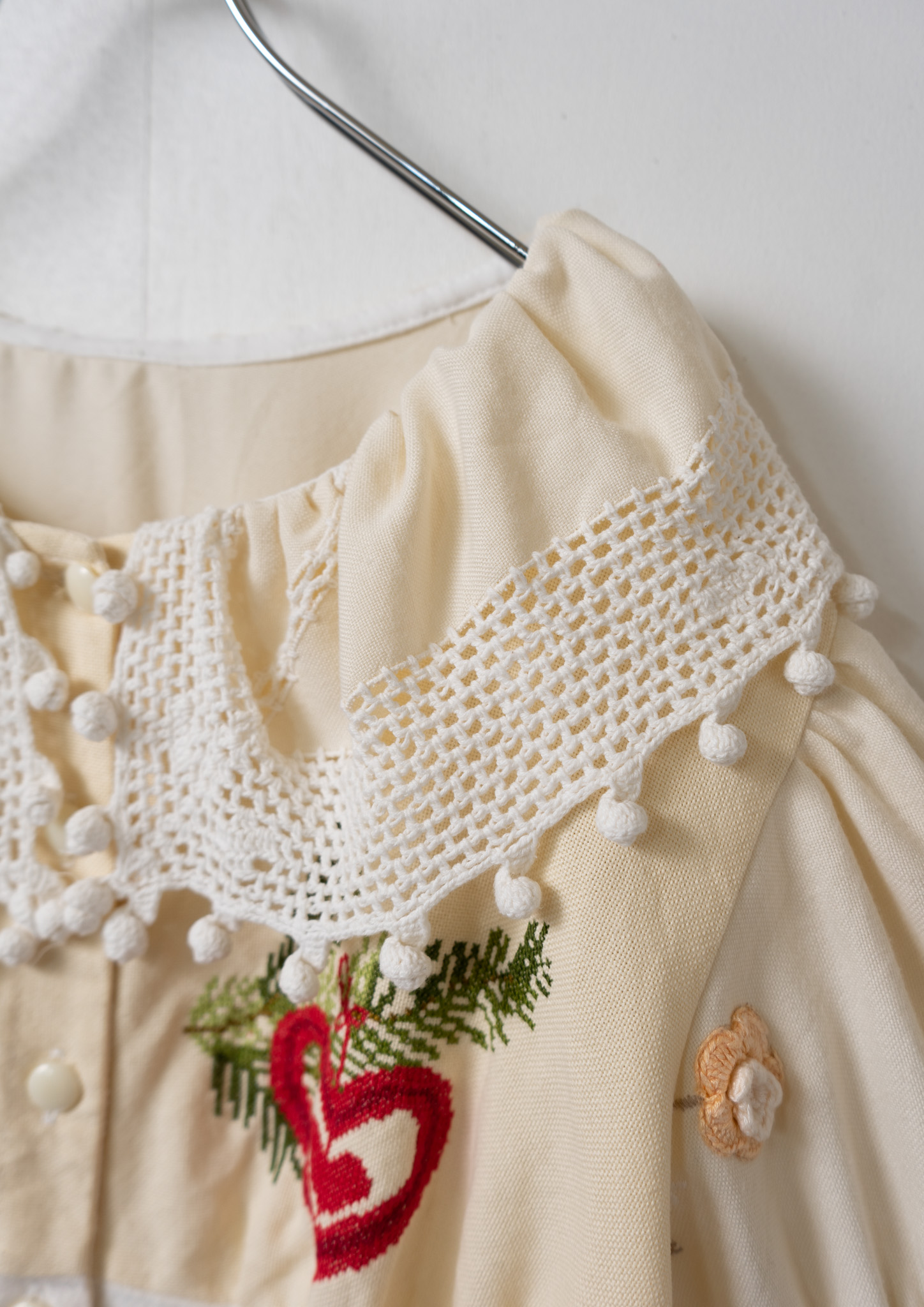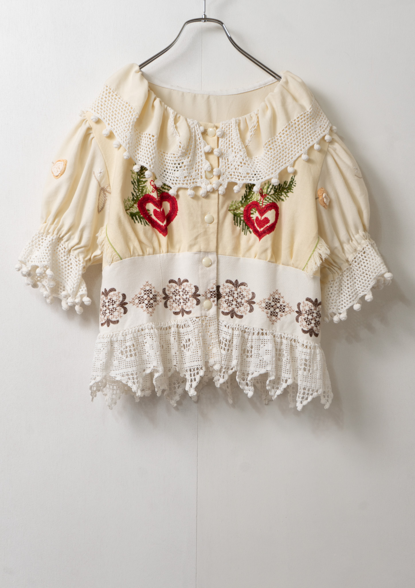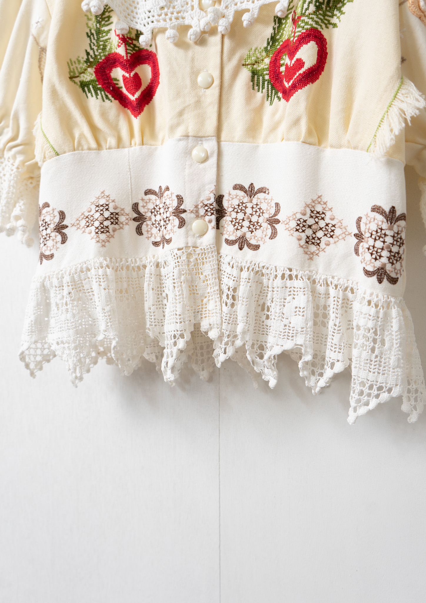 Upcycle Heart Embroidery Pom-pom Design Blouse